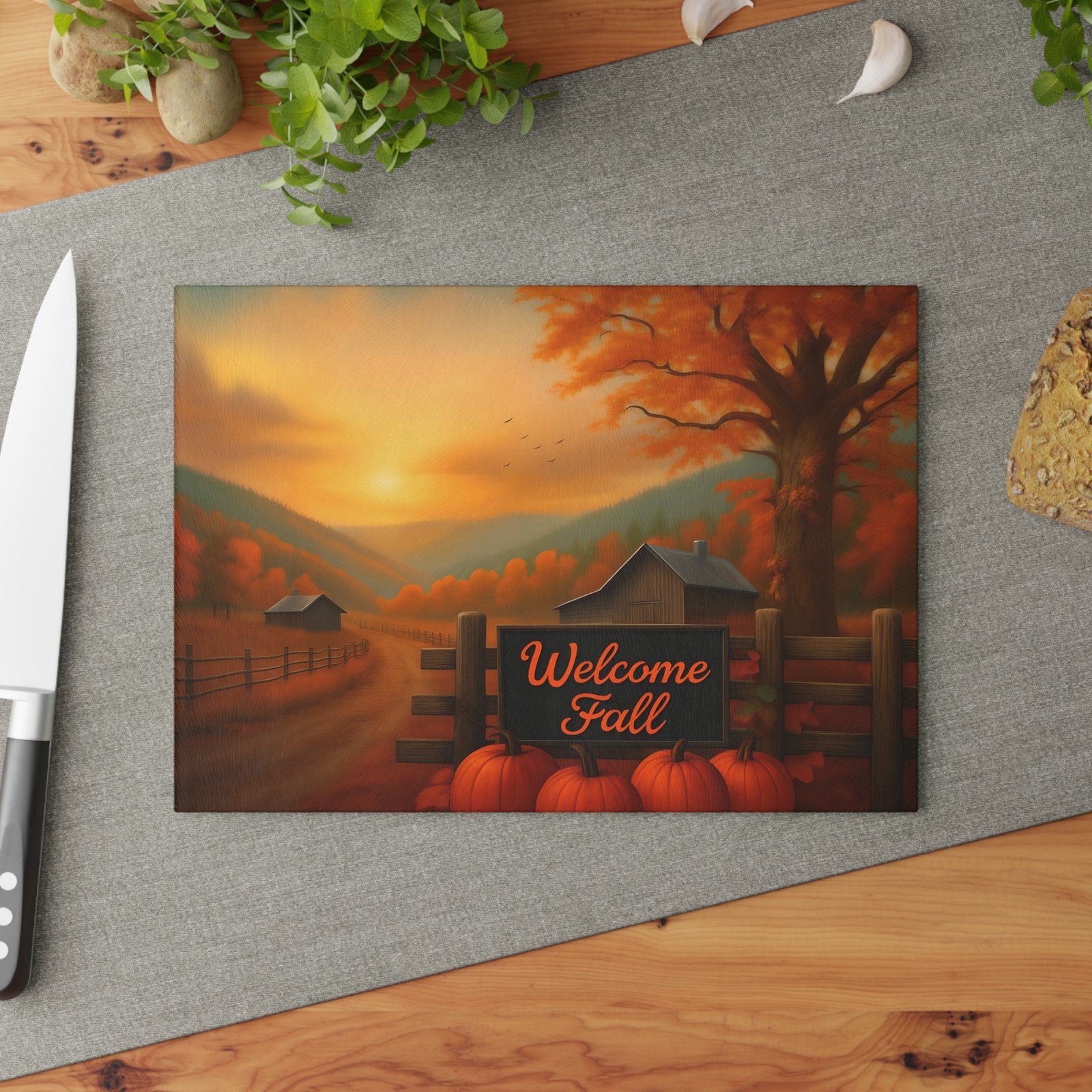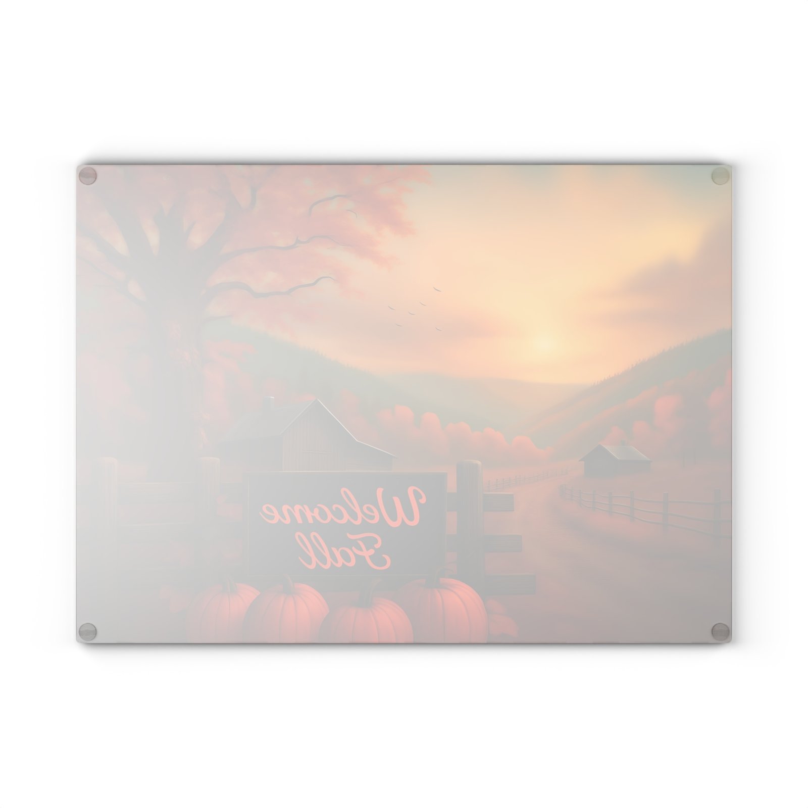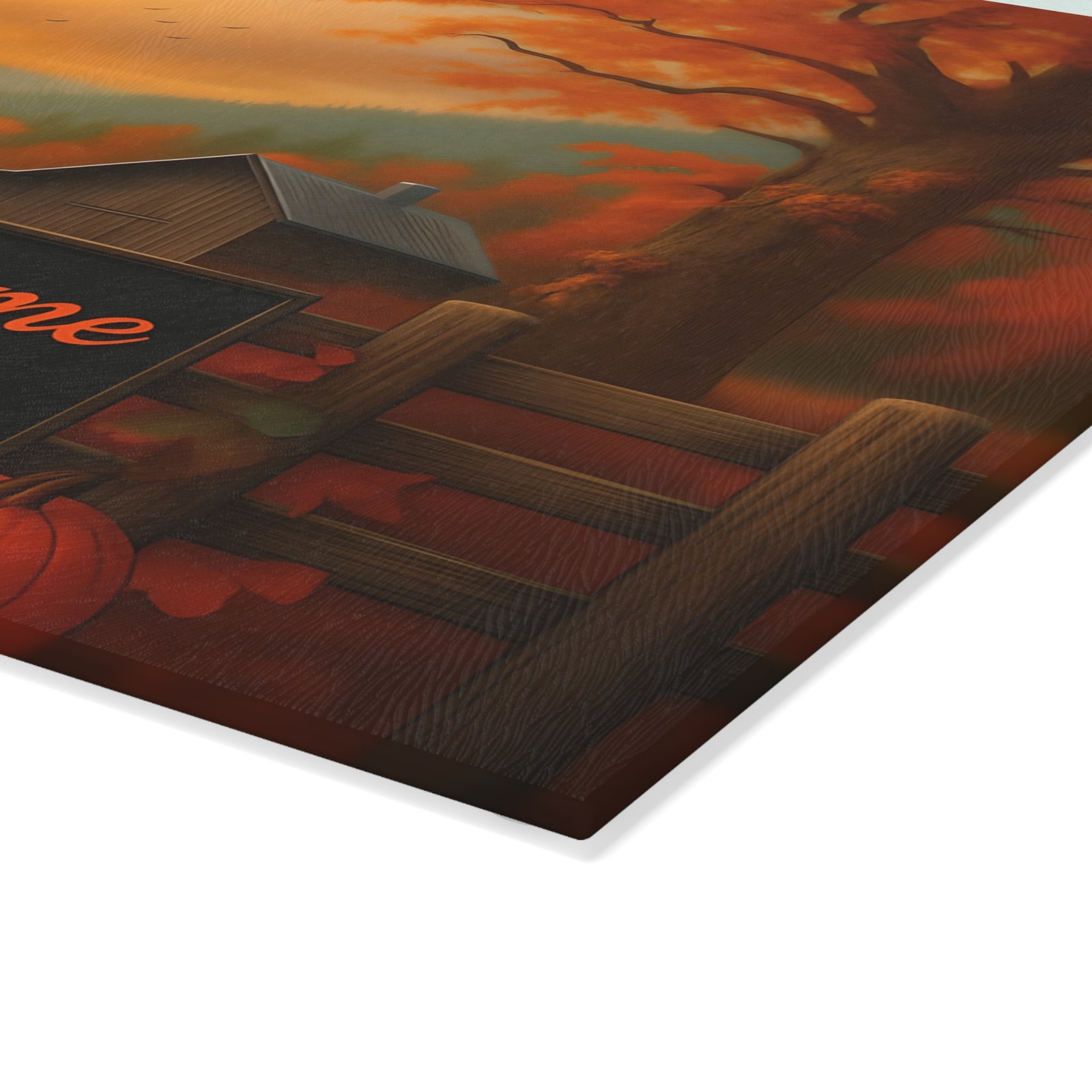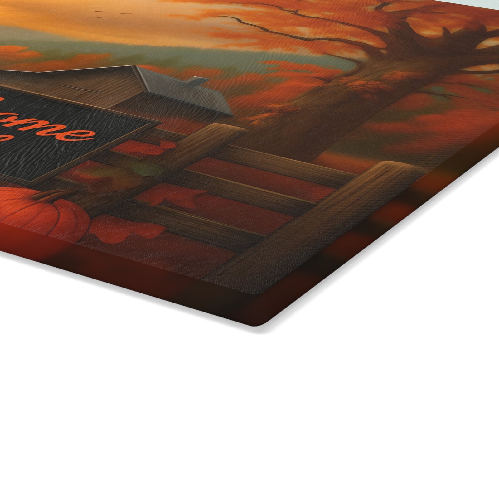 Bring the cozy vibes of fall into your kitchen with this beautiful farm autumn scene glass cutting board. Perfect for autumn lovers or farmhouse decor enthusiasts, this cutting board adds a touch of seasonal charm to your meal prep. Ideal for Thanksgiving and fall harvest celebrations.