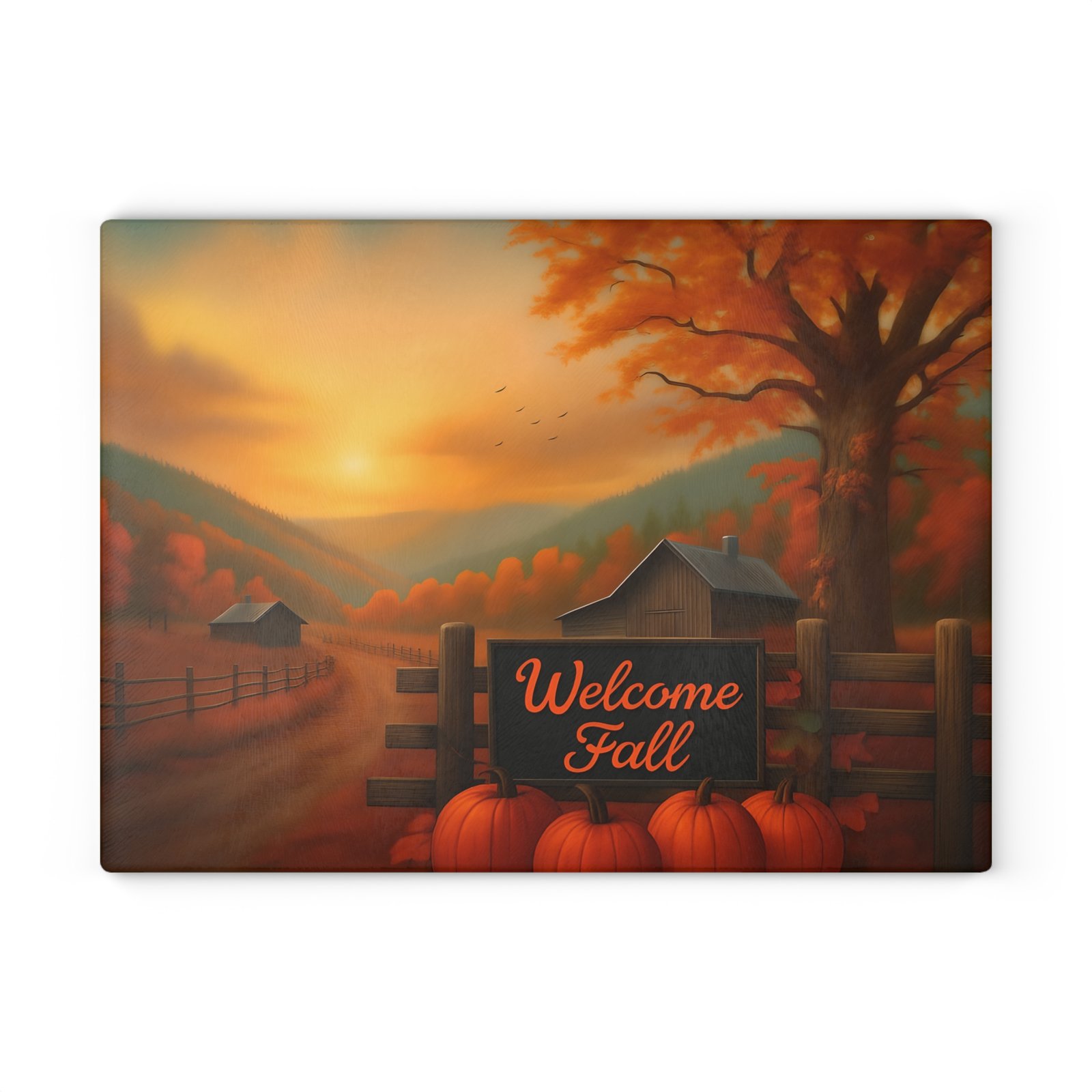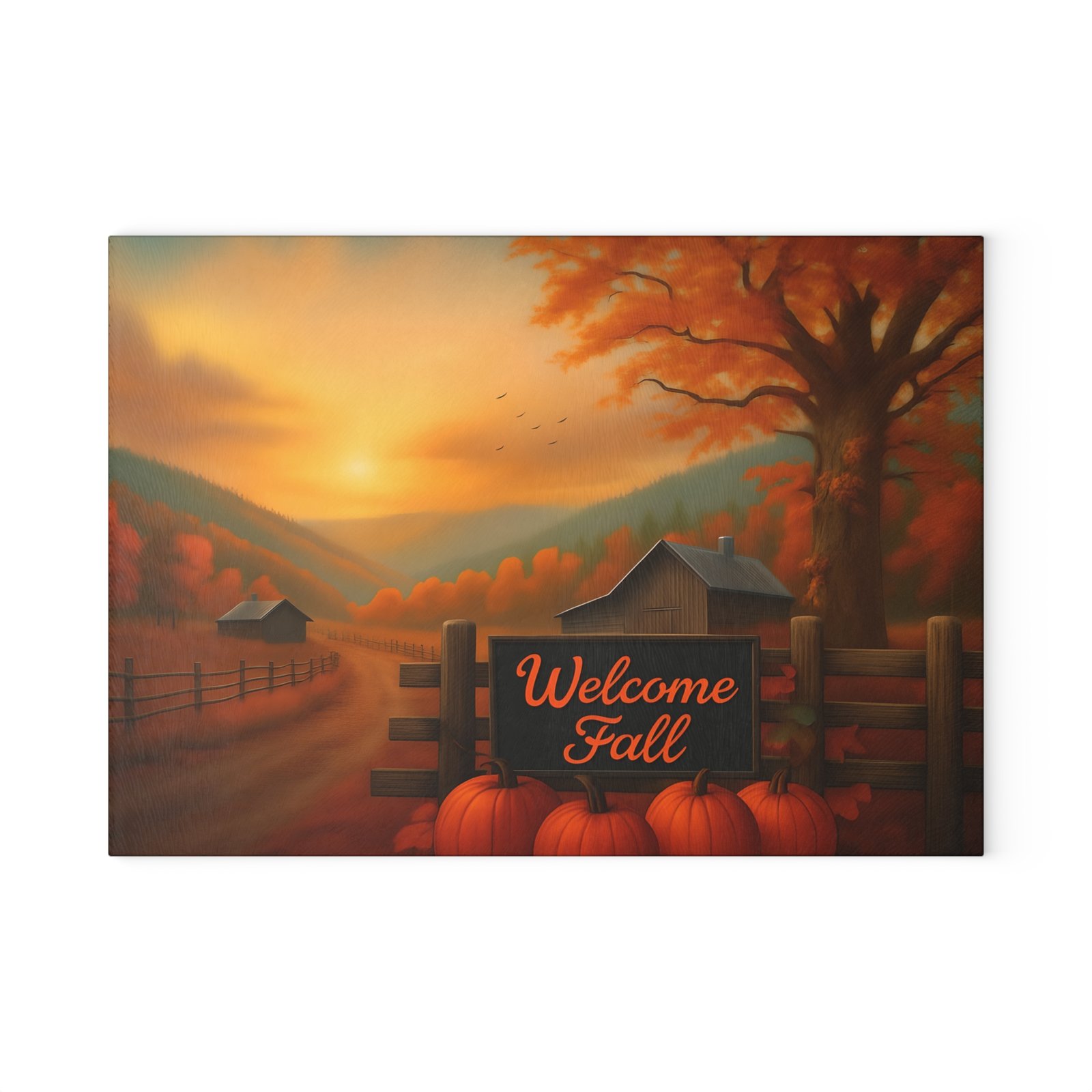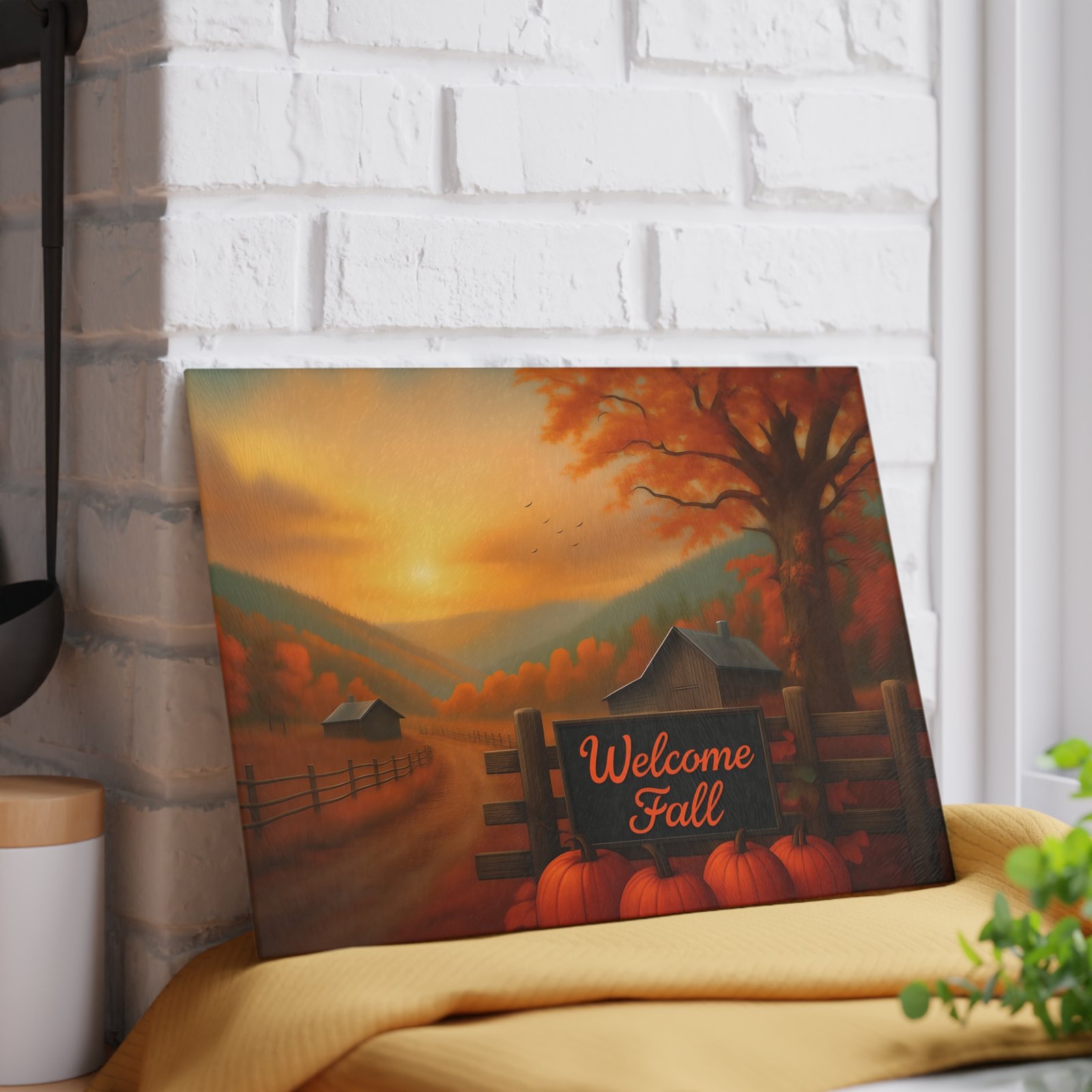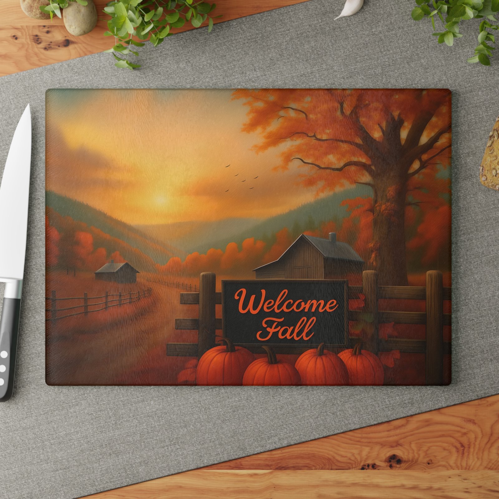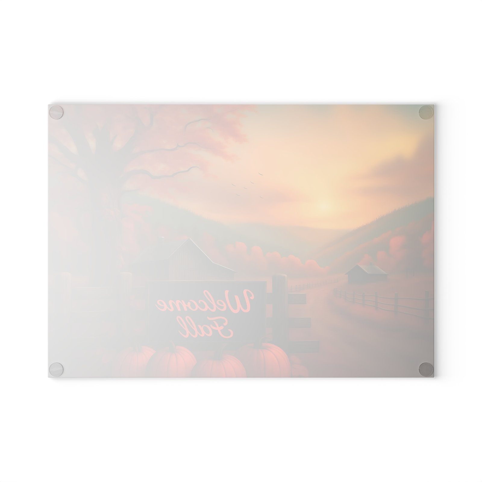 Bring the cozy vibes of fall into your kitchen with this beautiful farm autumn scene glass cutting board. Perfect for autumn lovers or farmhouse decor enthusiasts, this cutting board adds a touch of seasonal charm to your meal prep. Ideal for Thanksgiving and fall harvest celebrations.