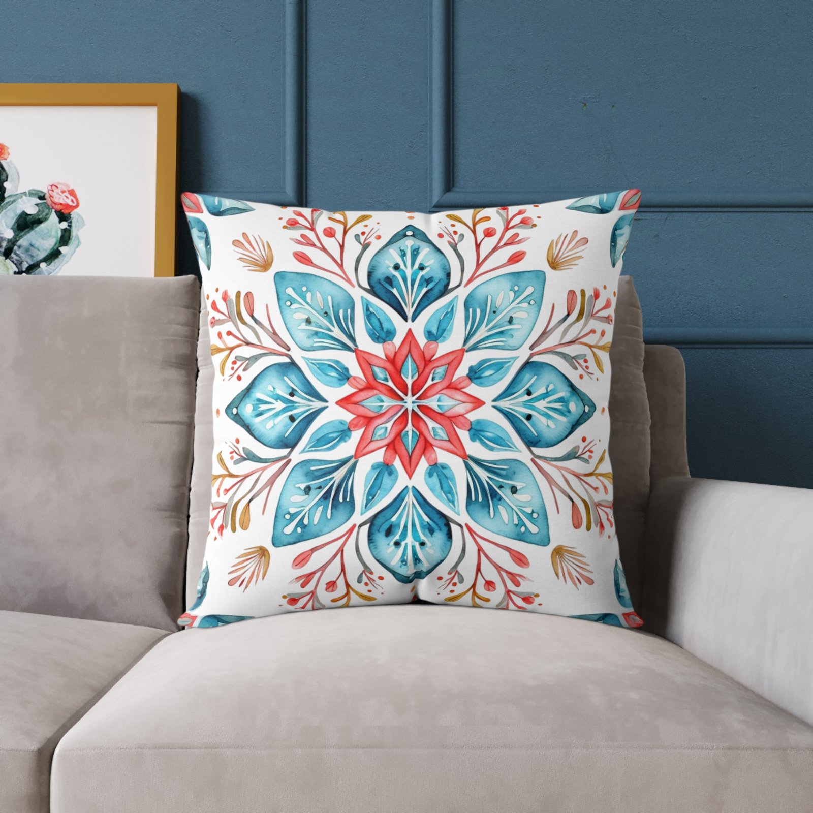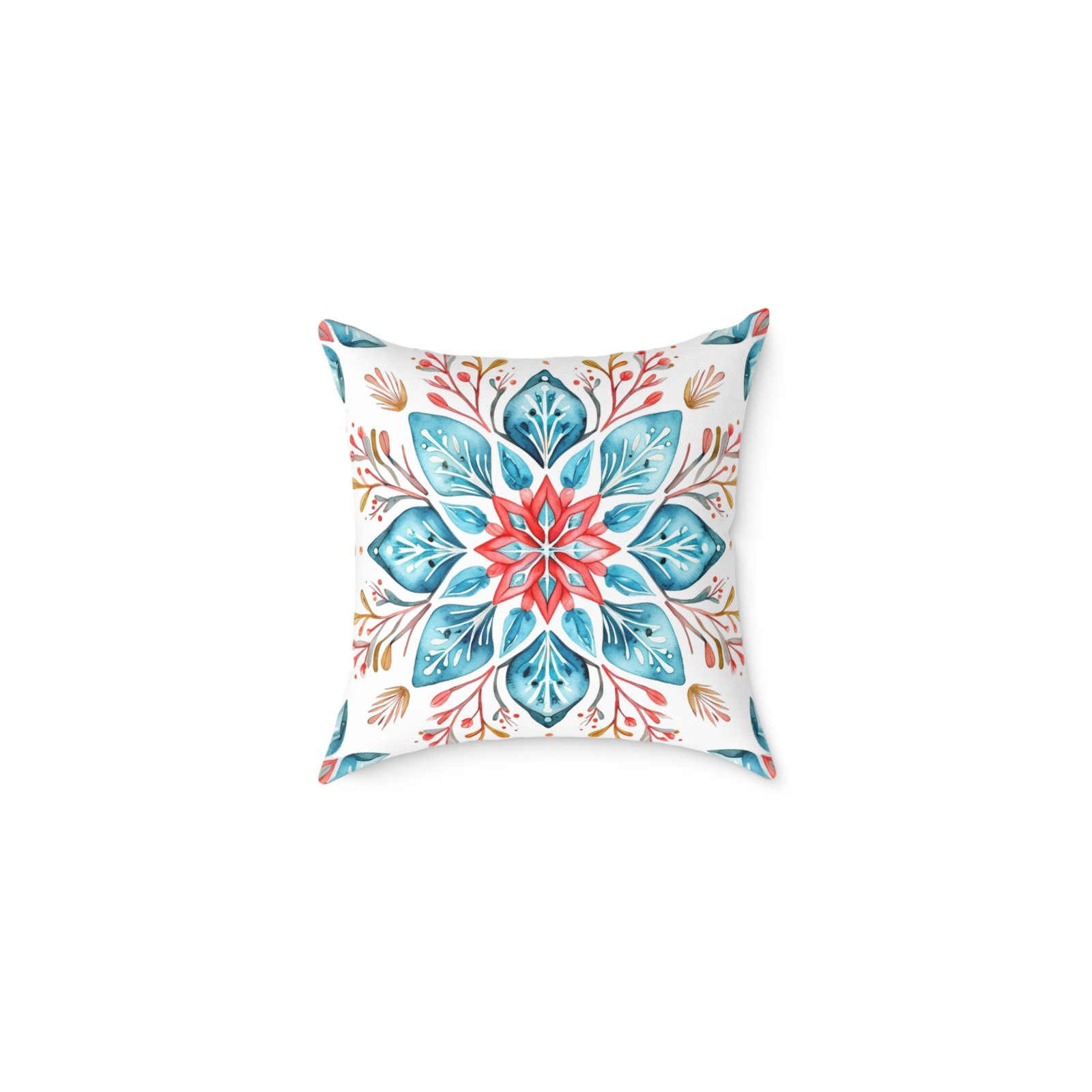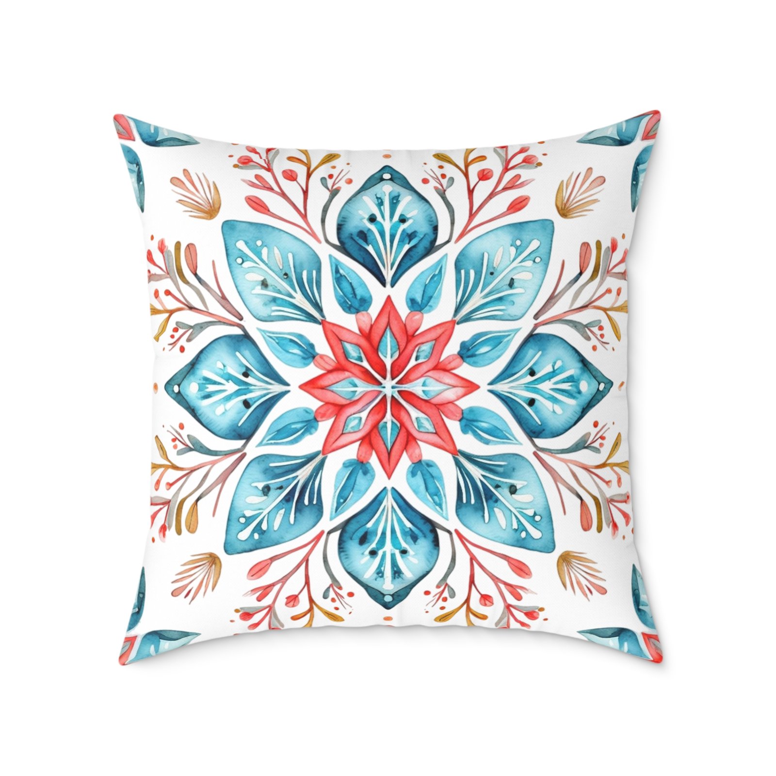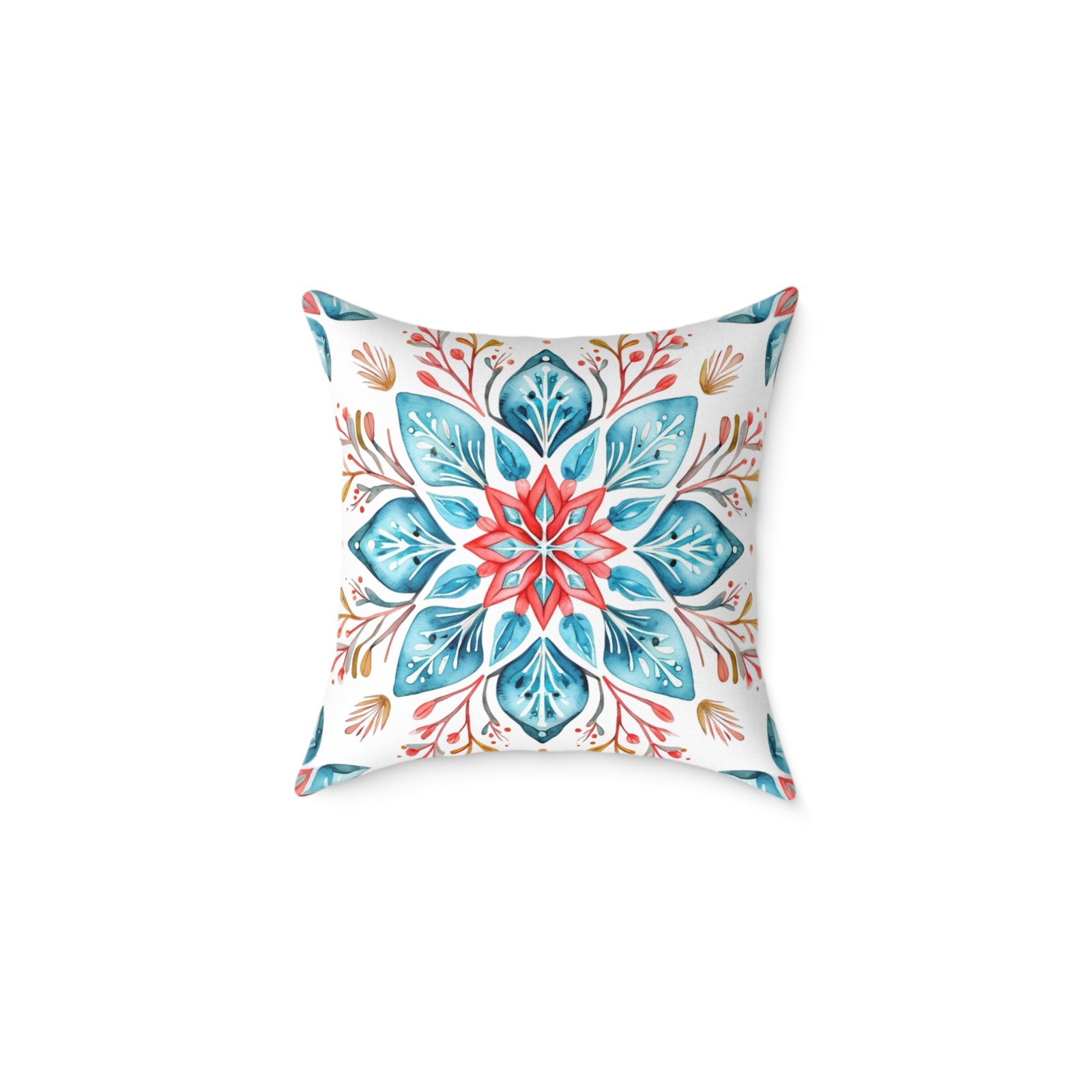 Soft colors meet artisanal charm in this square poly canvas pillow. A watercolor-inspired mandala blooms across both sides, blending teal, coral, and warm neutrals into a calm, boho note. The fine-weave polyester canvas feels smooth to the touch while the resilient polyester fill holds shape and keeps the cushion plump. Tuck it on a reading nook, layer it on a linen sofa, or place it on the floor for casual gatherings — the design brings a relaxed, handmade vibe that warms a room without shouting. The concealed zipper keeps the silhouette clean, and vivid printing keeps the pattern lively wash after wash.