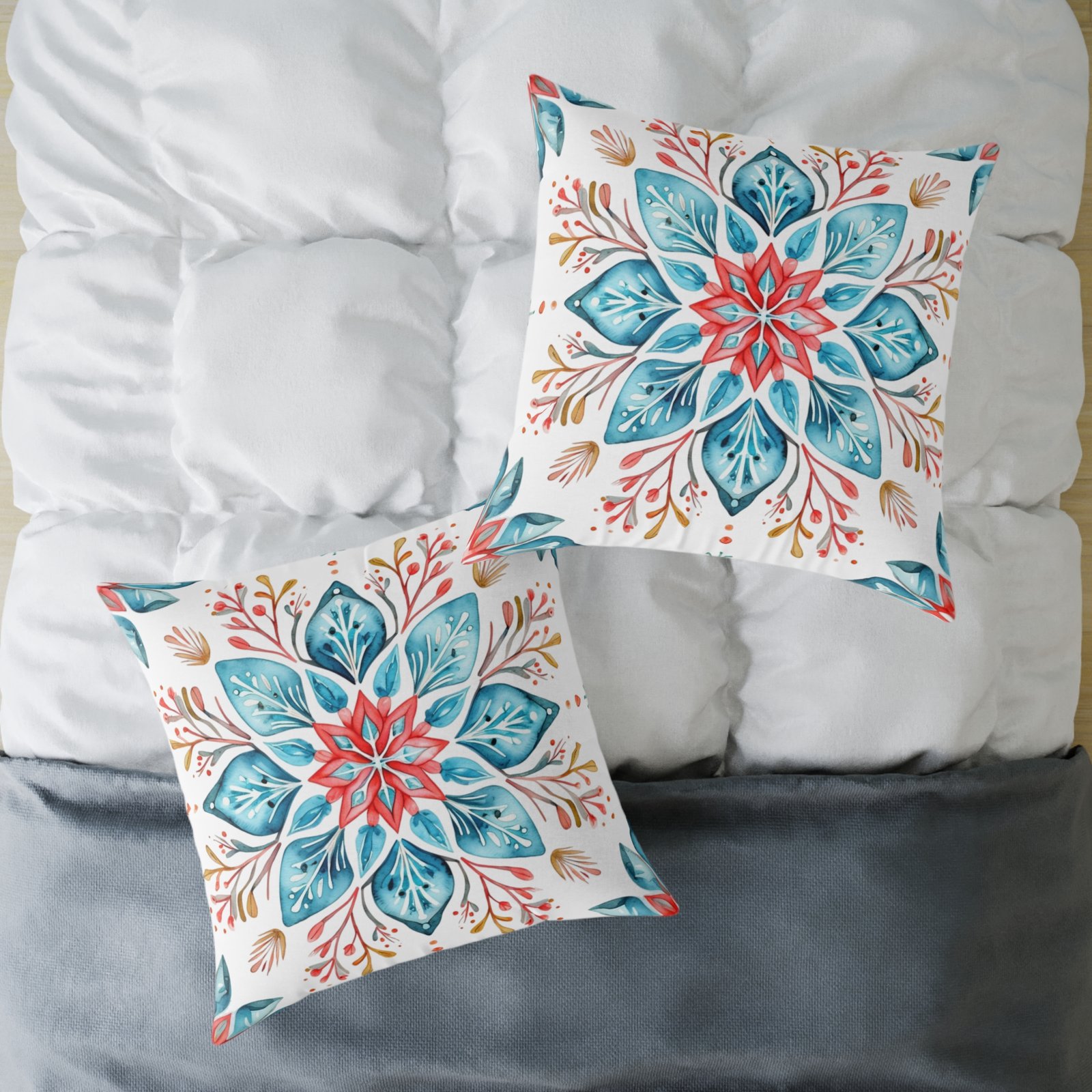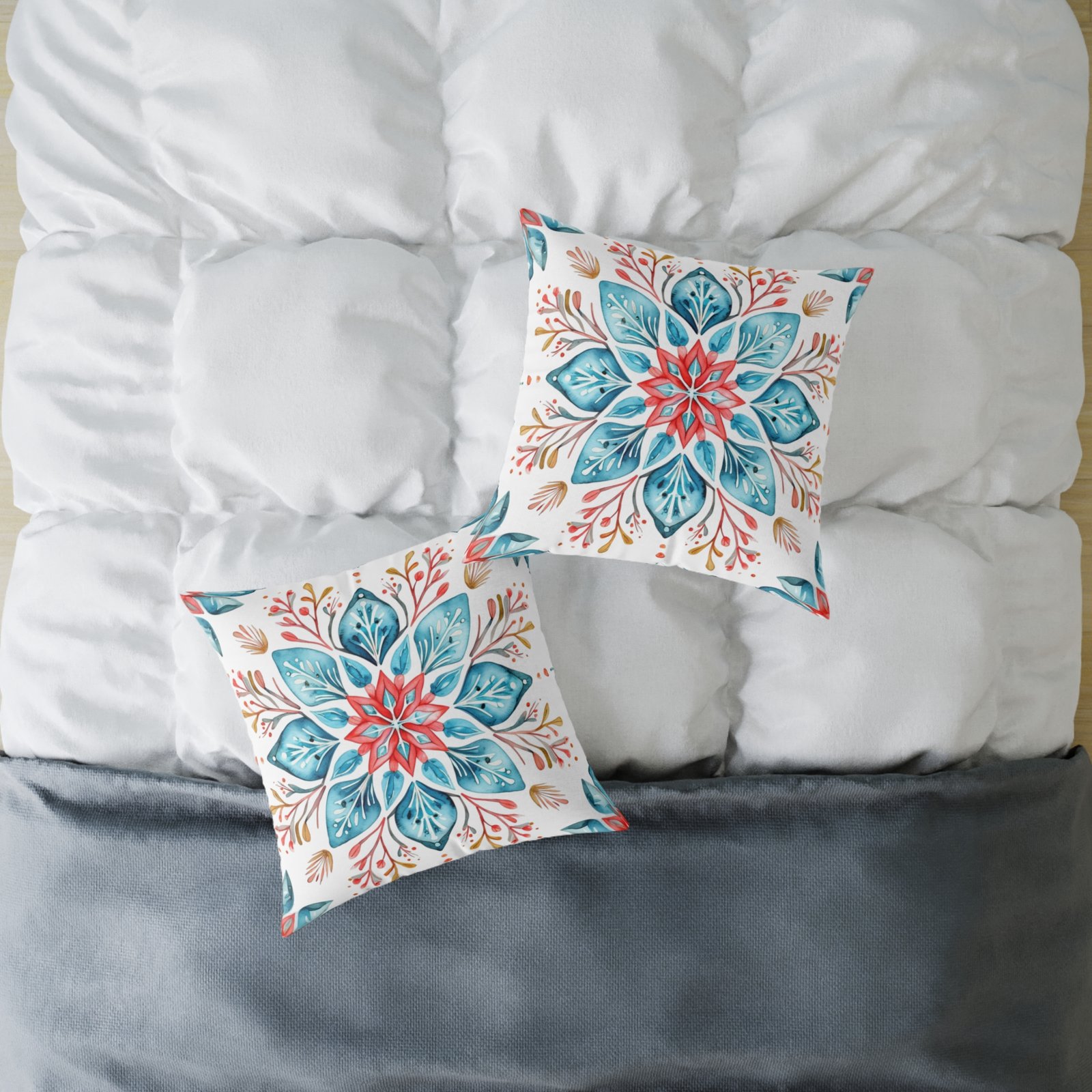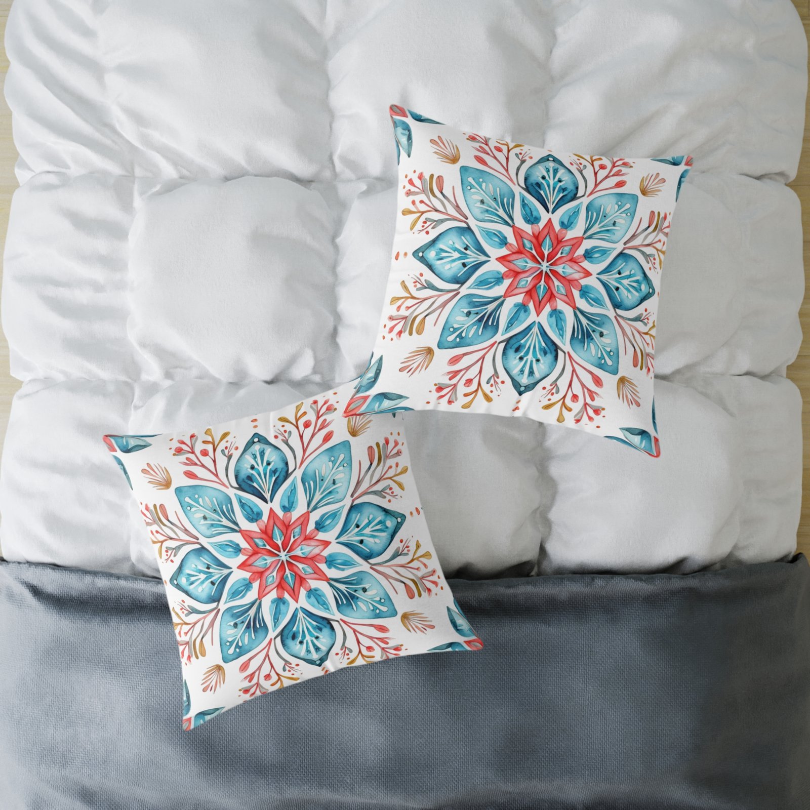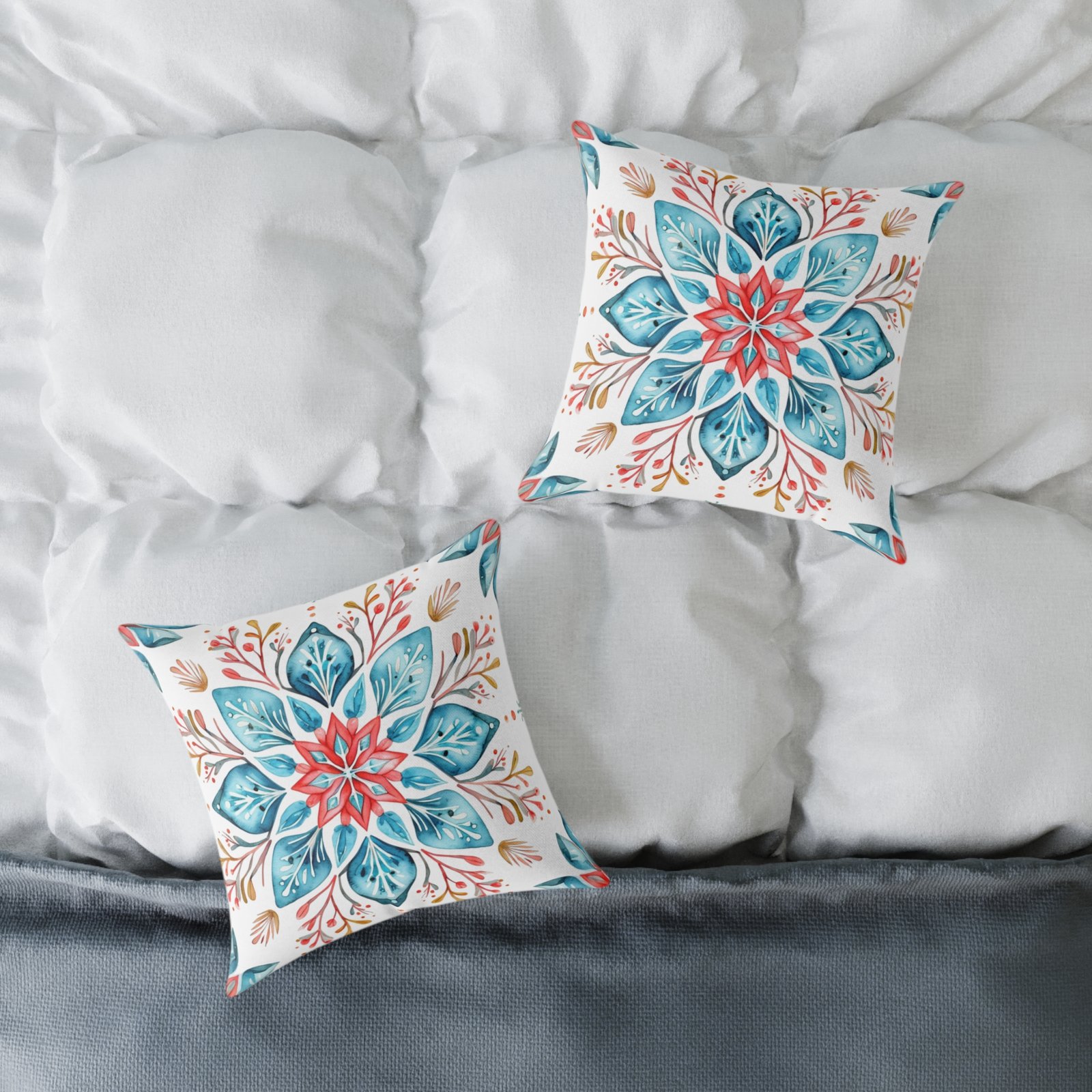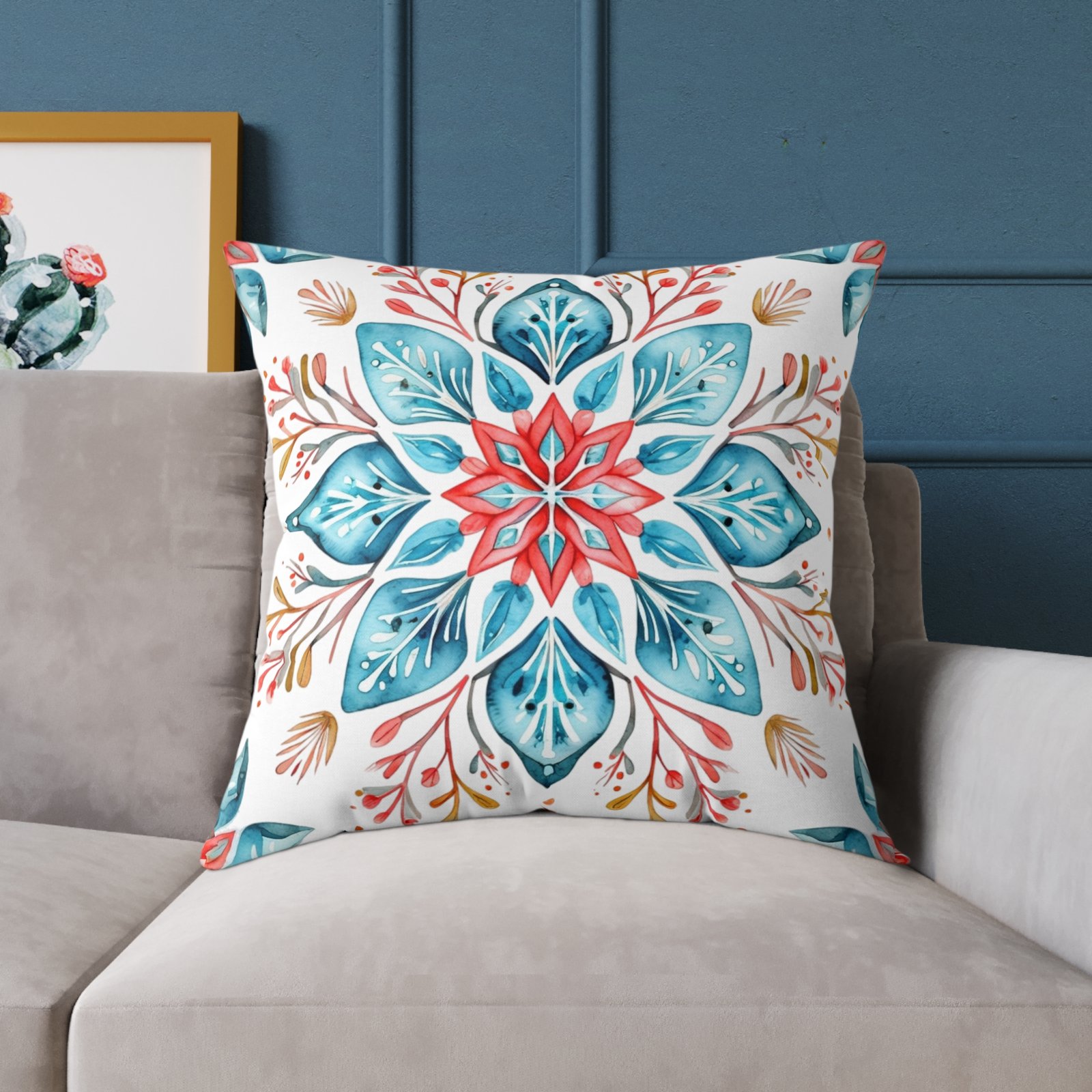 Soft colors meet artisanal charm in this square poly canvas pillow. A watercolor-inspired mandala blooms across both sides, blending teal, coral, and warm neutrals into a calm, boho note. The fine-weave polyester canvas feels smooth to the touch while the resilient polyester fill holds shape and keeps the cushion plump. Tuck it on a reading nook, layer it on a linen sofa, or place it on the floor for casual gatherings — the design brings a relaxed, handmade vibe that warms a room without shouting. The concealed zipper keeps the silhouette clean, and vivid printing keeps the pattern lively wash after wash.