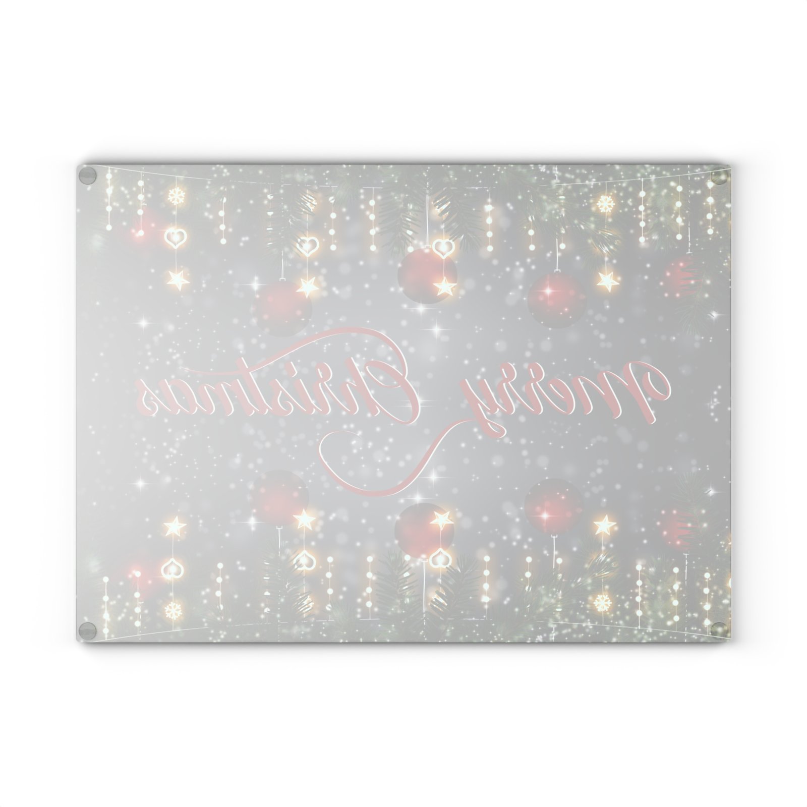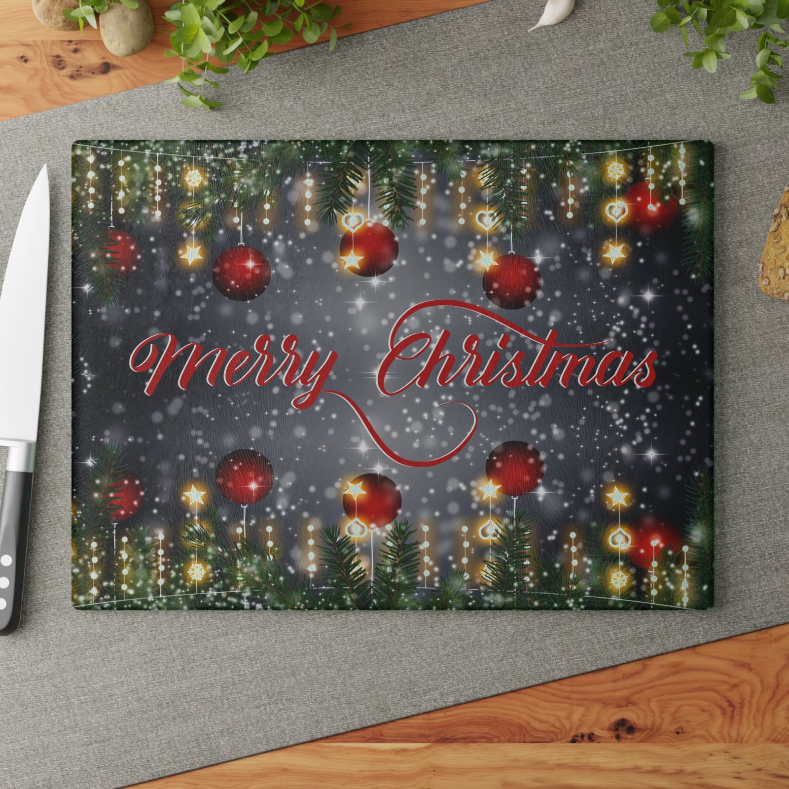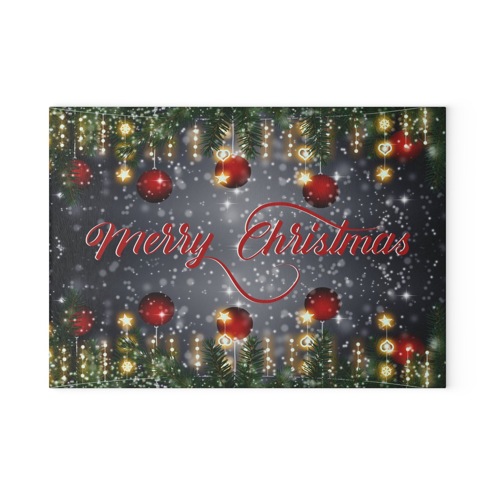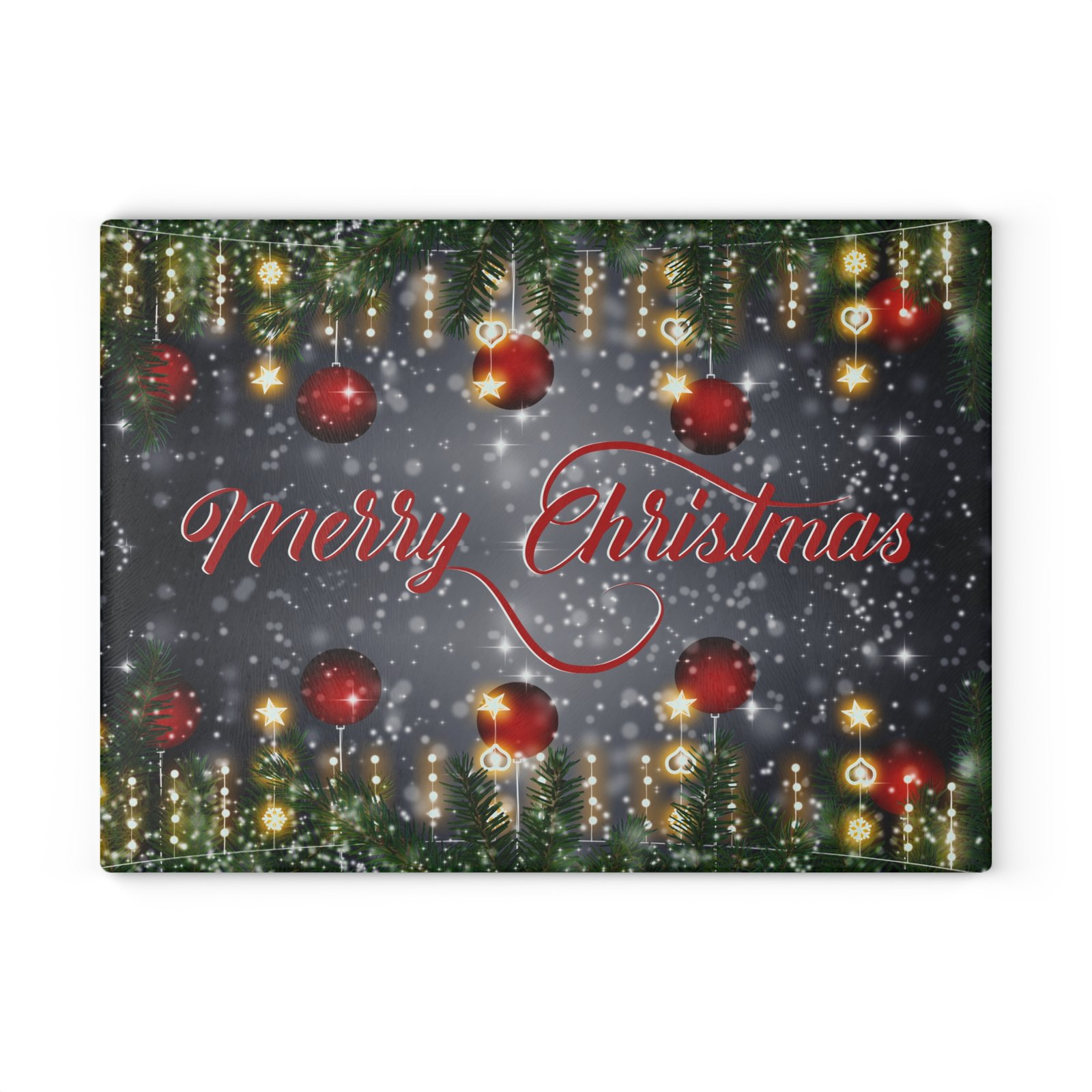 Add festive charm to your kitchen this holiday season with our Merry Christmas Glass Cutting Board. This tempered glass cutting board features a stunning ‘Merry Christmas’ graphic surrounded by twinkling lights, ornaments, and evergreen branches. Perfect for Christmas dinner prep or as a decorative tray, this cutting board adds joy and elegance to your holiday season. Ideal for gift-giving or as a holiday décor accent for countertops, charcuterie displays, or bar areas.