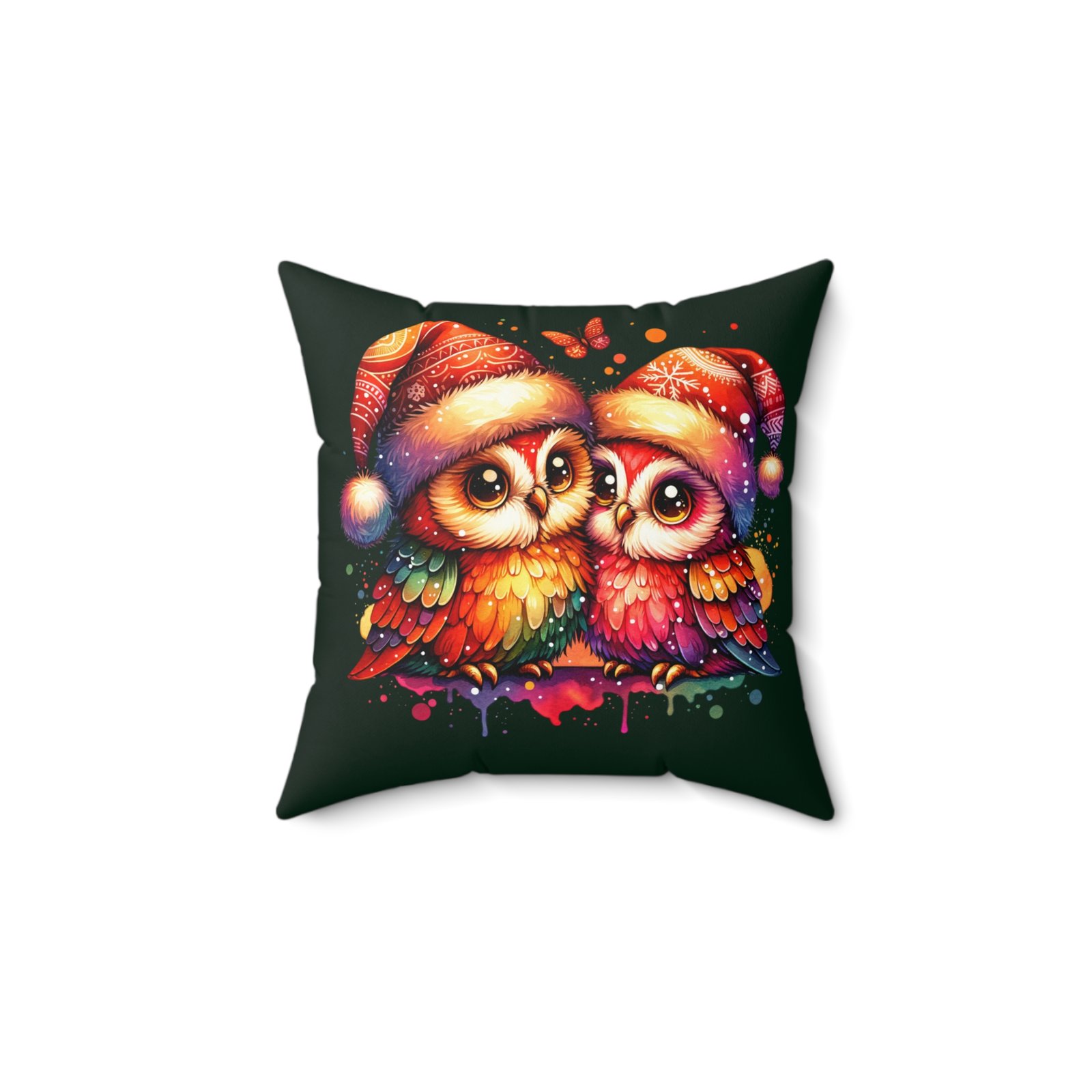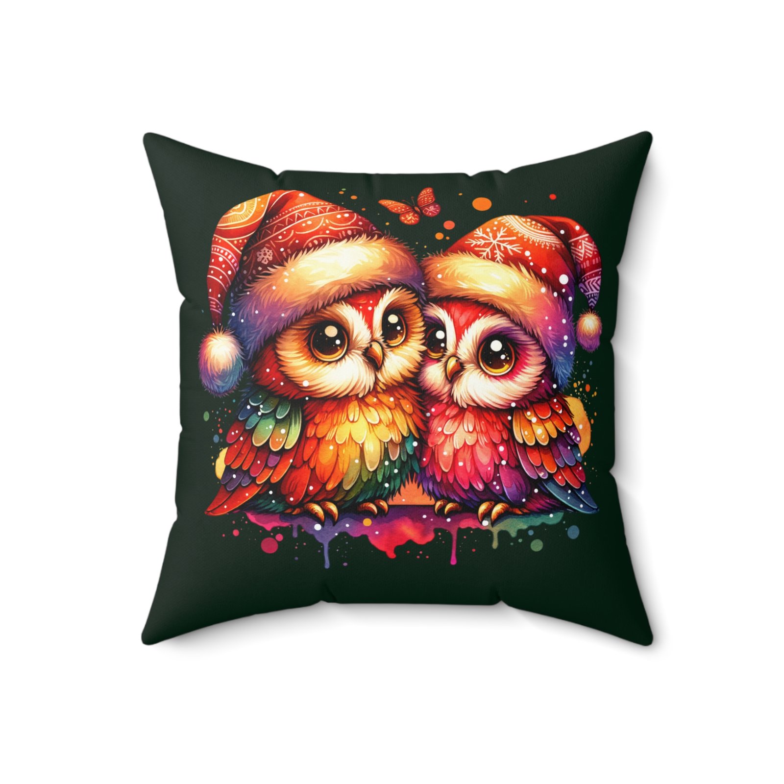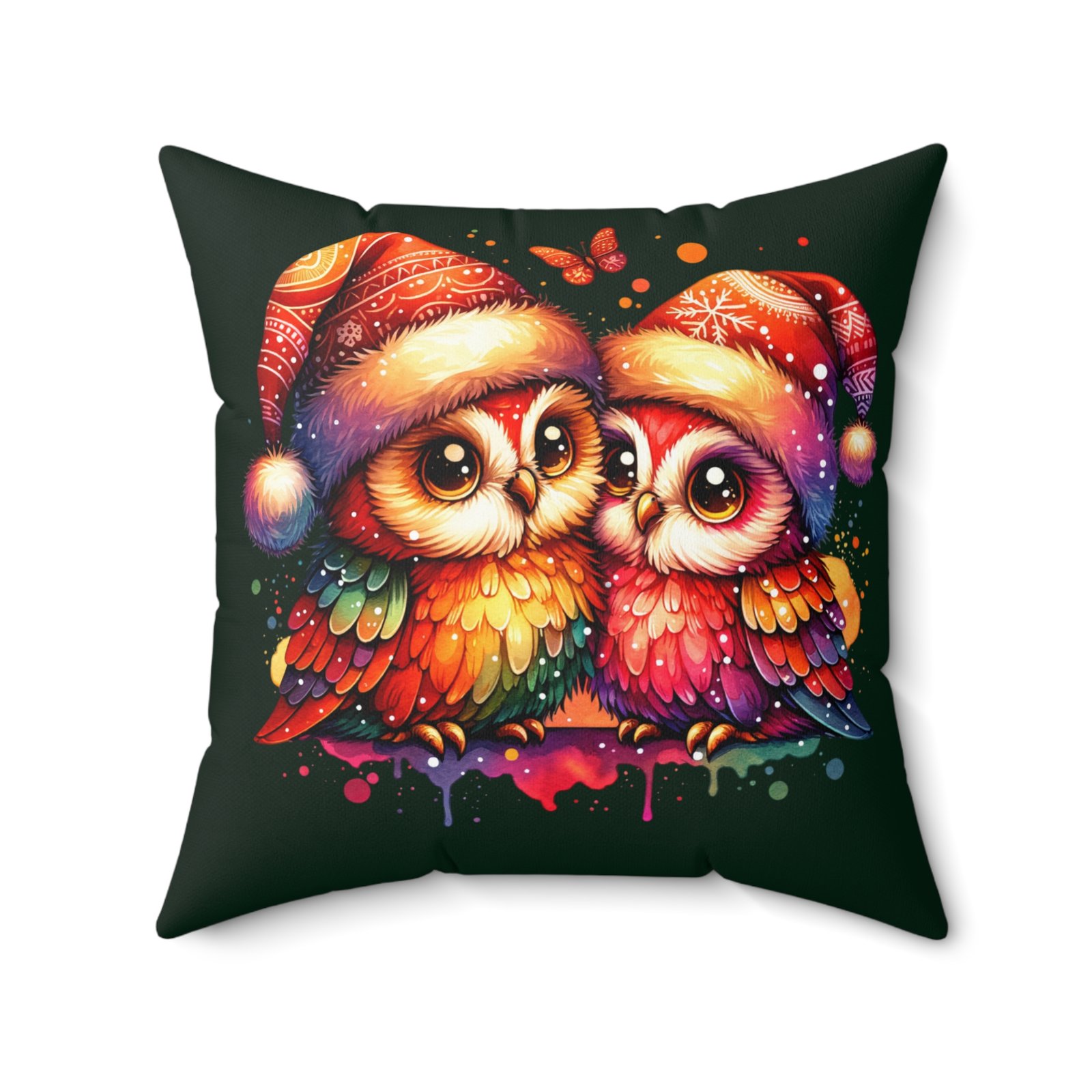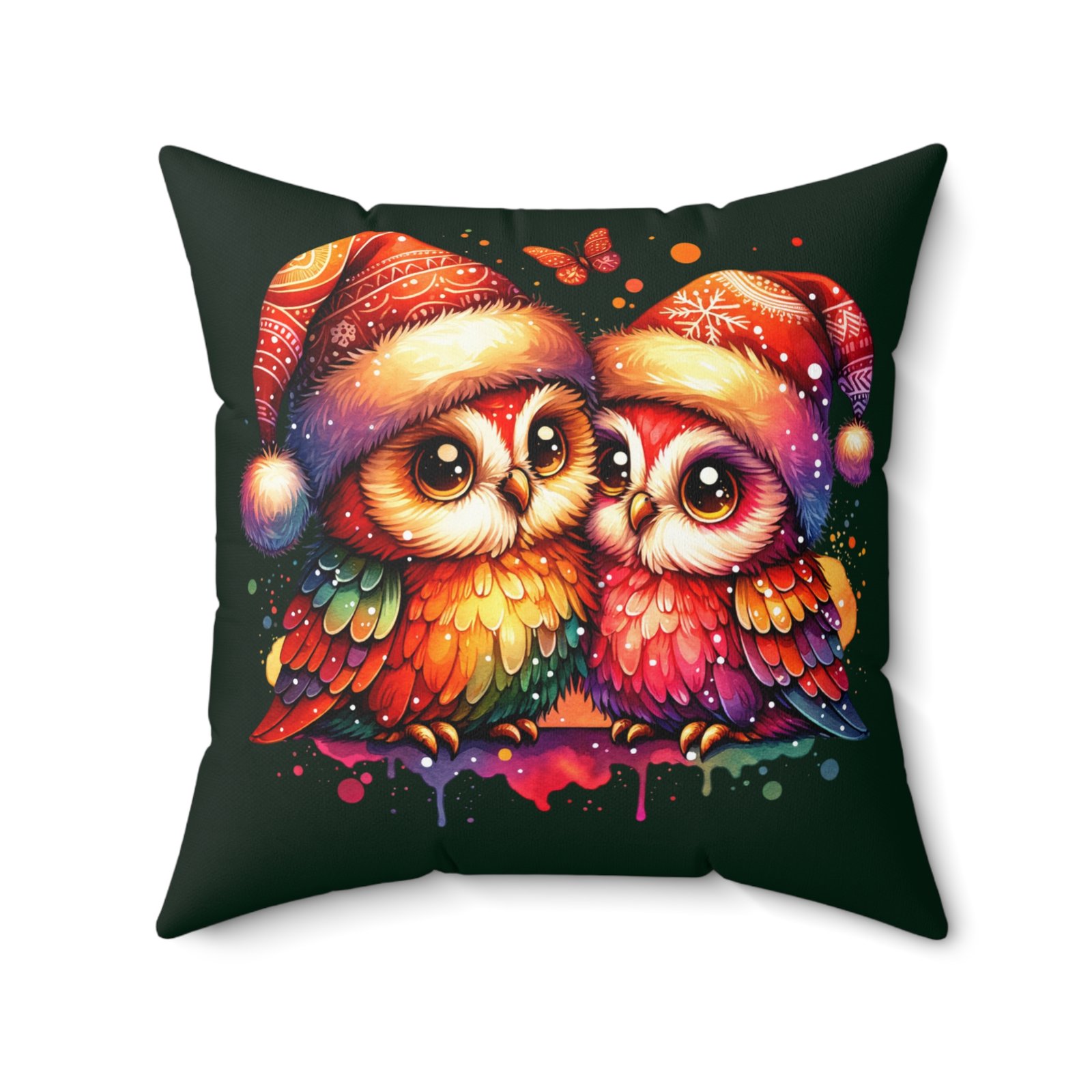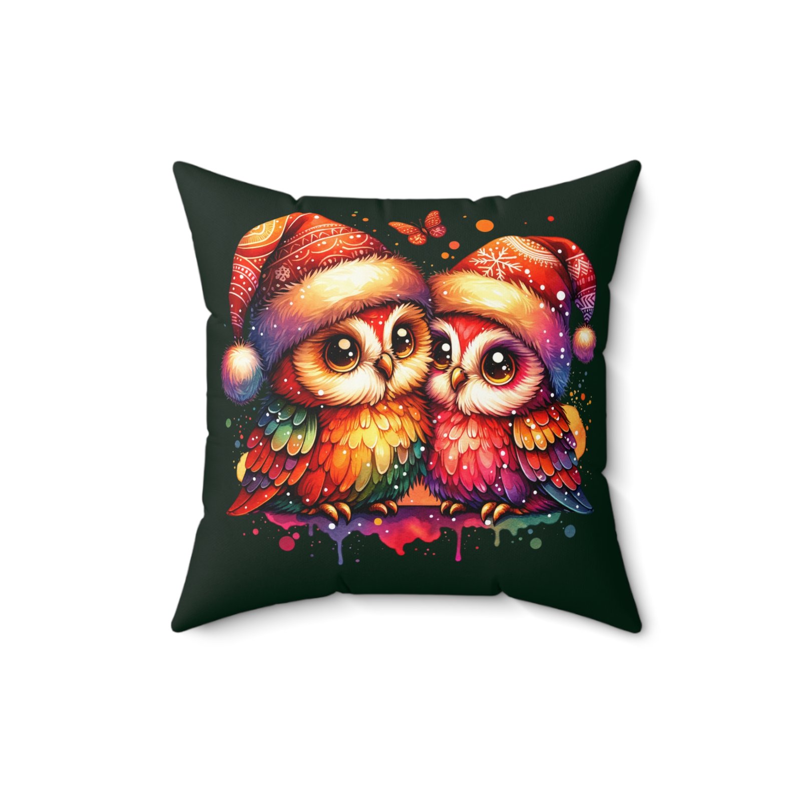 Bring holiday cheer and cozy charm to your home with this festive Christmas pillow featuring two adorable owls in vibrant rainbow tones, snuggled together in matching Santa hats. This pillow adds a playful yet heartwarming touch to your Christmas celebrations, making it a perfect accent for your holiday decor. A wonderful gift or seasonal statement piece that’s sure to spread joy all season long, suitable for those looking to add a whimsical touch to their holiday decorations.