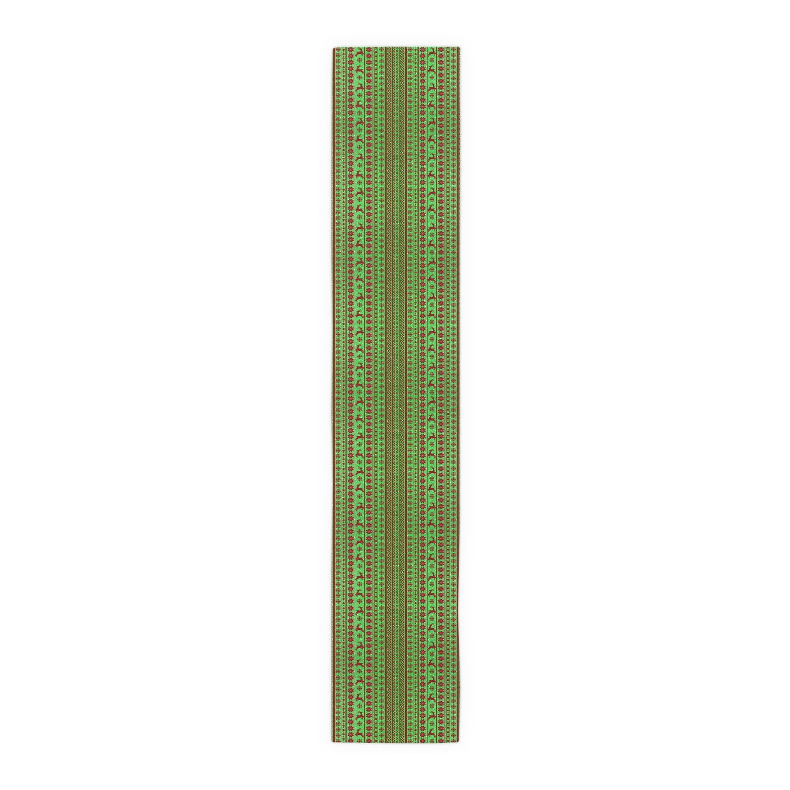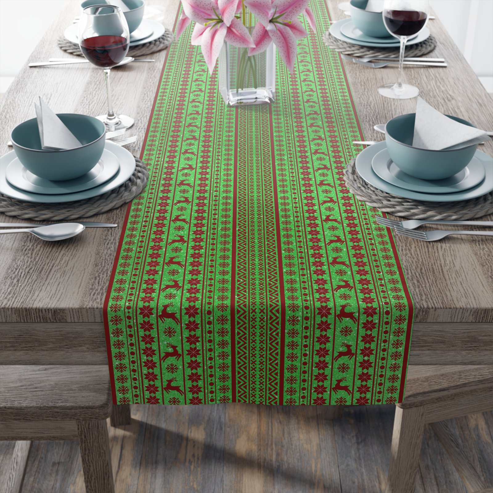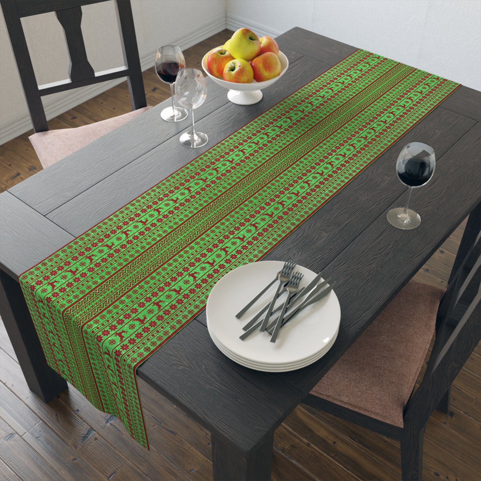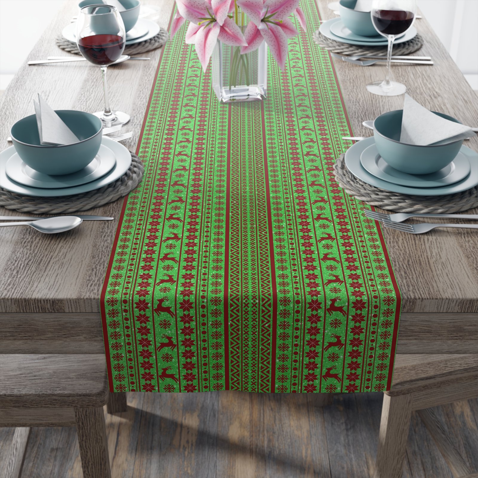 Elevate your holiday décor with this festive table runner featuring classic Christmas motifs in vibrant red and green tones. Perfect for adding a cheerful touch to your seasonal celebrations, whether it’s a cozy family dinner or a festive holiday gathering. Ideal for those who appreciate a traditional or modern aesthetic.
