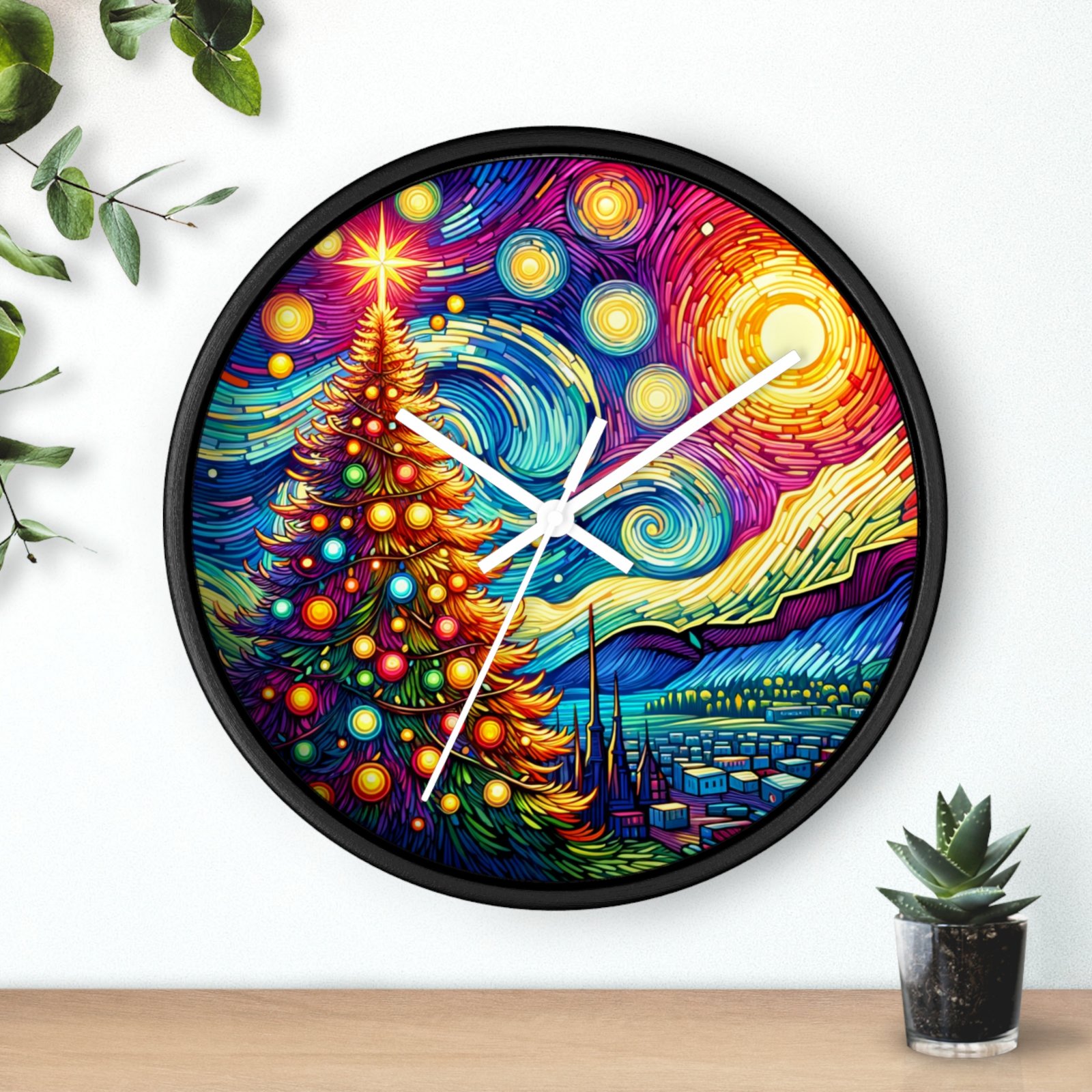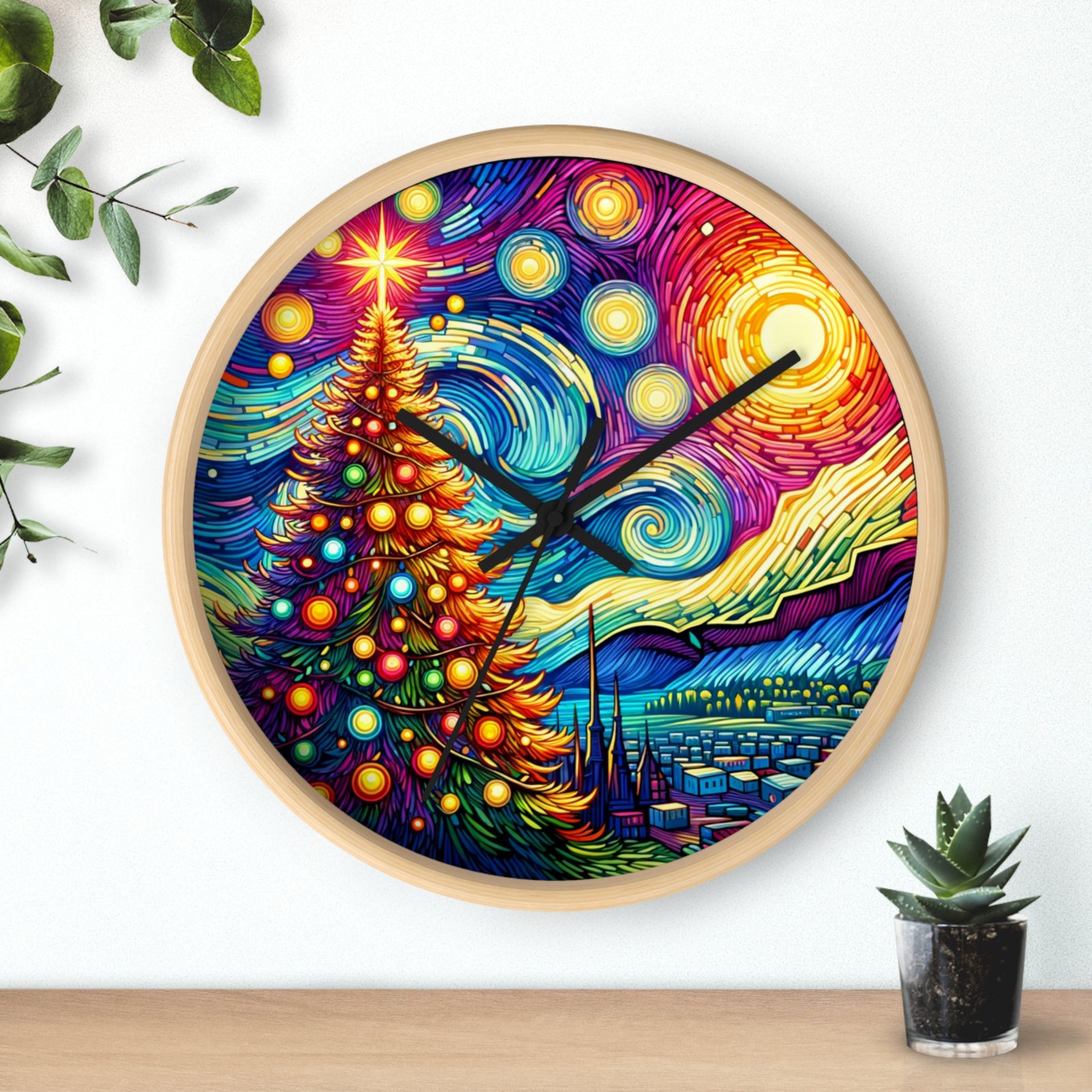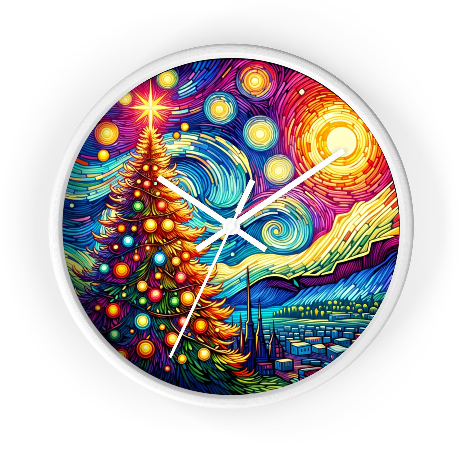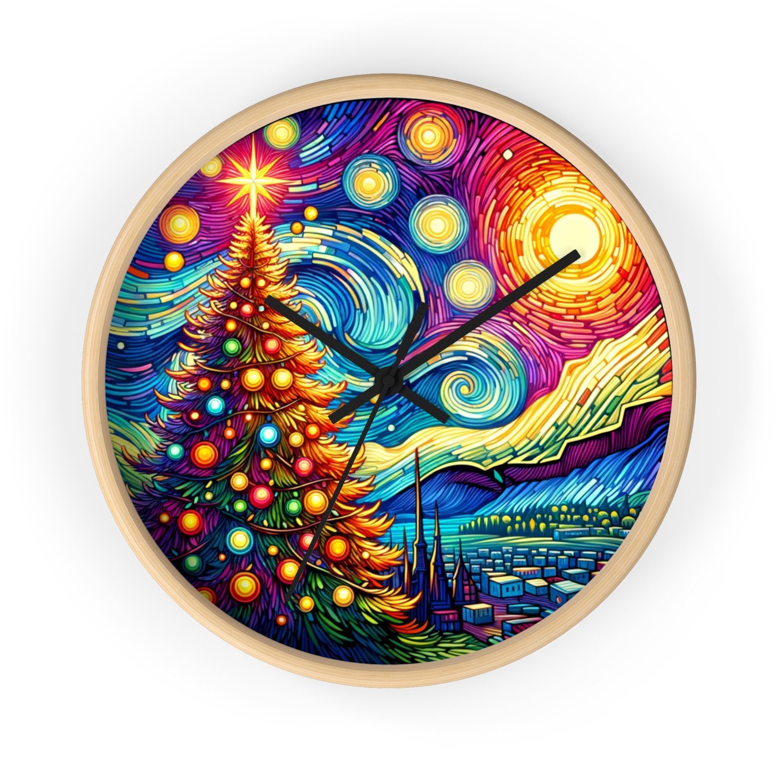 Add a touch of holiday magic and artistic flair to your home decor with this stunning Wall Clock. The radiant Christmas tree against a Van Gogh-inspired night sky creates a sense of wonder and warmth, making it a perfect centerpiece for the holiday season. This clock is perfect for those who love festive cheer and classic art.