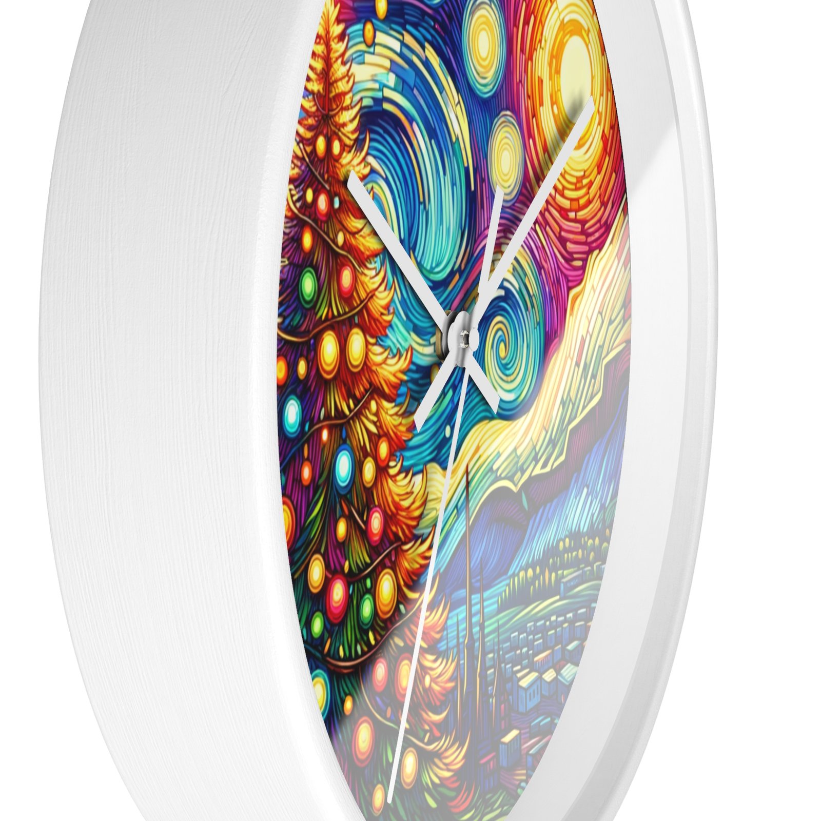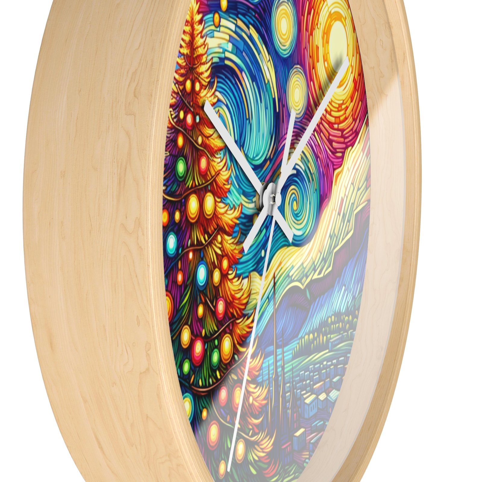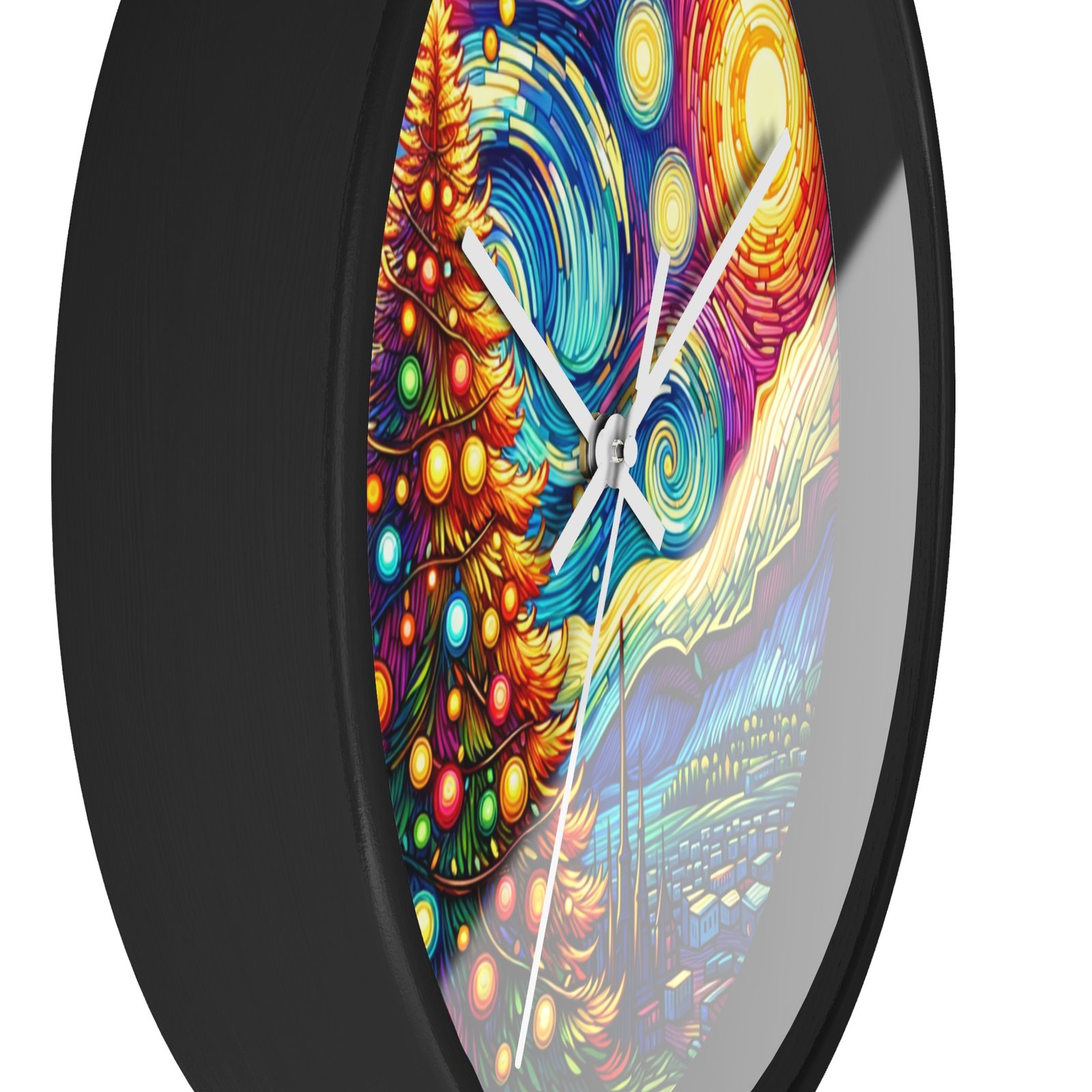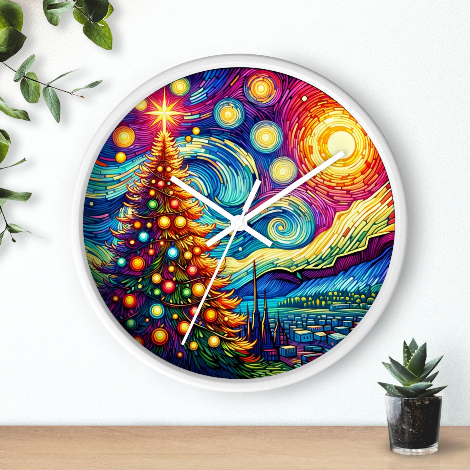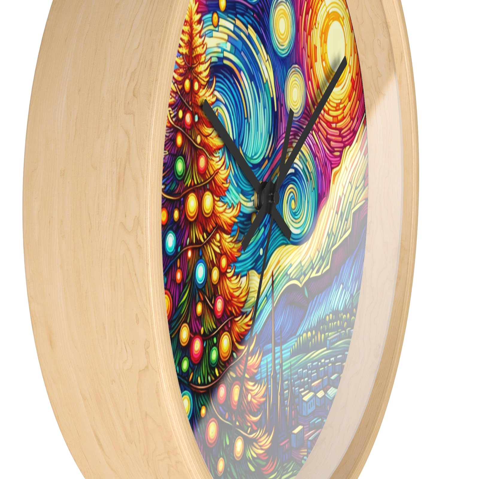 Add a touch of holiday magic and artistic flair to your home decor with this stunning Wall Clock. The radiant Christmas tree against a Van Gogh-inspired night sky creates a sense of wonder and warmth, making it a perfect centerpiece for the holiday season. This clock is perfect for those who love festive cheer and classic art.