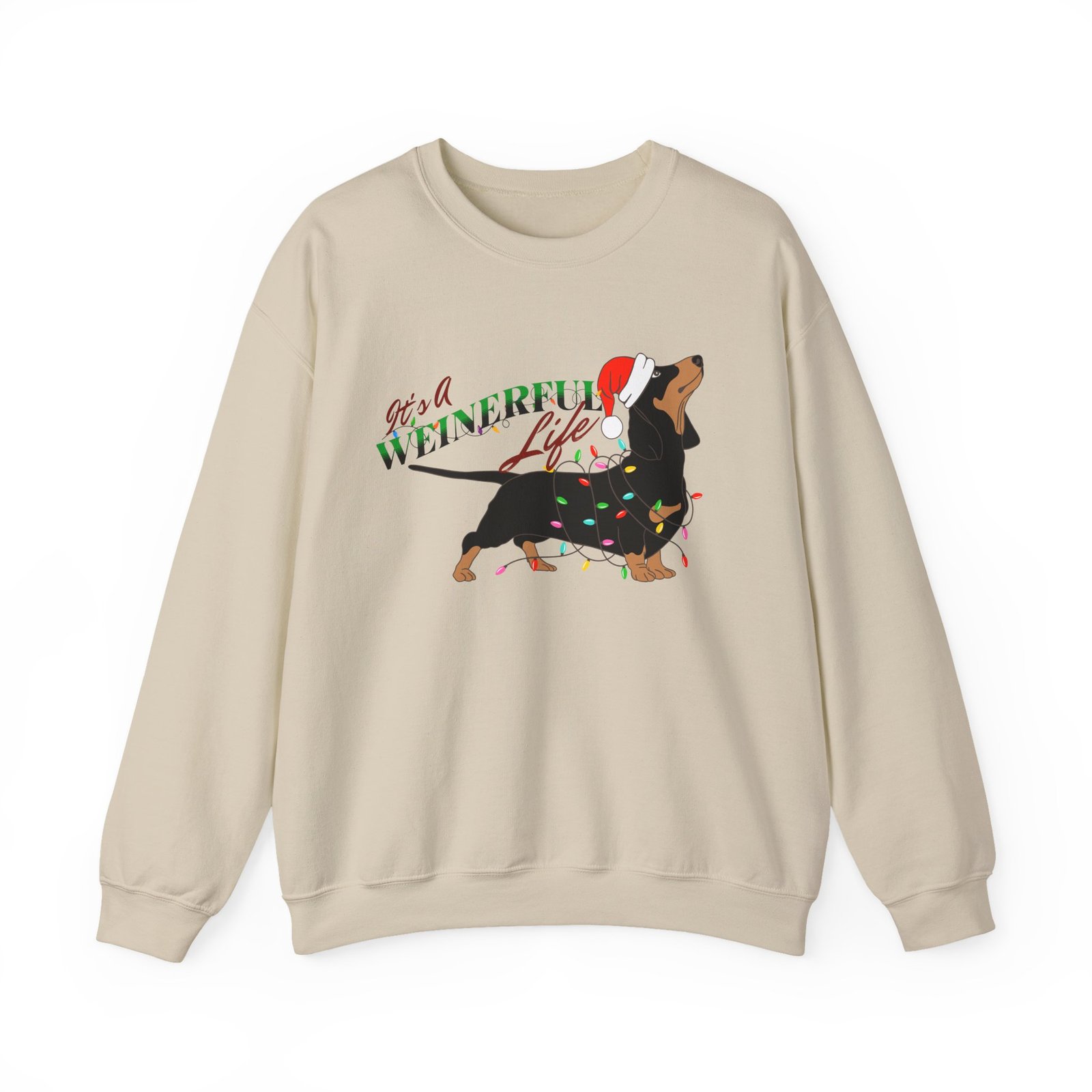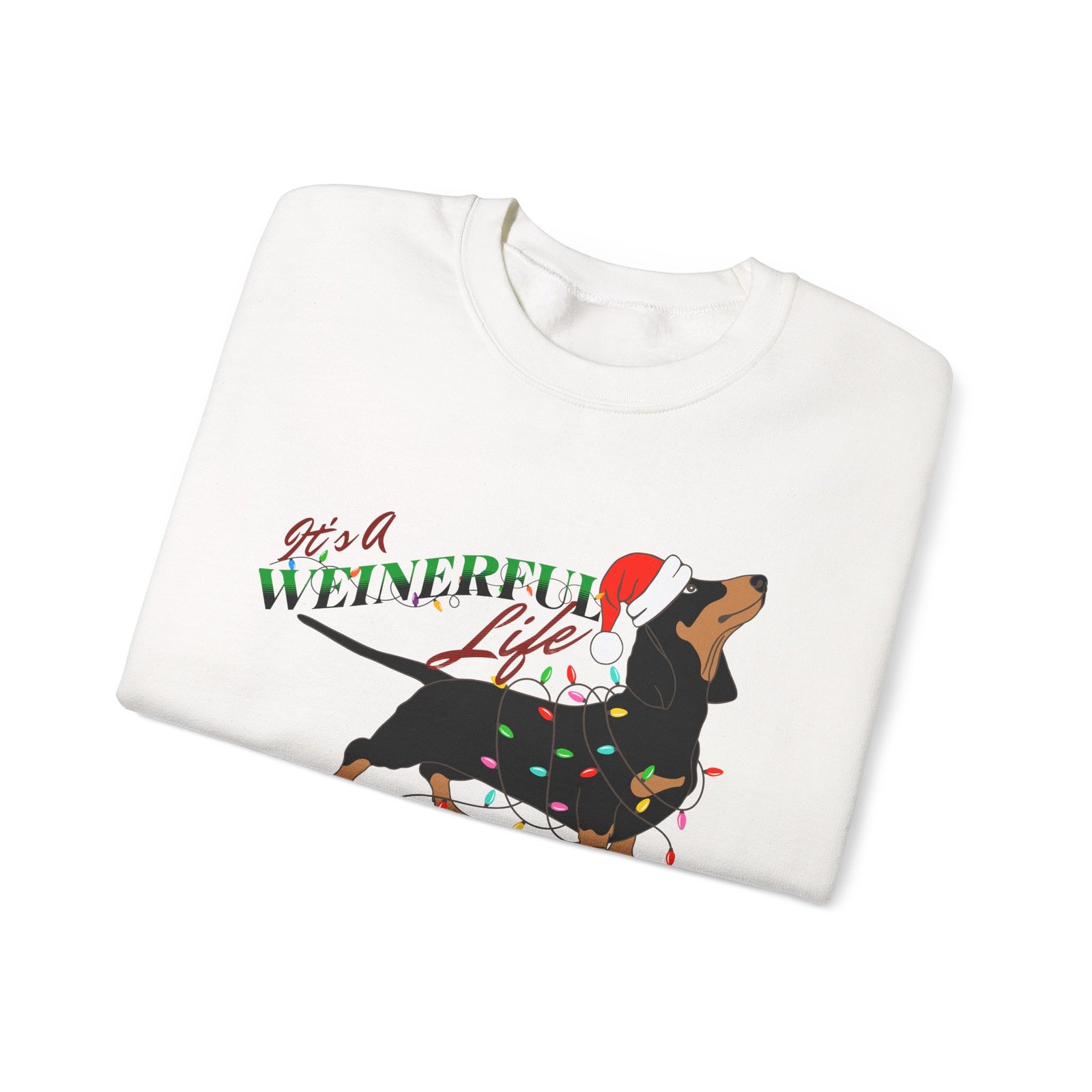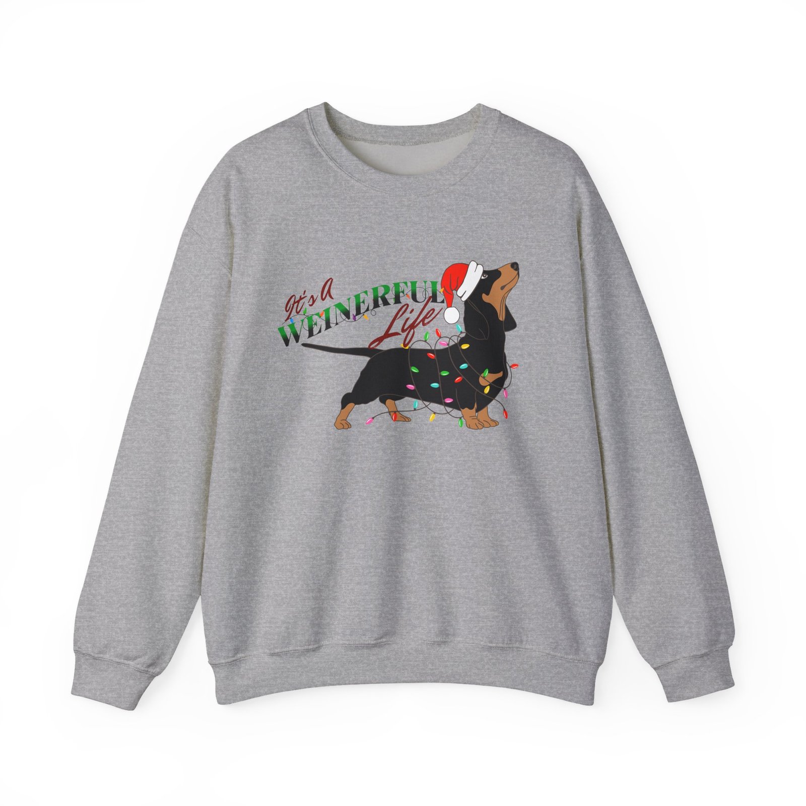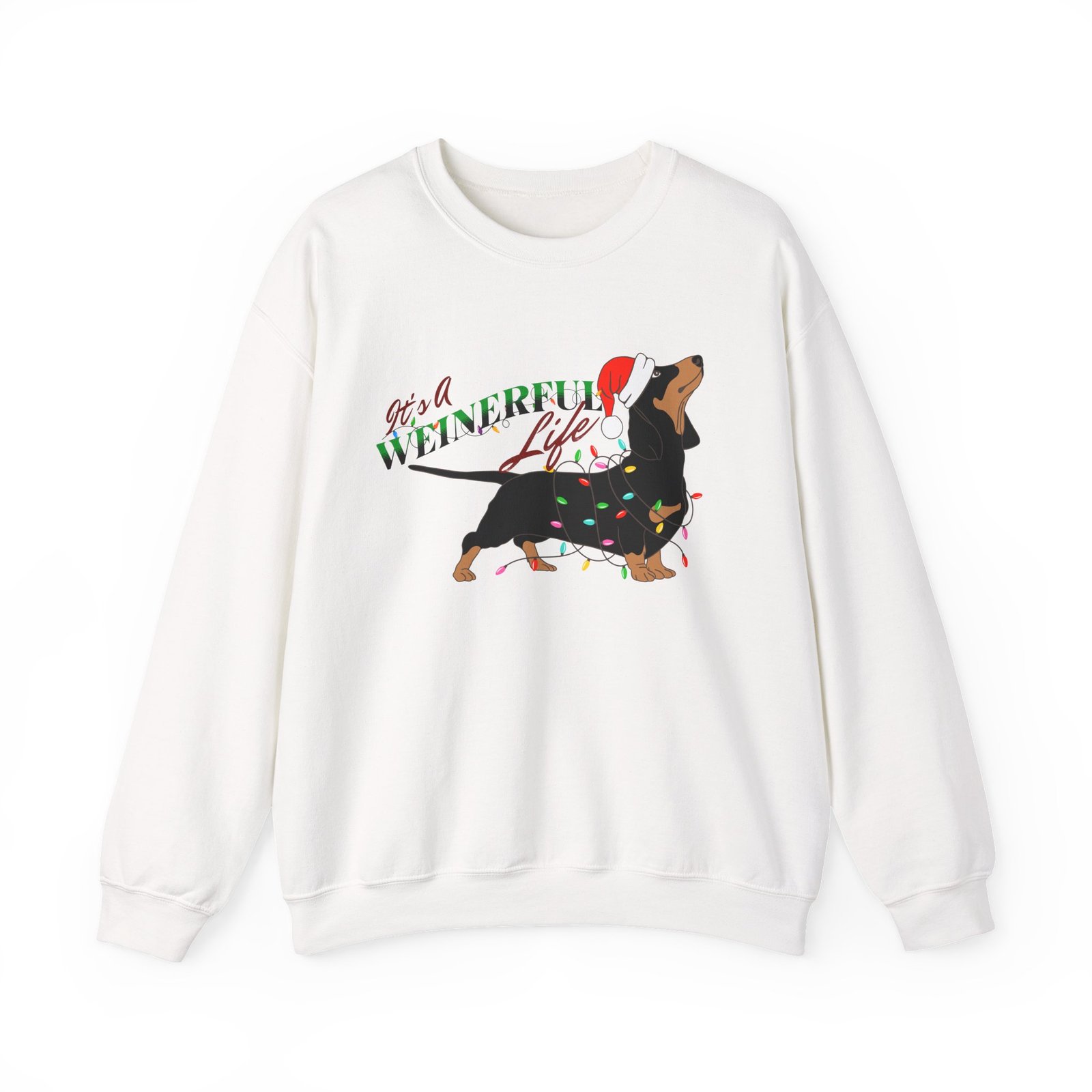 Celebrate the holidays in adorable style with our “It’s a Wienerful Life” Dachshund Christmas Sweatshirt. Featuring a cute doxie tangled in colorful Christmas lights and wearing a Santa hat, this cozy crewneck is the perfect festive wear for dog lovers and proud dachshund owners. Get ready for some merry “wiener” kisses. Relevant for Christmas celebrations and dog lovers. Product features – Ethically grown US cotton – Ribbed knit collar for shape retention – Meets safety and environmental standards – Classic fit for comfort – Embroidery decoration available Care instructions – Machine wash: cold (max 30C or 90F) – Non-chlorine: bleach as needed – Tumble dry: low heat – Do not iron – Do not dryclean