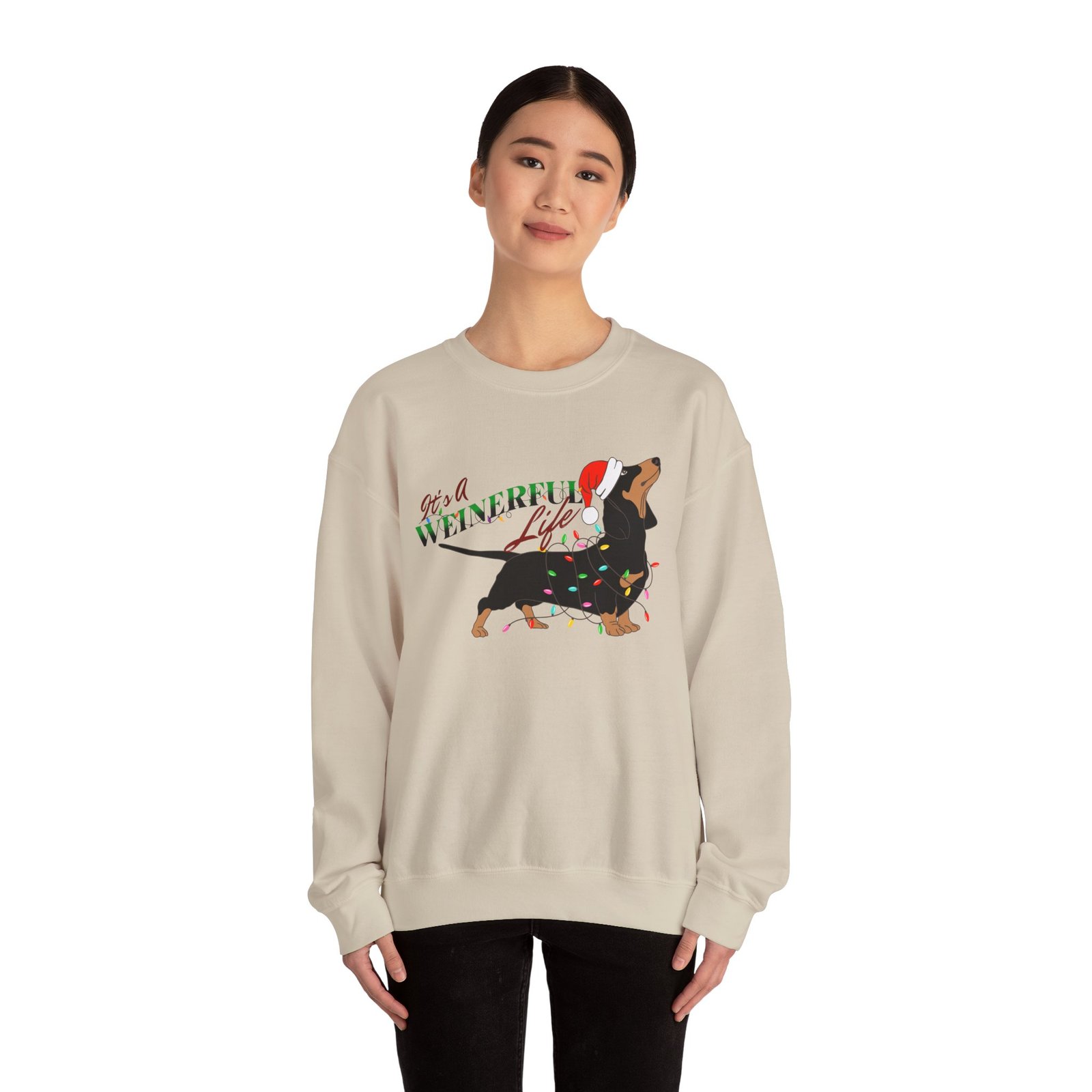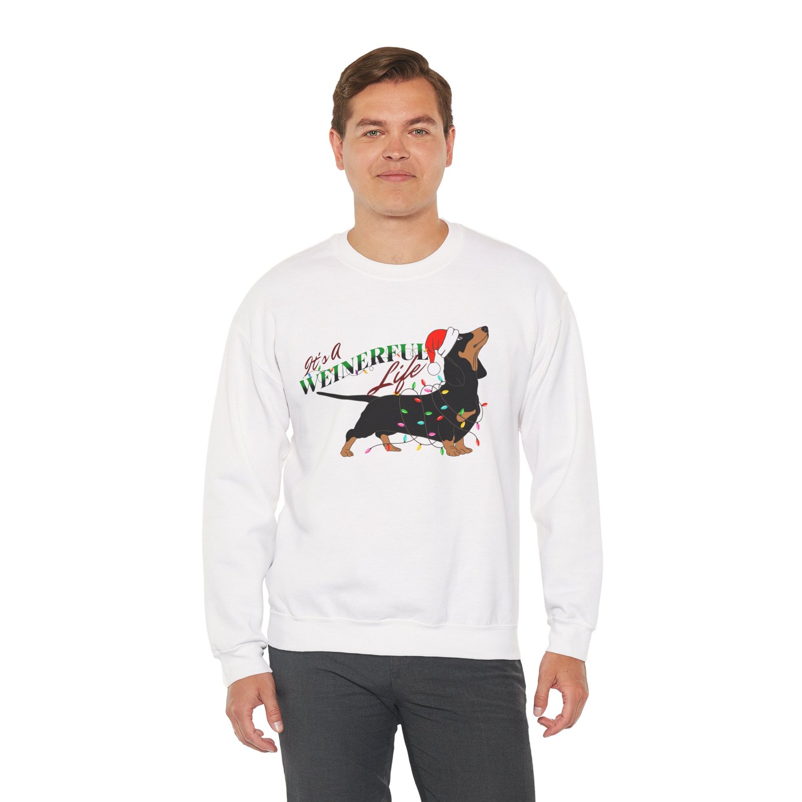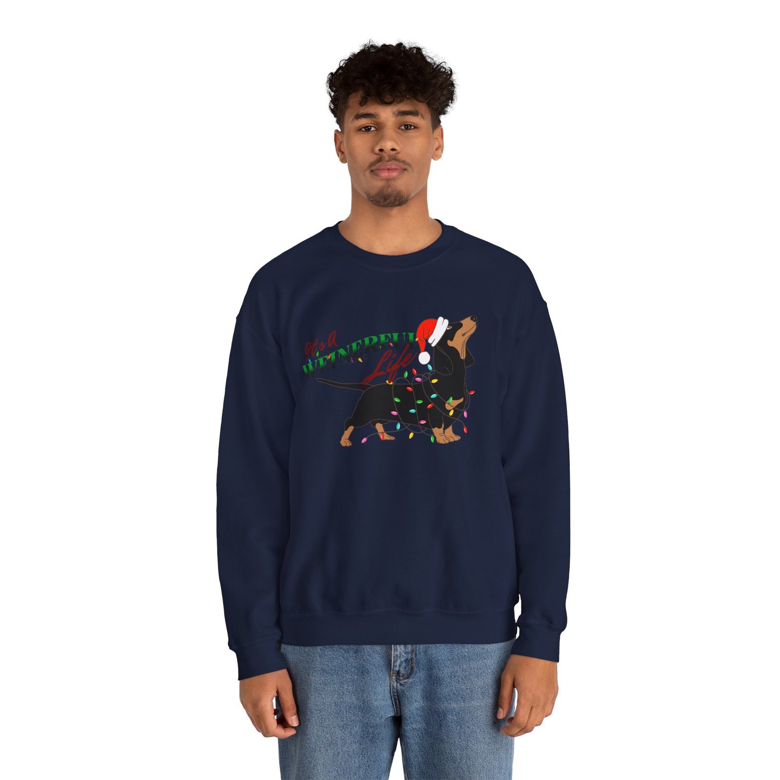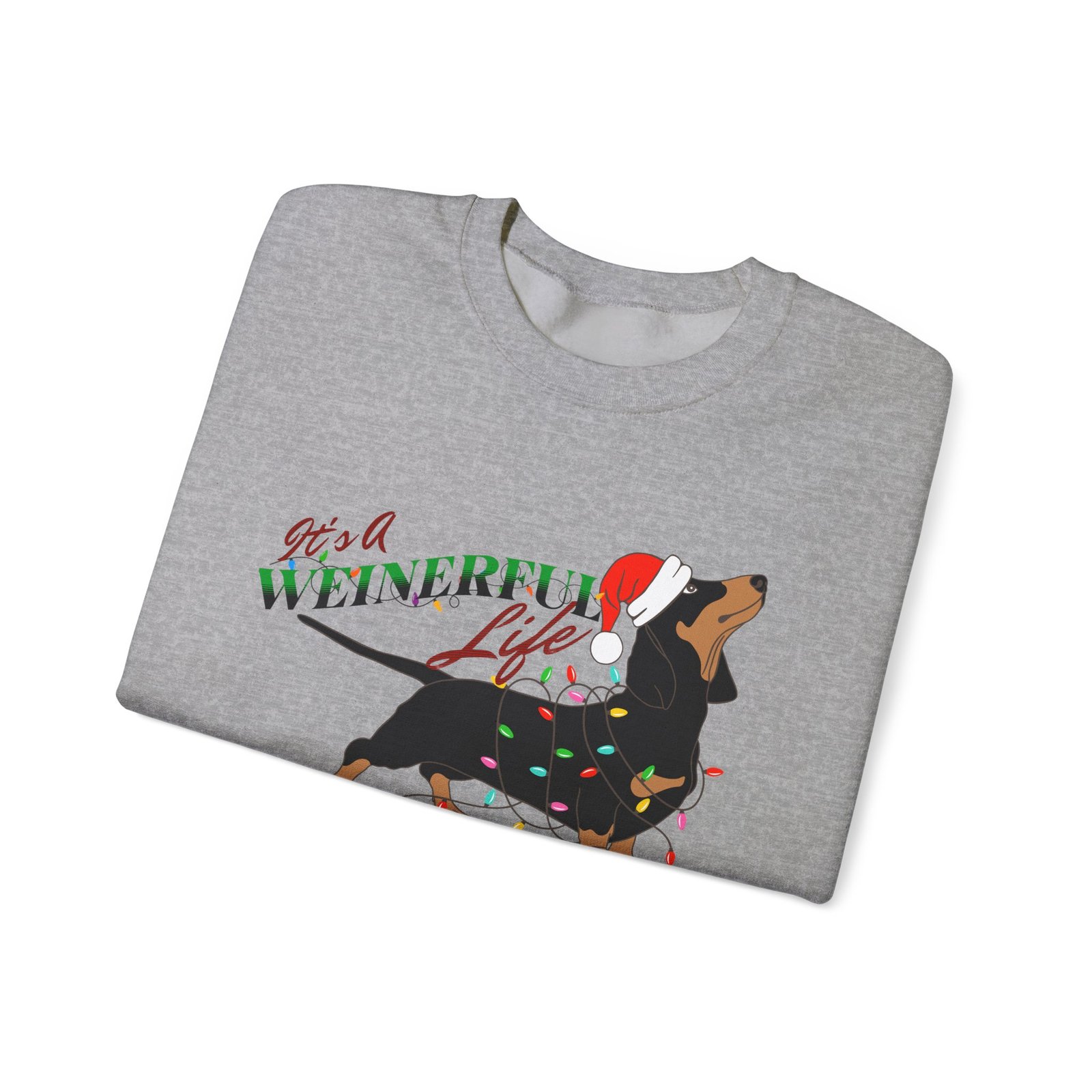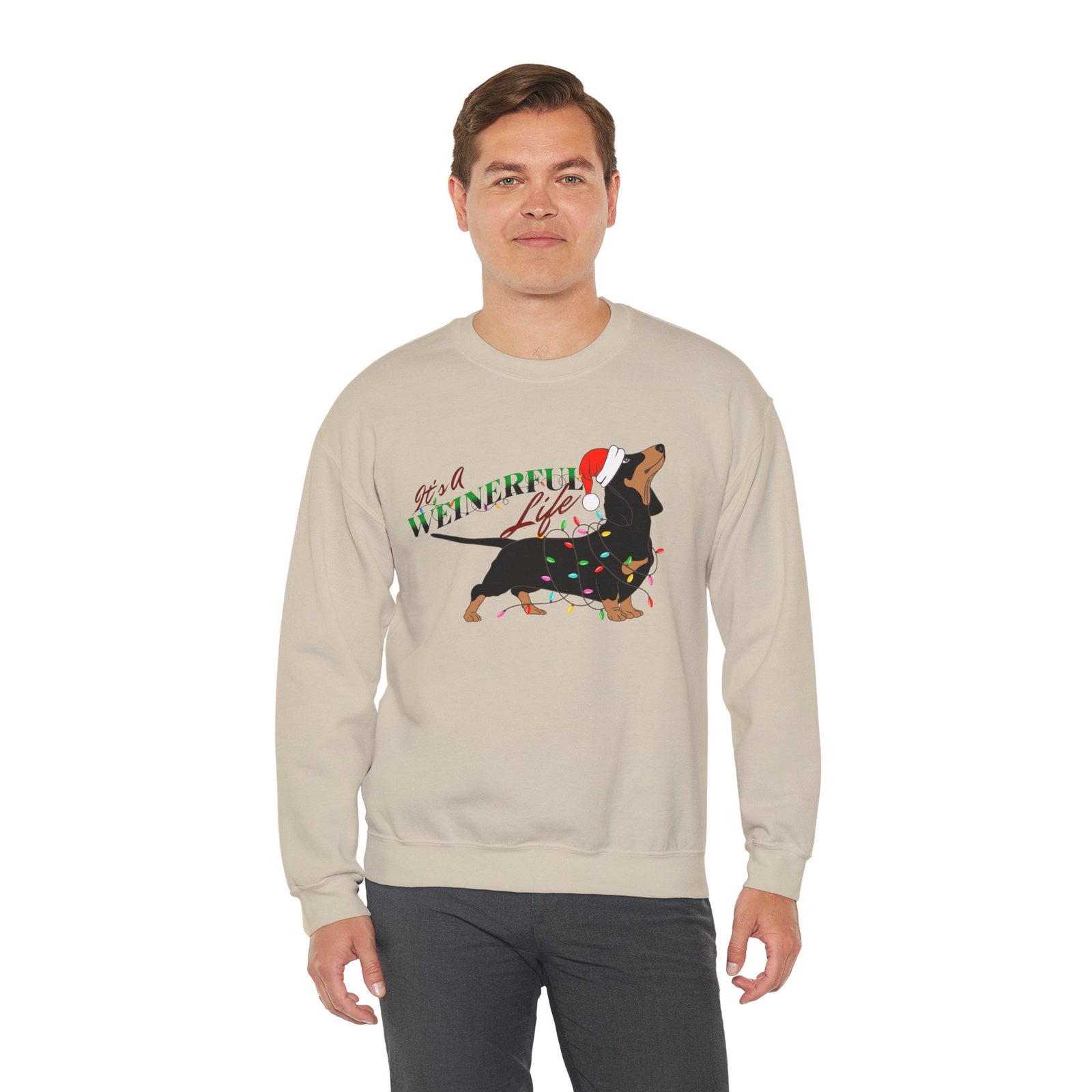 Celebrate the holidays in adorable style with our “It’s a Wienerful Life” Dachshund Christmas Sweatshirt. Featuring a cute doxie tangled in colorful Christmas lights and wearing a Santa hat, this cozy crewneck is the perfect festive wear for dog lovers and proud dachshund owners. Get ready for some merry “wiener” kisses. Relevant for Christmas celebrations and dog lovers. Product features – Ethically grown US cotton – Ribbed knit collar for shape retention – Meets safety and environmental standards – Classic fit for comfort – Embroidery decoration available Care instructions – Machine wash: cold (max 30C or 90F) – Non-chlorine: bleach as needed – Tumble dry: low heat – Do not iron – Do not dryclean