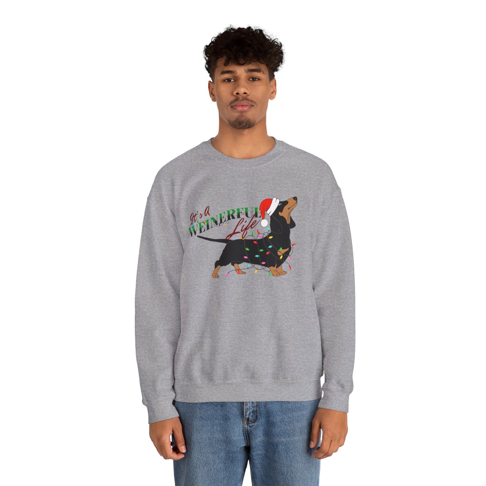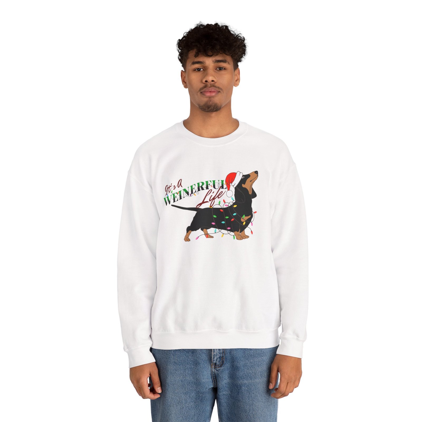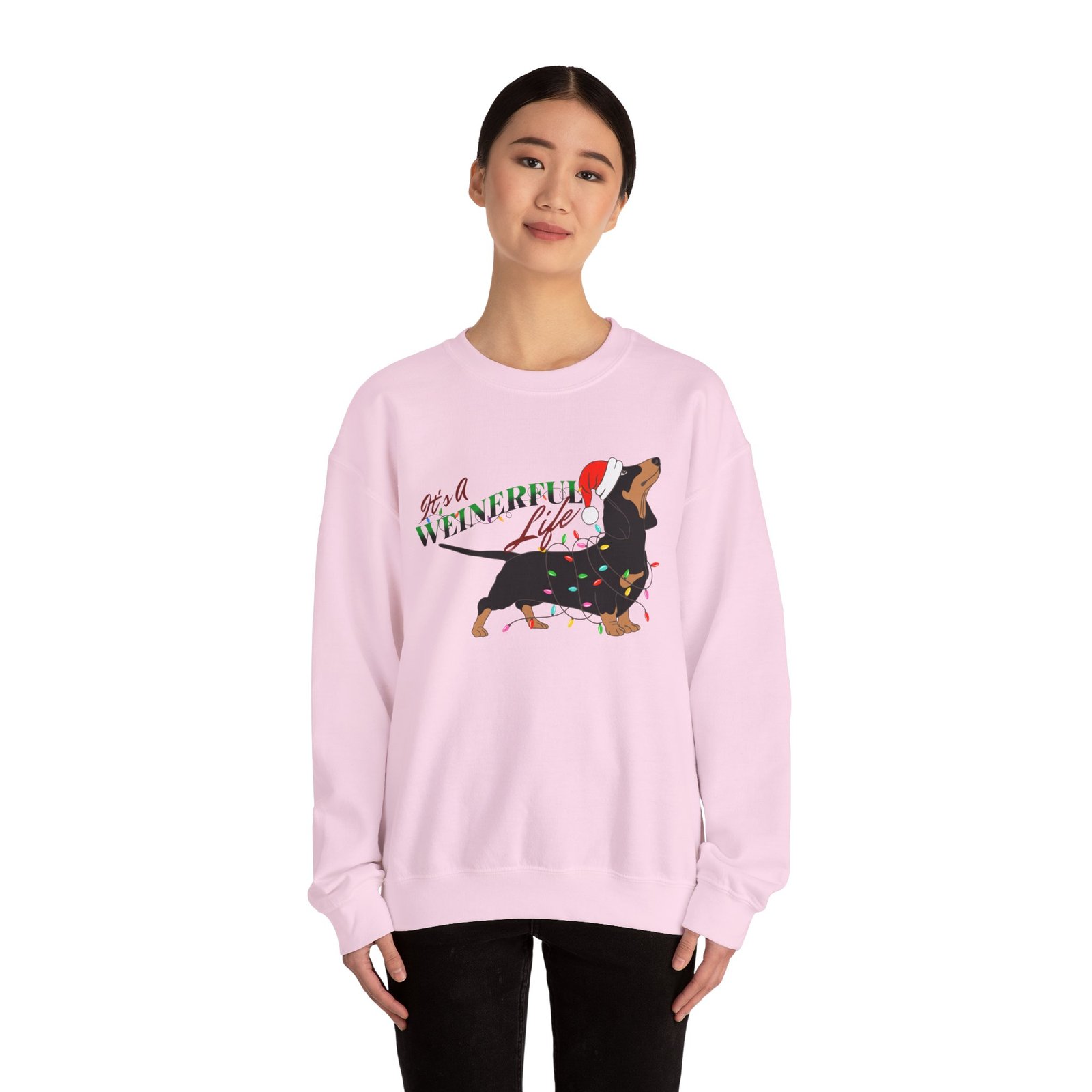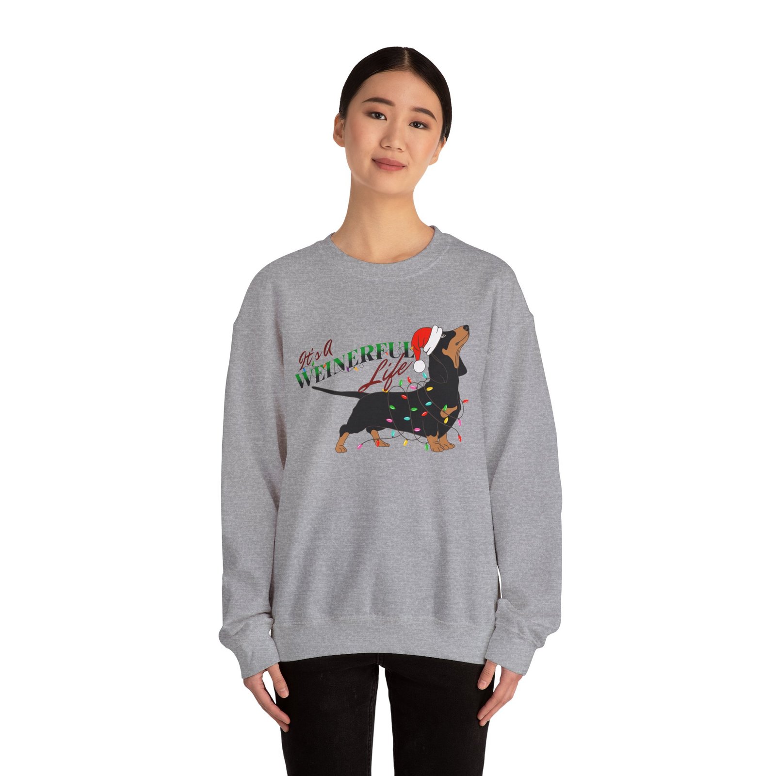 Celebrate the holidays in adorable style with our “It’s a Wienerful Life” Dachshund Christmas Sweatshirt. Featuring a cute doxie tangled in colorful Christmas lights and wearing a Santa hat, this cozy crewneck is the perfect festive wear for dog lovers and proud dachshund owners. Get ready for some merry “wiener” kisses. Relevant for Christmas celebrations and dog lovers. Product features – Ethically grown US cotton – Ribbed knit collar for shape retention – Meets safety and environmental standards – Classic fit for comfort – Embroidery decoration available Care instructions – Machine wash: cold (max 30C or 90F) – Non-chlorine: bleach as needed – Tumble dry: low heat – Do not iron – Do not dryclean