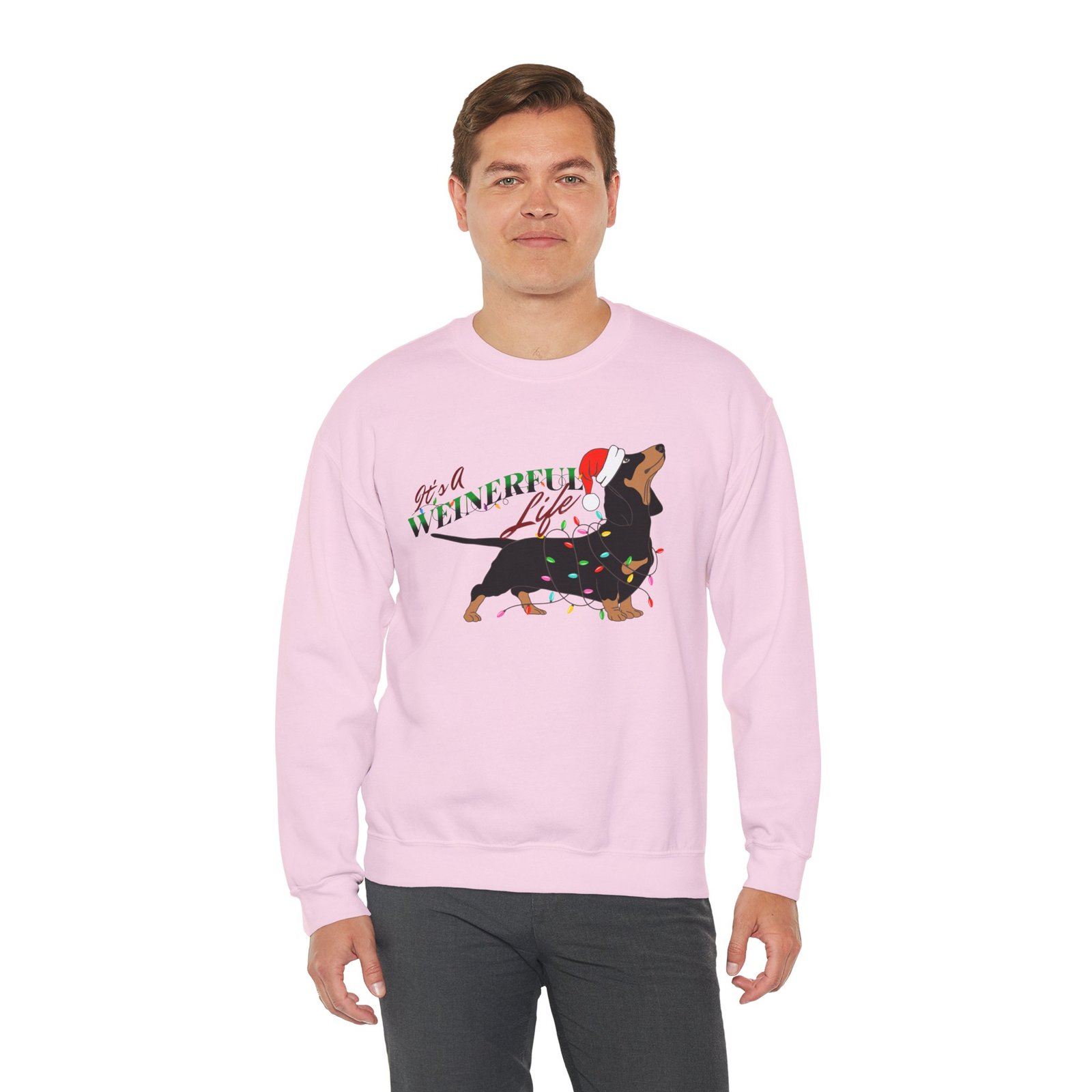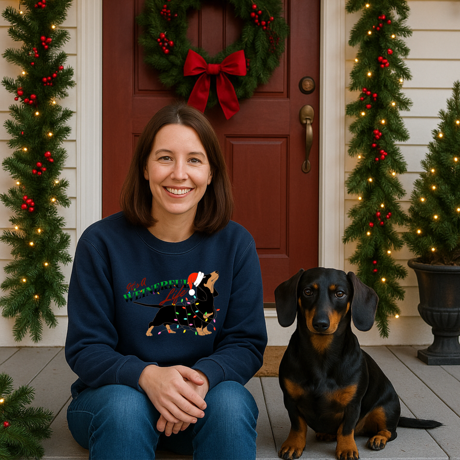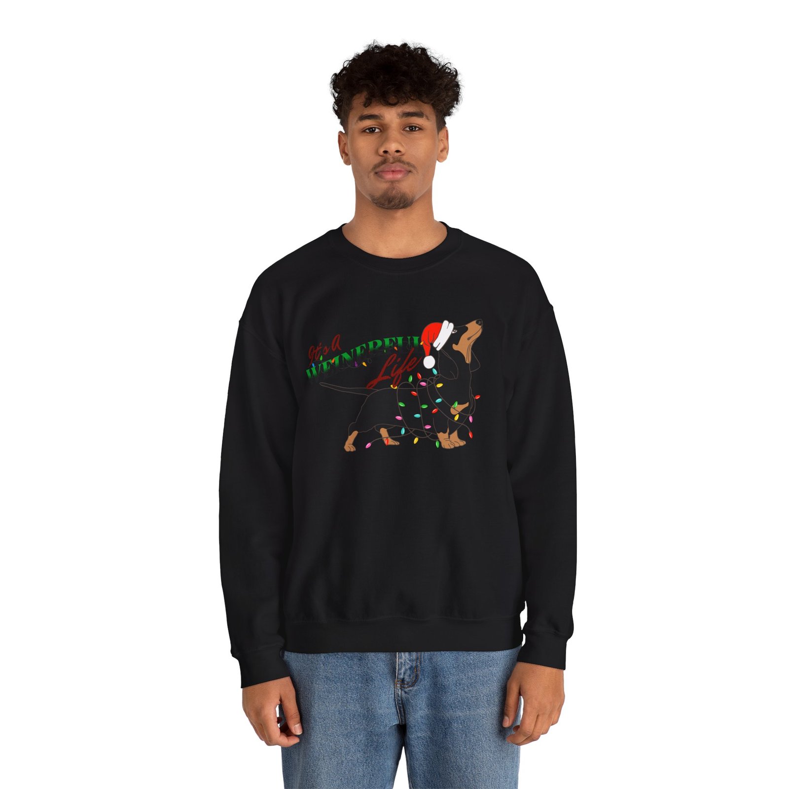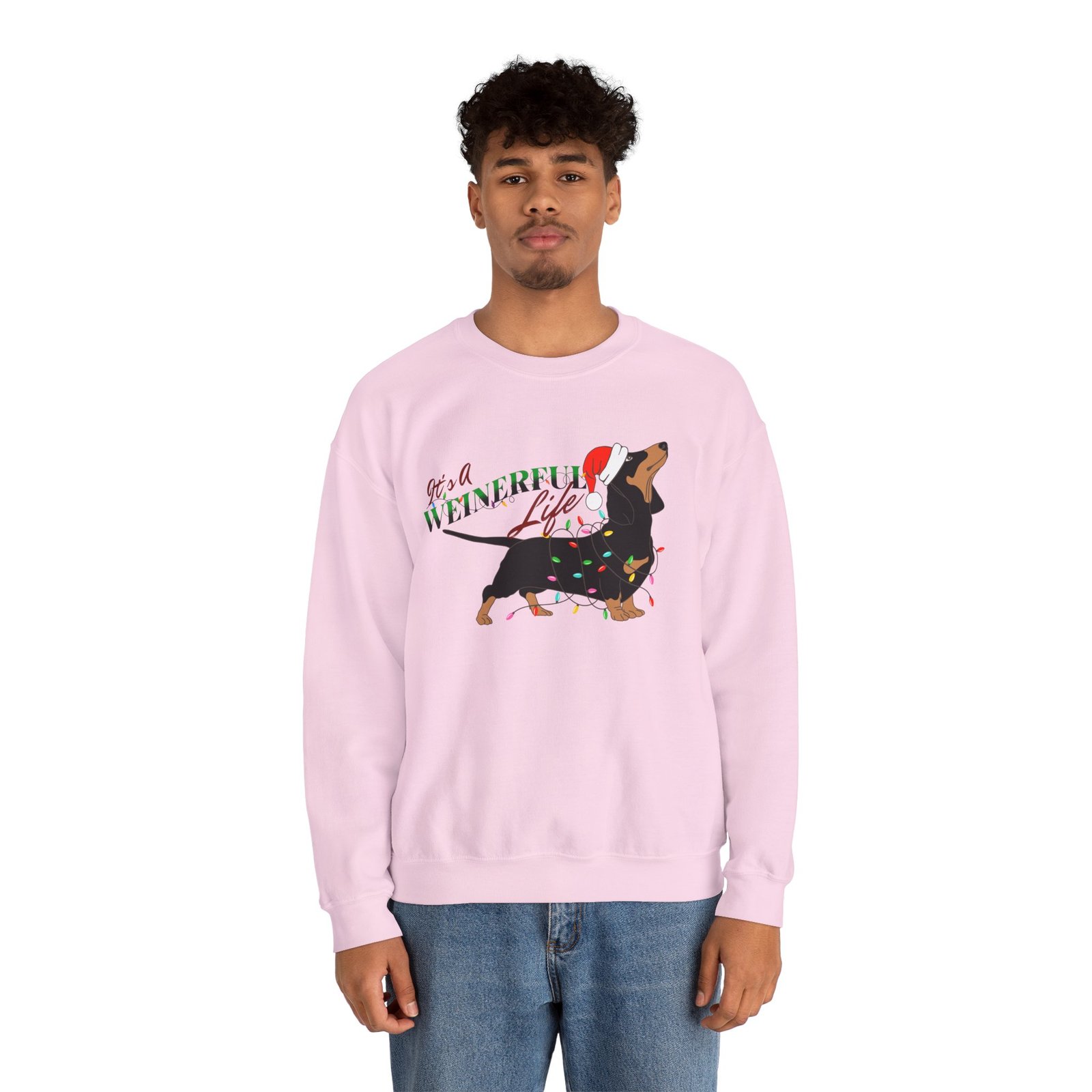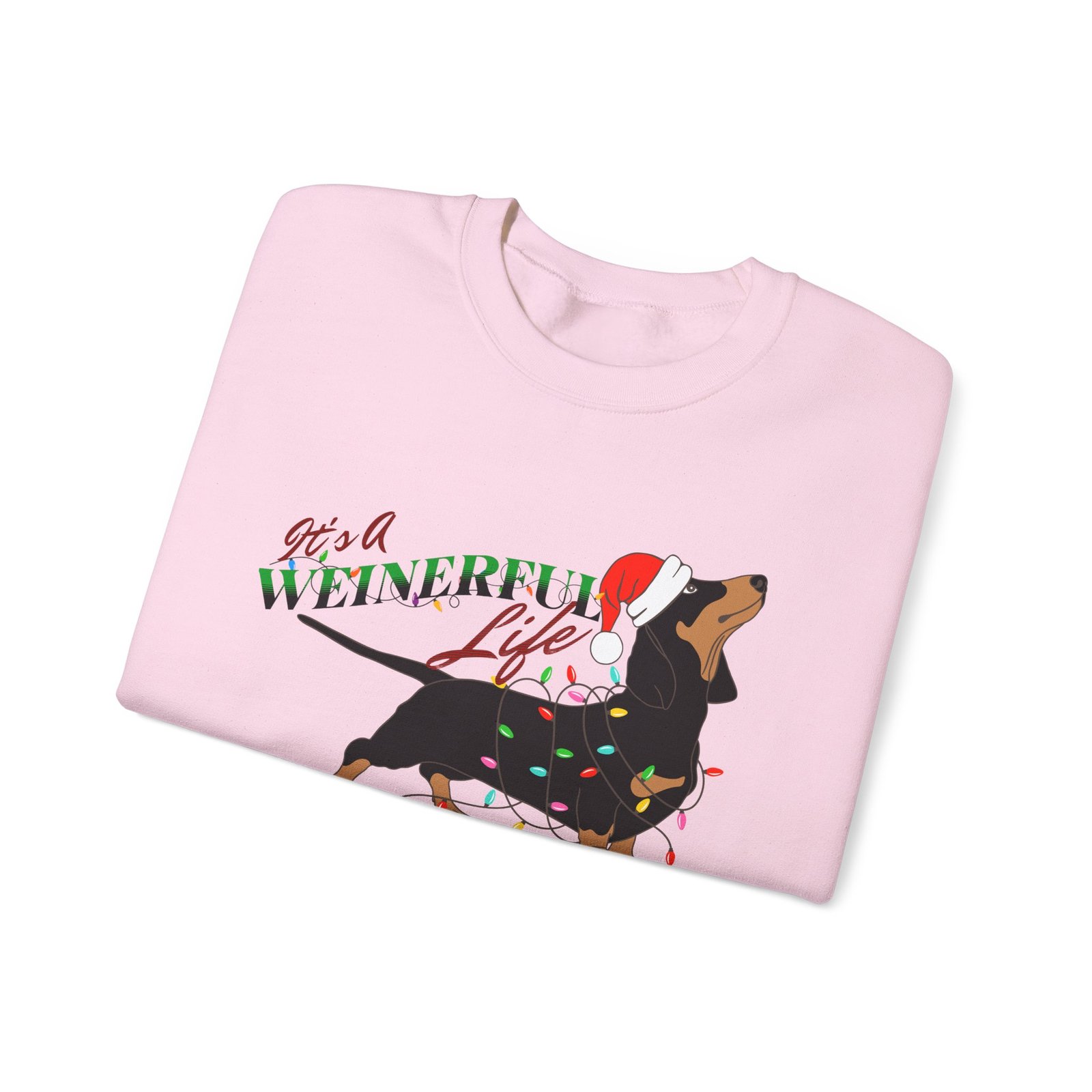 Celebrate the holidays in adorable style with our “It’s a Wienerful Life” Dachshund Christmas Sweatshirt. Featuring a cute doxie tangled in colorful Christmas lights and wearing a Santa hat, this cozy crewneck is the perfect festive wear for dog lovers and proud dachshund owners. Get ready for some merry “wiener” kisses. Relevant for Christmas celebrations and dog lovers. Product features – Ethically grown US cotton – Ribbed knit collar for shape retention – Meets safety and environmental standards – Classic fit for comfort – Embroidery decoration available Care instructions – Machine wash: cold (max 30C or 90F) – Non-chlorine: bleach as needed – Tumble dry: low heat – Do not iron – Do not dryclean