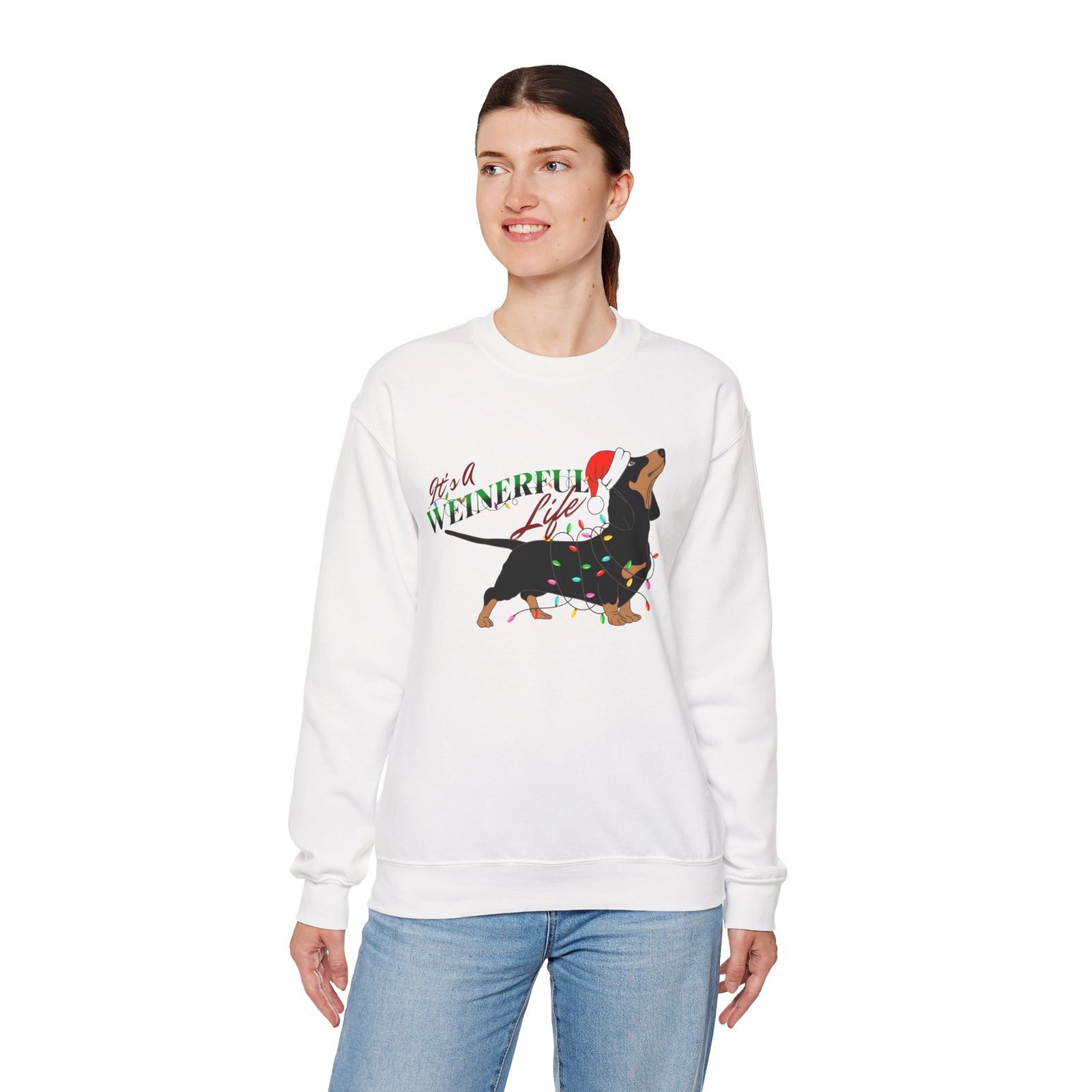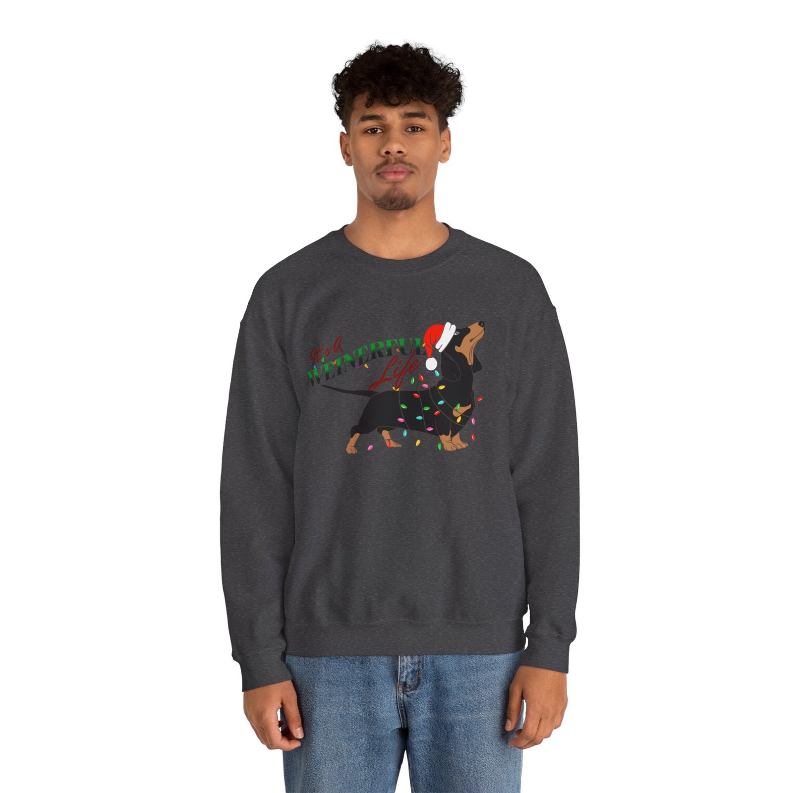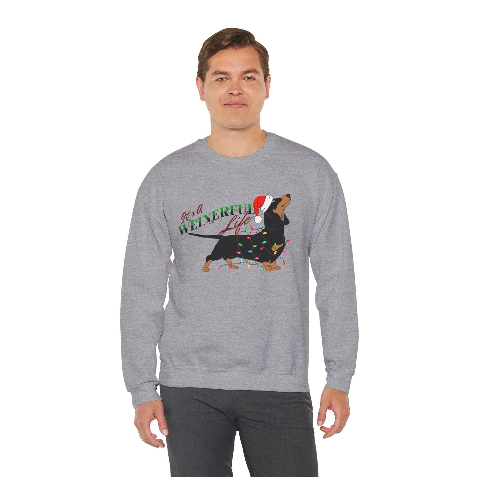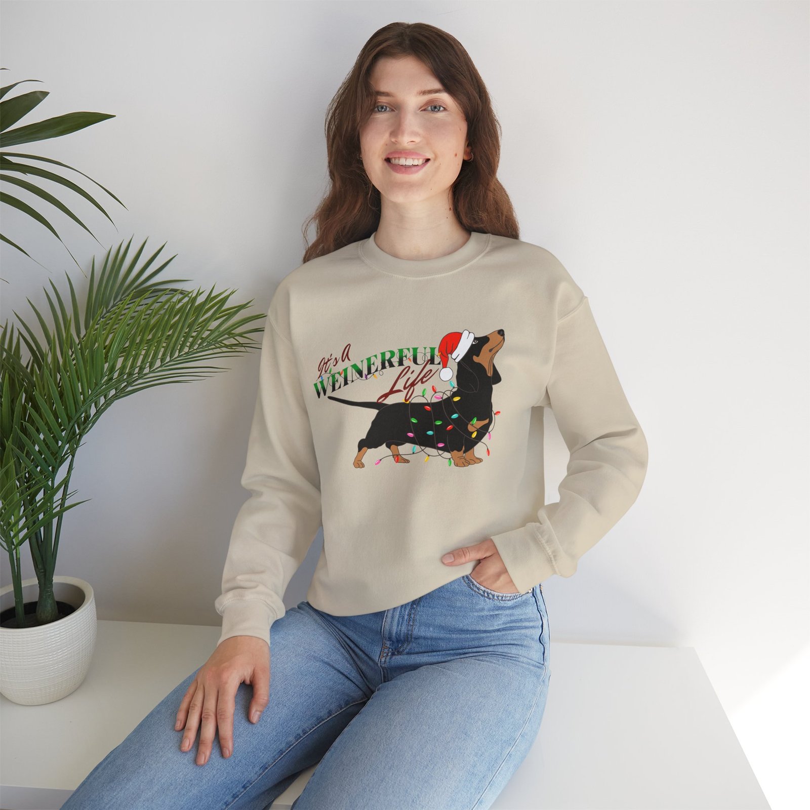 Celebrate the holidays in adorable style with our “It’s a Wienerful Life” Dachshund Christmas Sweatshirt. Featuring a cute doxie tangled in colorful Christmas lights and wearing a Santa hat, this cozy crewneck is the perfect festive wear for dog lovers and proud dachshund owners. Get ready for some merry “wiener” kisses. Relevant for Christmas celebrations and dog lovers. Product features – Ethically grown US cotton – Ribbed knit collar for shape retention – Meets safety and environmental standards – Classic fit for comfort – Embroidery decoration available Care instructions – Machine wash: cold (max 30C or 90F) – Non-chlorine: bleach as needed – Tumble dry: low heat – Do not iron – Do not dryclean