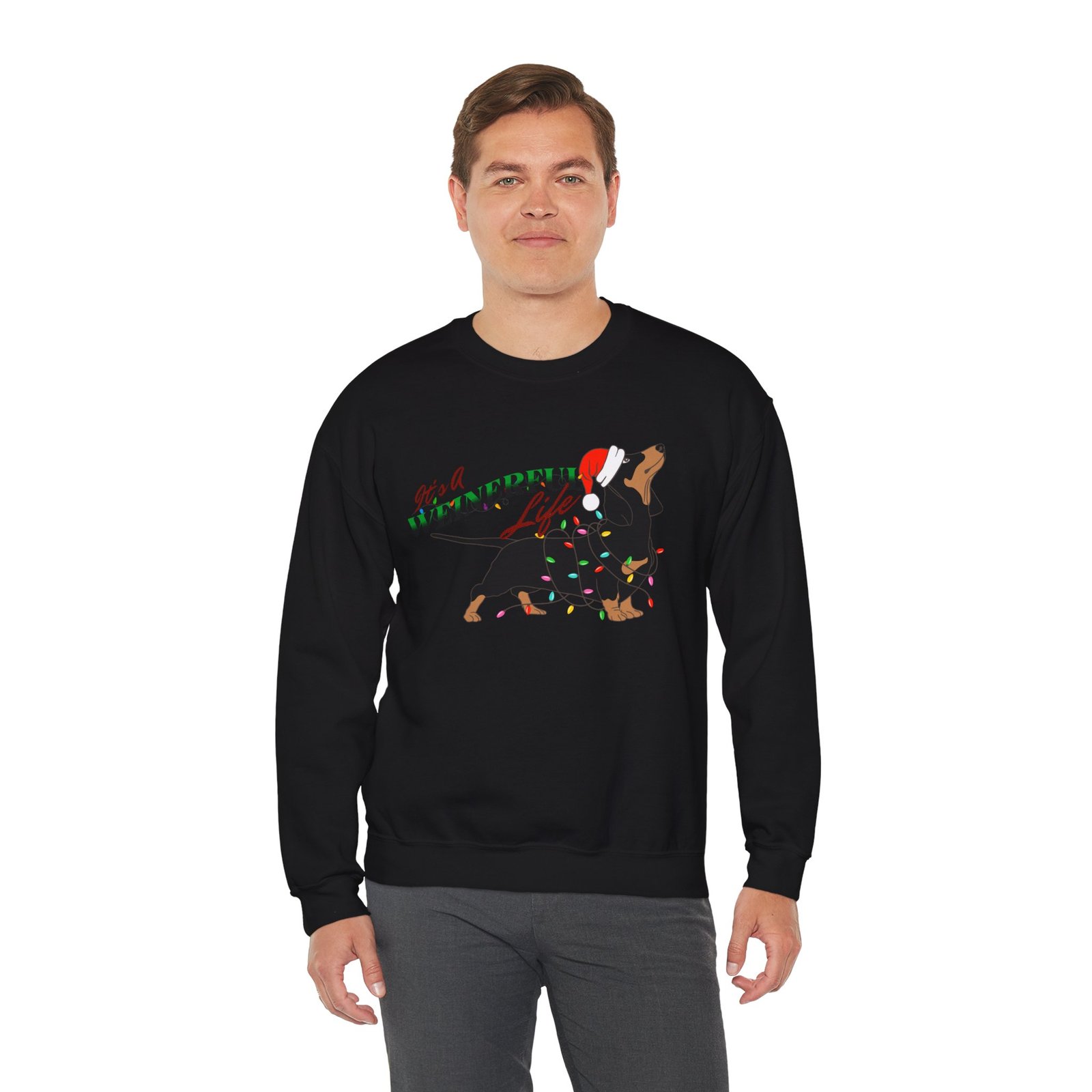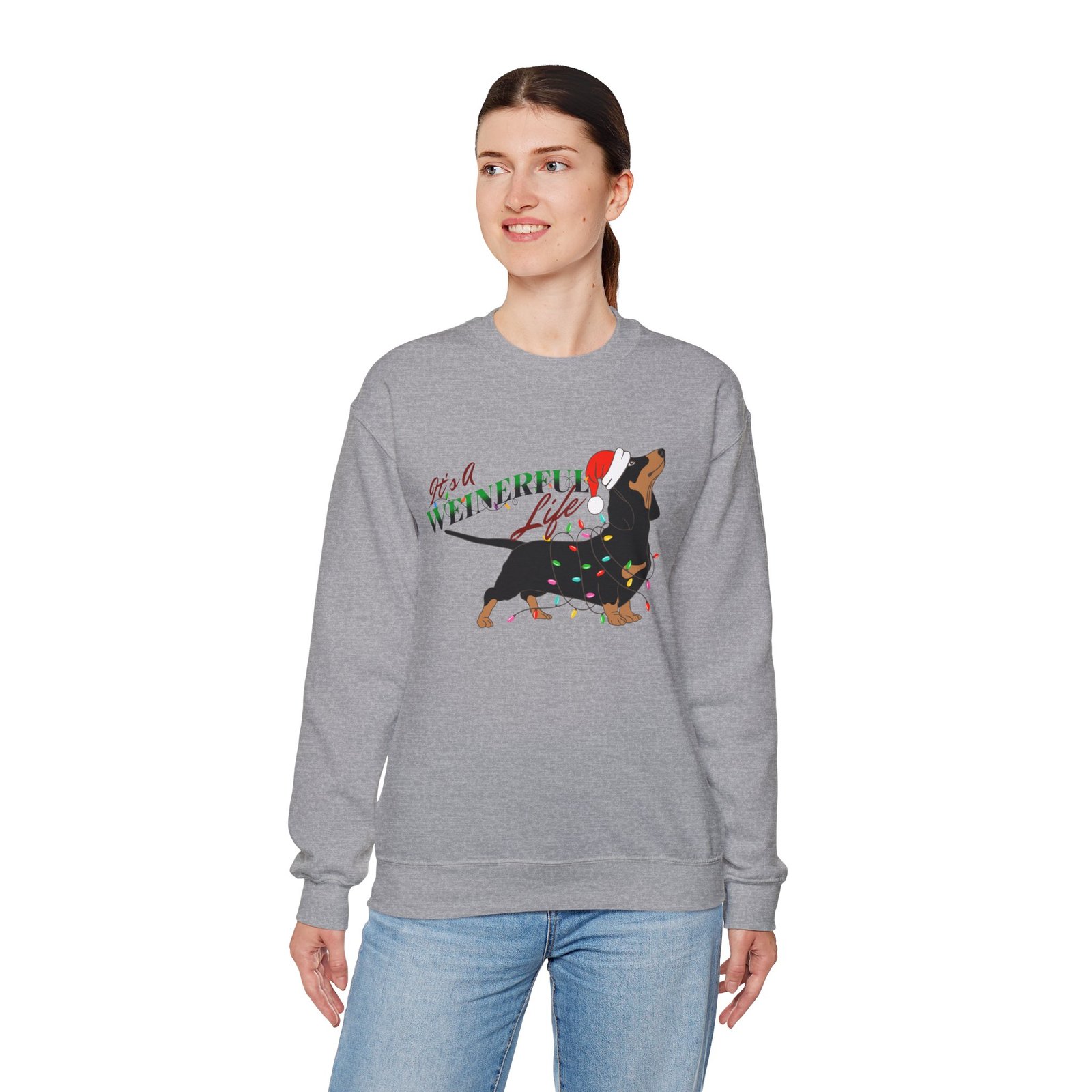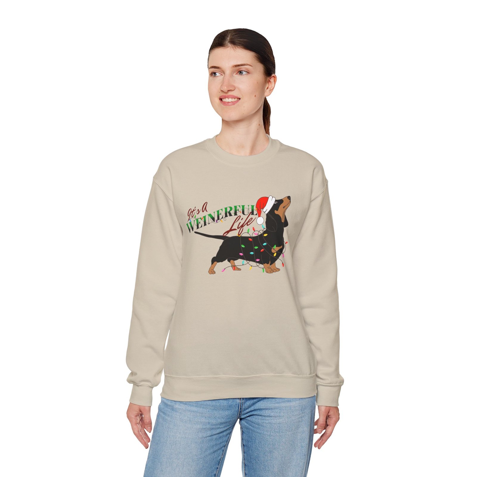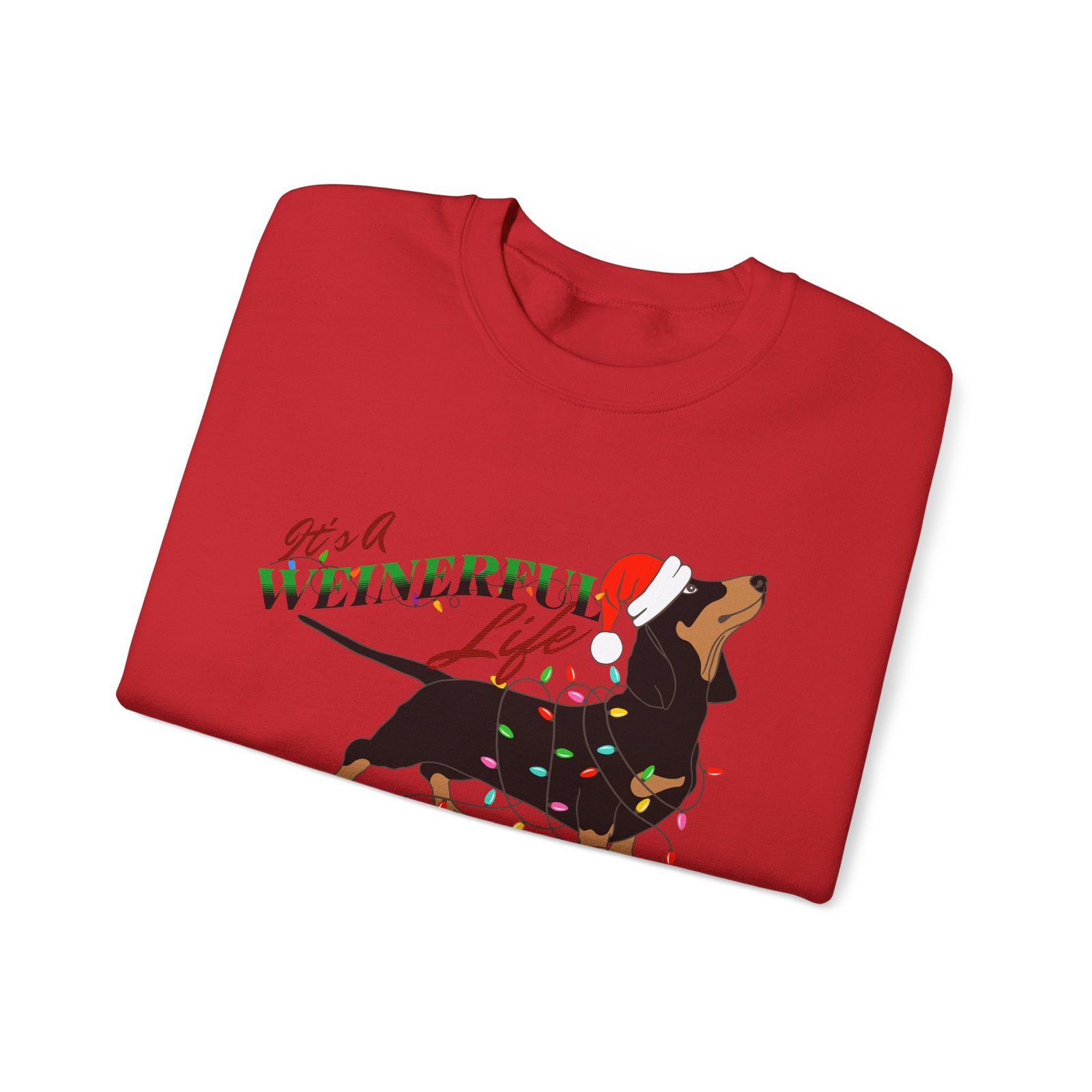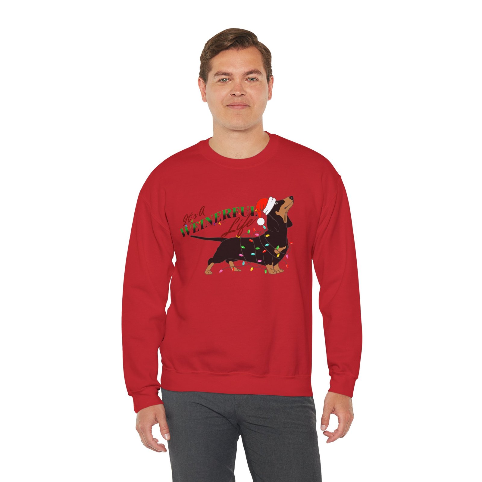 Celebrate the holidays in adorable style with our “It’s a Wienerful Life” Dachshund Christmas Sweatshirt. Featuring a cute doxie tangled in colorful Christmas lights and wearing a Santa hat, this cozy crewneck is the perfect festive wear for dog lovers and proud dachshund owners. Get ready for some merry “wiener” kisses. Relevant for Christmas celebrations and dog lovers. Product features – Ethically grown US cotton – Ribbed knit collar for shape retention – Meets safety and environmental standards – Classic fit for comfort – Embroidery decoration available Care instructions – Machine wash: cold (max 30C or 90F) – Non-chlorine: bleach as needed – Tumble dry: low heat – Do not iron – Do not dryclean