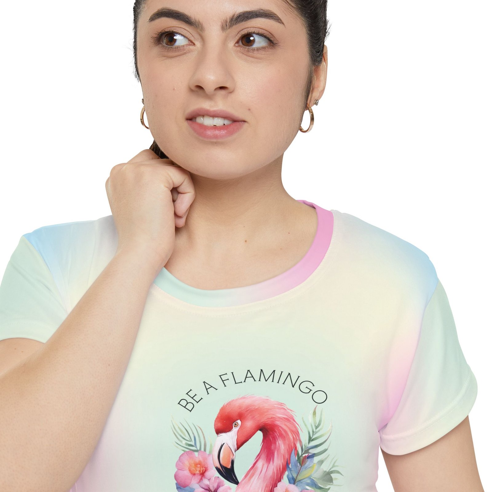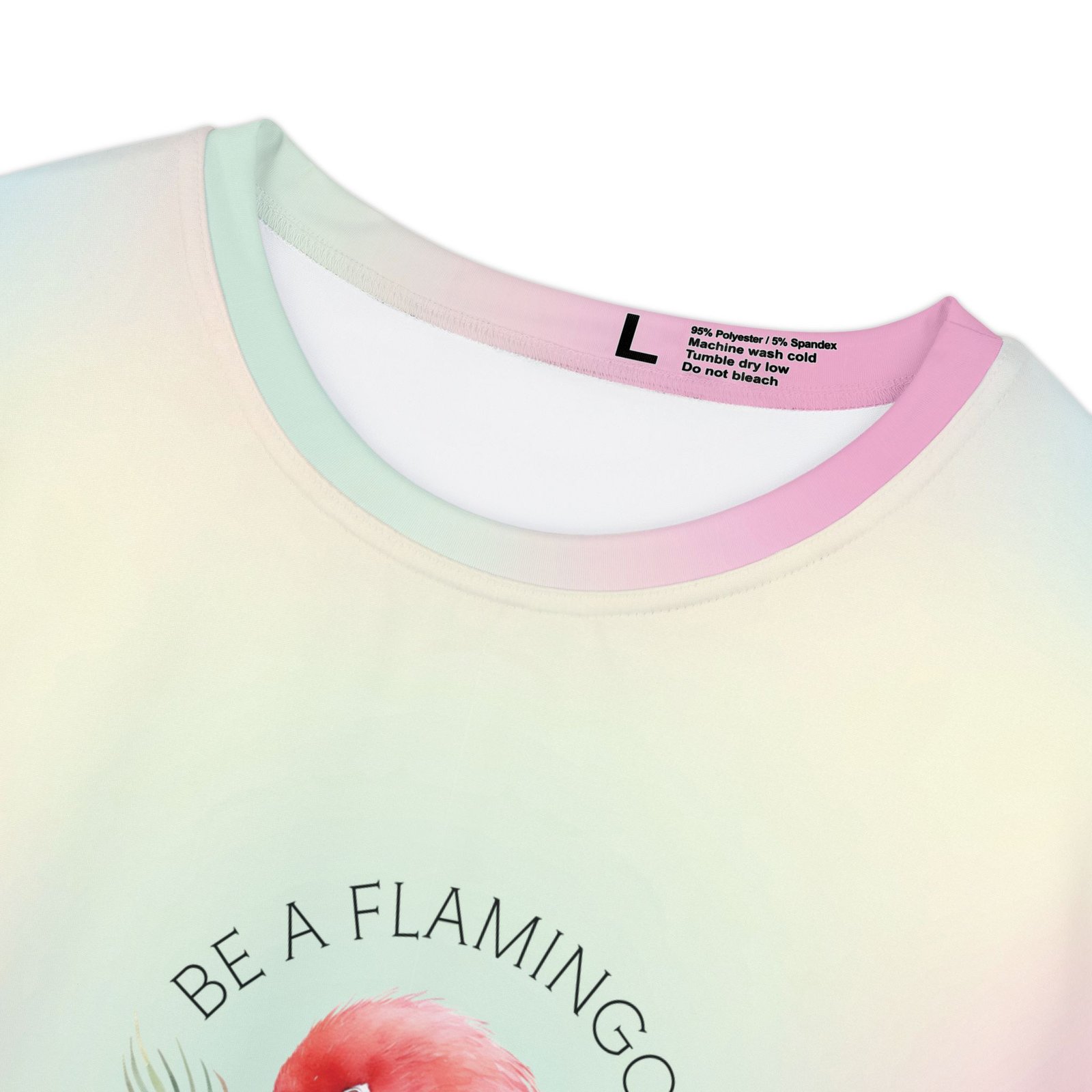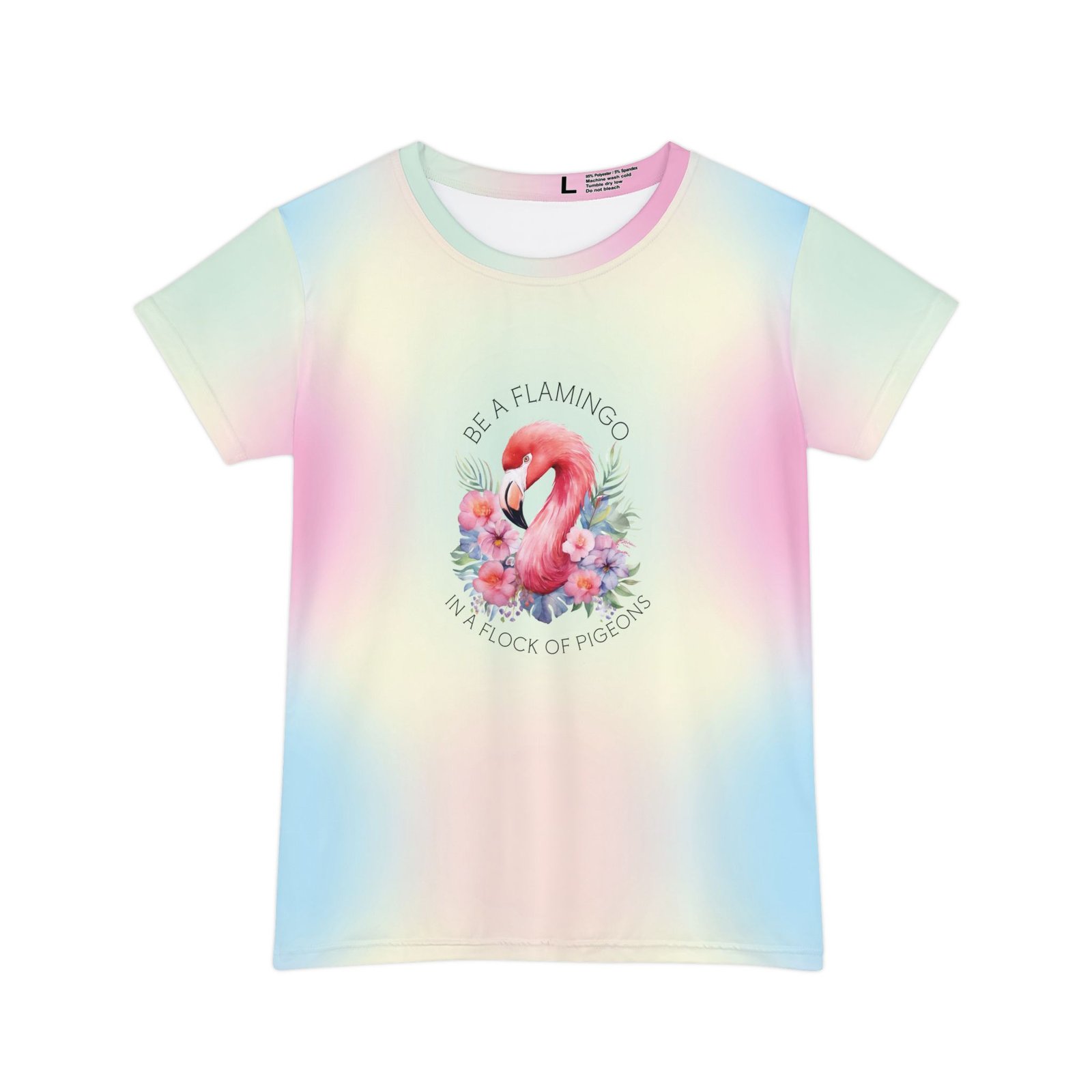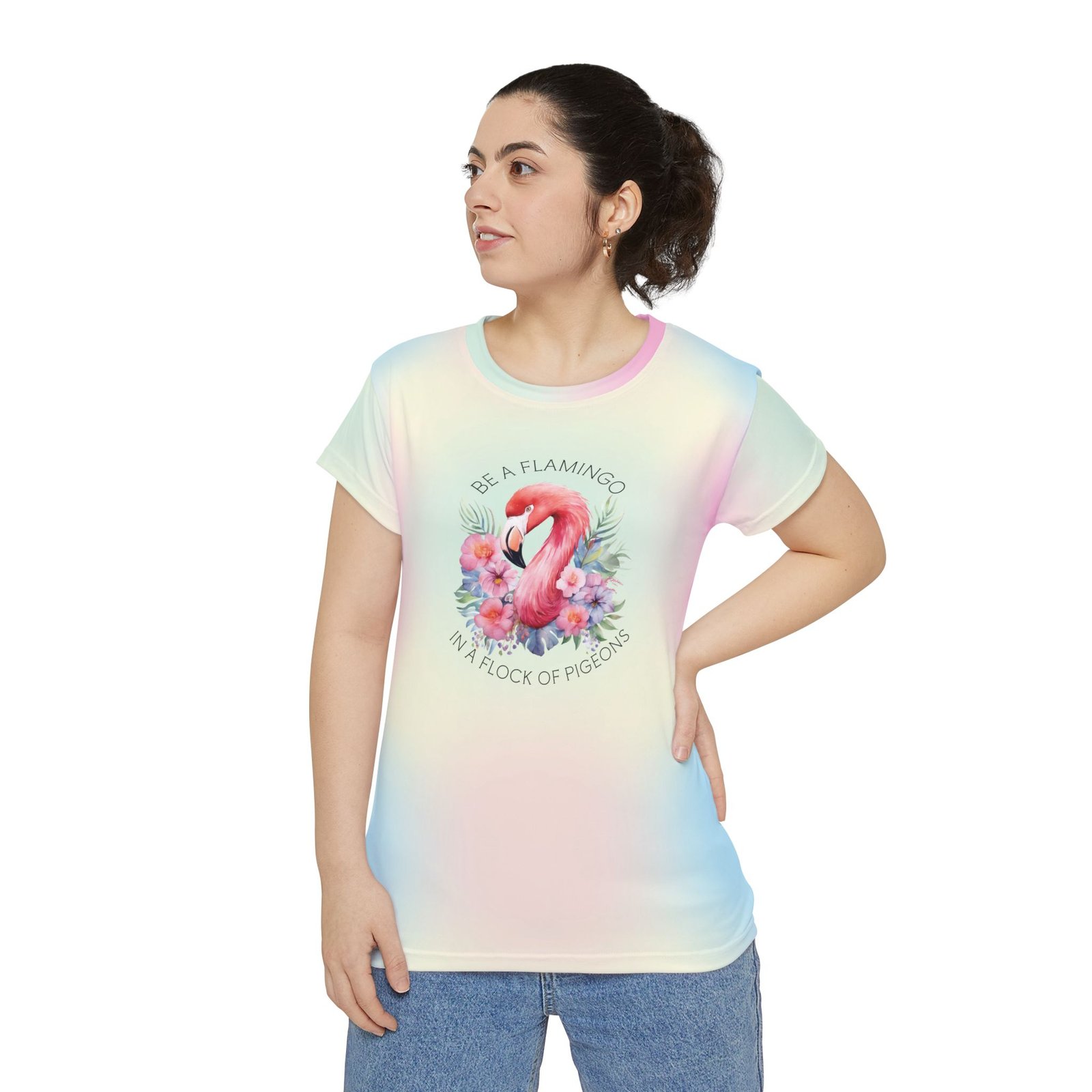 This women’s short sleeve t-shirt features a fun and empowering design that sets you apart from the crowd. Be a flamingo in a flock of pigeons with this unique and stylish shirt. Perfect for women who embrace their individuality and want to make a statement. Ideal for casual wear, outings with friends, or to add a pop of personality to your everyday wardrobe. Great for summer and warm weather occasions. Product features – Size and care label conveniently printed on inside of collar – Double needle sleeve, neck, and bottom hem for durability – 95% Polyester 5% Spandex fabric for strength and quick drying – Light fabric (5.6 oz/yd²) for comfort – Assembled in the USA from globally sourced parts Care instructions – Do not iron – Tumble dry: low heat – Do not bleach – Machine wash: cold (max 30C or 90F)