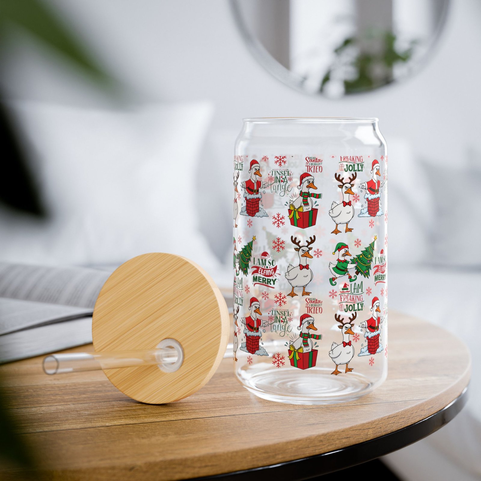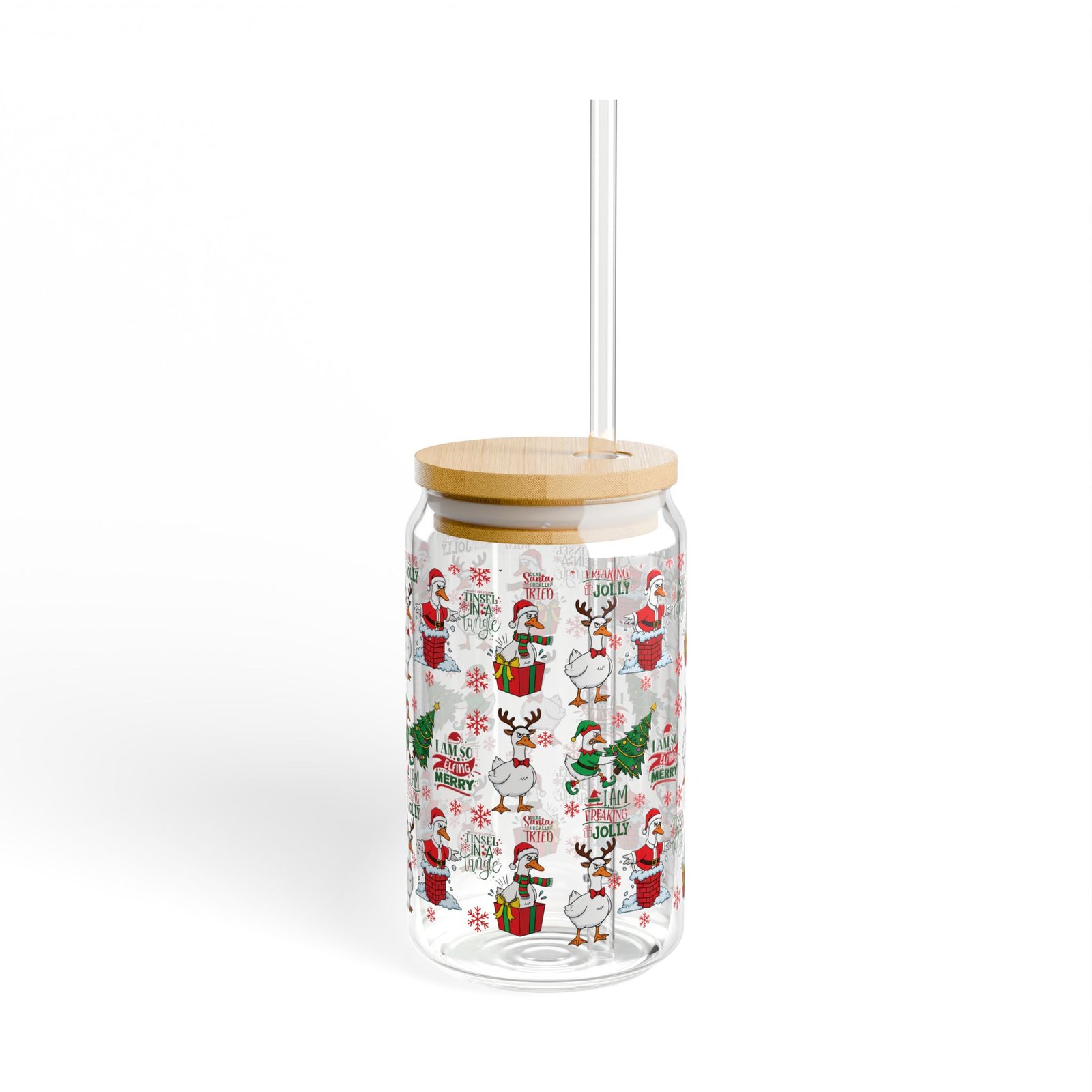 Embrace the holiday season with the Freaking Jolly Goose glass tumbler featuring a hilarious pattern of an unenthused goose in festive gear. Perfect for those who want to mockingly display their holiday cheer while secretly wanting to stay in bed. Ideal for iced coffee or holiday cocktails to get into a ‘freaking jolly’ mood. Comes with a bamboo lid and reusable glass straw for sustainable sipping.