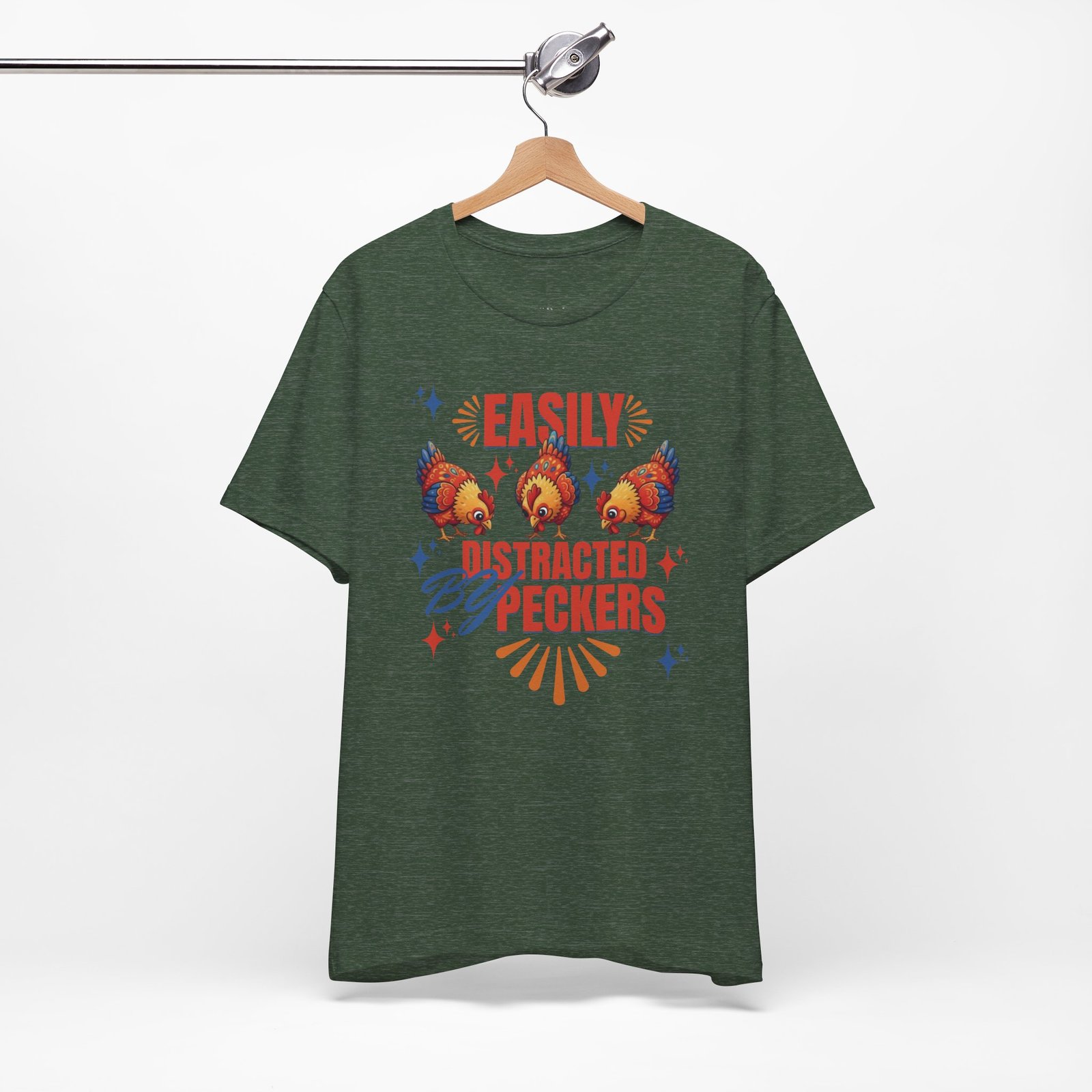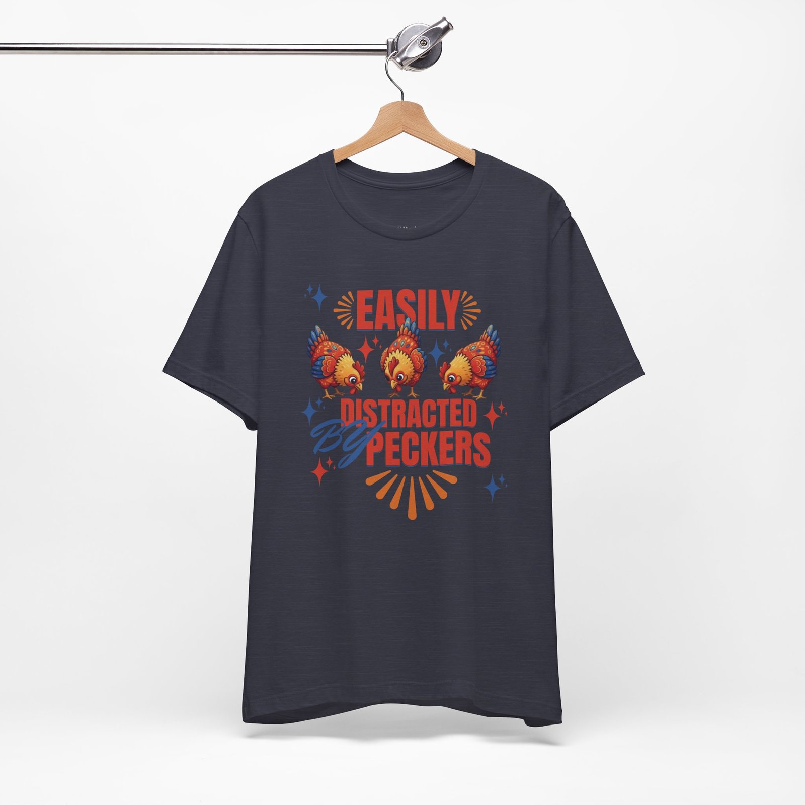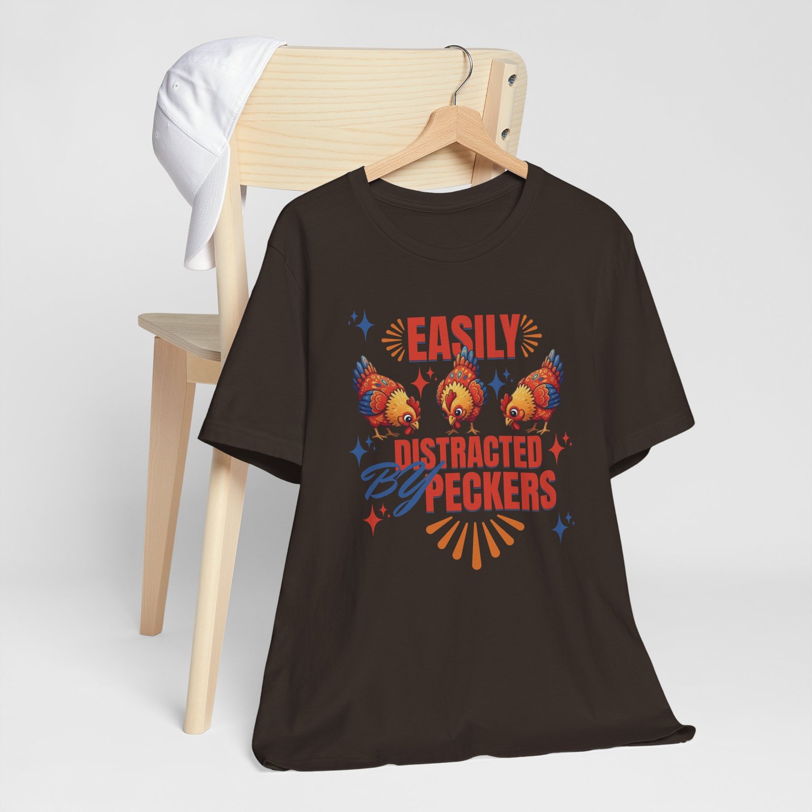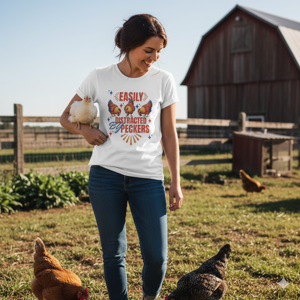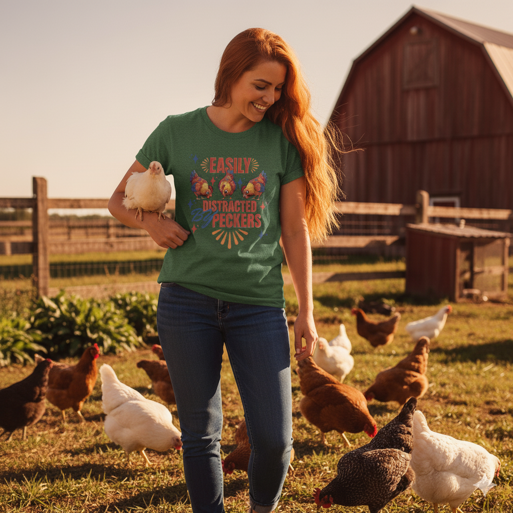 This rustic chicken t-shirt is perfect for any chicken enthusiast, homesteader, or lover of all things charmingly rustic. Featuring an adorable graphic of happy chickens pecking the ground against a warm farm backdrop, with the fun phrase ‘Easily Distracted By Peckers’. It’s a conversation starter for anyone who enjoys watching their flock. Perfect for casual wear, this tee is made from soft, breathable cotton for all-day comfort.