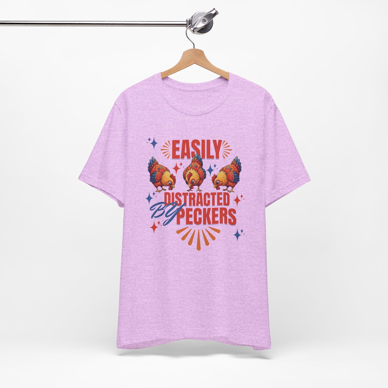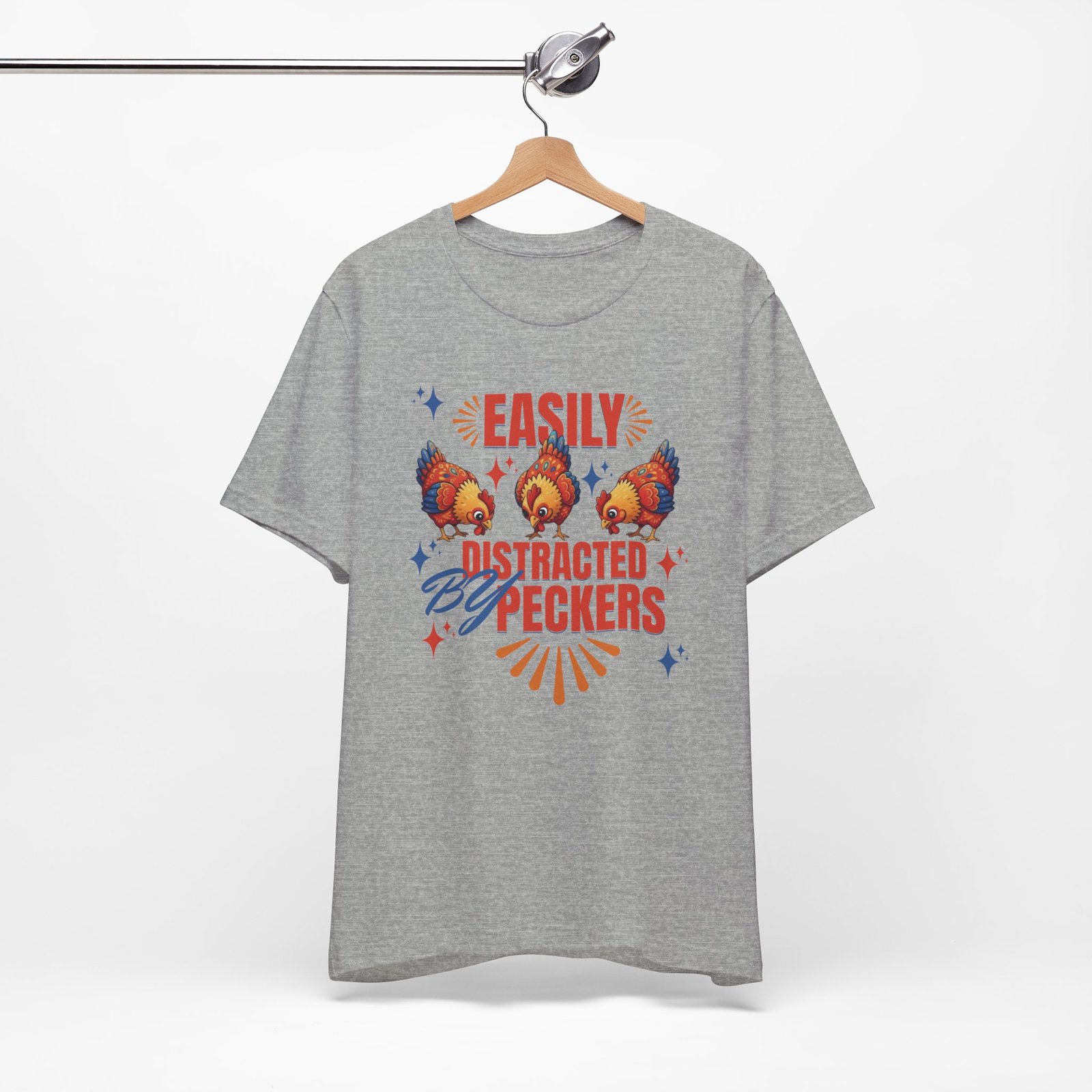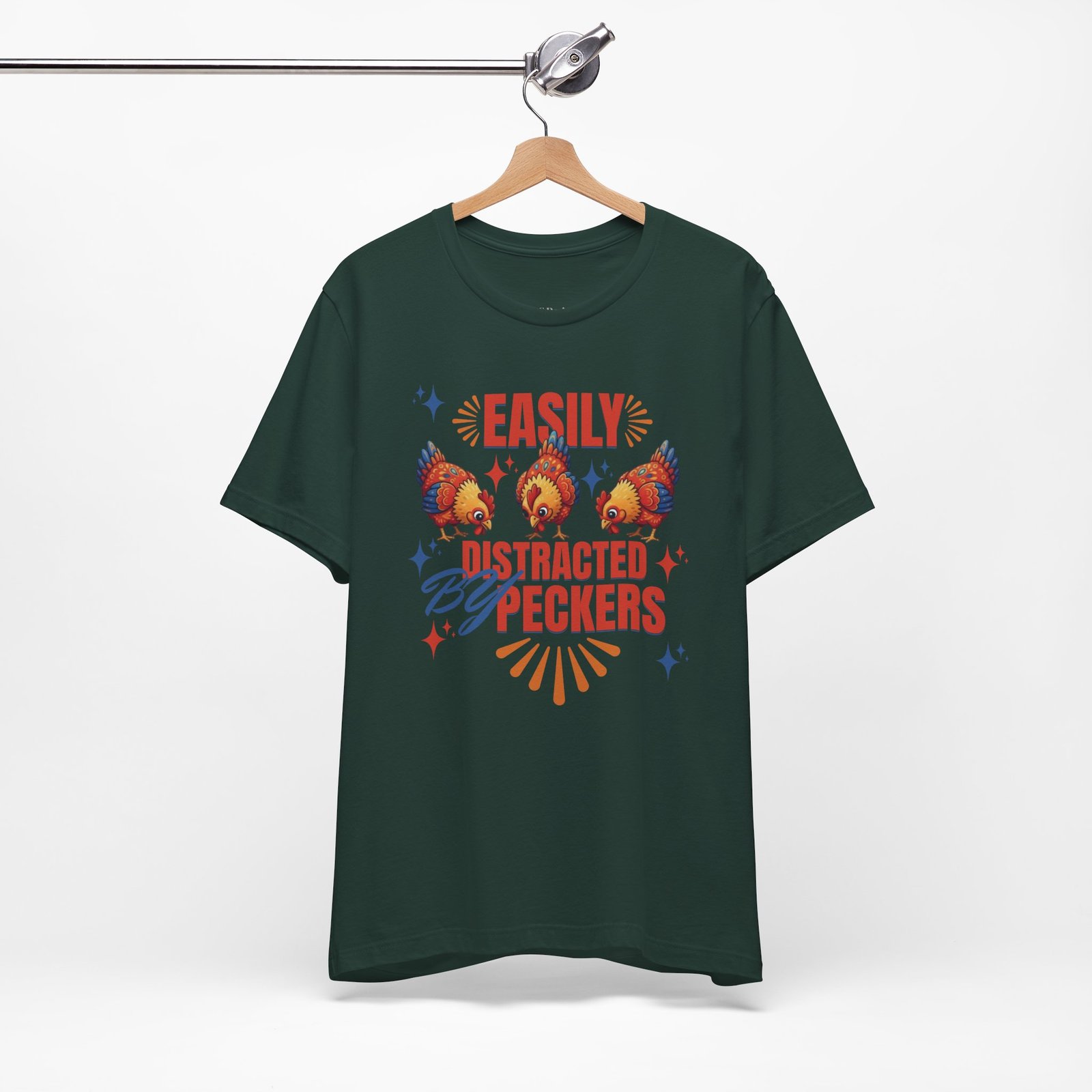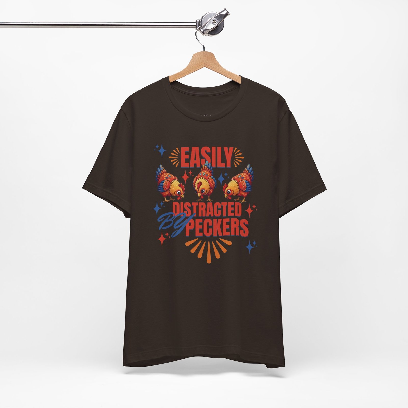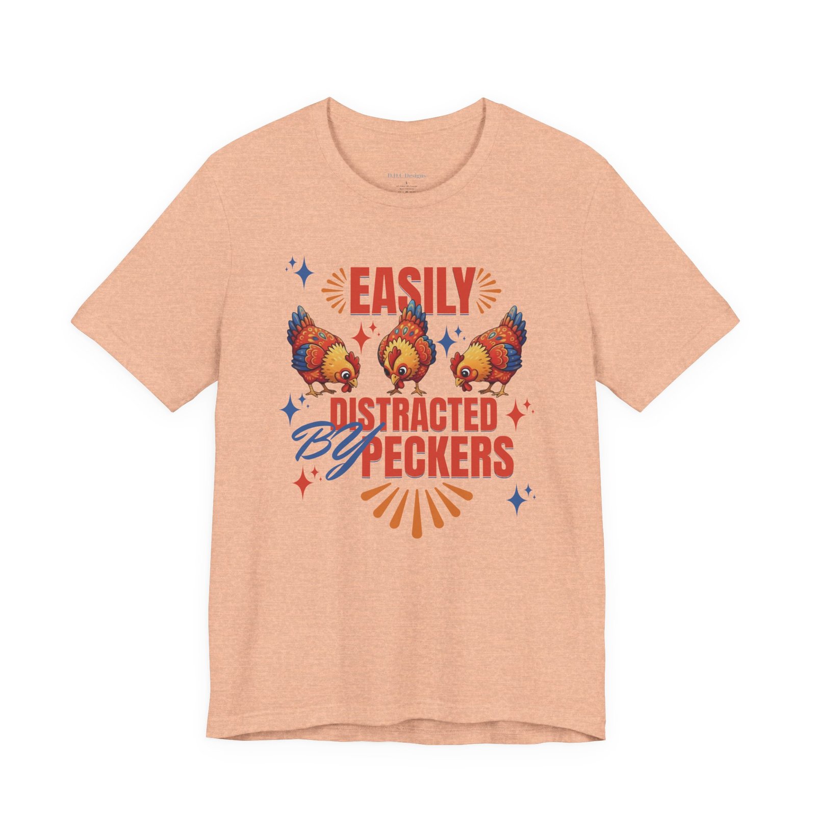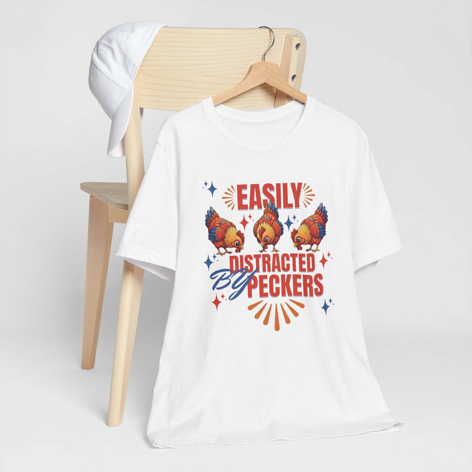 This rustic chicken t-shirt is perfect for any chicken enthusiast, homesteader, or lover of all things charmingly rustic. Featuring an adorable graphic of happy chickens pecking the ground against a warm farm backdrop, with the fun phrase ‘Easily Distracted By Peckers’. It’s a conversation starter for anyone who enjoys watching their flock. Perfect for casual wear, this tee is made from soft, breathable cotton for all-day comfort.