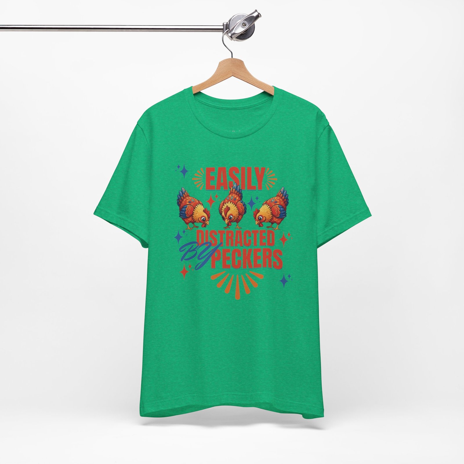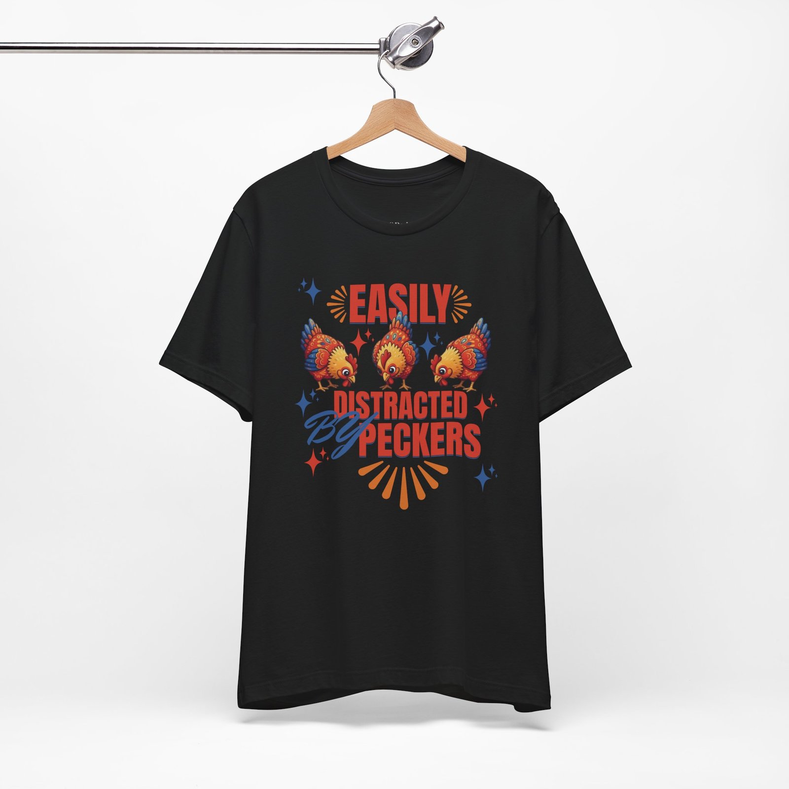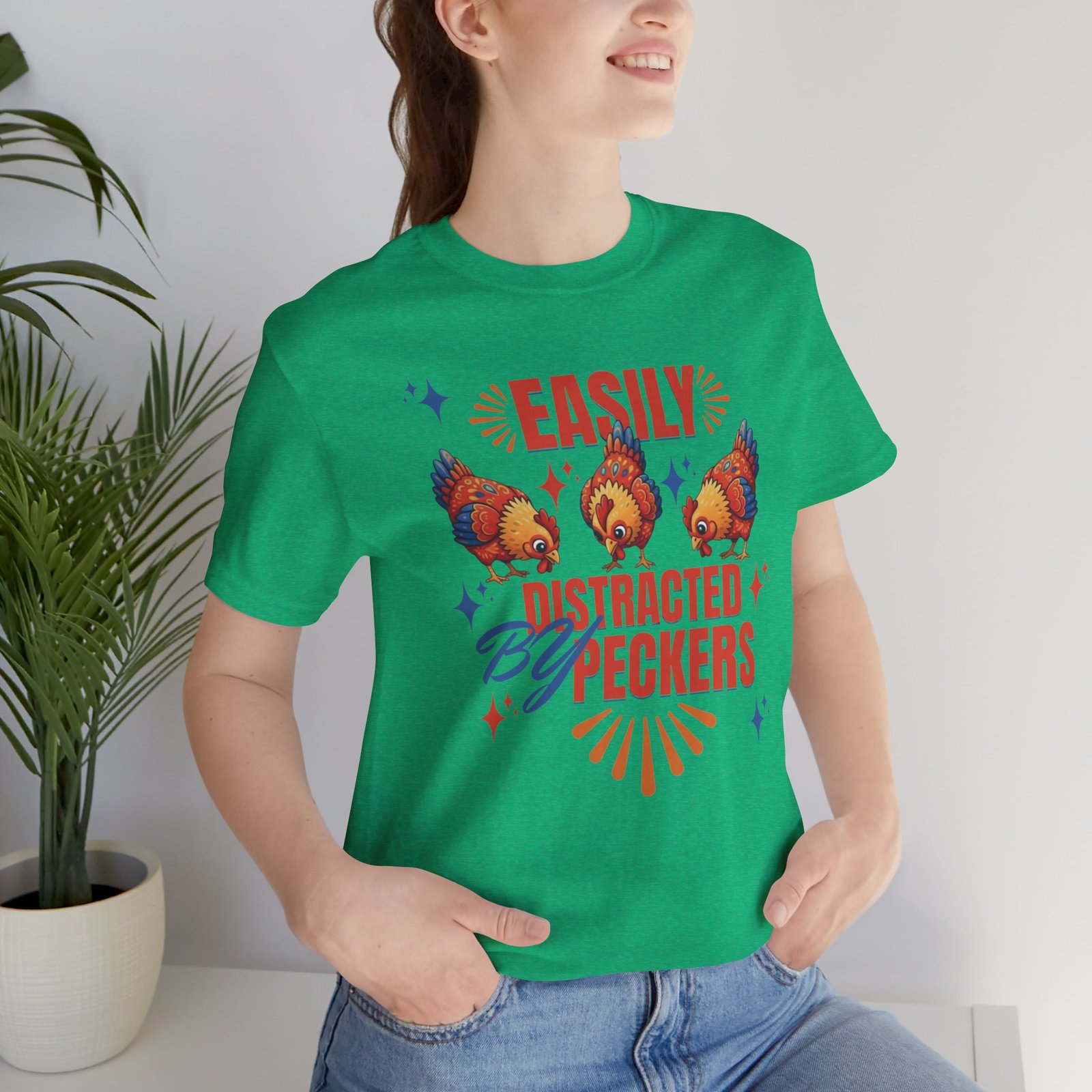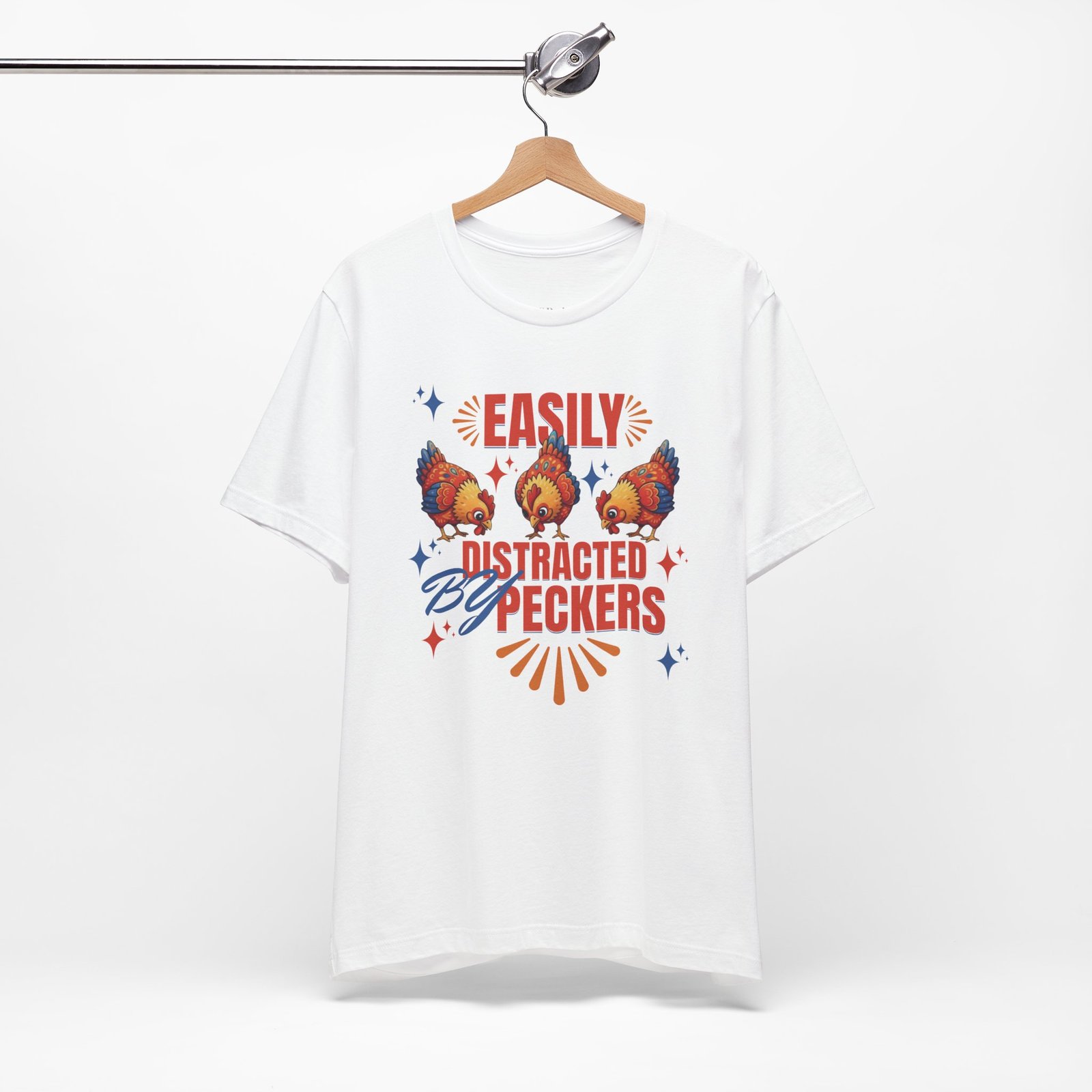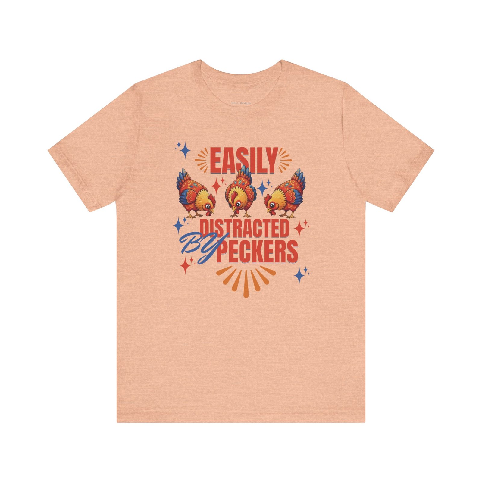This rustic chicken t-shirt is perfect for any chicken enthusiast, homesteader, or lover of all things charmingly rustic. Featuring an adorable graphic of happy chickens pecking the ground against a warm farm backdrop, with the fun phrase ‘Easily Distracted By Peckers’. It’s a conversation starter for anyone who enjoys watching their flock. Perfect for casual wear, this tee is made from soft, breathable cotton for all-day comfort.