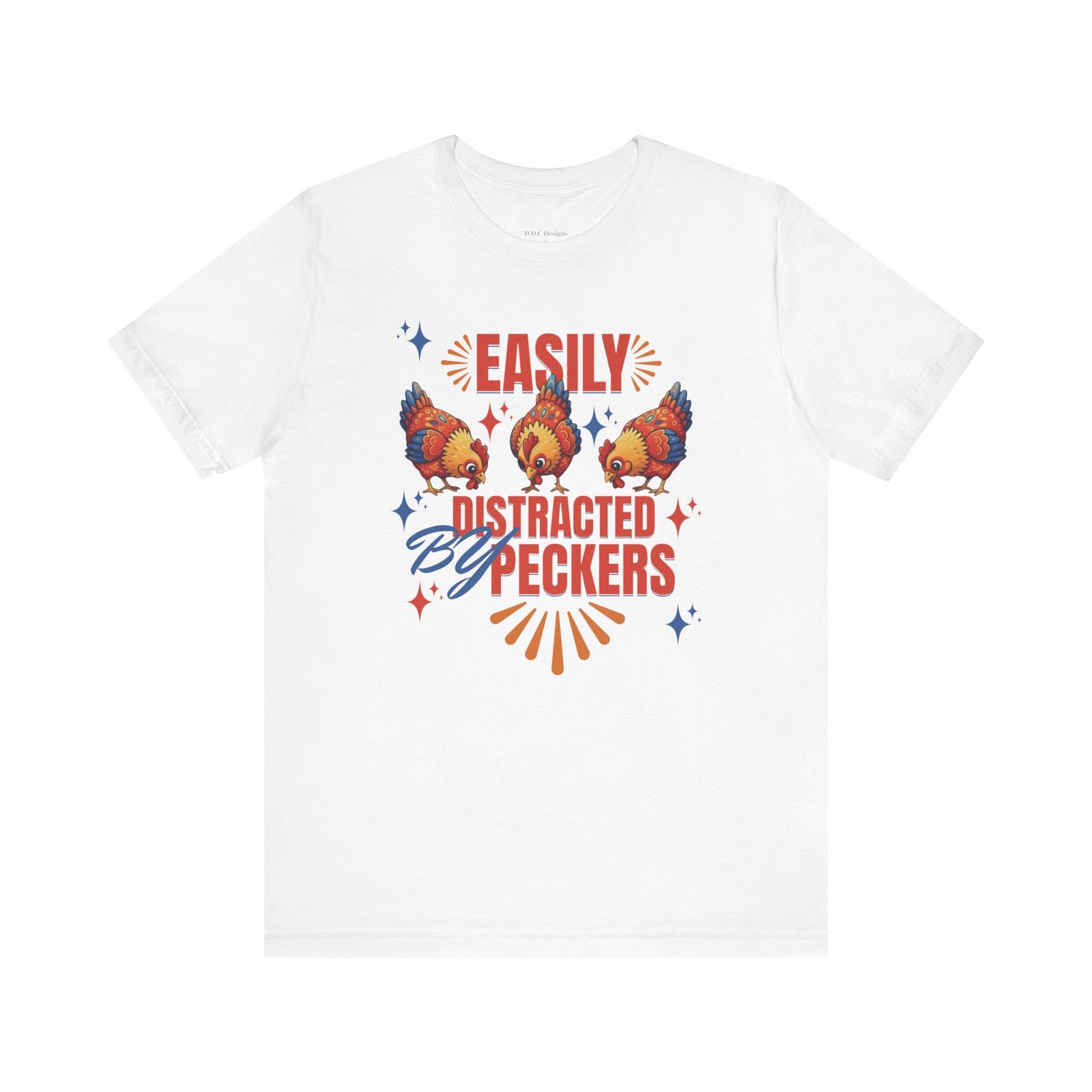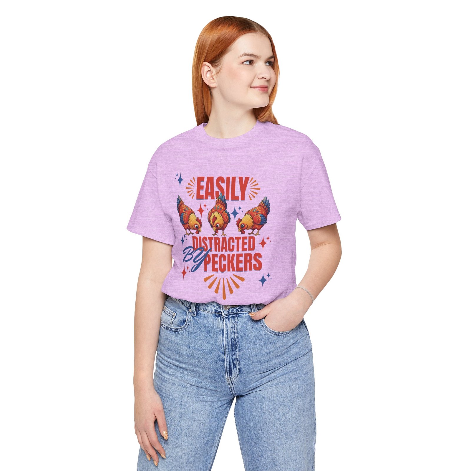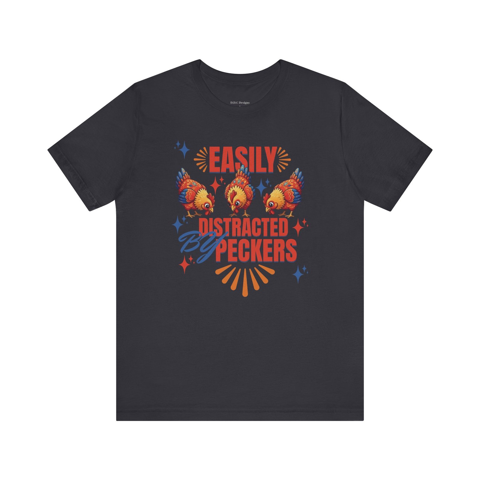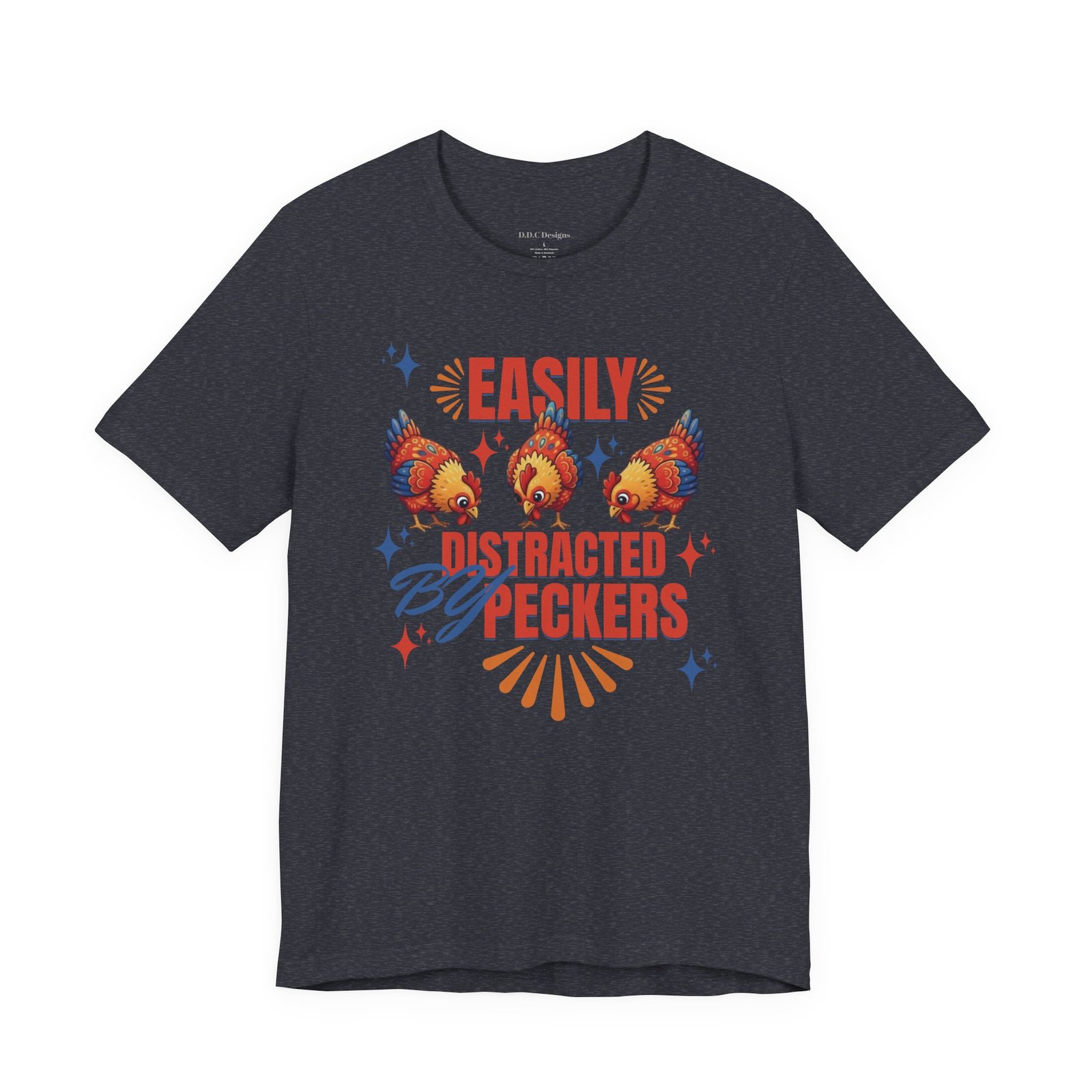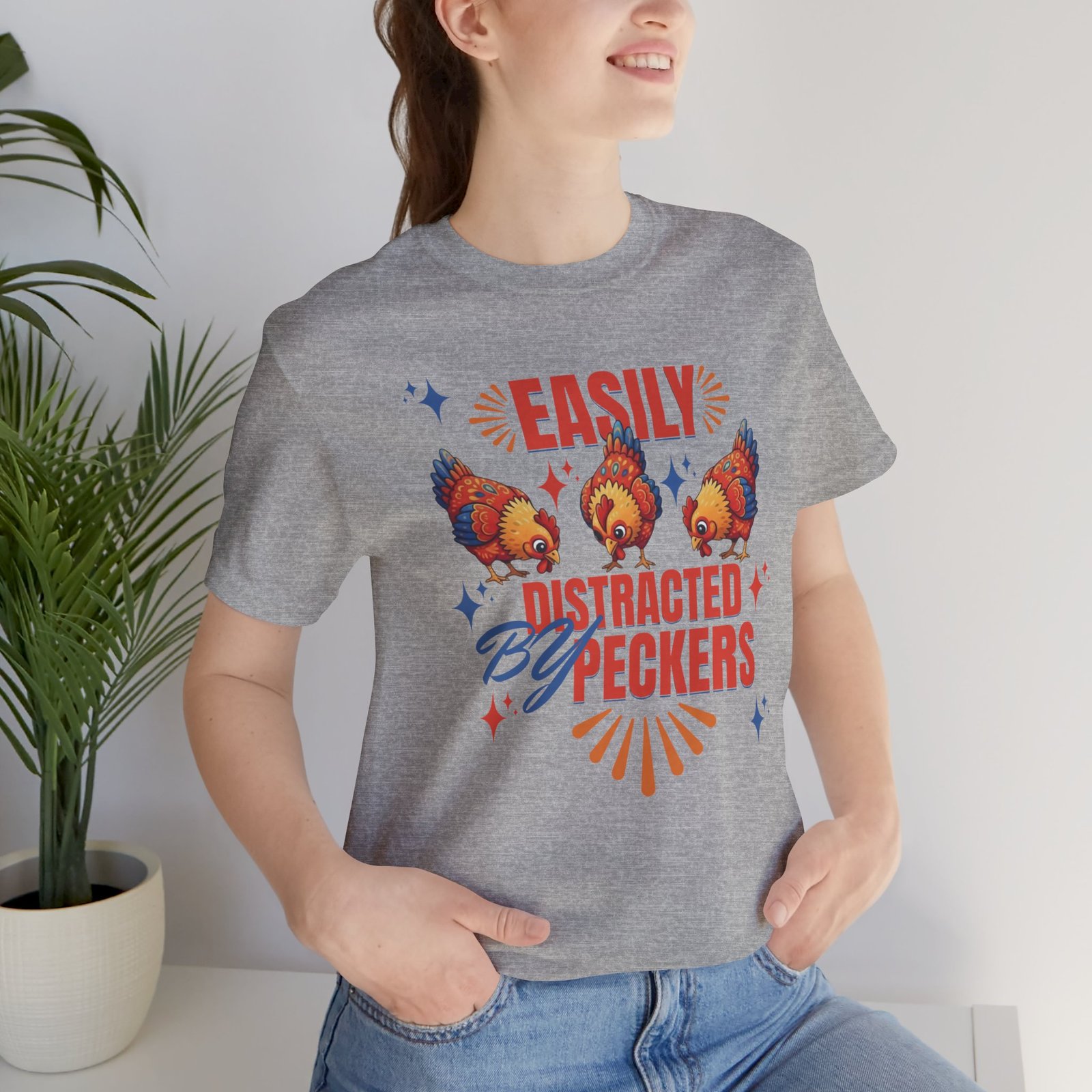 This rustic chicken t-shirt is perfect for any chicken enthusiast, homesteader, or lover of all things charmingly rustic. Featuring an adorable graphic of happy chickens pecking the ground against a warm farm backdrop, with the fun phrase ‘Easily Distracted By Peckers’. It’s a conversation starter for anyone who enjoys watching their flock. Perfect for casual wear, this tee is made from soft, breathable cotton for all-day comfort.