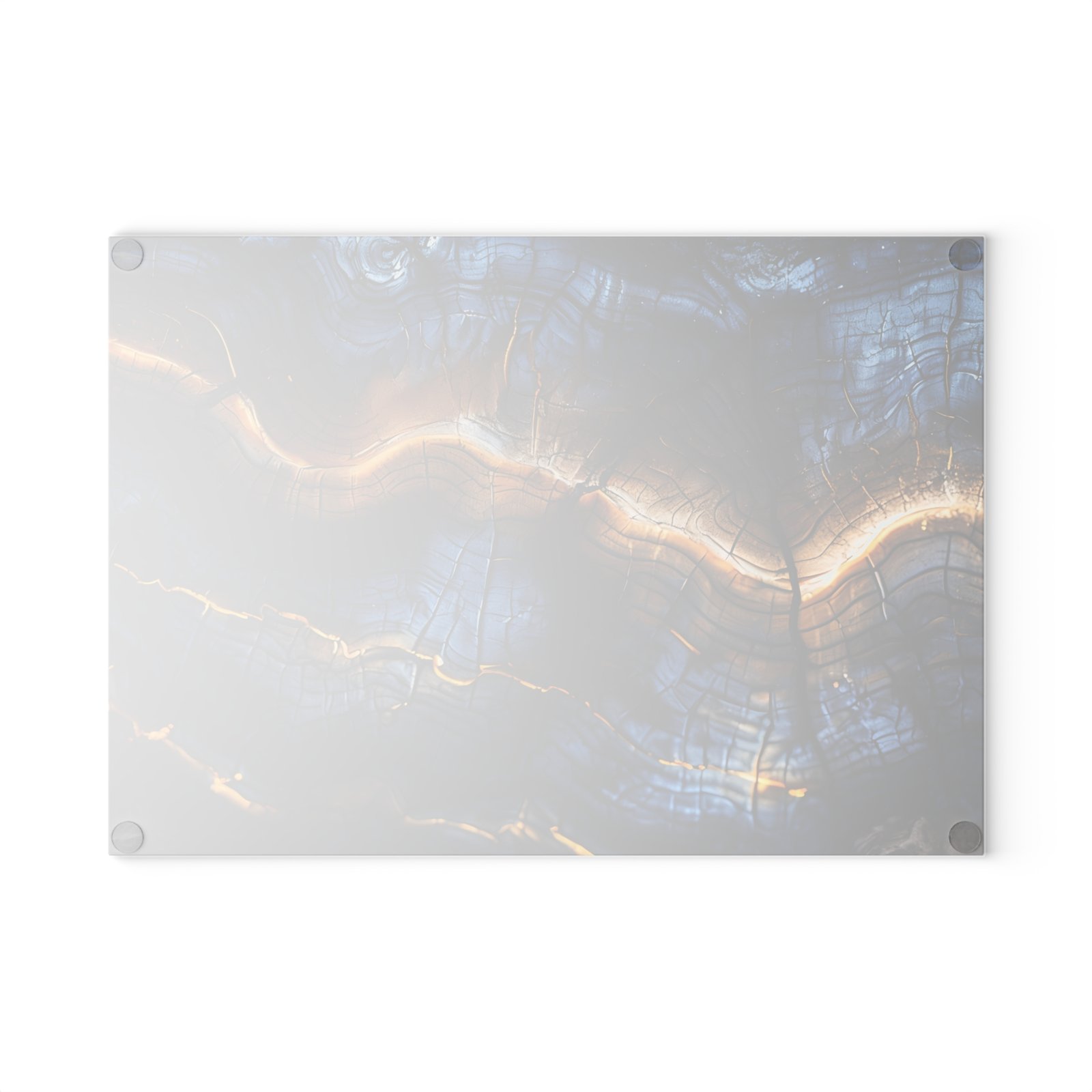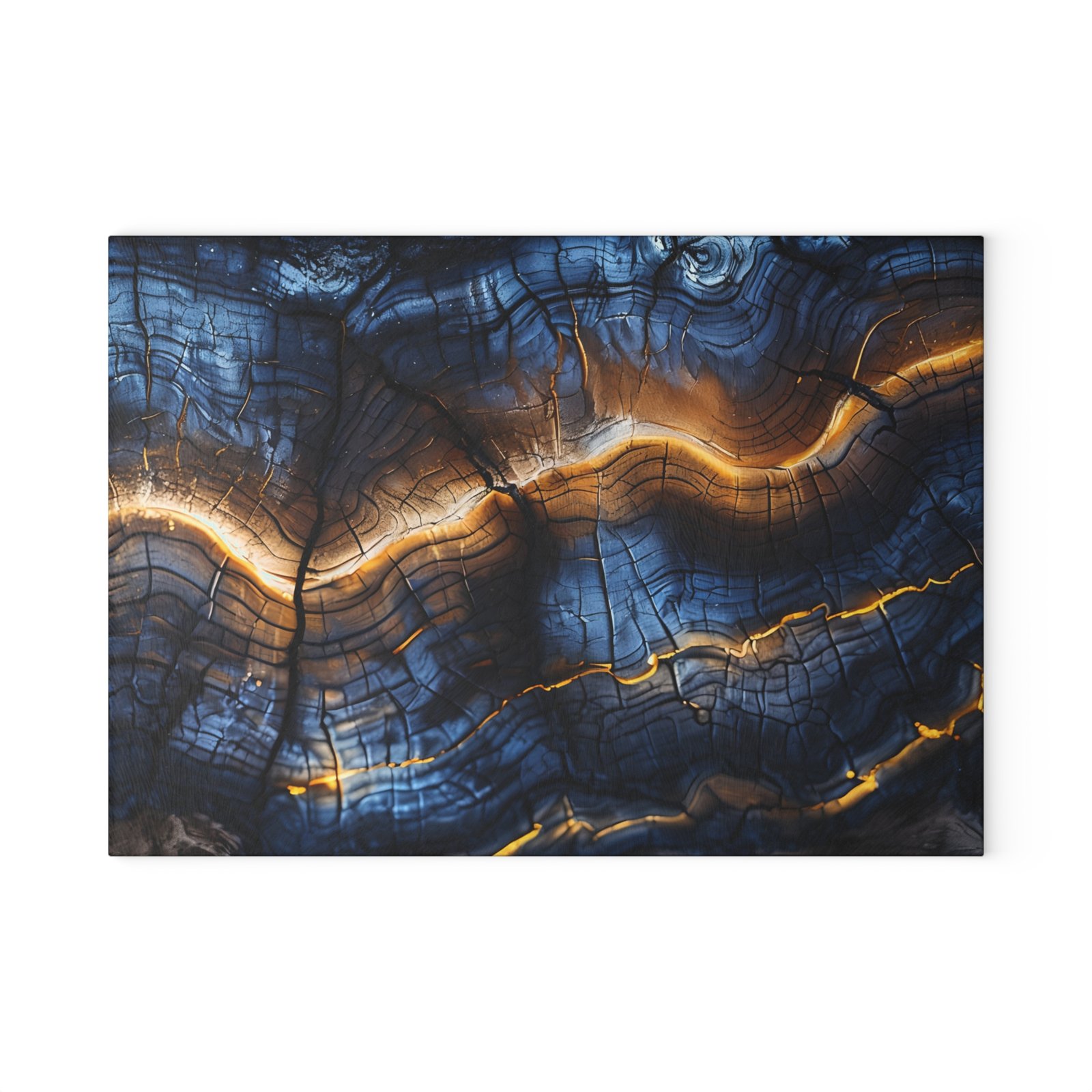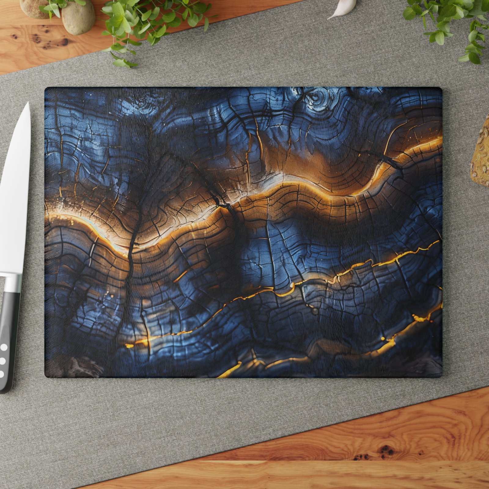 Elevate your kitchen decor with this stunning blue and gold wood design glass cutting board. The tempered glass material makes it a durable and sanitary preparation surface. Perfect for those who love to cook and entertain, this cutting board adds a touch of elegance to any kitchen. Ideal for housewarmings, birthdays, or holiday gifts.