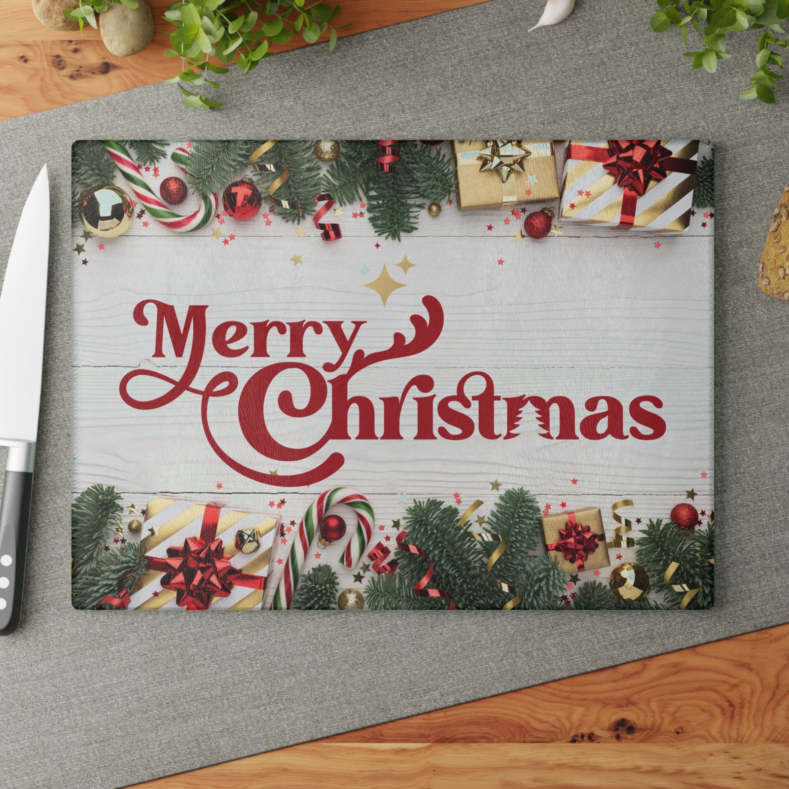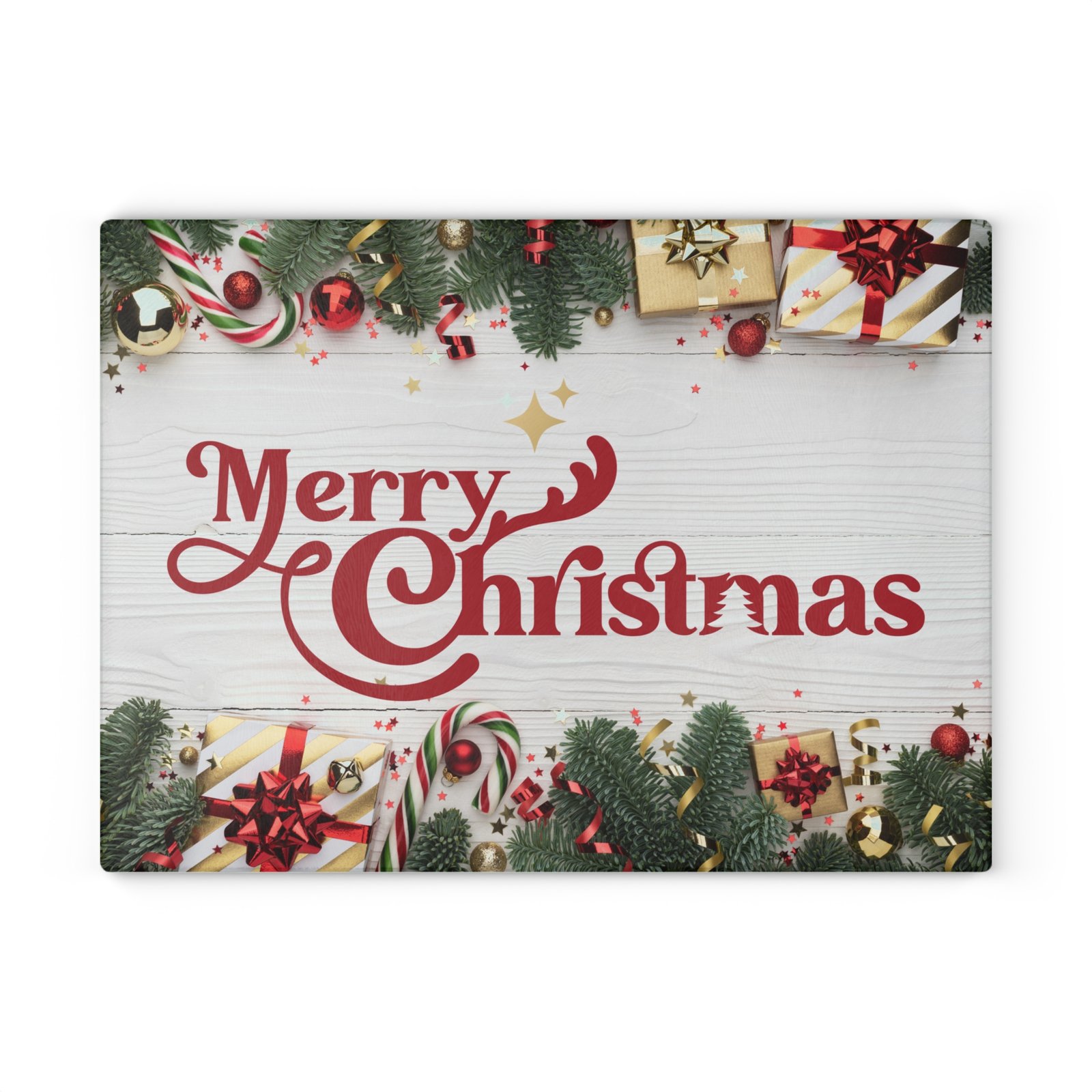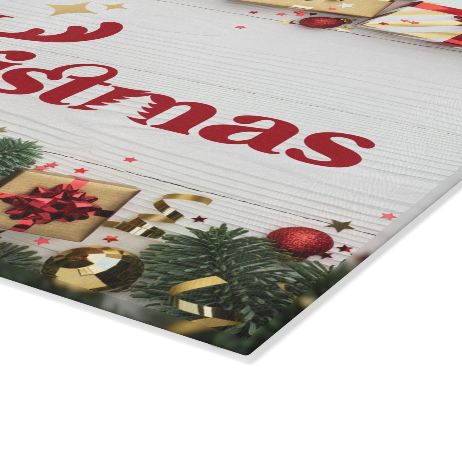 Add classic holiday cheer to your kitchen with this stunning glass cutting board featuring a retro-style “Merry Christmas” script in festive red on a rustic white wood plank background. Perfect for chopping, slicing, and serving appetizers during holiday celebrations. Relevant to those looking to add a festive touch to their kitchen decor during Christmas.