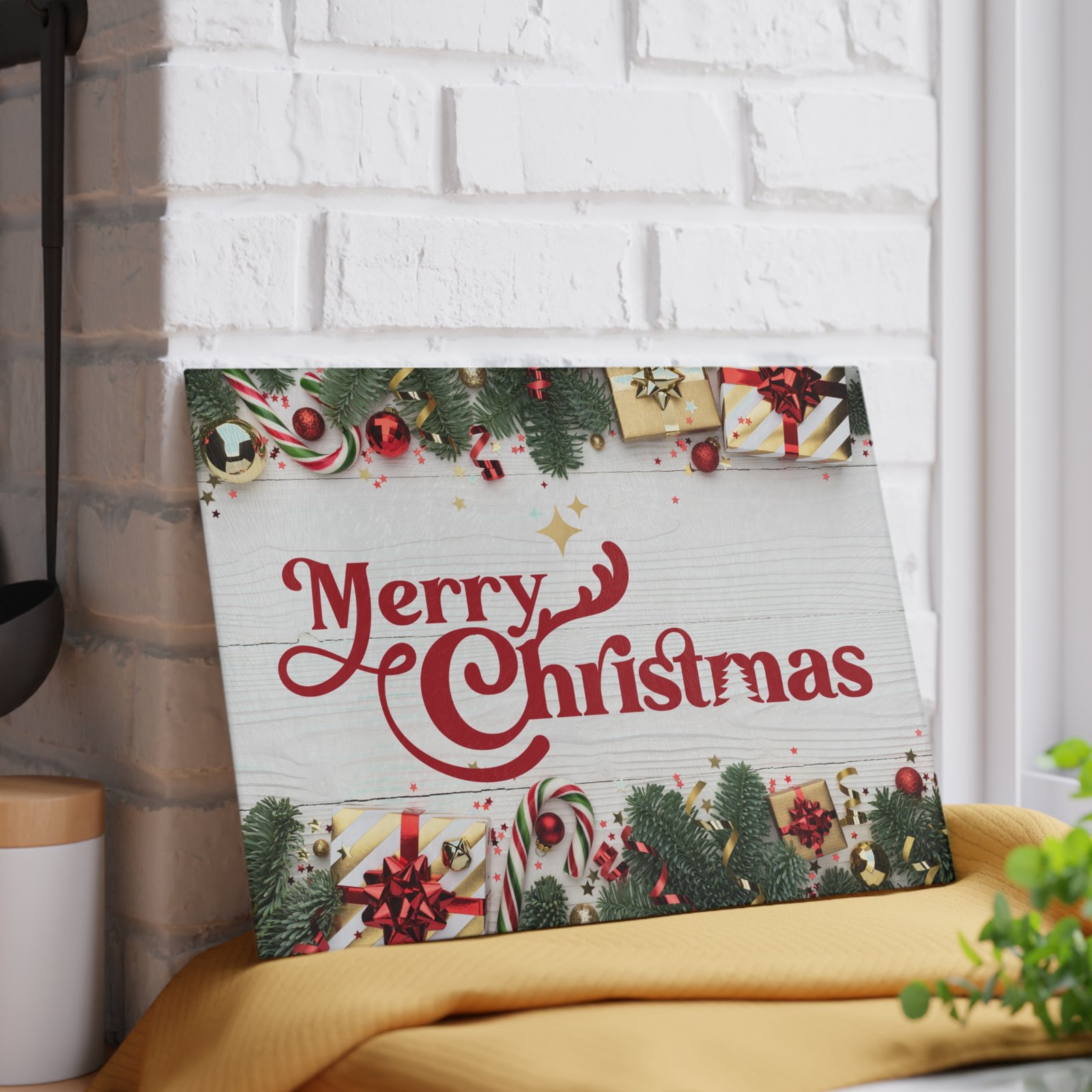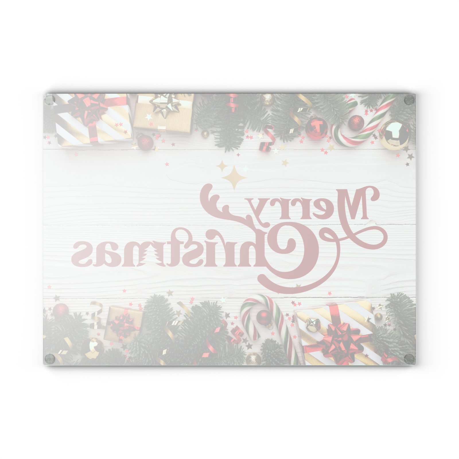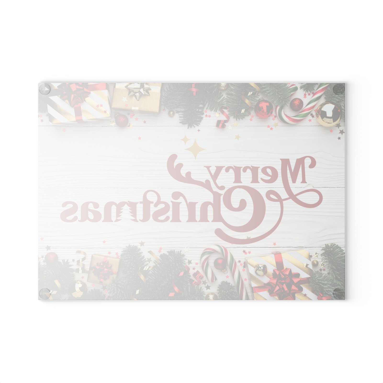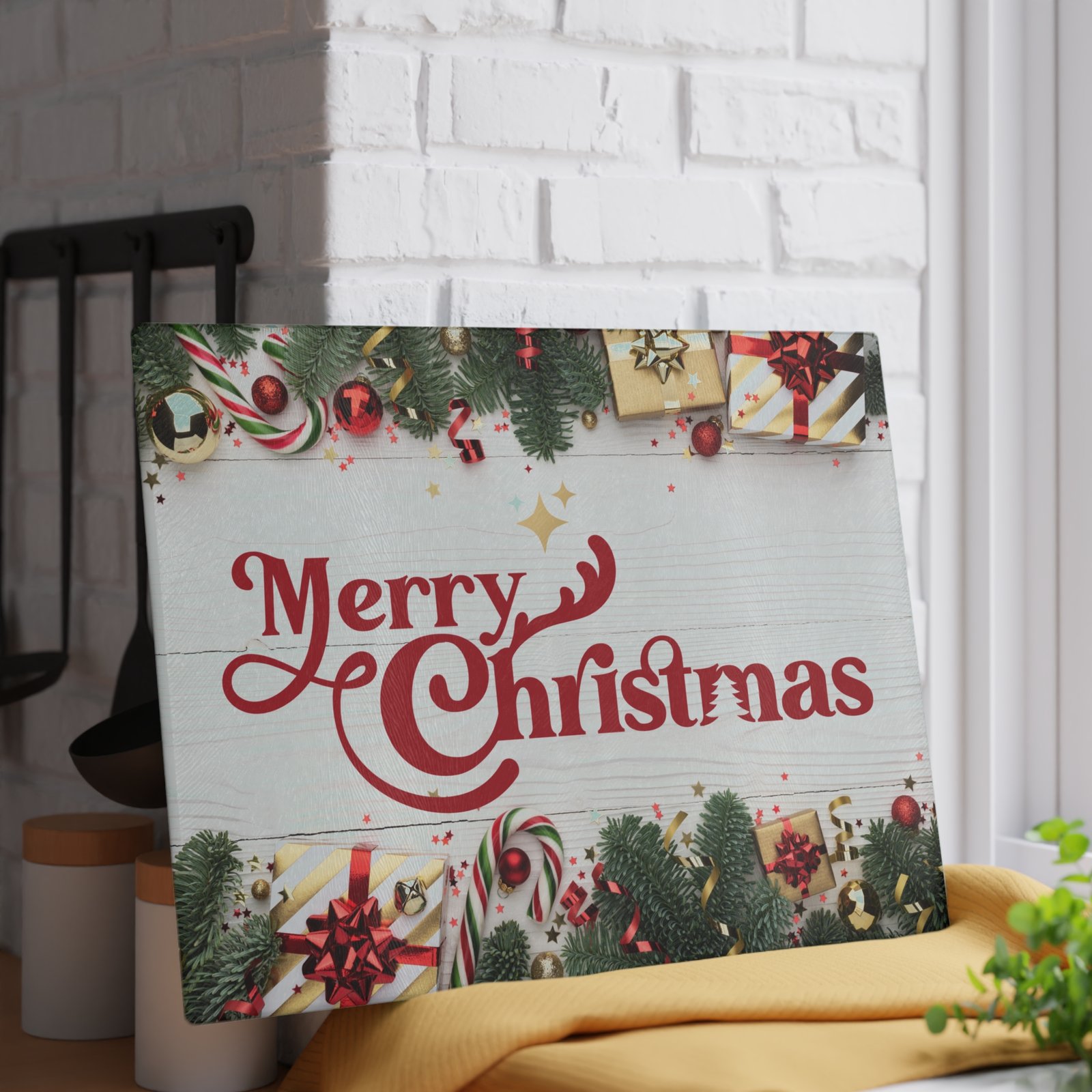 Add classic holiday cheer to your kitchen with this stunning glass cutting board featuring a retro-style “Merry Christmas” script in festive red on a rustic white wood plank background. Perfect for chopping, slicing, and serving appetizers during holiday celebrations. Relevant to those looking to add a festive touch to their kitchen decor during Christmas.