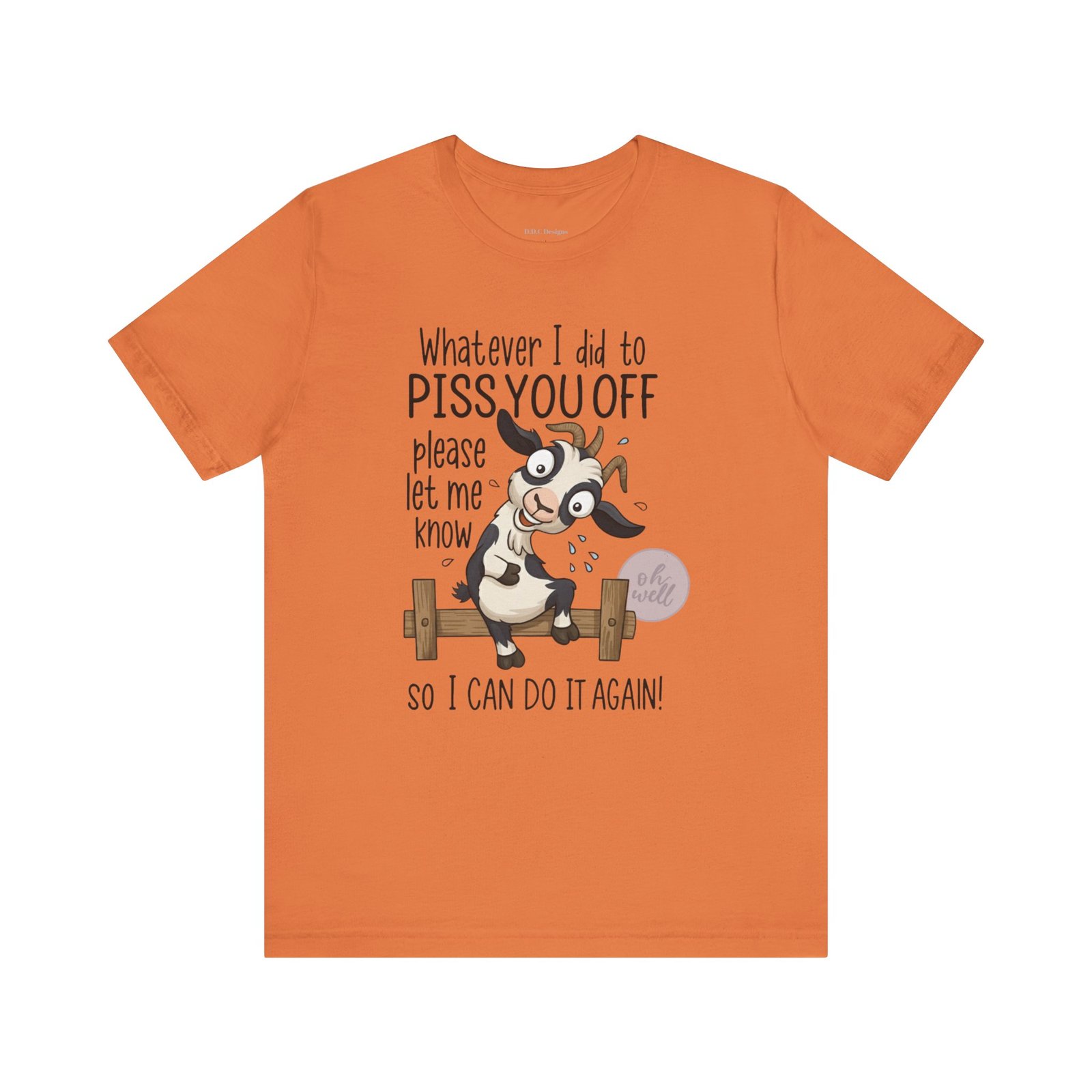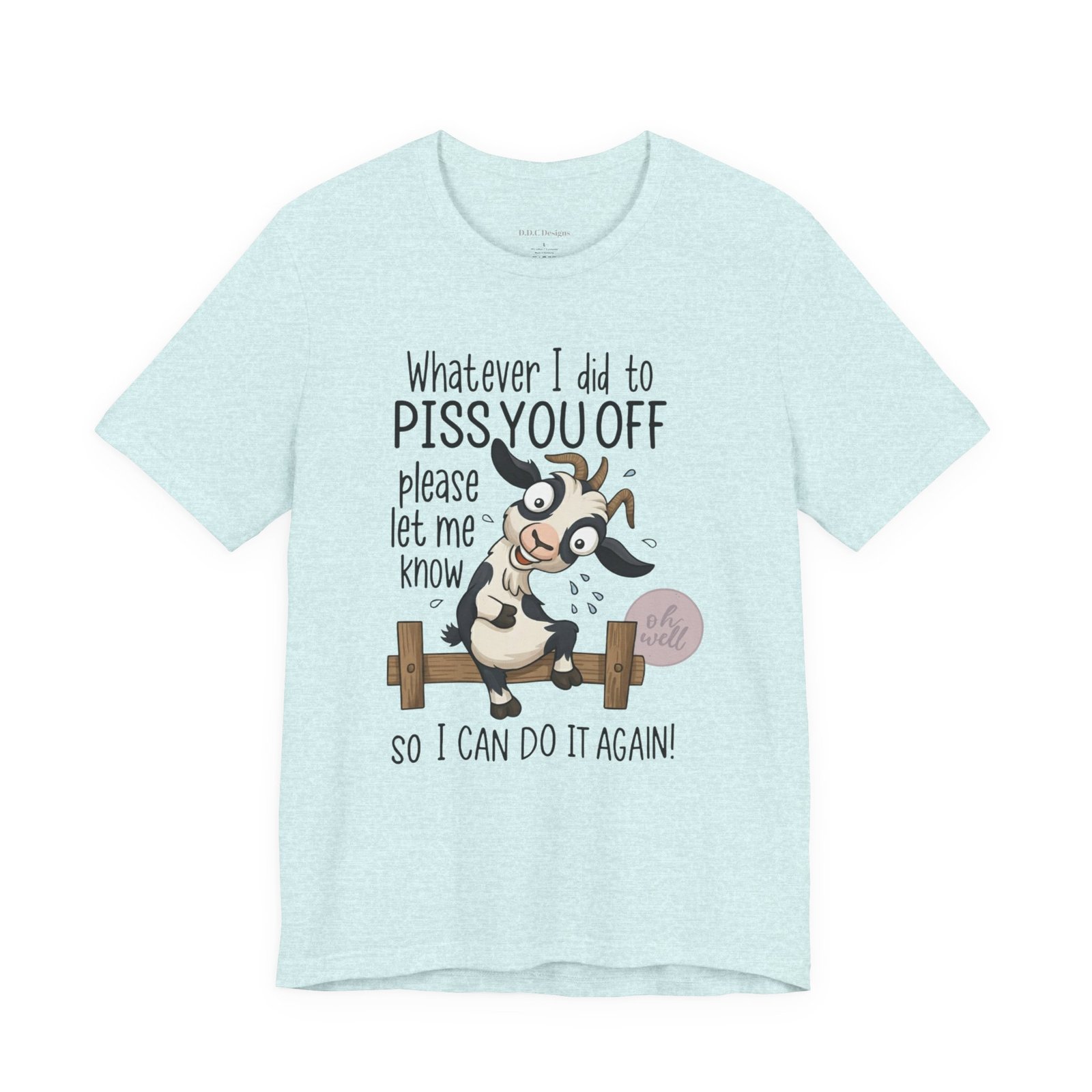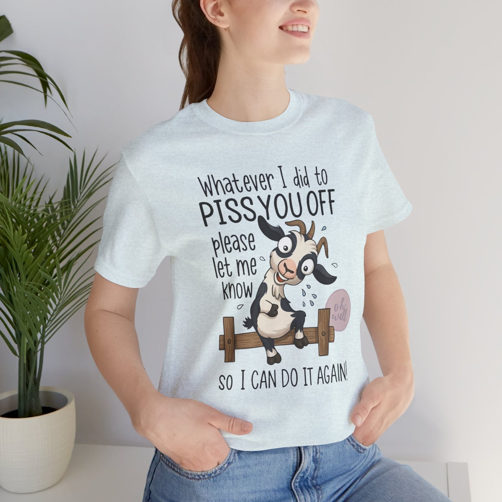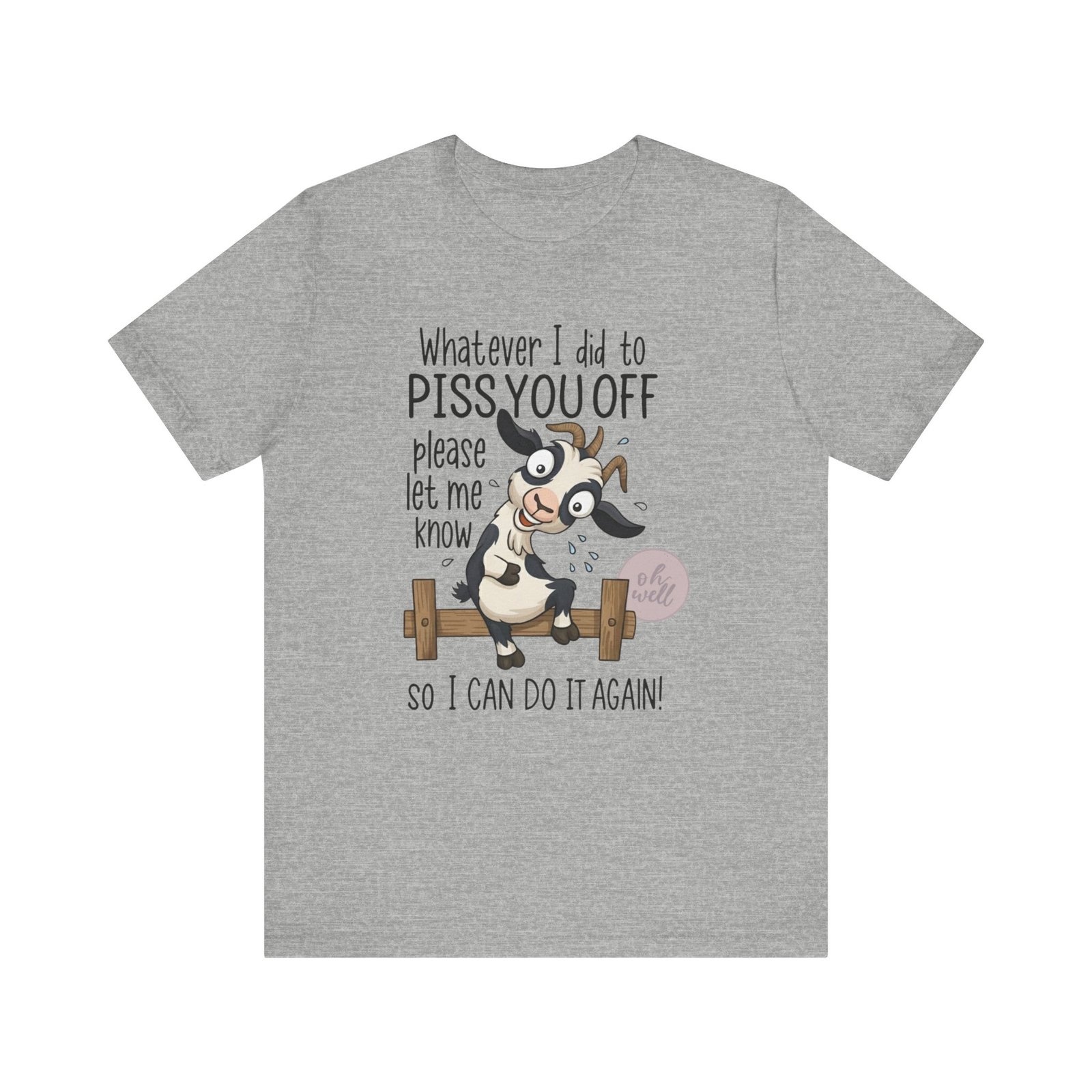 This hilarious t-shirt features an adorable, wide-eyed goat giving a cheeky grin while sitting on a fence, paired with the legendary phrase: ‘Whatever I did to PISS YOU OFF please let me know so I can do it again.’ It’s the ultimate statement piece for anyone who loves a good laugh and doesn’t take life too seriously. Perfect for those with a playful and mischievous side, it is sure to grab attention and spark conversations. Ideal for casual and leisure wear, this t-shirt is made with 100% Airlume combed and ring-spun cotton, ensuring a lightweight and breathable fabric.