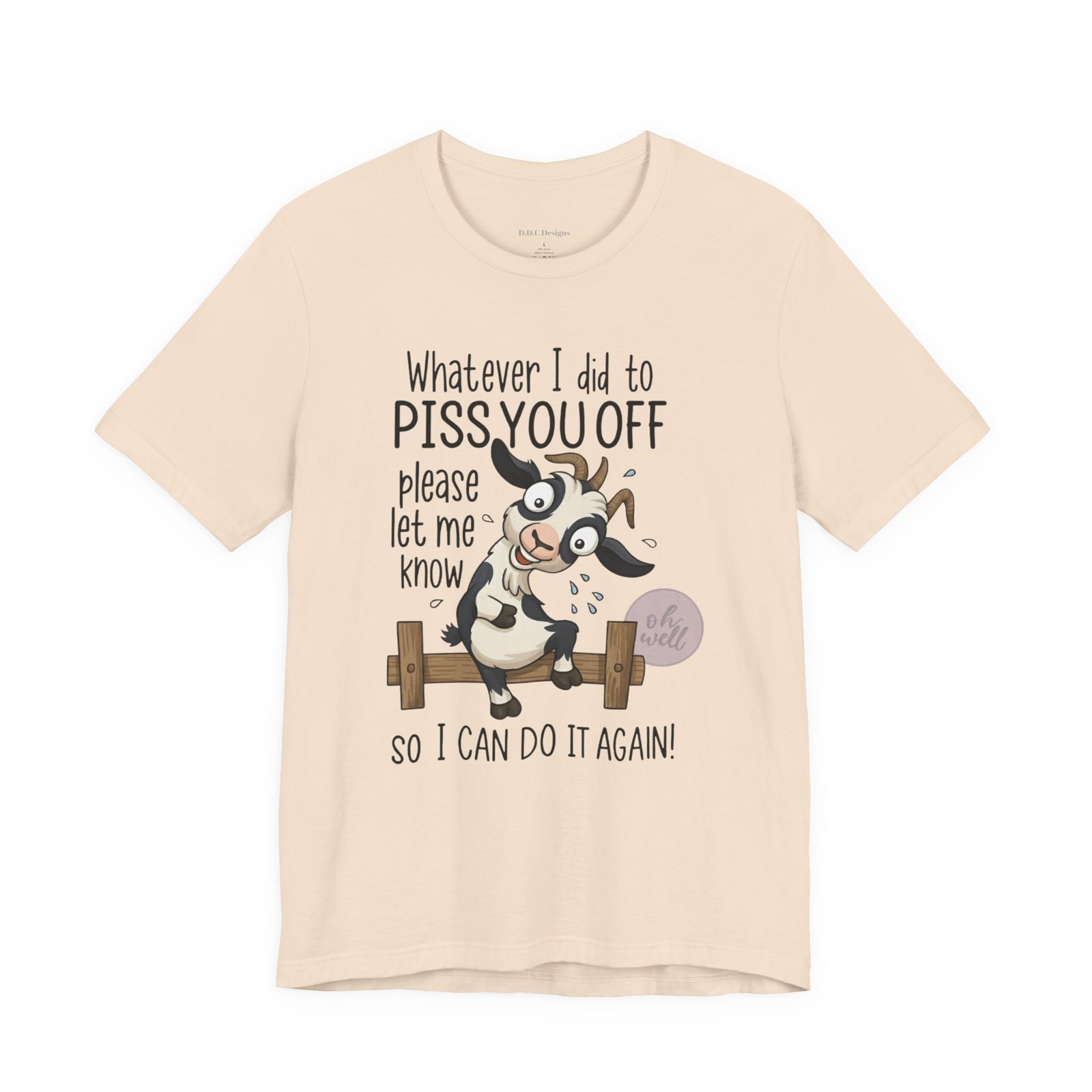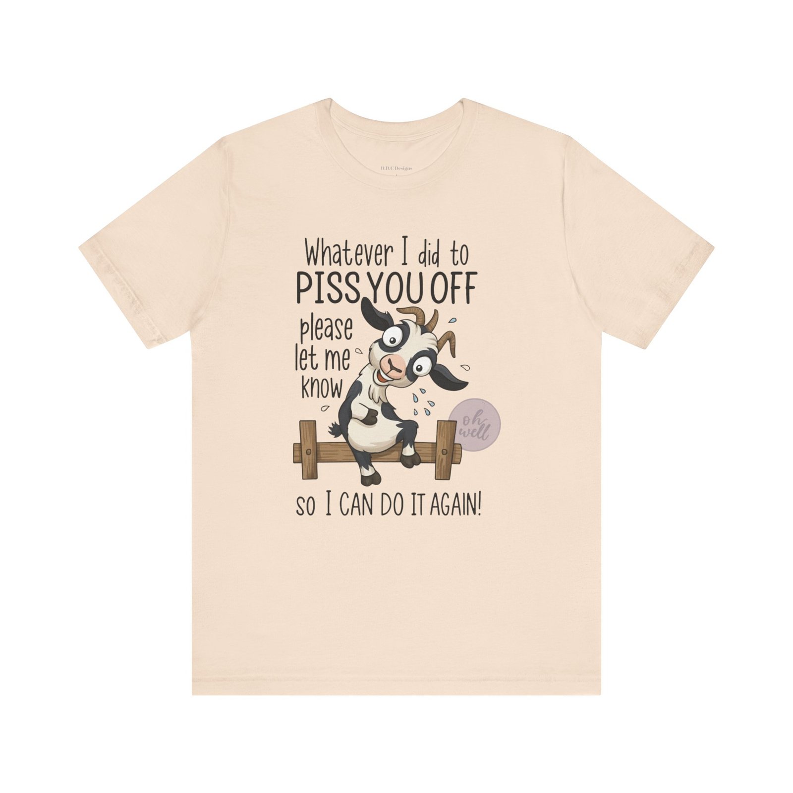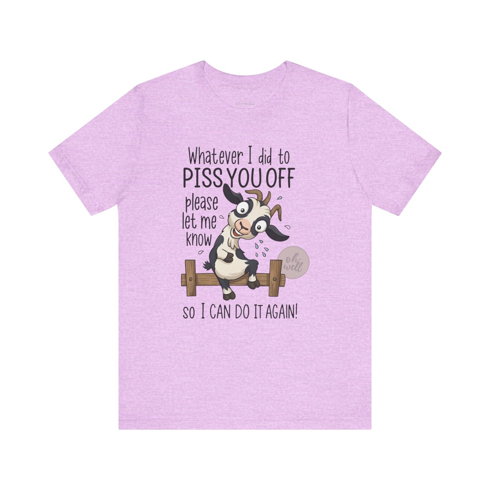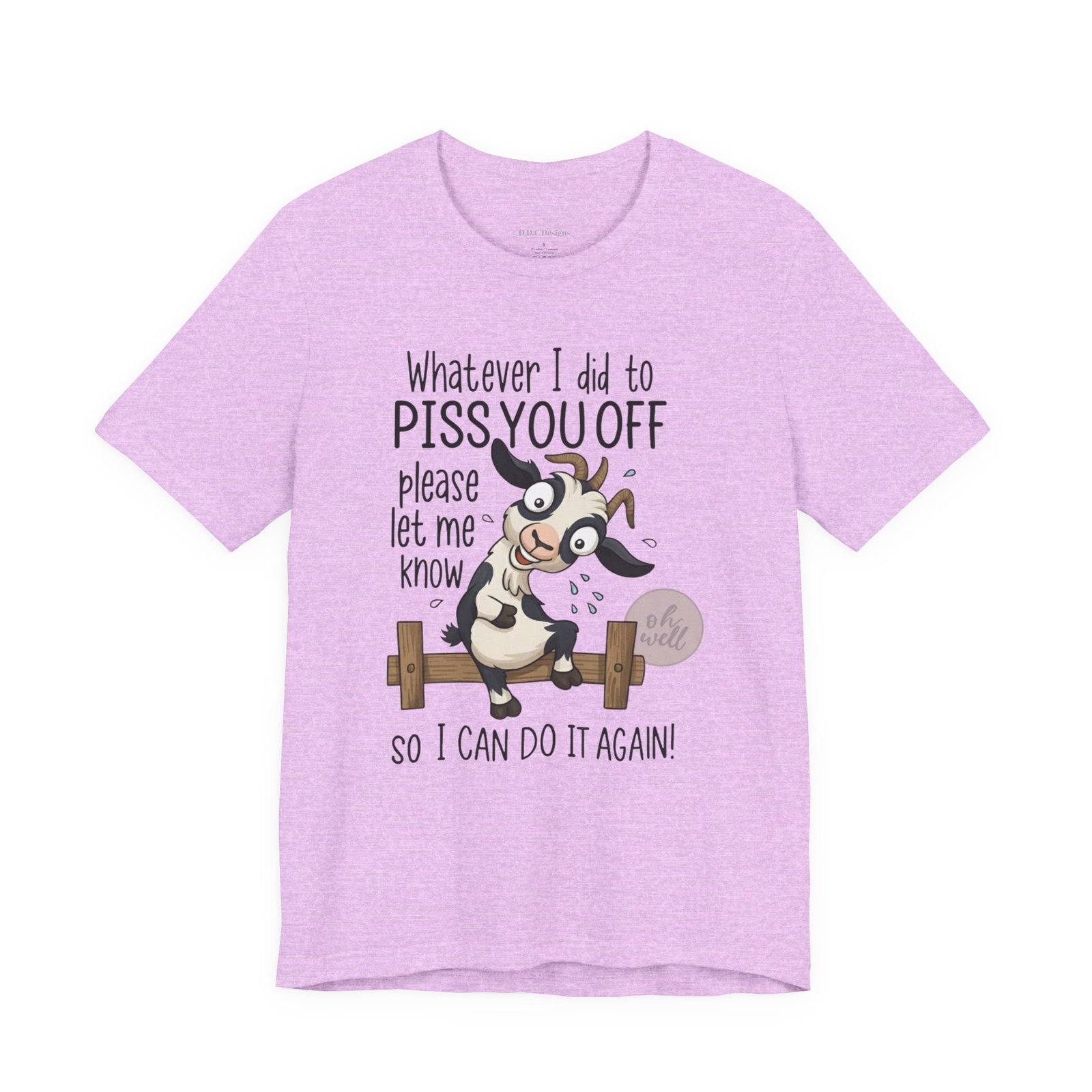 This hilarious t-shirt features an adorable, wide-eyed goat giving a cheeky grin while sitting on a fence, paired with the legendary phrase: ‘Whatever I did to PISS YOU OFF please let me know so I can do it again.’ It’s the ultimate statement piece for anyone who loves a good laugh and doesn’t take life too seriously. Perfect for those with a playful and mischievous side, it is sure to grab attention and spark conversations. Ideal for casual and leisure wear, this t-shirt is made with 100% Airlume combed and ring-spun cotton, ensuring a lightweight and breathable fabric.