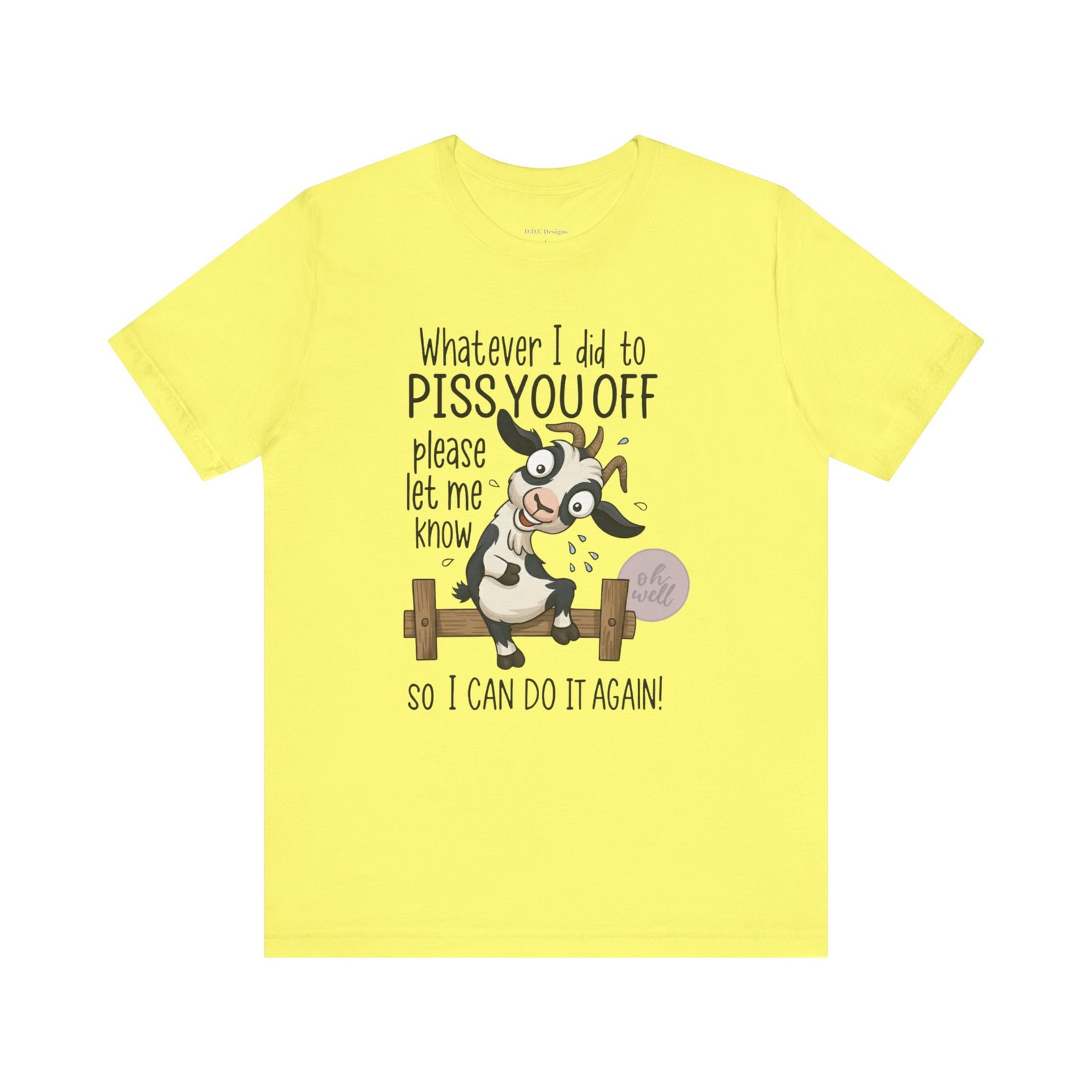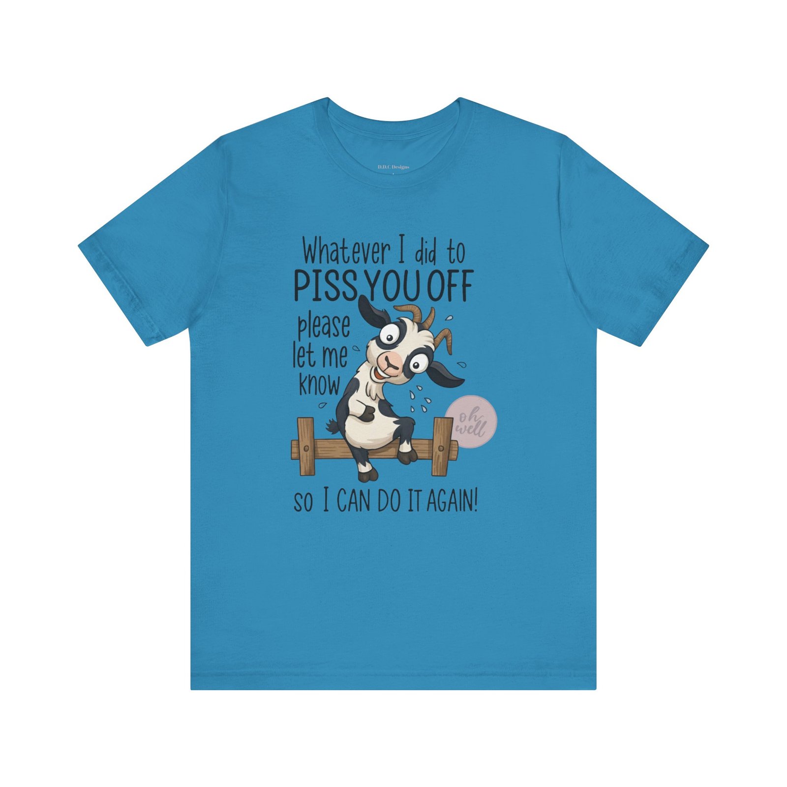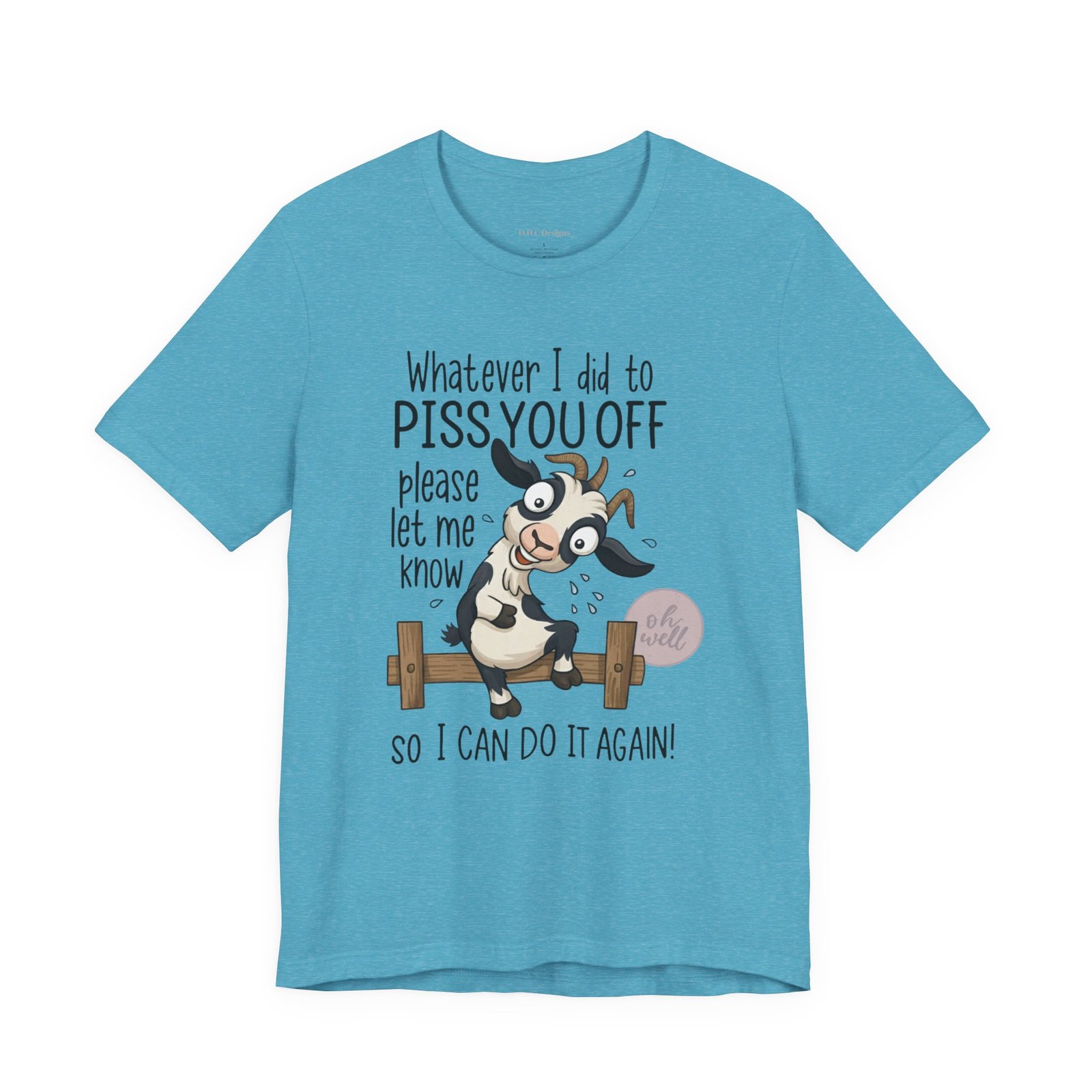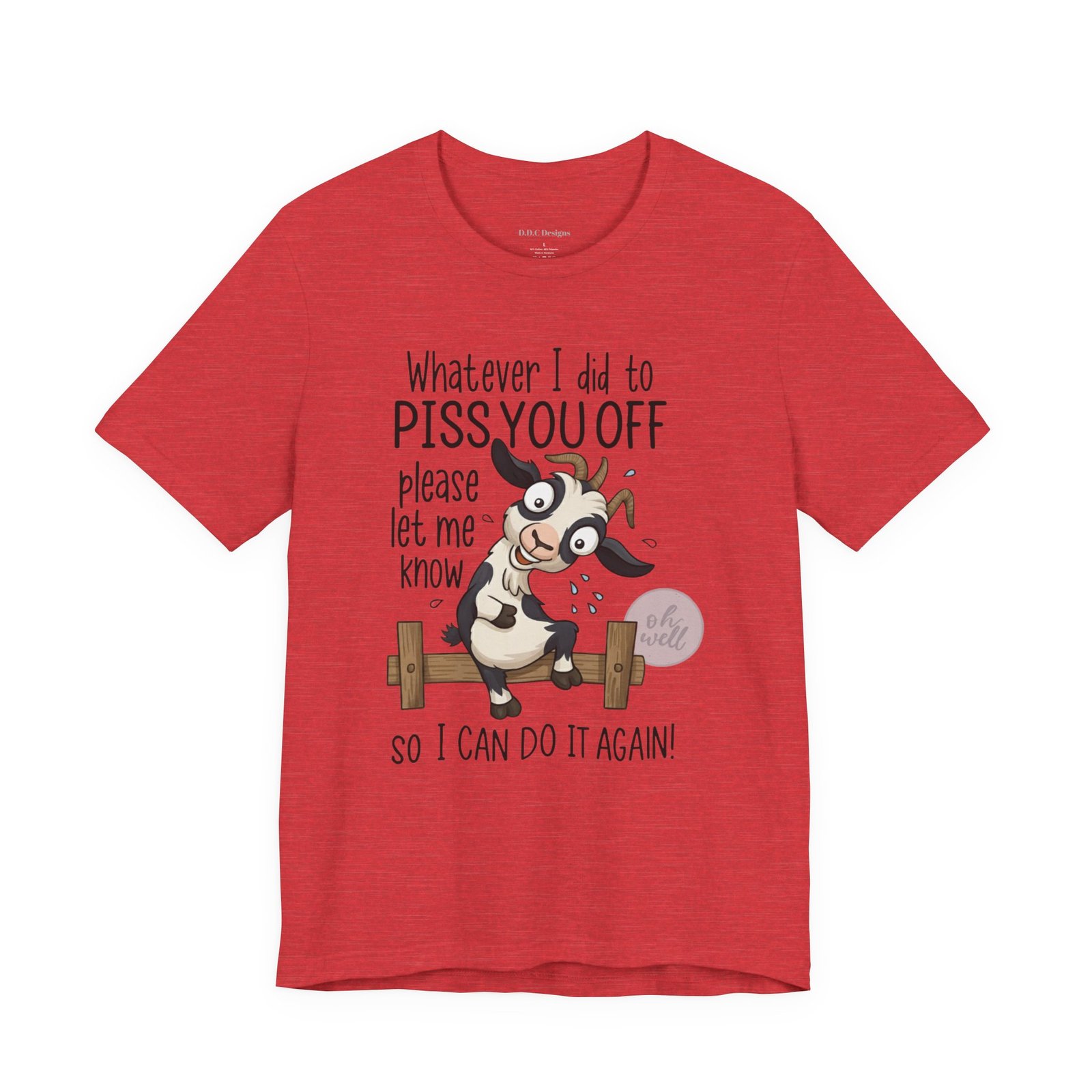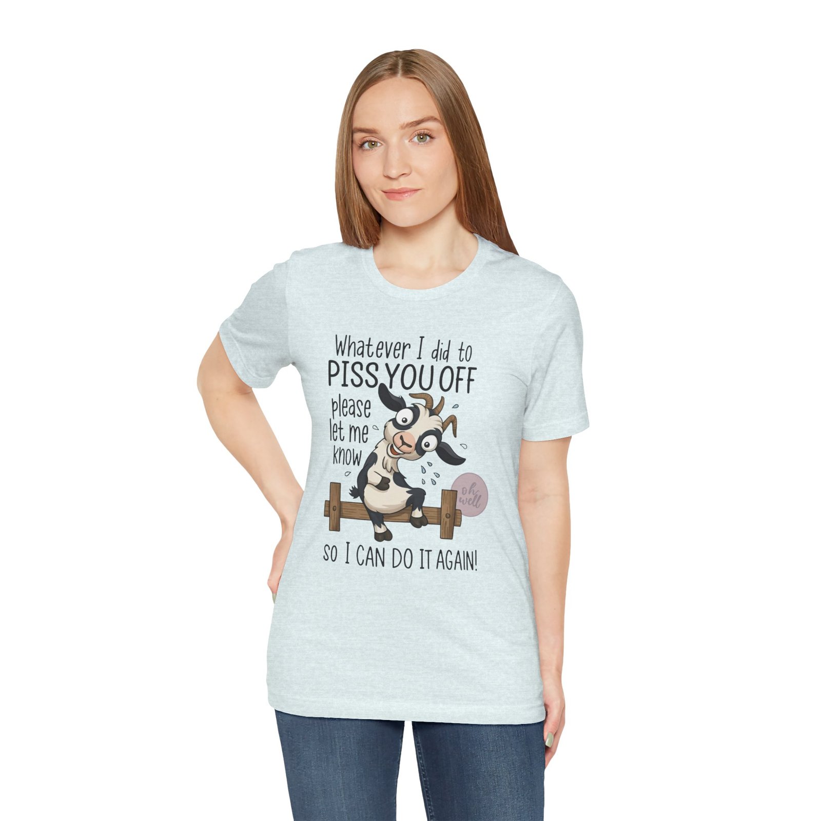 This hilarious t-shirt features an adorable, wide-eyed goat giving a cheeky grin while sitting on a fence, paired with the legendary phrase: ‘Whatever I did to PISS YOU OFF please let me know so I can do it again.’ It’s the ultimate statement piece for anyone who loves a good laugh and doesn’t take life too seriously. Perfect for those with a playful and mischievous side, it is sure to grab attention and spark conversations. Ideal for casual and leisure wear, this t-shirt is made with 100% Airlume combed and ring-spun cotton, ensuring a lightweight and breathable fabric.