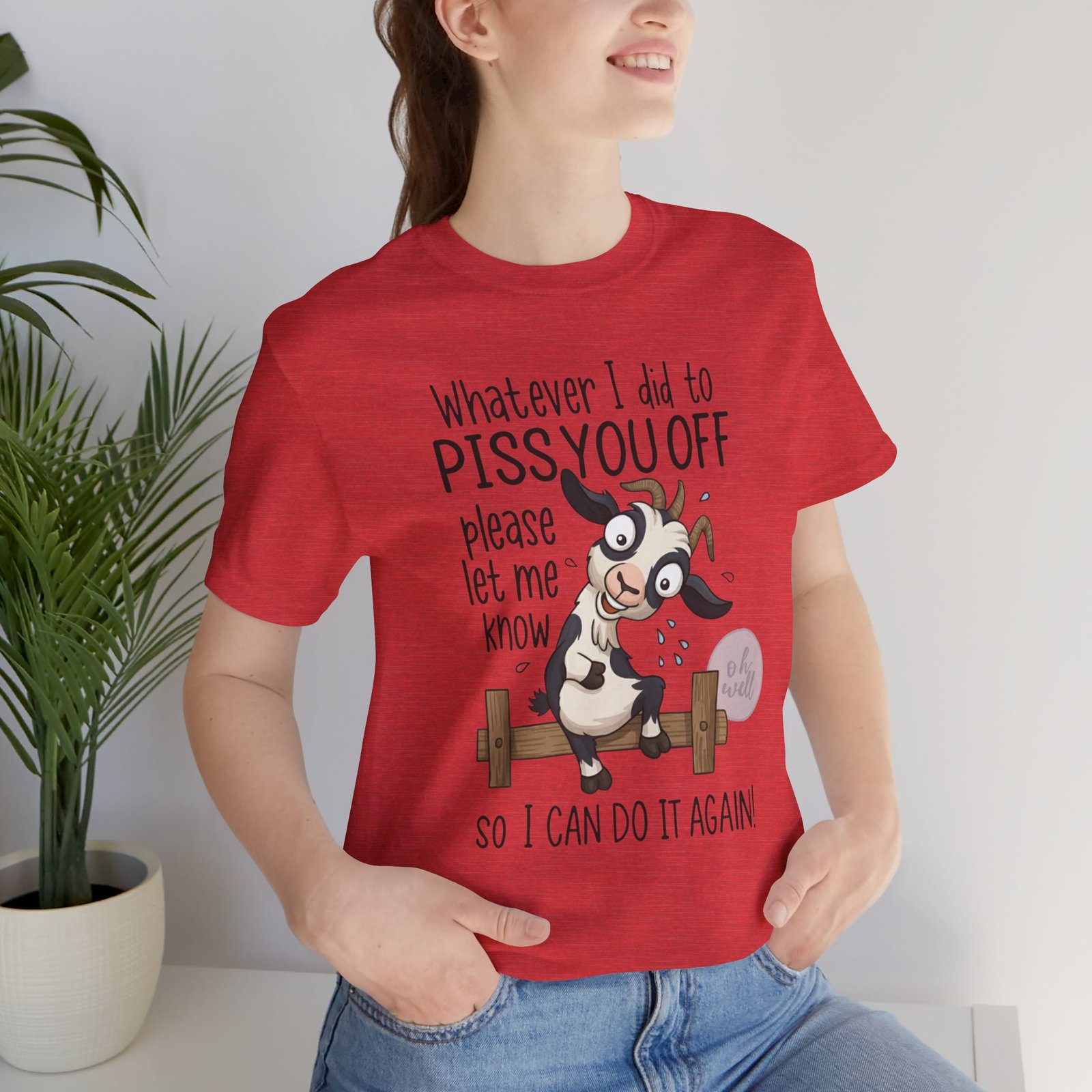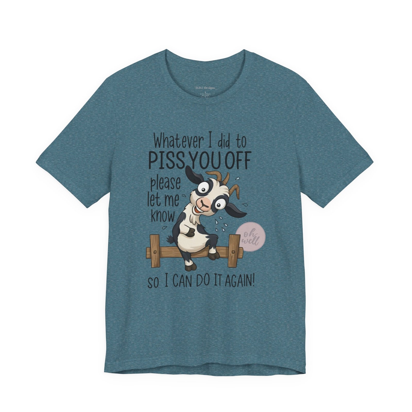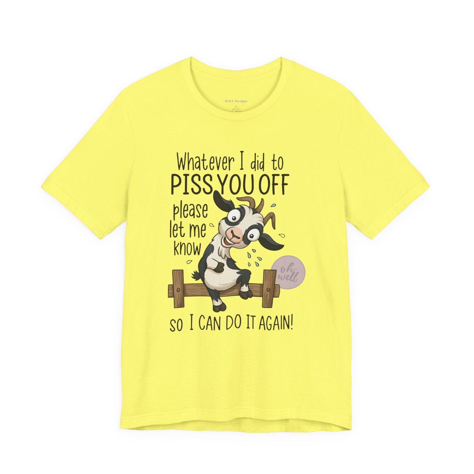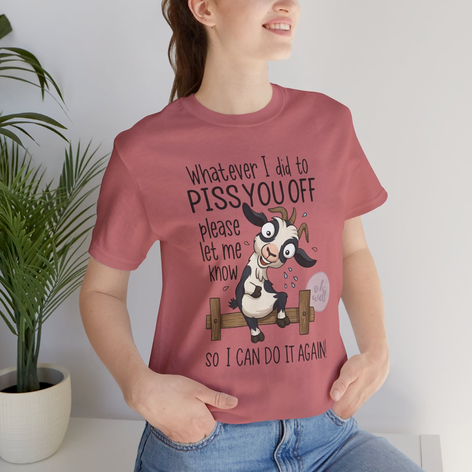 This hilarious t-shirt features an adorable, wide-eyed goat giving a cheeky grin while sitting on a fence, paired with the legendary phrase: ‘Whatever I did to PISS YOU OFF please let me know so I can do it again.’ It’s the ultimate statement piece for anyone who loves a good laugh and doesn’t take life too seriously. Perfect for those with a playful and mischievous side, it is sure to grab attention and spark conversations. Ideal for casual and leisure wear, this t-shirt is made with 100% Airlume combed and ring-spun cotton, ensuring a lightweight and breathable fabric.