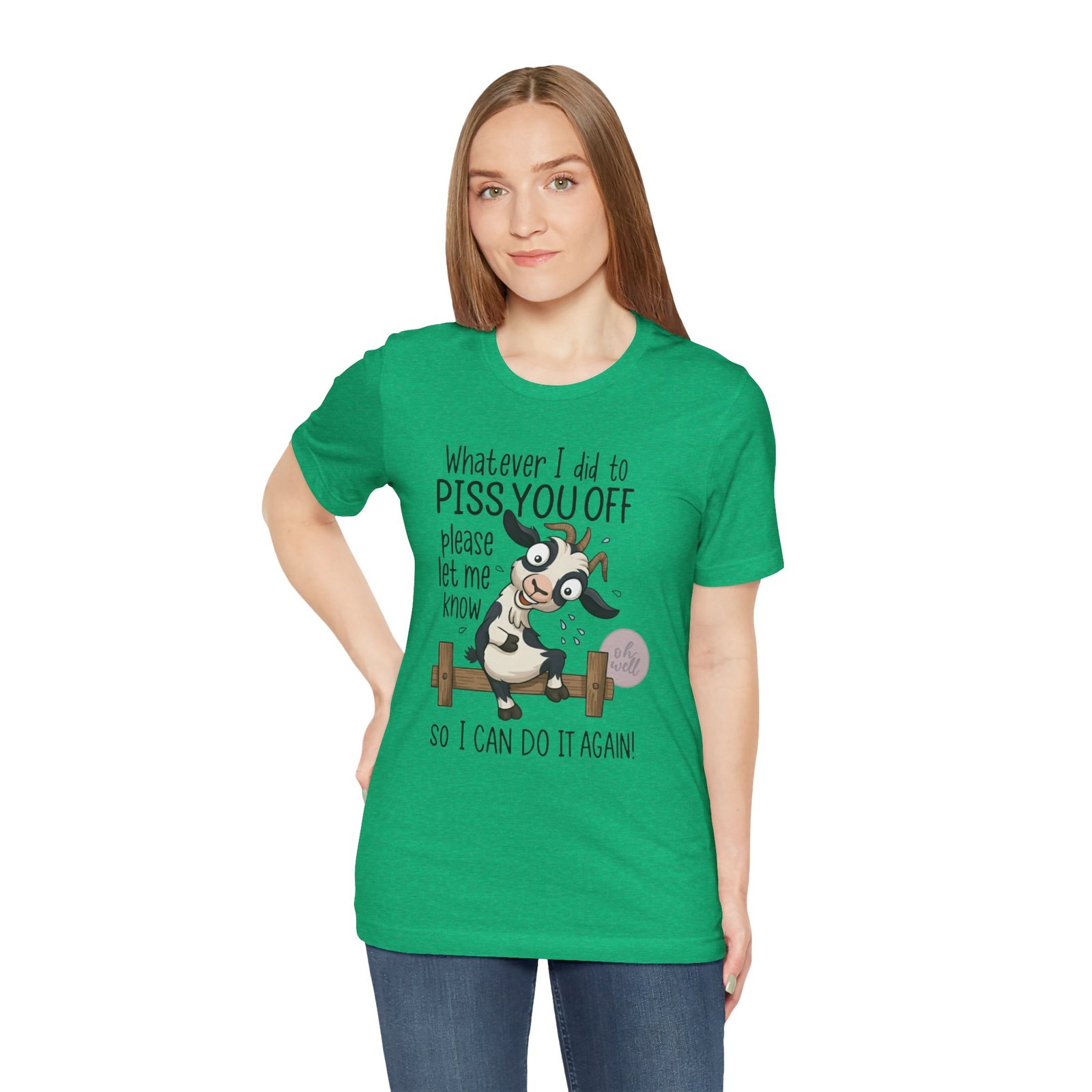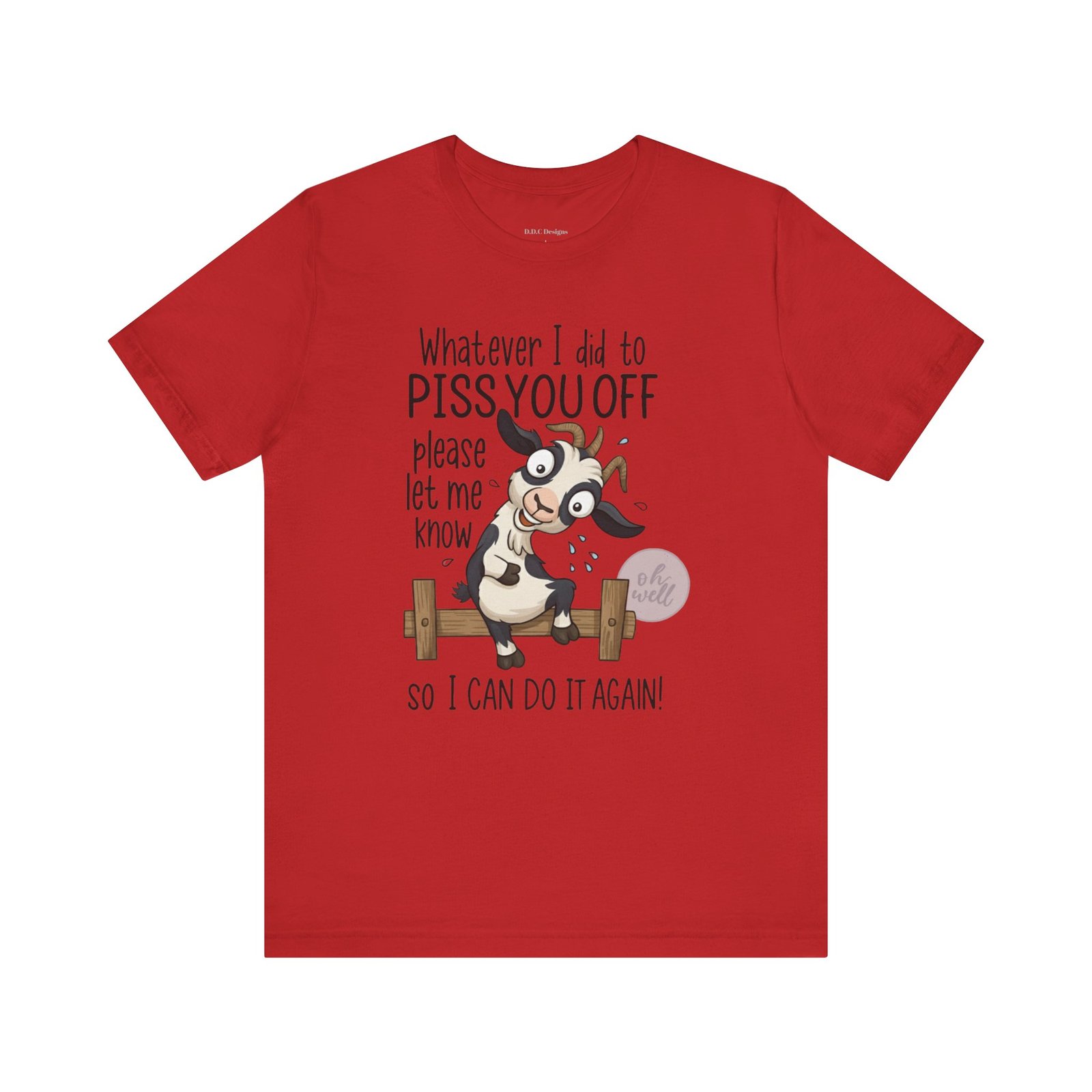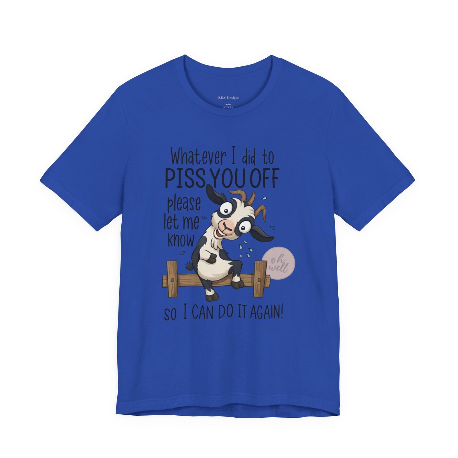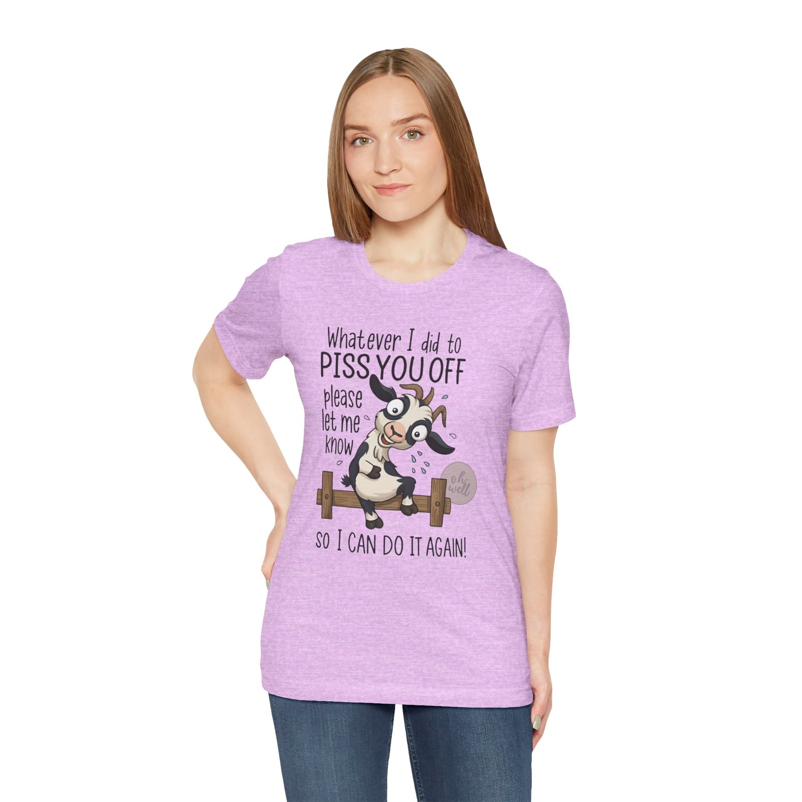 This hilarious t-shirt features an adorable, wide-eyed goat giving a cheeky grin while sitting on a fence, paired with the legendary phrase: ‘Whatever I did to PISS YOU OFF please let me know so I can do it again.’ It’s the ultimate statement piece for anyone who loves a good laugh and doesn’t take life too seriously. Perfect for those with a playful and mischievous side, it is sure to grab attention and spark conversations. Ideal for casual and leisure wear, this t-shirt is made with 100% Airlume combed and ring-spun cotton, ensuring a lightweight and breathable fabric.