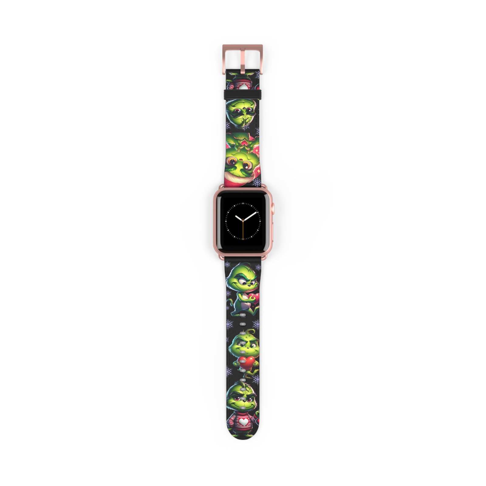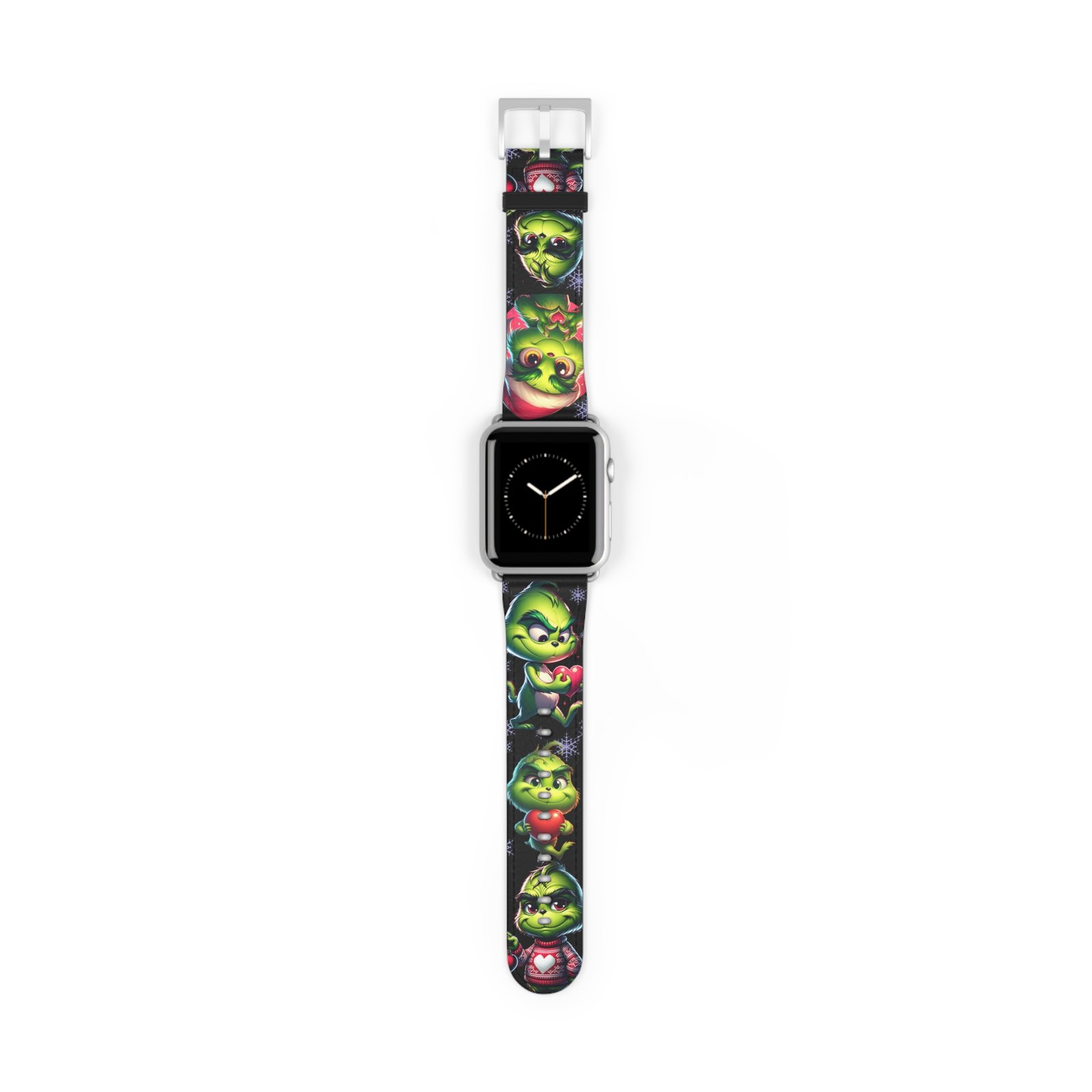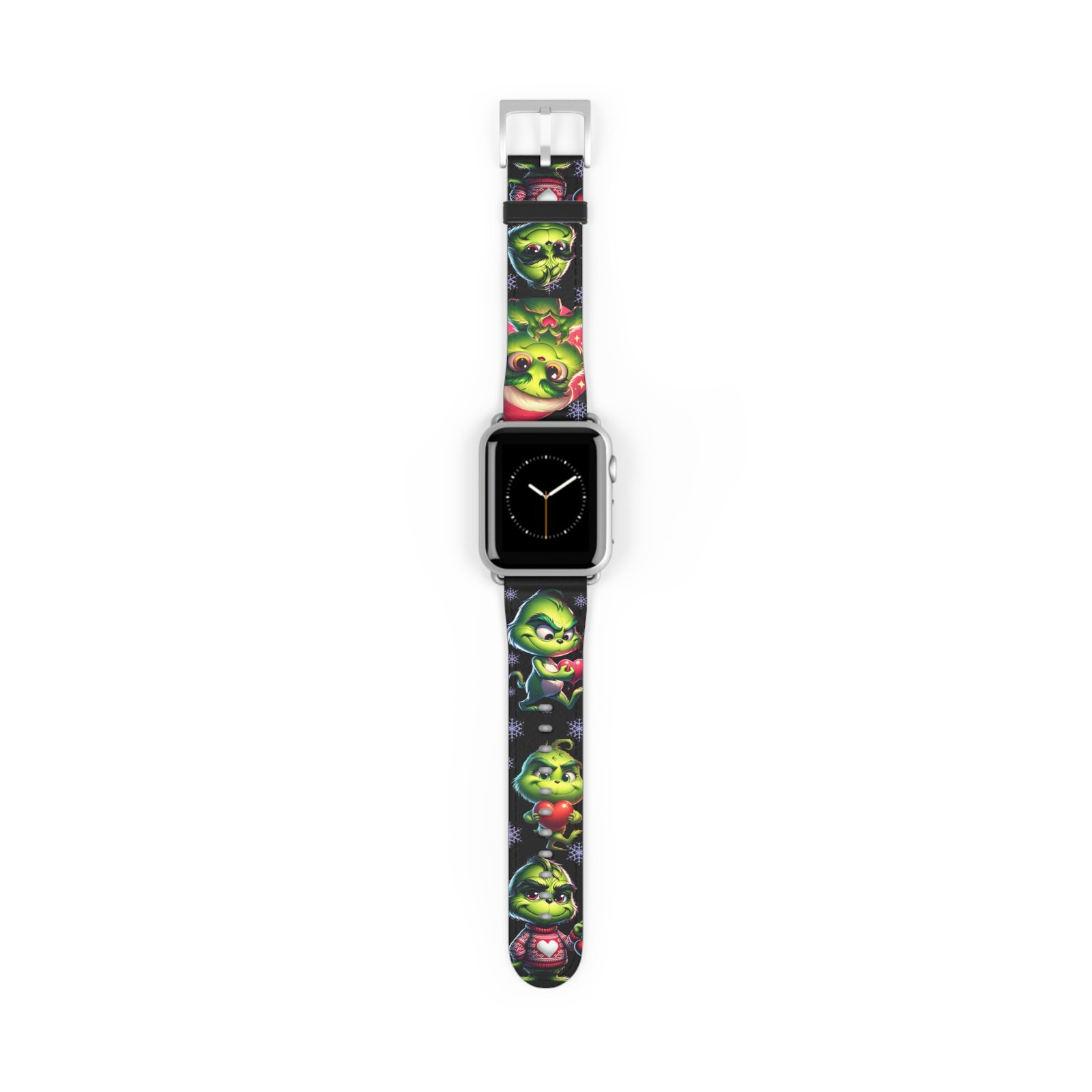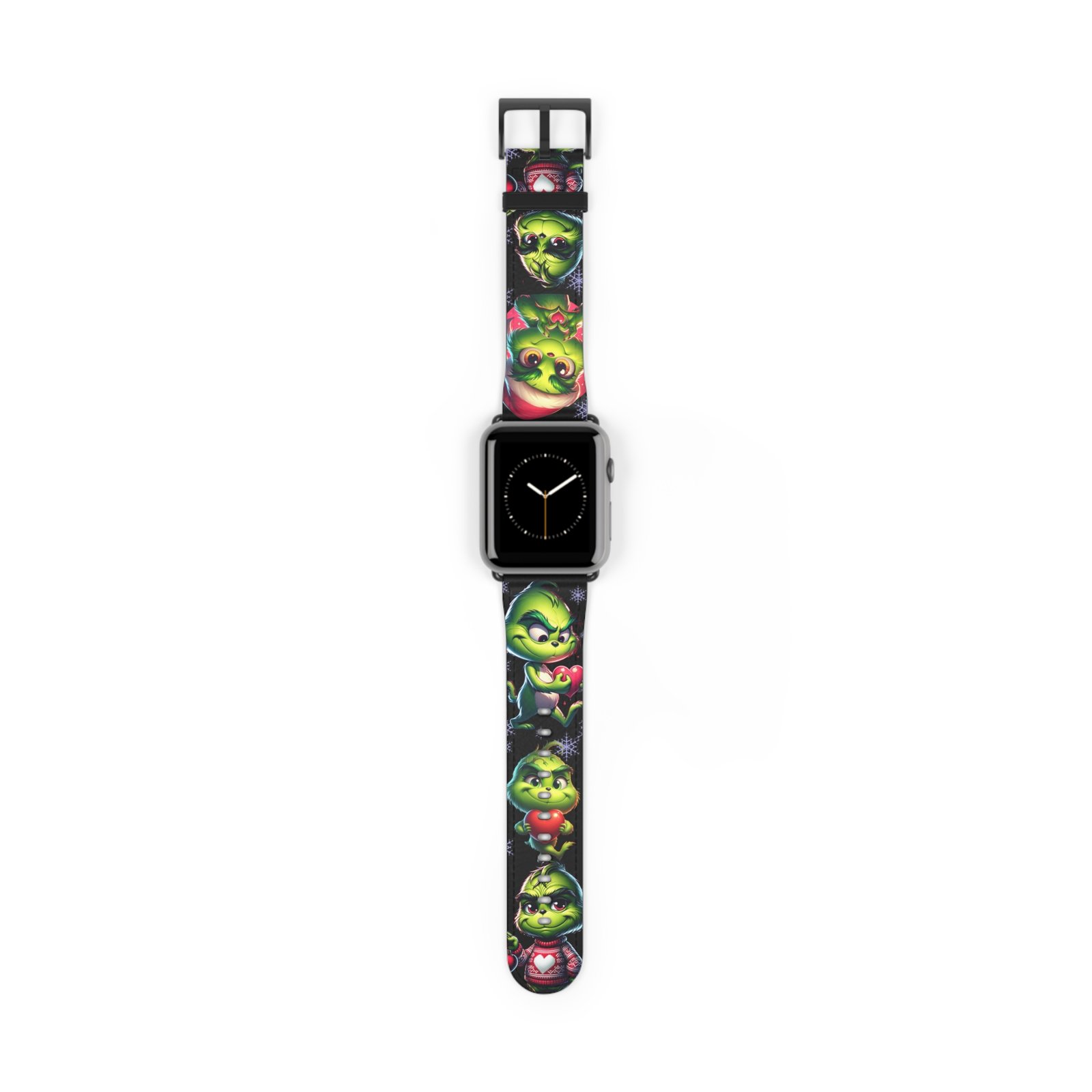 Add a touch of holiday spirit to your Apple Watch with this fun and festive Grinch-inspired Watch Band. Perfect for fans of the classic Dr. Seuss character, this band features adorable poses, Santa hats, snowflakes, and hearts. Made from durable, comfortable material, it’s a great conversation starter and must-have accessory throughout the Christmas season. Suitable for adults and Apple Watch Series 1-9 Ultra and SE devices.