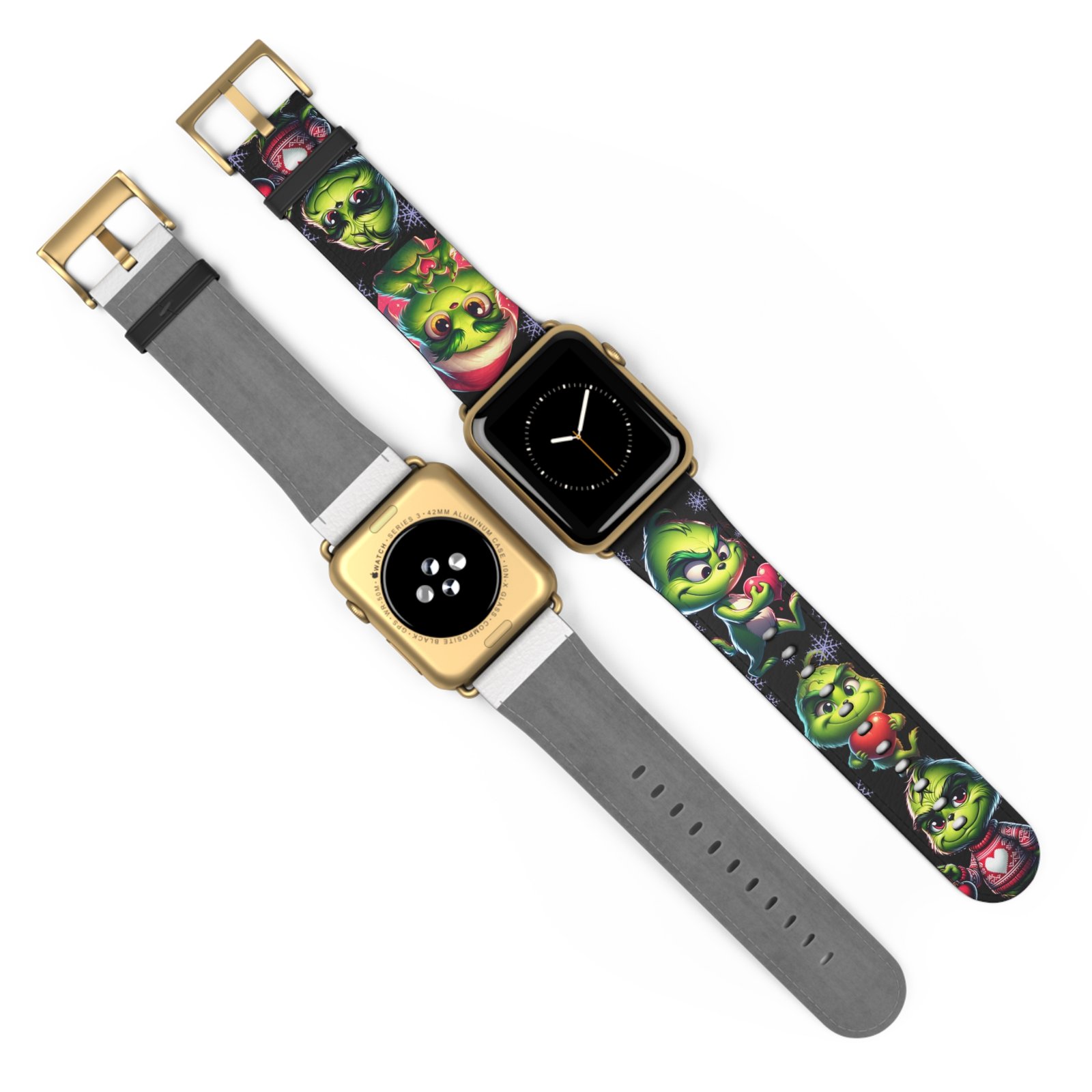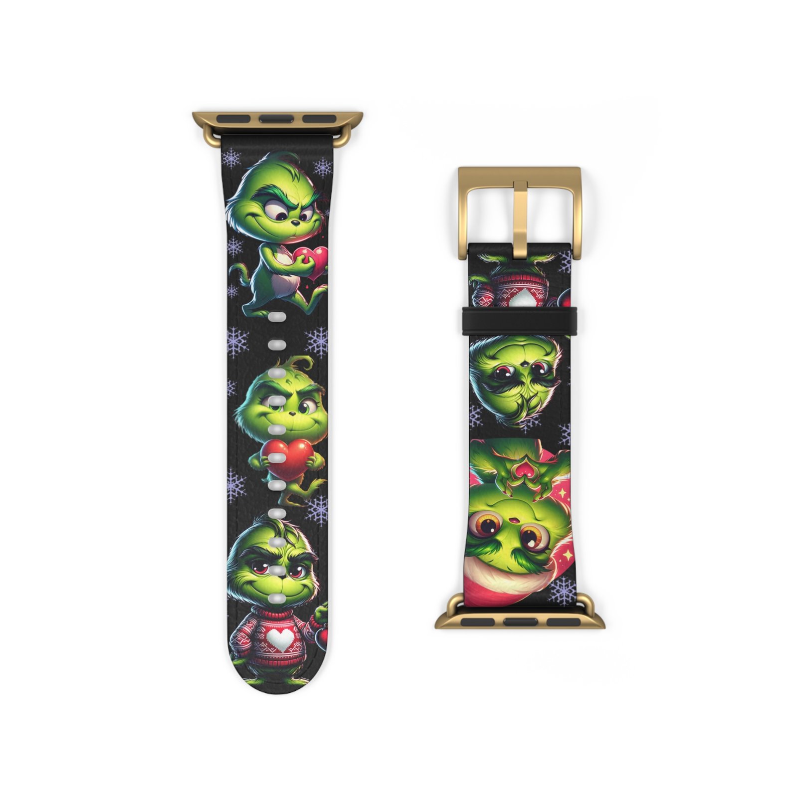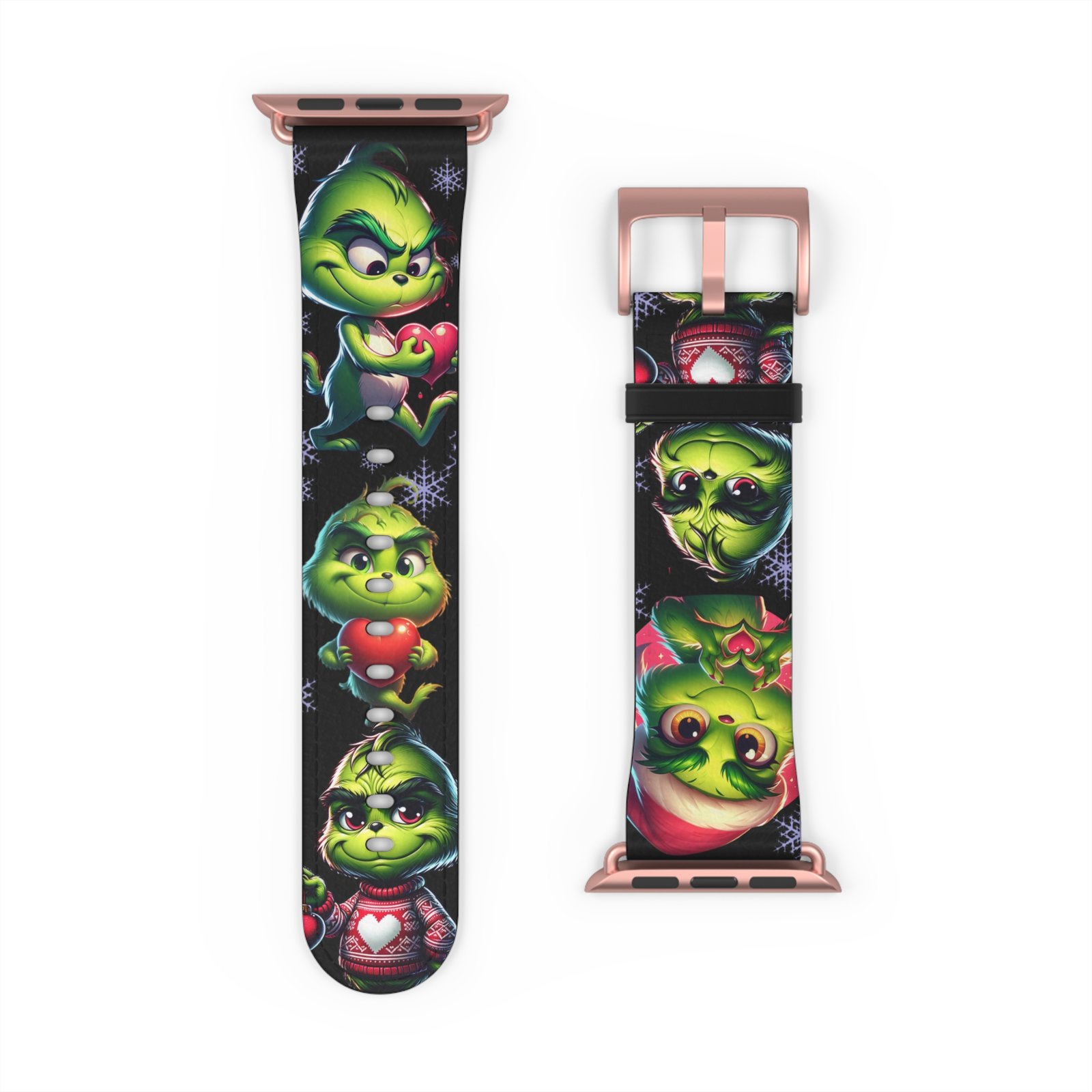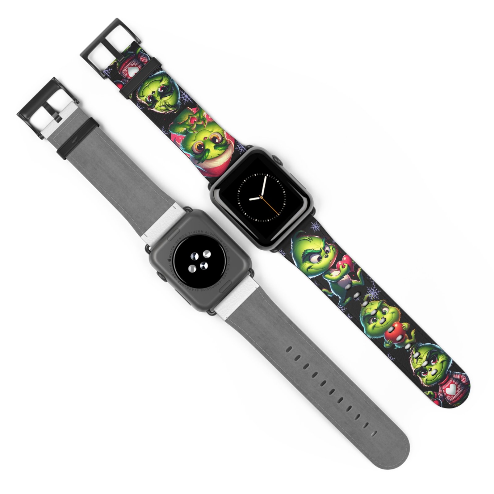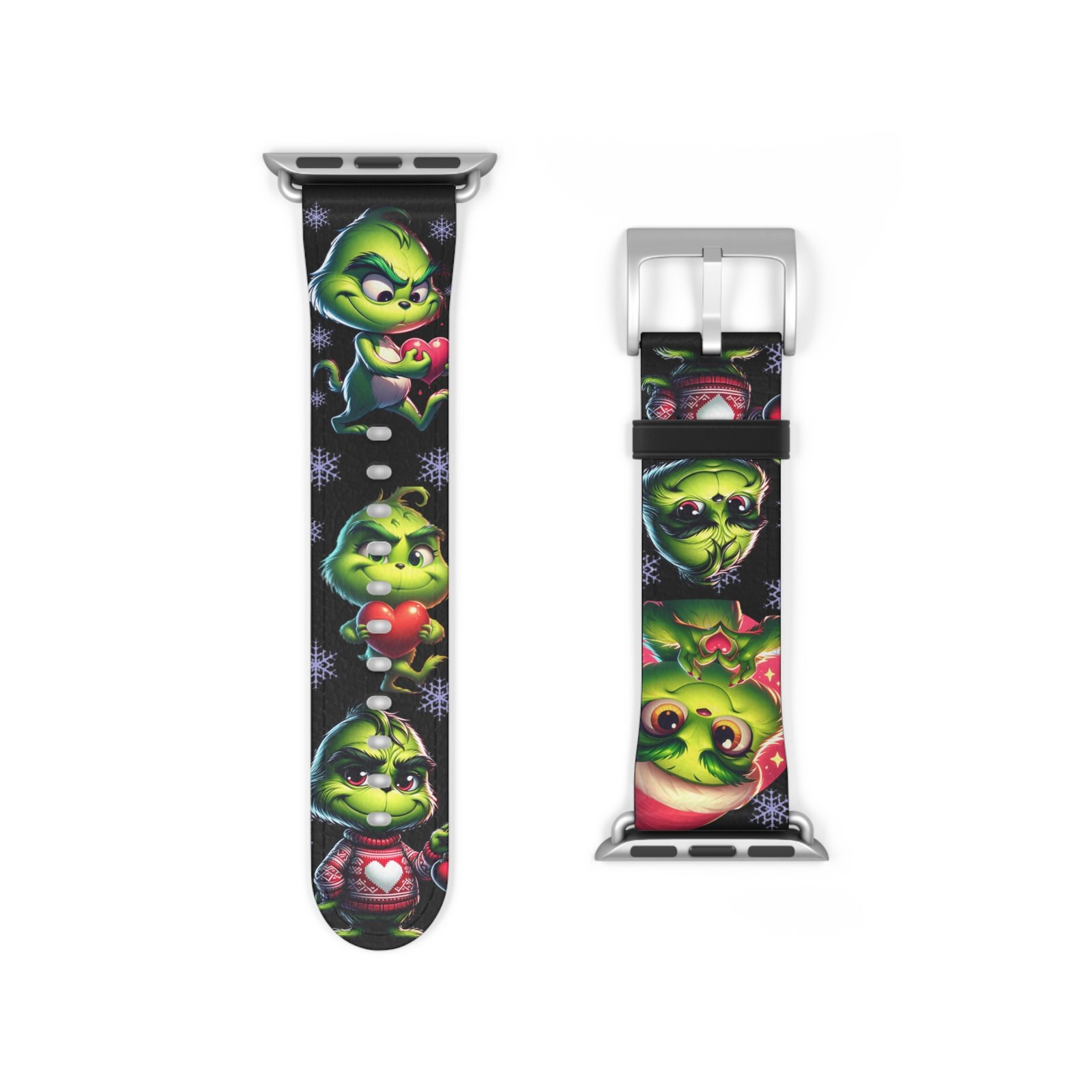 Add a touch of holiday spirit to your Apple Watch with this fun and festive Grinch-inspired Watch Band. Perfect for fans of the classic Dr. Seuss character, this band features adorable poses, Santa hats, snowflakes, and hearts. Made from durable, comfortable material, it’s a great conversation starter and must-have accessory throughout the Christmas season. Suitable for adults and Apple Watch Series 1-9 Ultra and SE devices.