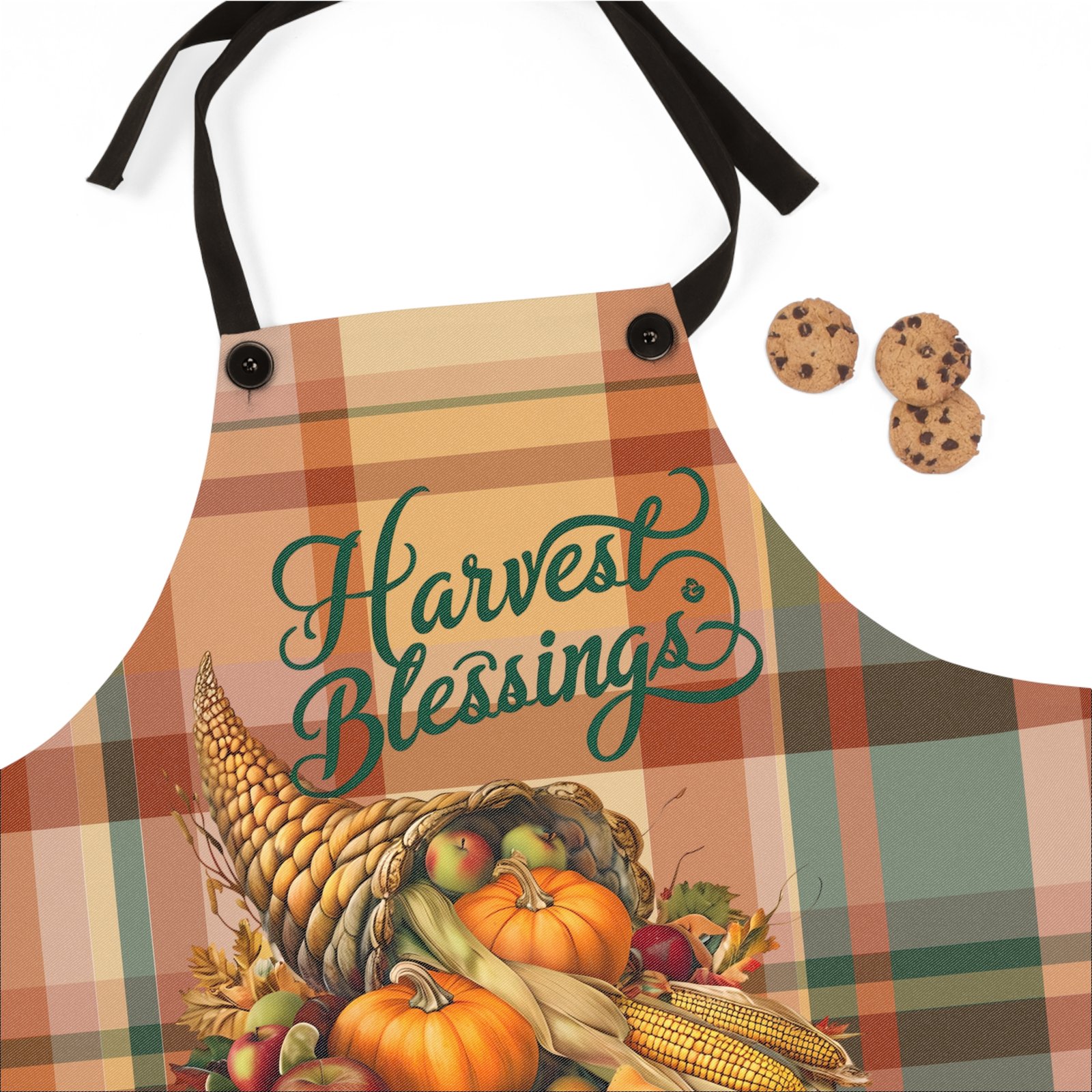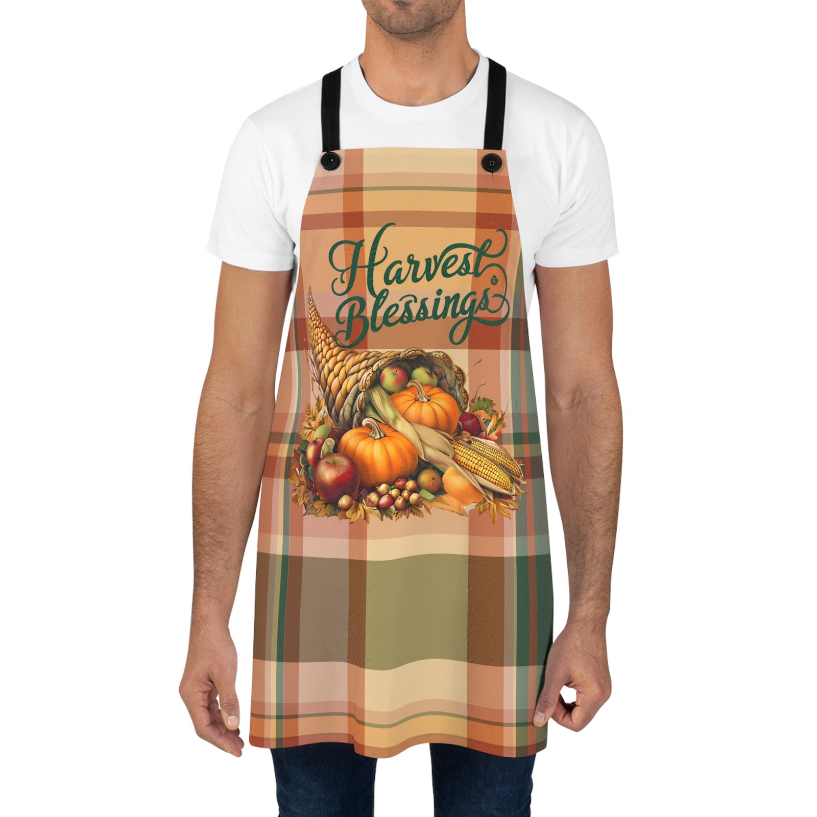 This harvest blessings apron features a fall plaid background and a beautiful cornucopia design, perfect for adding a festive touch to your cooking or baking sessions. Ideal for those who love celebrating Thanksgiving and the fall season.