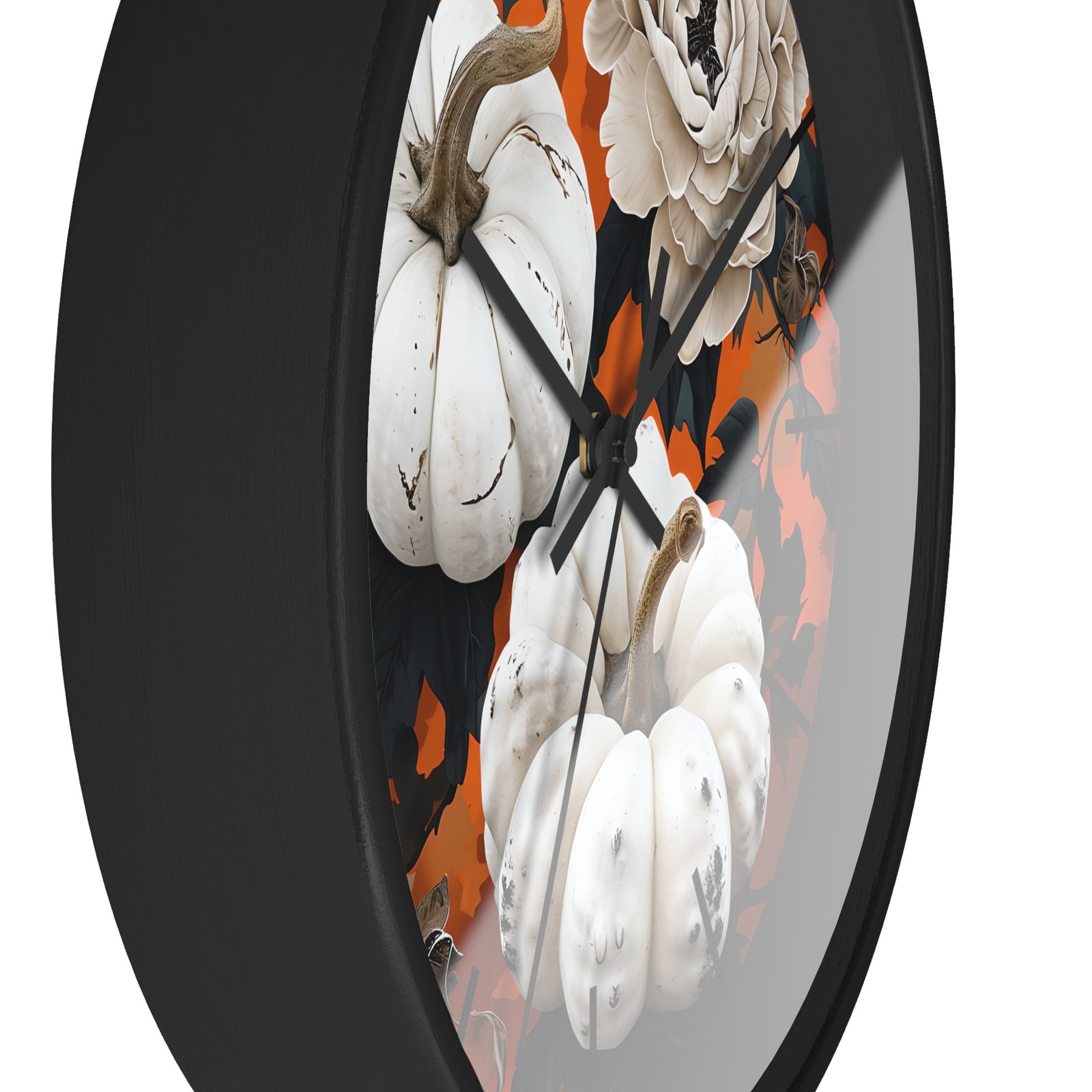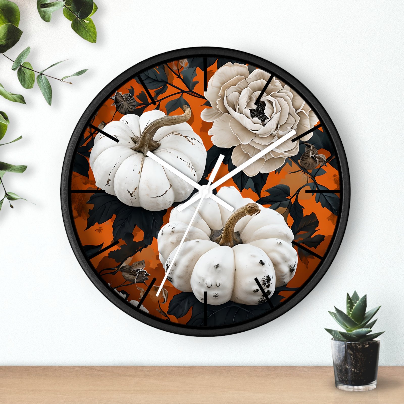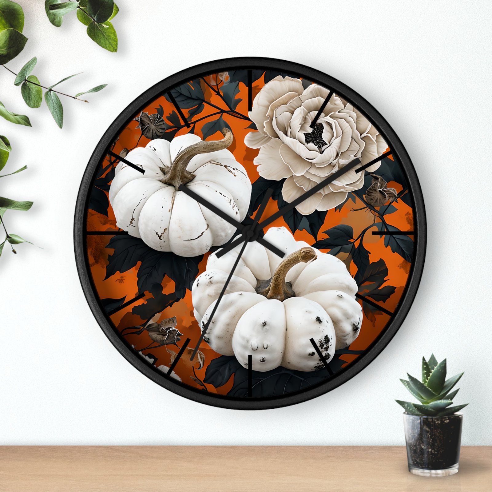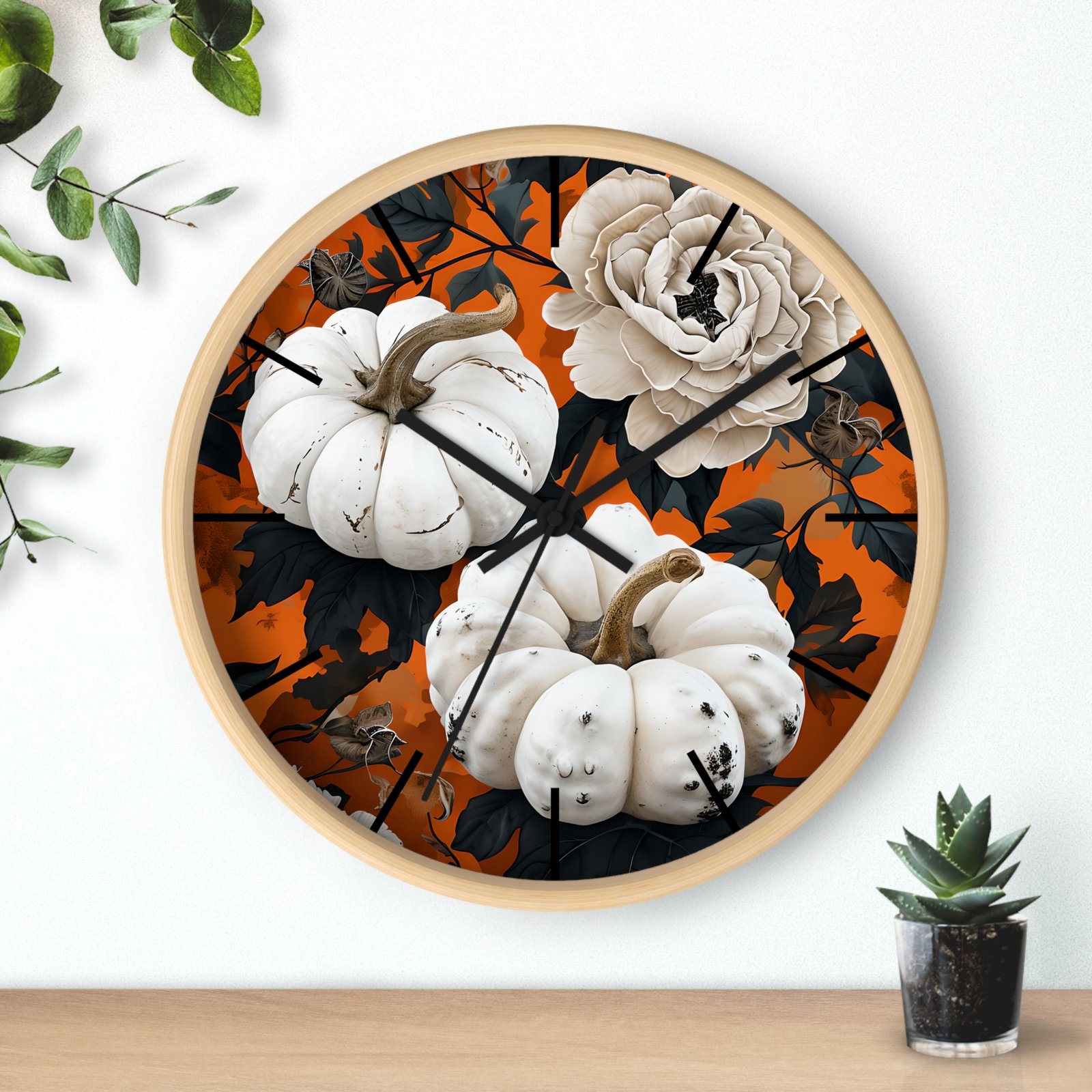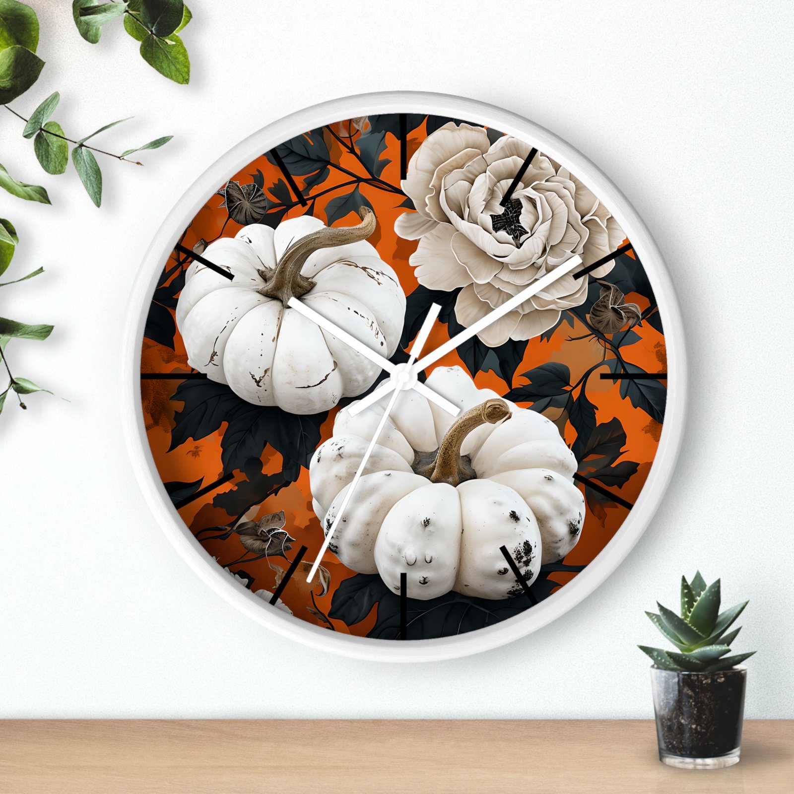 Bring the beauty of the season into your home year-round with the ‘Harvest Bloom’ Wall Clock. Featuring soft white pumpkins, creamy florals, and rich charcoal foliage on a burnt-orange background, this clock adds warmth and style to your kitchen, entryway, or cozy nook. Perfect for fall enthusiasts and those looking to add a touch of modern fall décor to their space. Ideal for Thanksgiving, fall harvest celebrations, and everyday use.