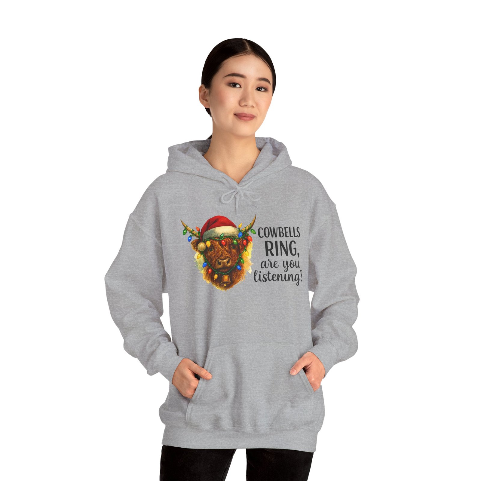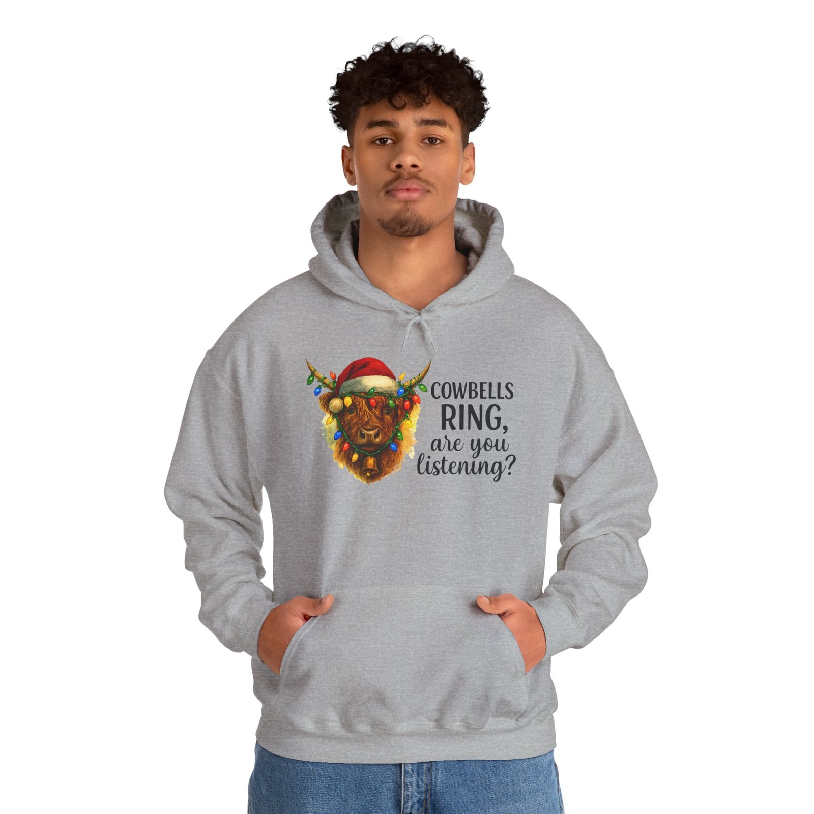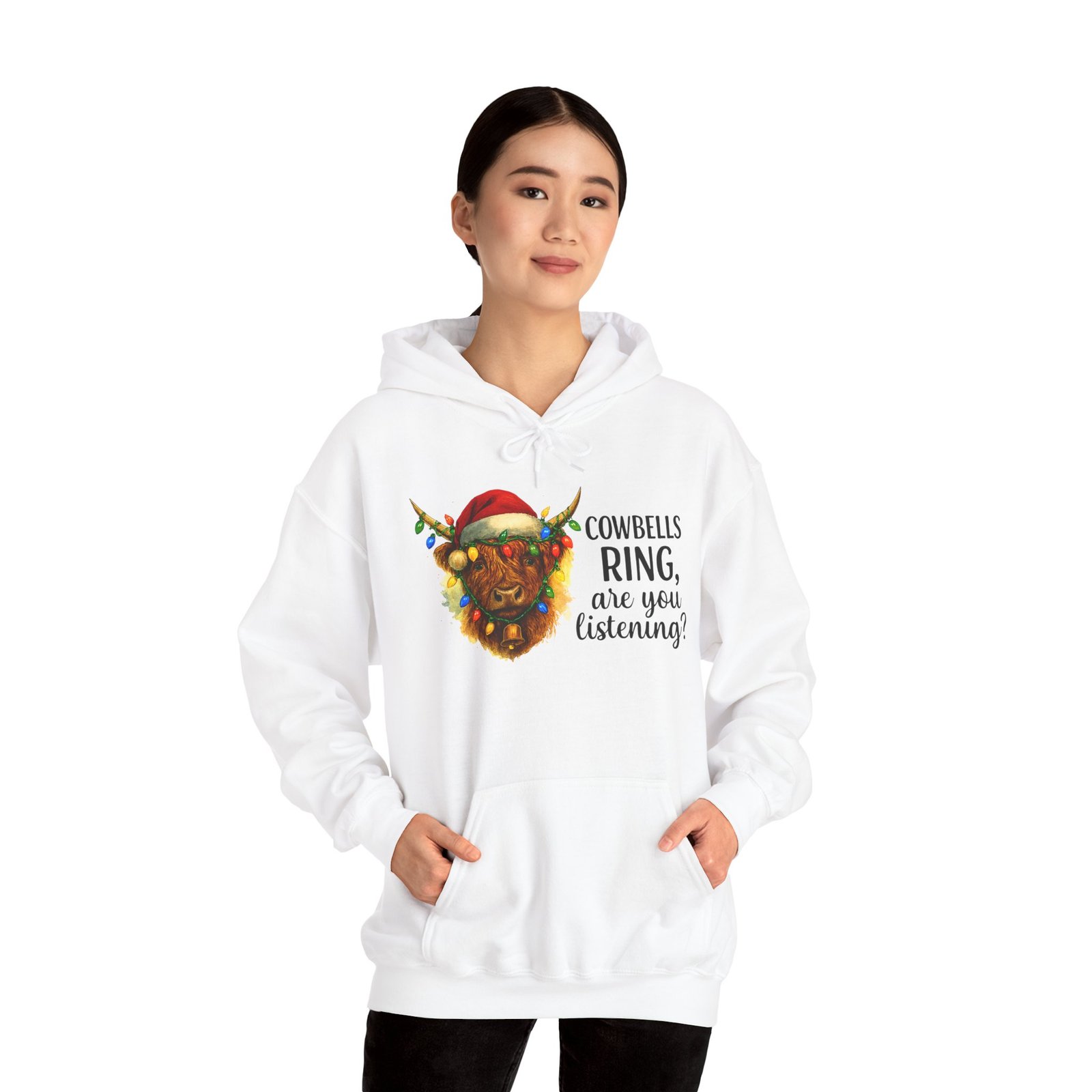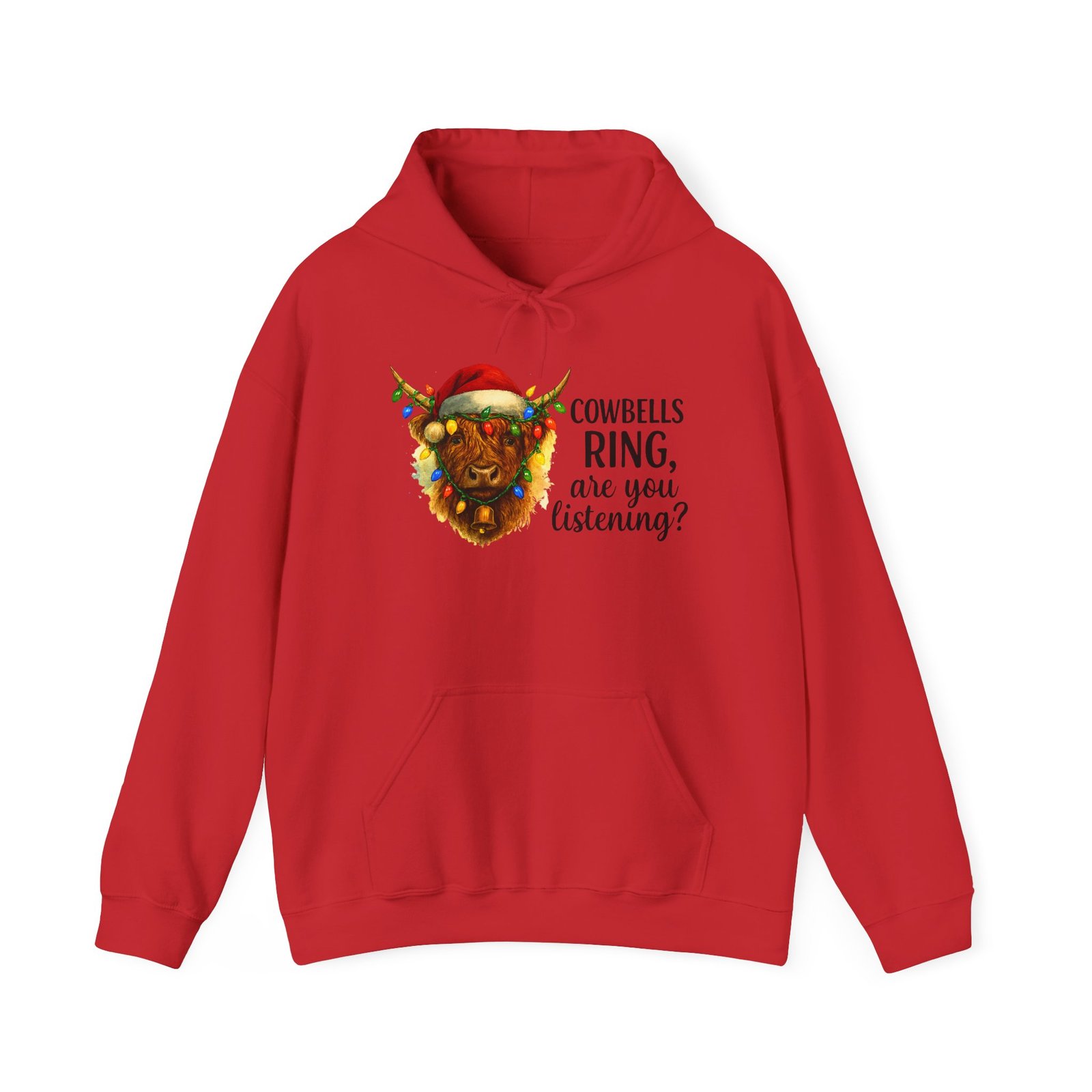 Get ready to cozy up for the holidays in this adorable and witty Highland Cow Christmas Hoodie. Featuring a charming illustration of a shaggy Highland cow with a Santa hat and Christmas lights, this hoodie is perfect for anyone who loves farm animals, Scotland, or just a good pun. Ideal for holiday parties, Christmas morning, or just running errands with a smile, this classic-fit hoodie is designed for maximum warmth and comfort all season long. Makes a fantastic, unique Christmas gift for those with a great sense of humor and love for cuddly creatures.