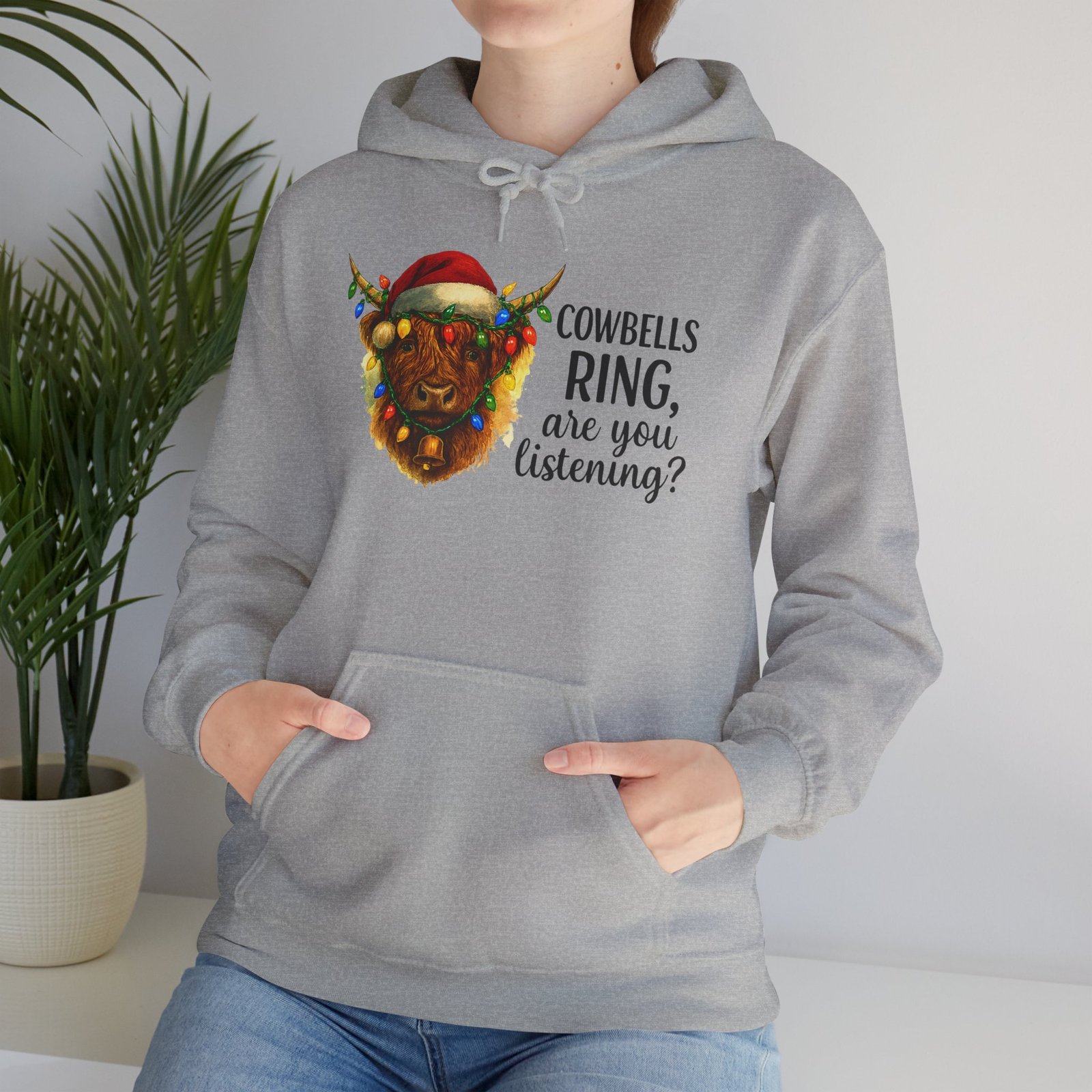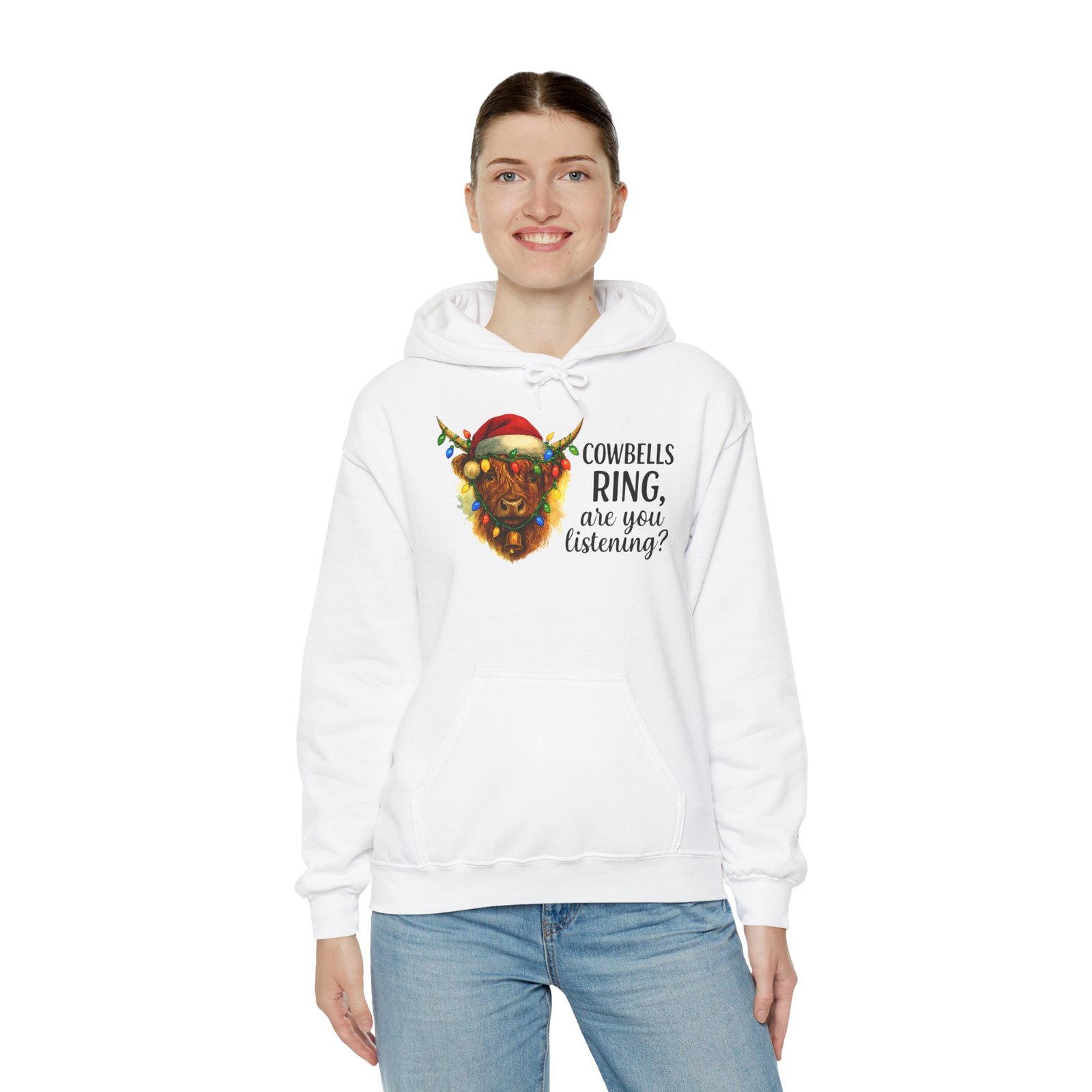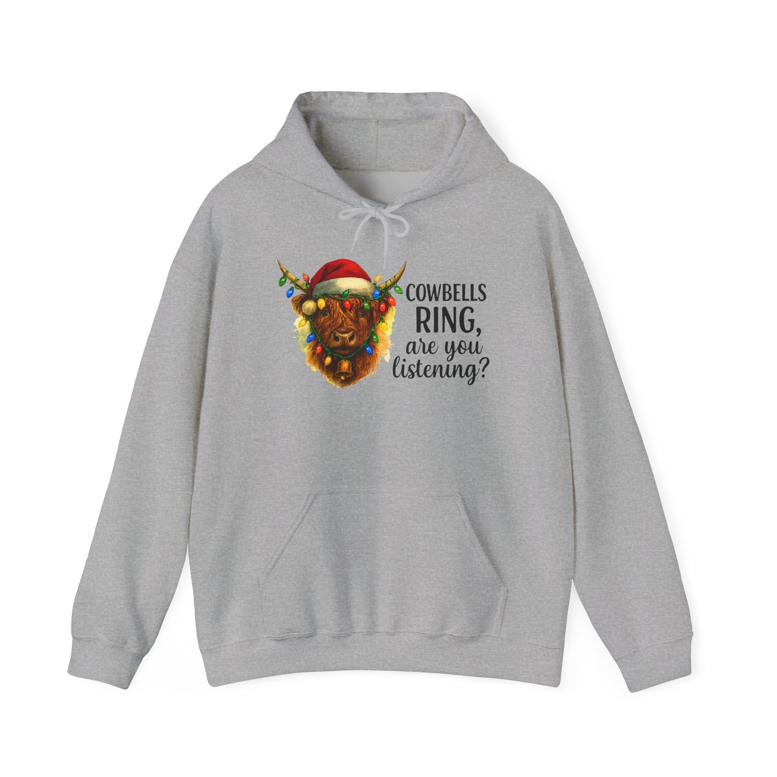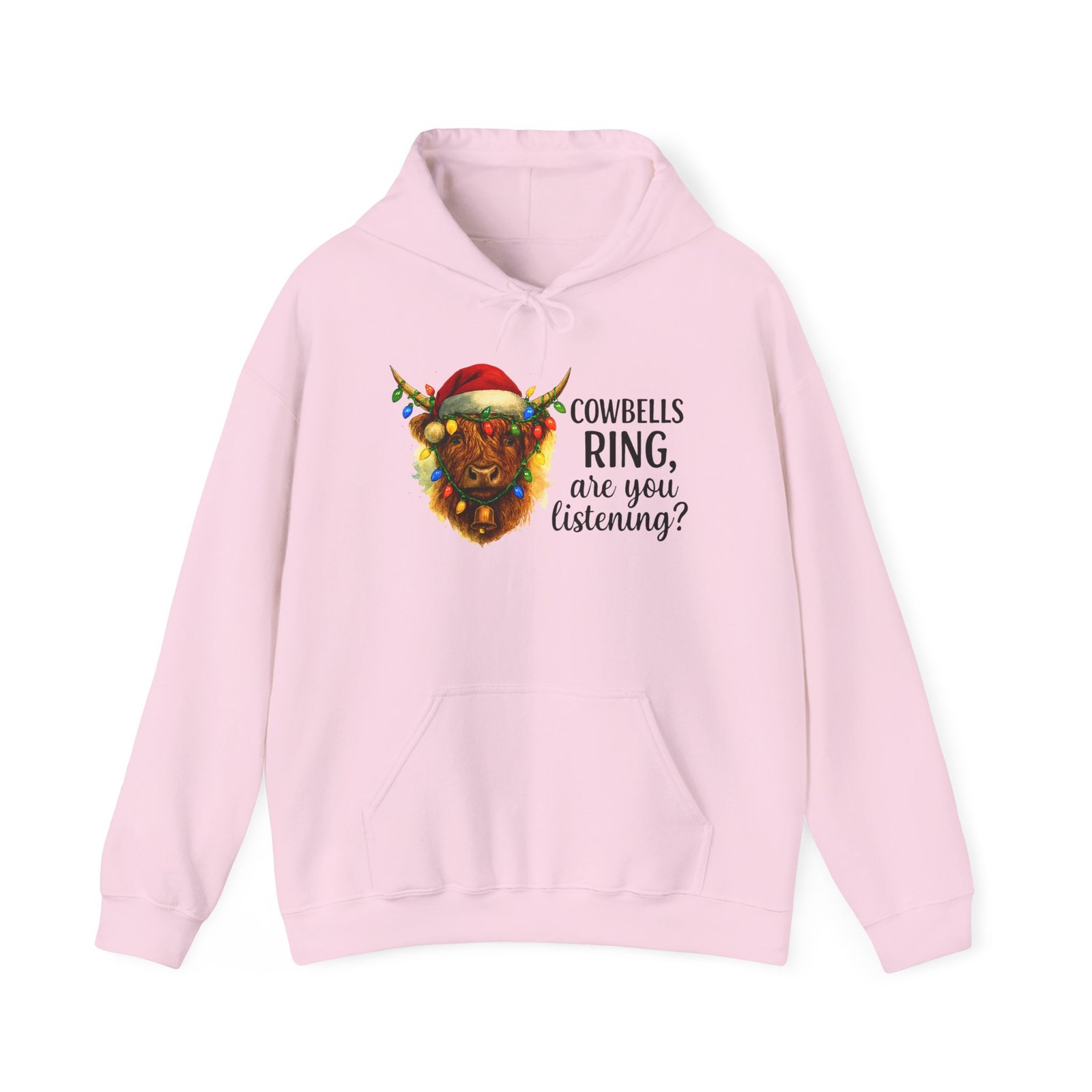Get ready to cozy up for the holidays in this adorable and witty Highland Cow Christmas Hoodie. Featuring a charming illustration of a shaggy Highland cow with a Santa hat and Christmas lights, this hoodie is perfect for anyone who loves farm animals, Scotland, or just a good pun. Ideal for holiday parties, Christmas morning, or just running errands with a smile, this classic-fit hoodie is designed for maximum warmth and comfort all season long. Makes a fantastic, unique Christmas gift for those with a great sense of humor and love for cuddly creatures.