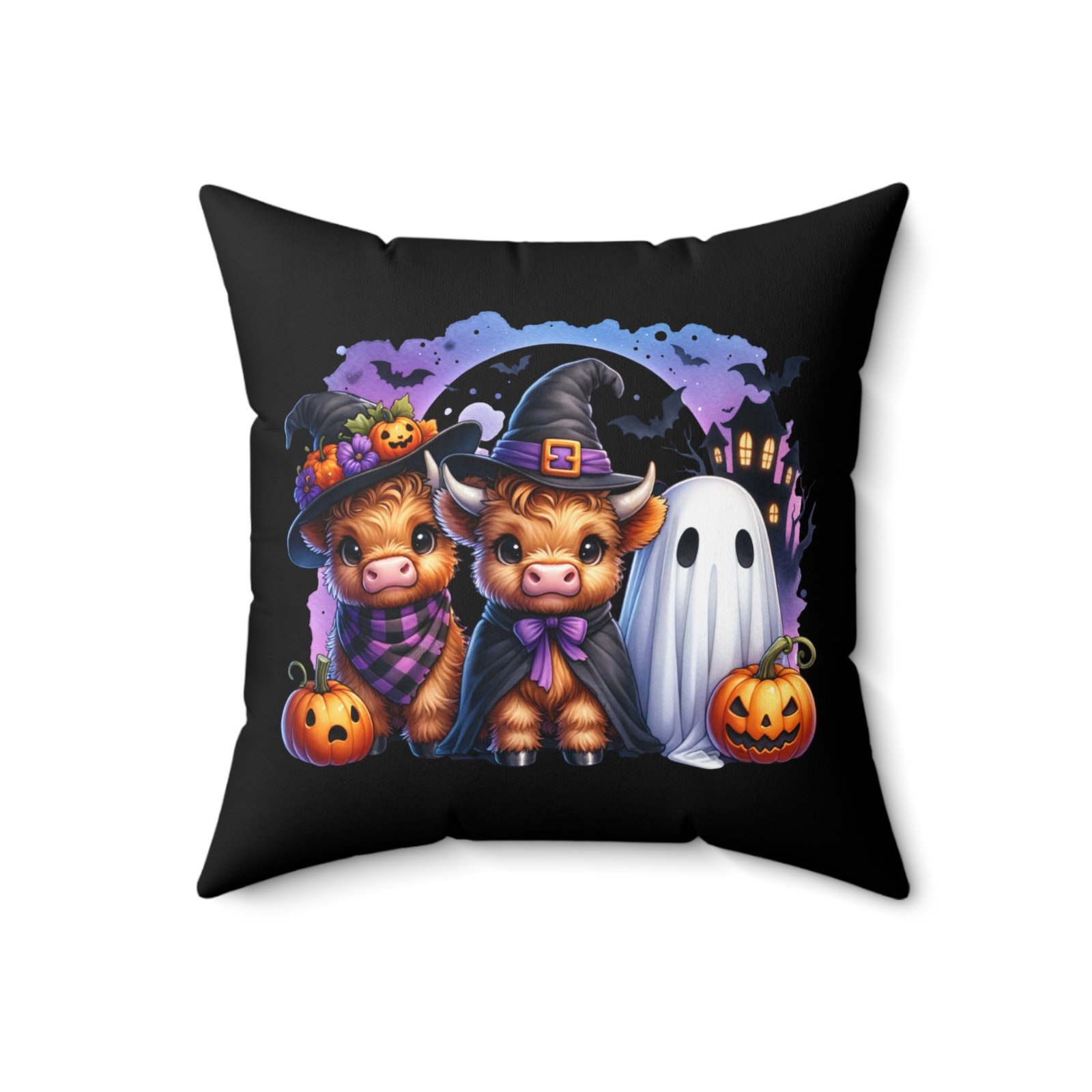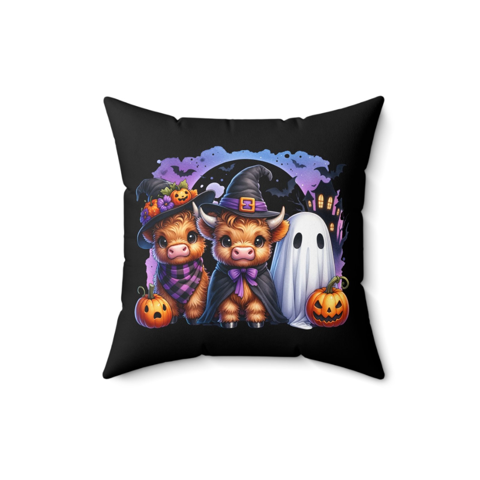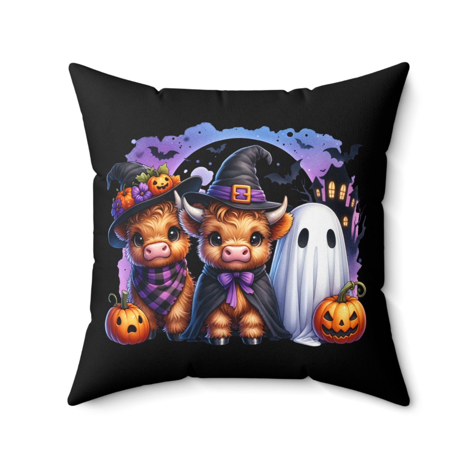 Highland cows in Halloween costumes square pillow available in multiple sizes. This adorable and festive pillow brings a touch of whimsy and fun to your home decor, perfect for Halloween enthusiasts and animal lovers. Ideal for decorating your living room, bedroom, or any cozy corner during the spooky season.