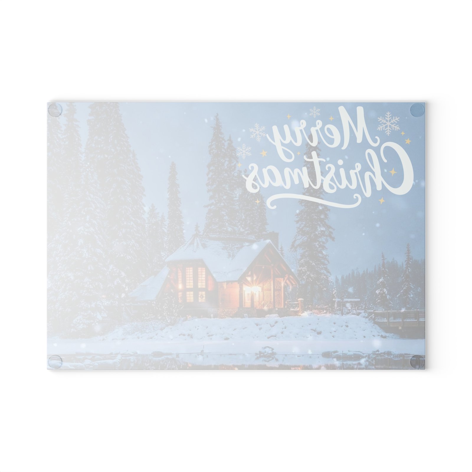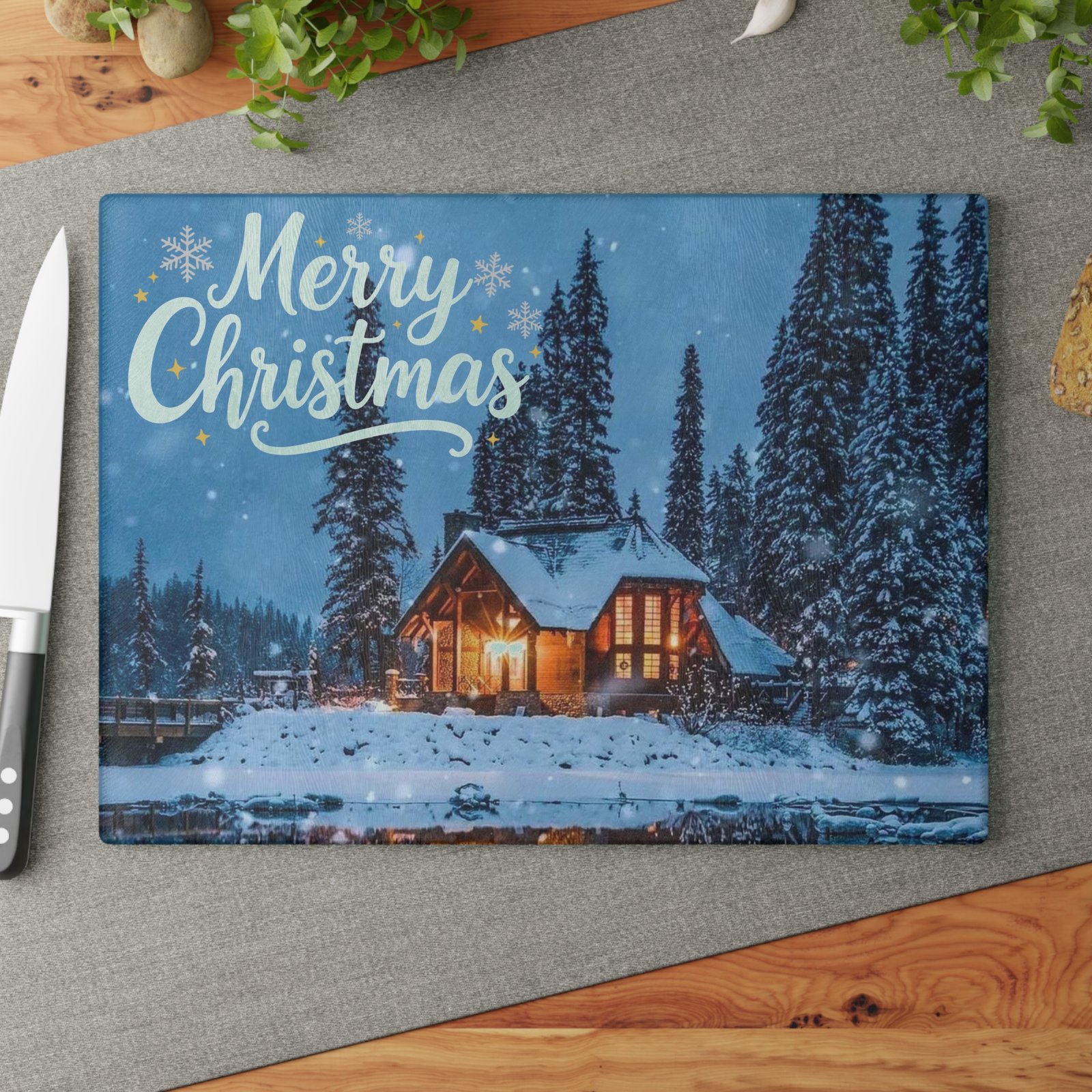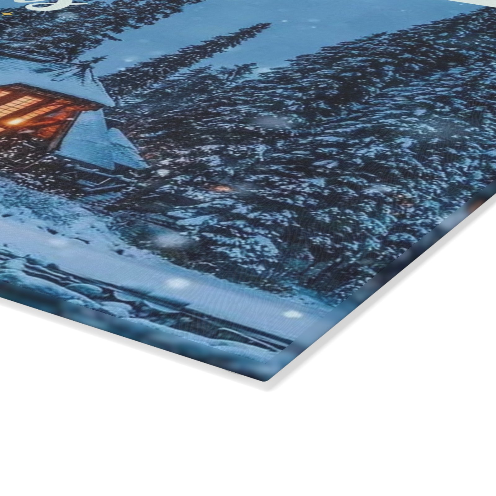 Bring the magic of a snowy holiday evening right into your kitchen with this stunning glass cutting board. Featuring a warmly lit, snow-covered cabin nestled among pine trees, it’s the perfect festive accent for chopping, slicing, and serving. The ‘Merry Christmas’ script and gentle snowfall create an enchanting, rustic holiday scene. Perfect for those who love cozy holiday vibes and want to add a touch of festive charm to their kitchen decor. Ideal for Christmas celebrations and winter gatherings.
