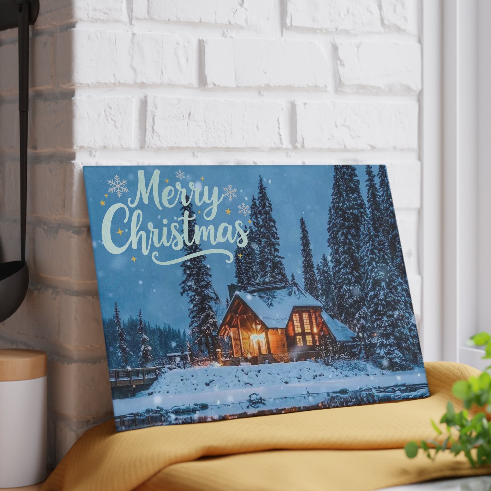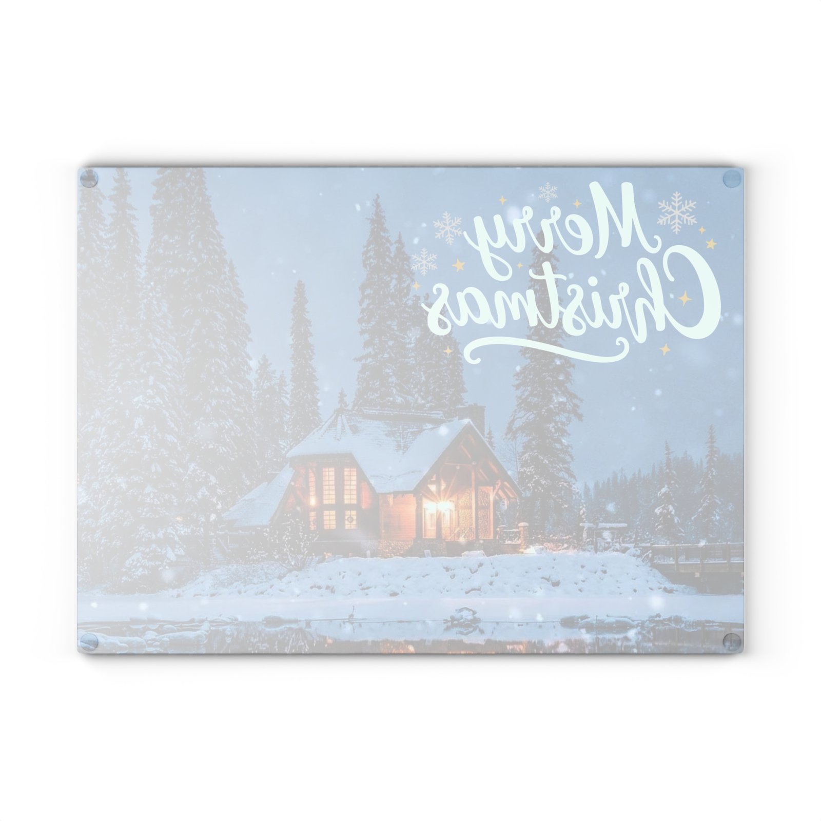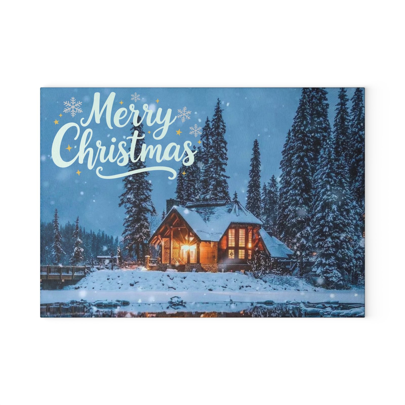 Bring the magic of a snowy holiday evening right into your kitchen with this stunning glass cutting board. Featuring a warmly lit, snow-covered cabin nestled among pine trees, it’s the perfect festive accent for chopping, slicing, and serving. The ‘Merry Christmas’ script and gentle snowfall create an enchanting, rustic holiday scene. Perfect for those who love cozy holiday vibes and want to add a touch of festive charm to their kitchen decor. Ideal for Christmas celebrations and winter gatherings.
