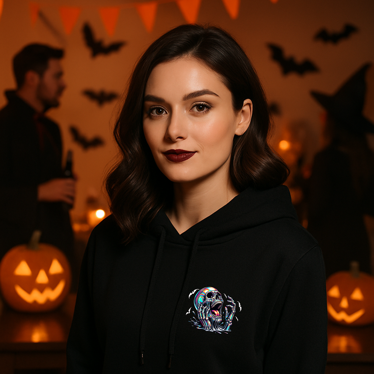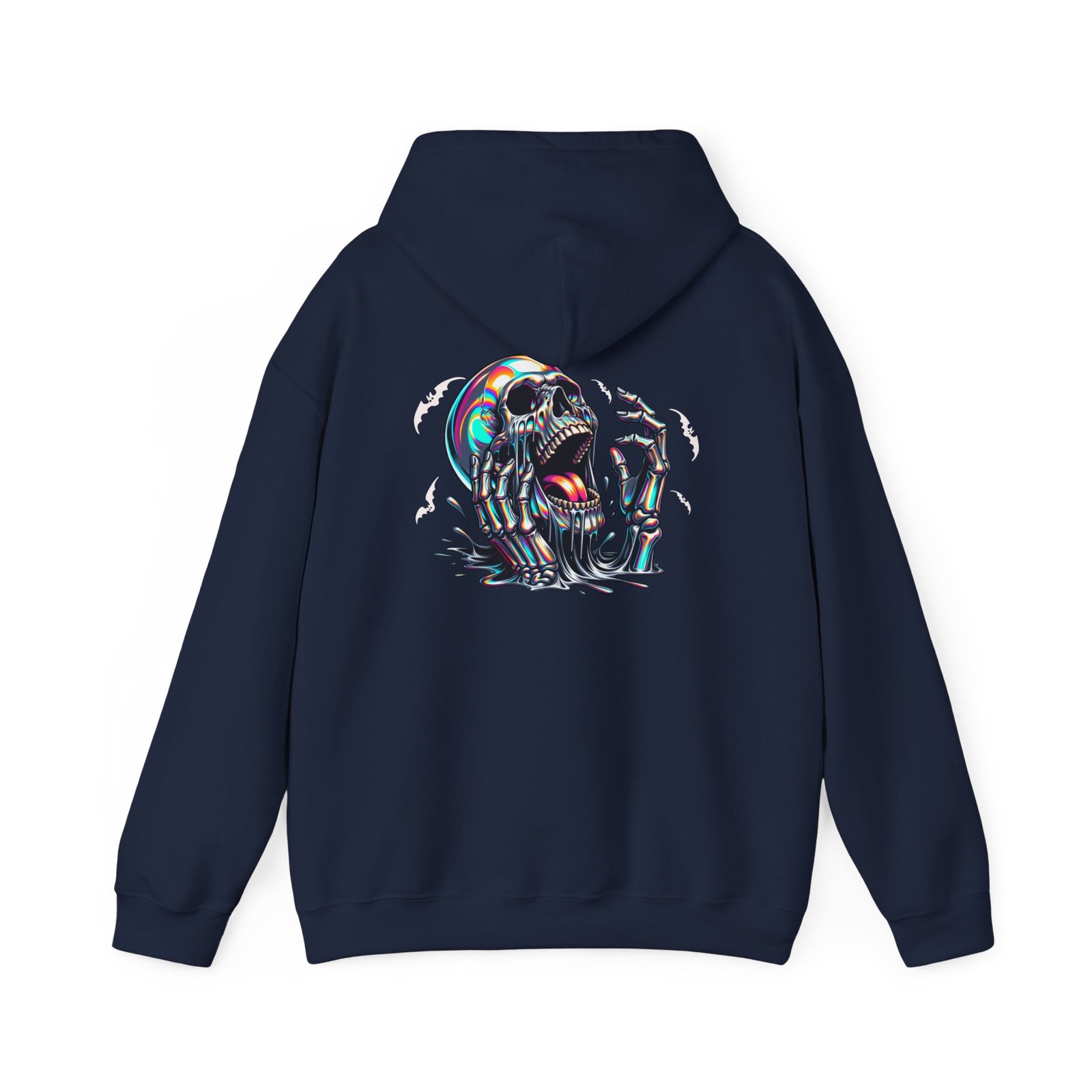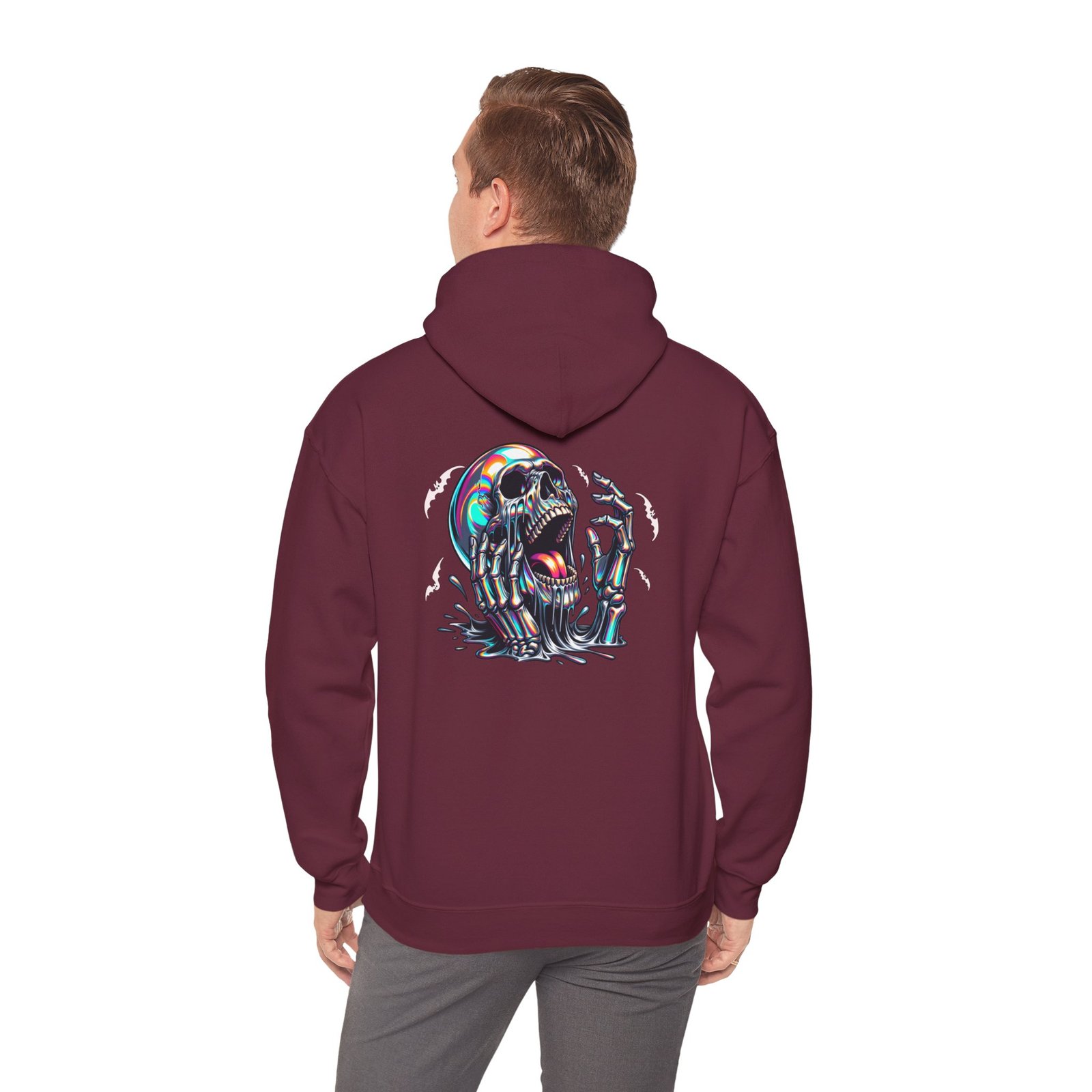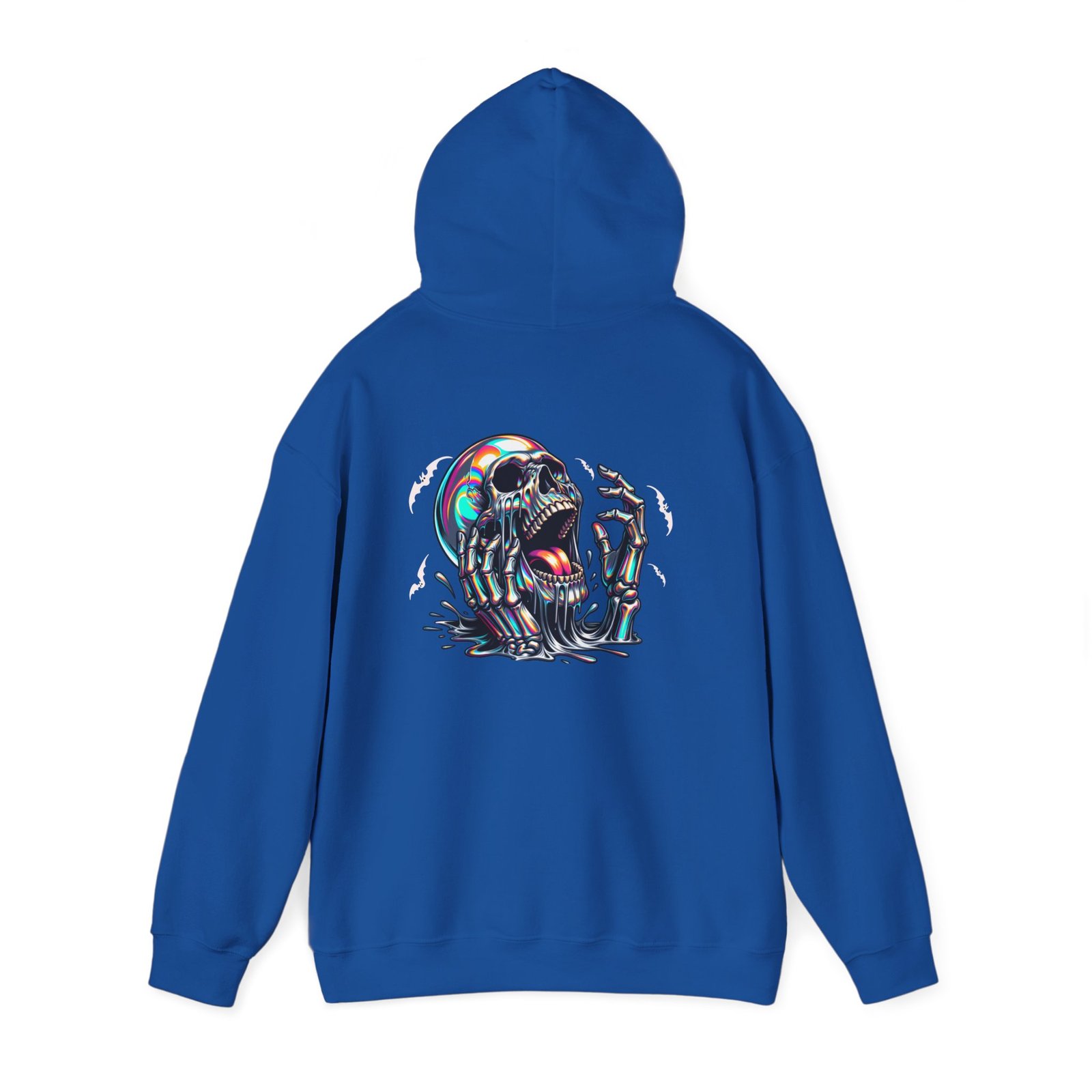 Stay cozy and stylish in this iridescent color skeleton unisex Gildan hoodie perfect for Halloween. This hoodie gives off a spooky vibe and is ideal for anyone looking to add a touch of Halloween spirit to their wardrobe. Great for adults looking for a comfortable and festive hoodie to wear during the spooky season.