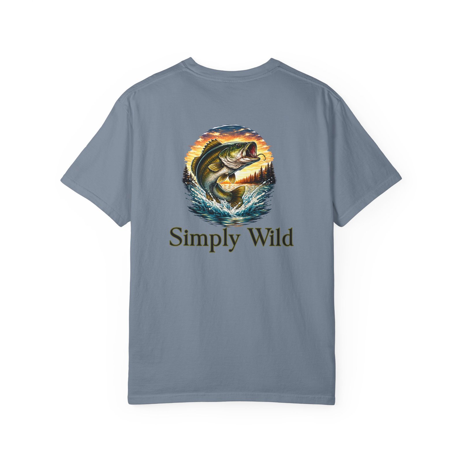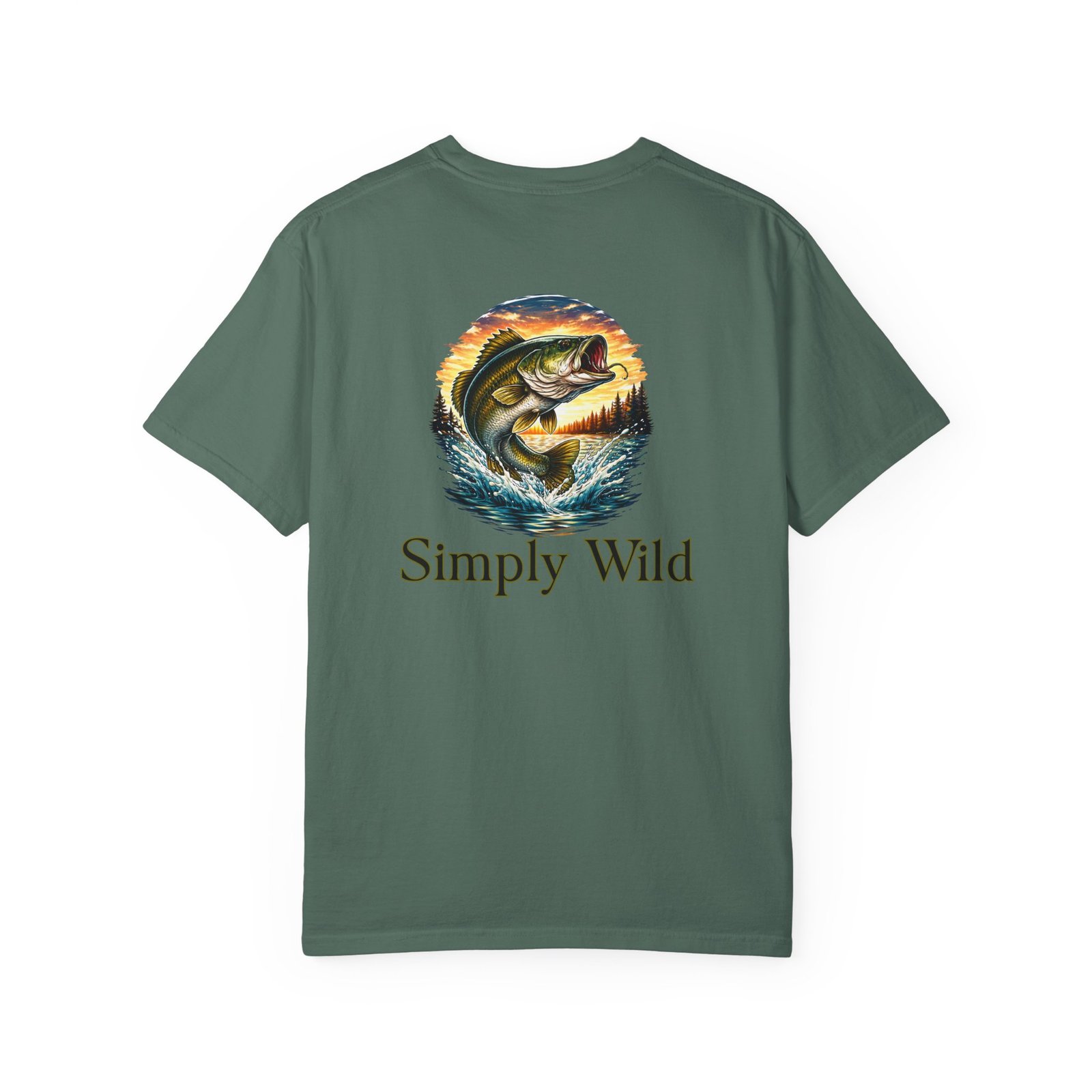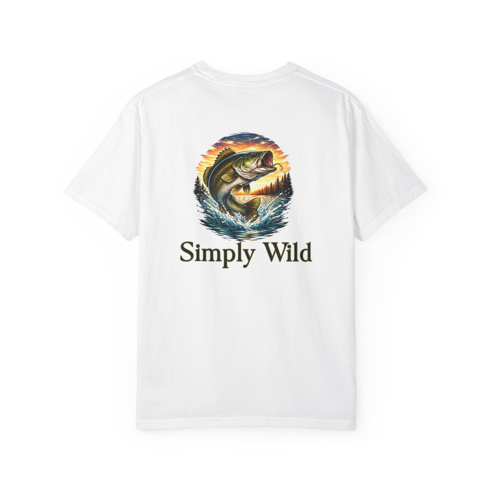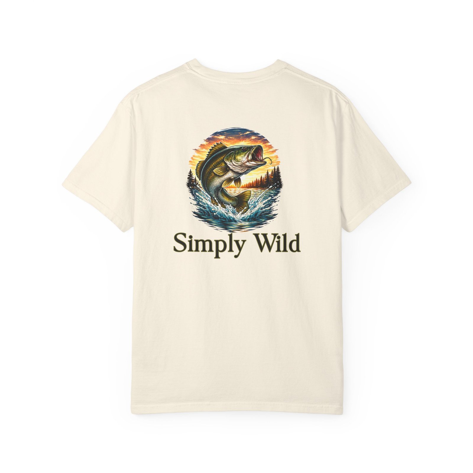 A garment-dyed cotton tee that feels lived-in from the first wear. This relaxed-fit T-shirt features a vivid fish illustration on the back—a leaping bass framed by a twilight lake—and a smaller matching motif over the left chest with the phrase “Simply Wild.” The heavyweight, pre-shrunk fabric and double-needle stitching give it durable structure while the post-construction dye produces a soft, broken-in look and subtle depth of color. Wear it on early-morning casts, lakeside evenings, or when you want a quiet reminder of open water and the hush of a shoreline sunset.
