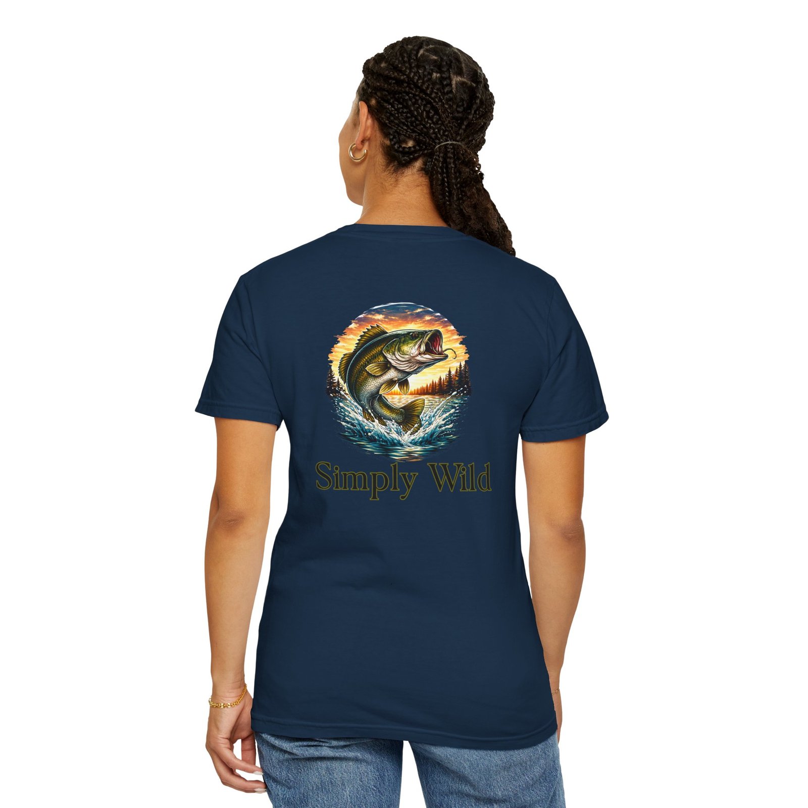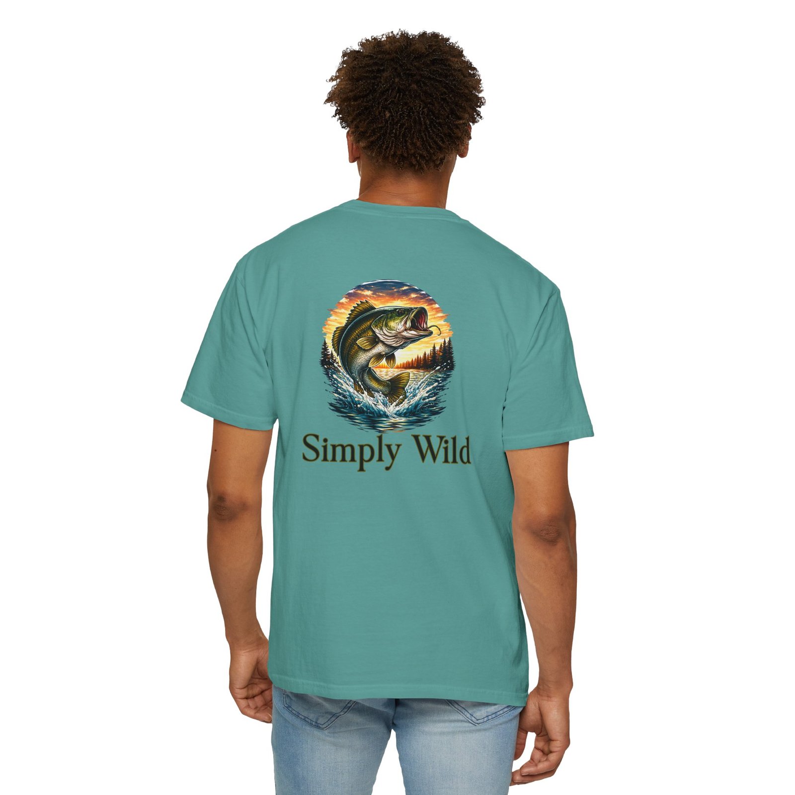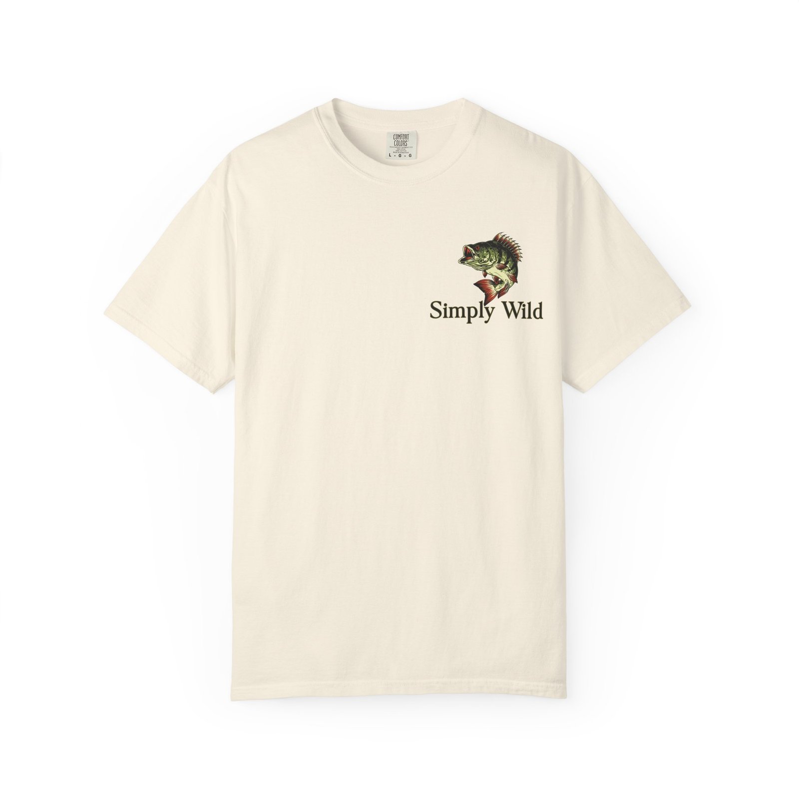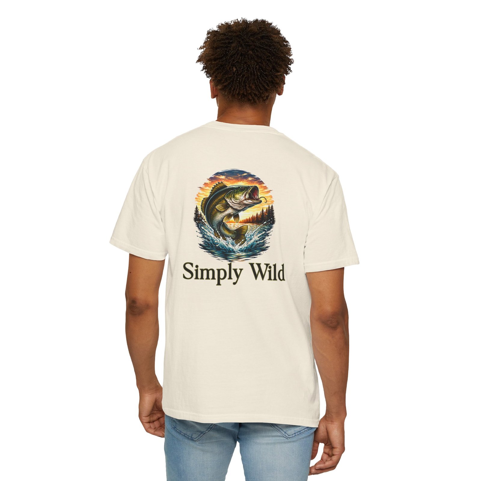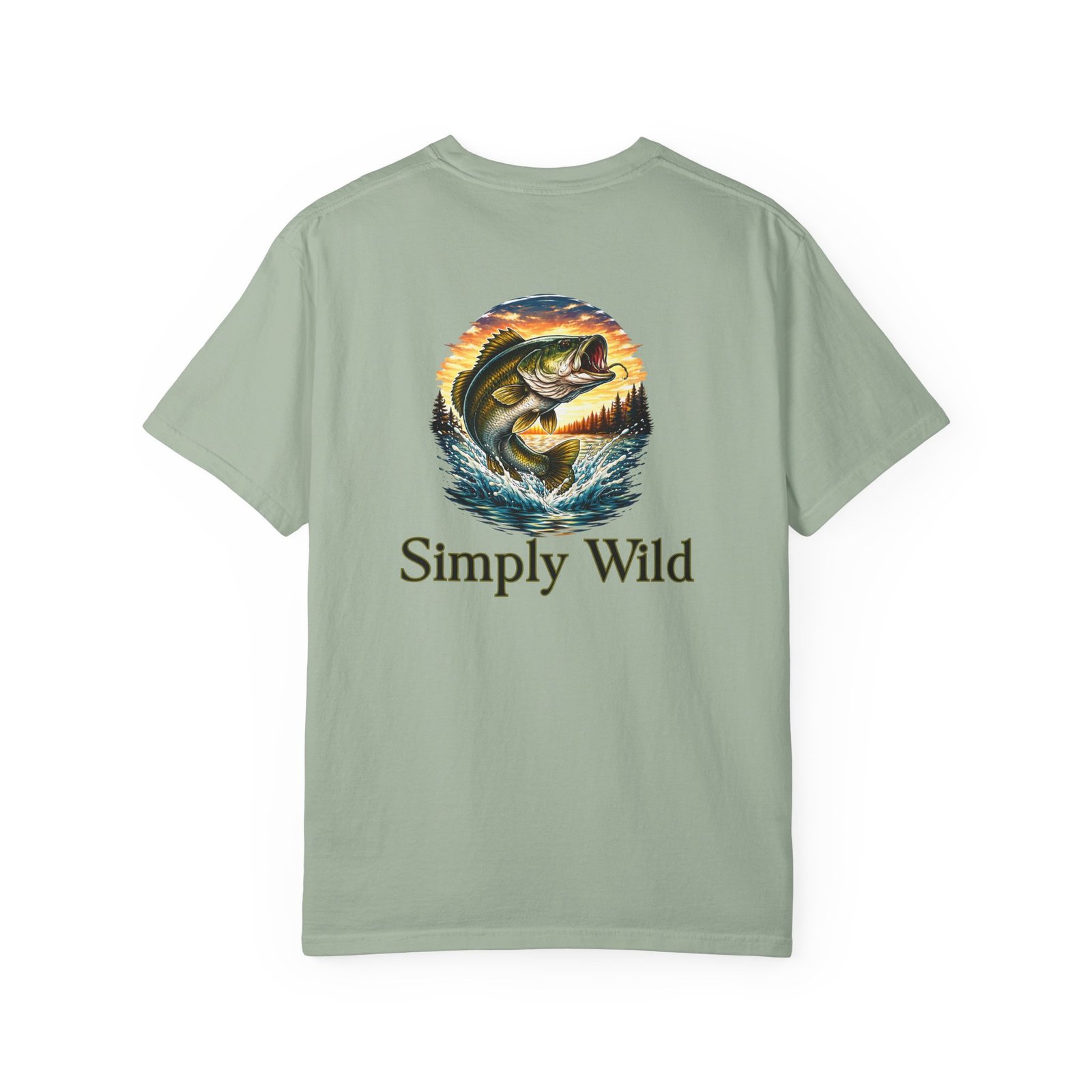 A garment-dyed cotton tee that feels lived-in from the first wear. This relaxed-fit T-shirt features a vivid fish illustration on the back—a leaping bass framed by a twilight lake—and a smaller matching motif over the left chest with the phrase “Simply Wild.” The heavyweight, pre-shrunk fabric and double-needle stitching give it durable structure while the post-construction dye produces a soft, broken-in look and subtle depth of color. Wear it on early-morning casts, lakeside evenings, or when you want a quiet reminder of open water and the hush of a shoreline sunset.
