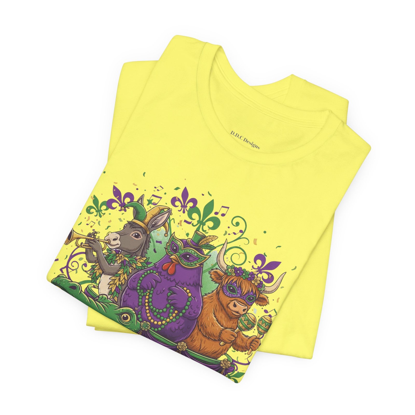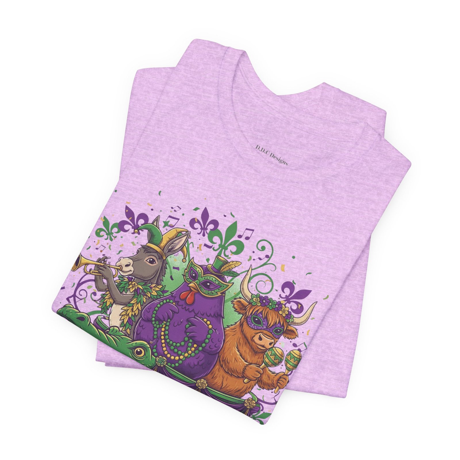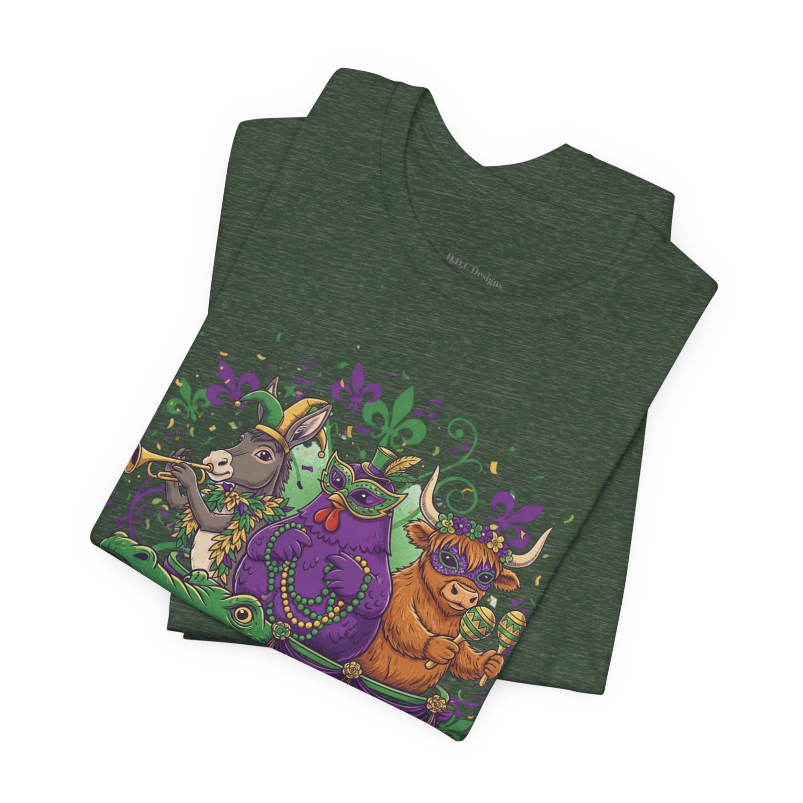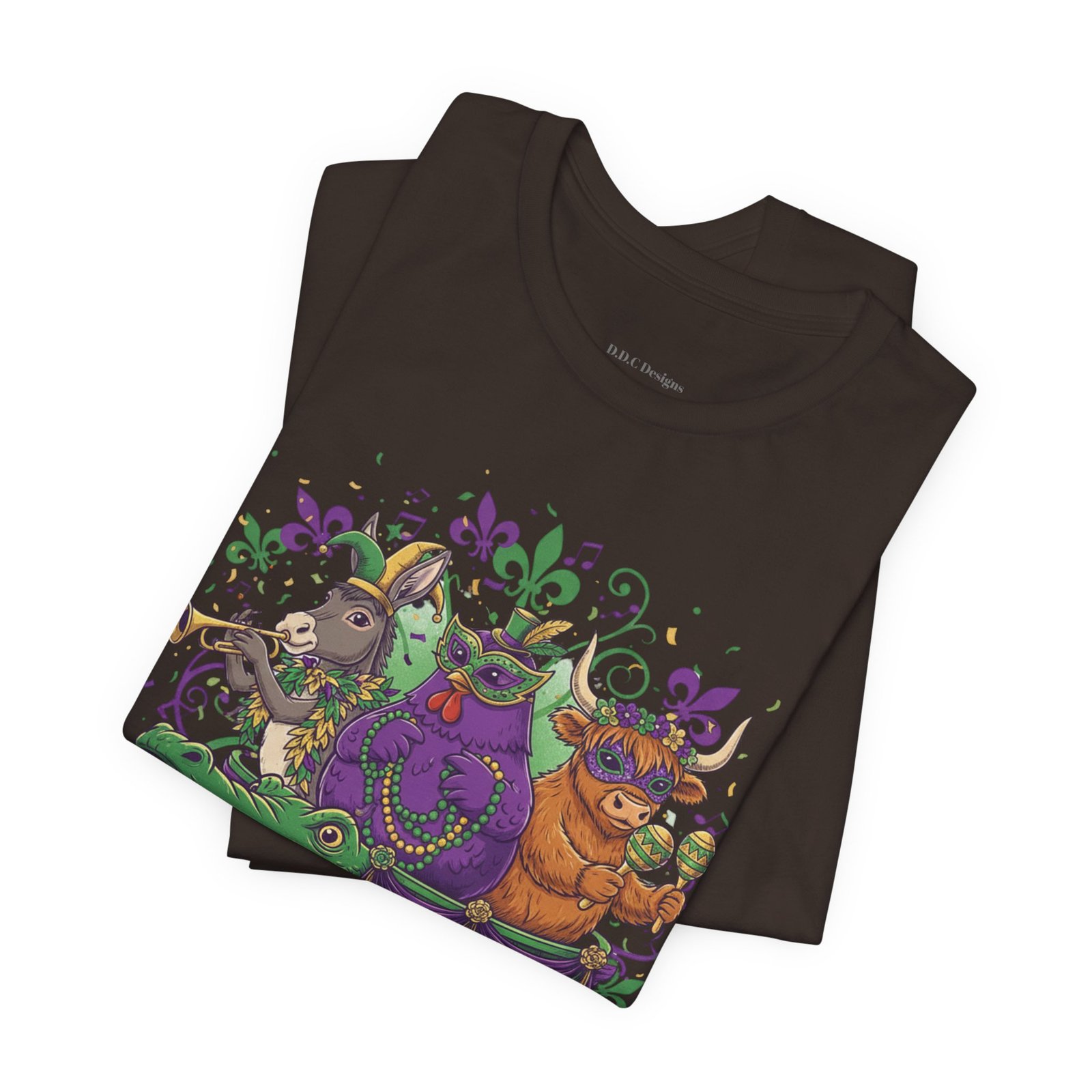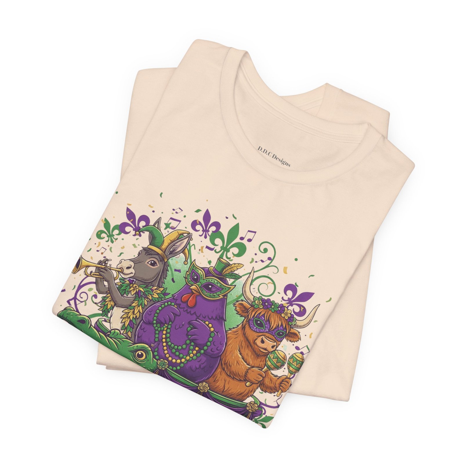 This lightweight crew tee channels the color and chaos of a French Quarter parade. Hand-illustrated characters—a maraca-shaking highland cow, a regal purple owl, a jaunty donkey, and a friendly alligator—feel like they’ve stepped right off Bourbon Street. Wear it on warm afternoons of wandering through brass bands and street performers, or fold it into casual evenings at a music-filled backyard barbecue. The soft Airlume cotton drapes easily, breathes during long parades, and layers under jackets for cooler nights. It fits like a lived-in favorite from the first wear and keeps its shape thanks to thoughtful tailoring details. For those who chase music, mischief, and memory-making, this tee brings a little New Orleans whimsy to everyday life.
