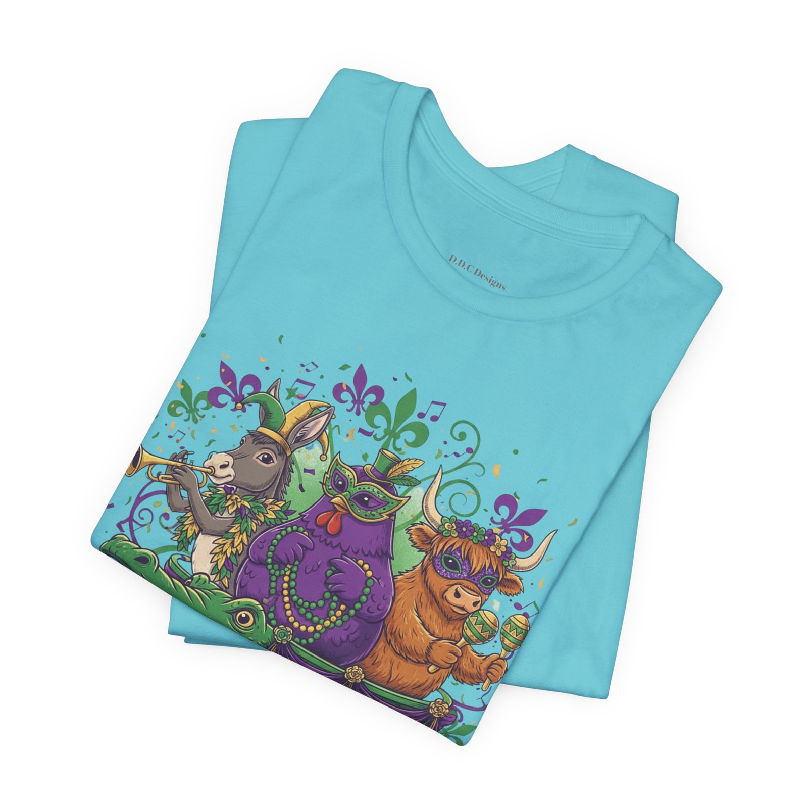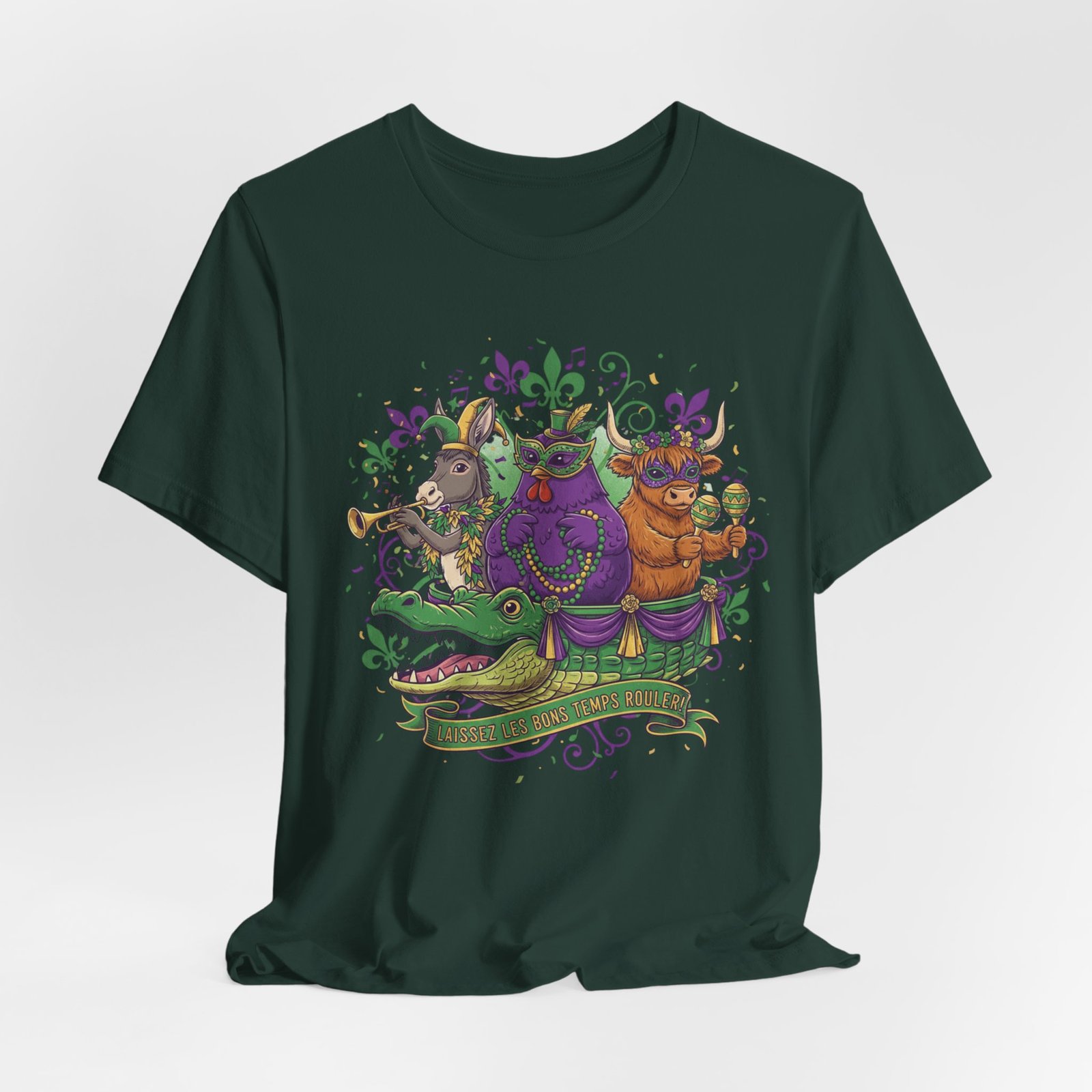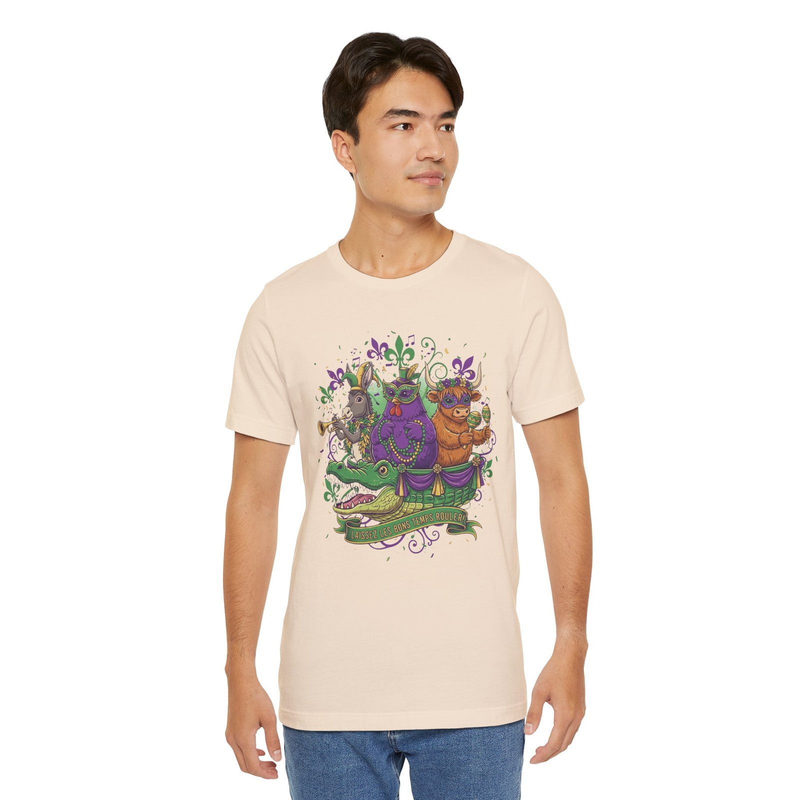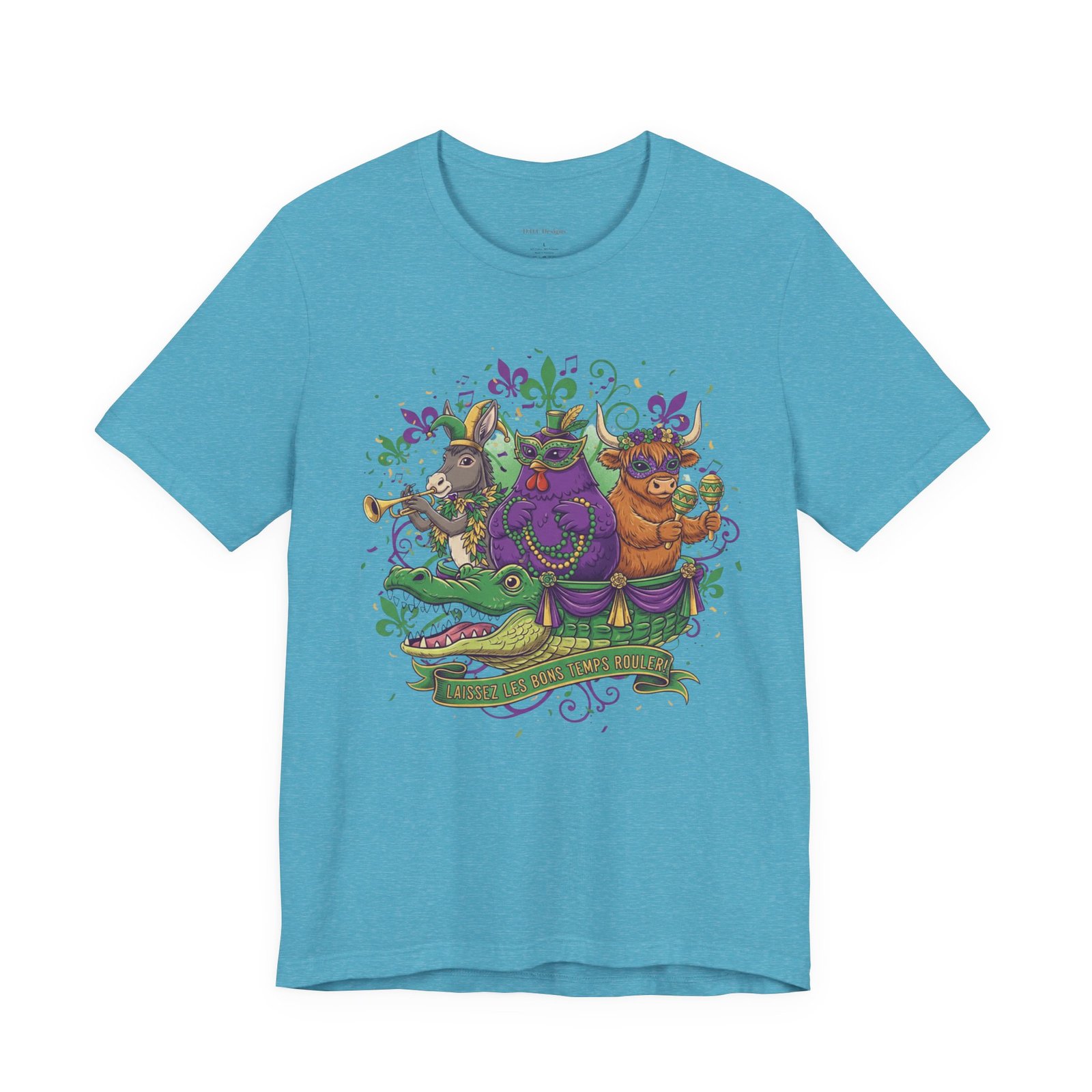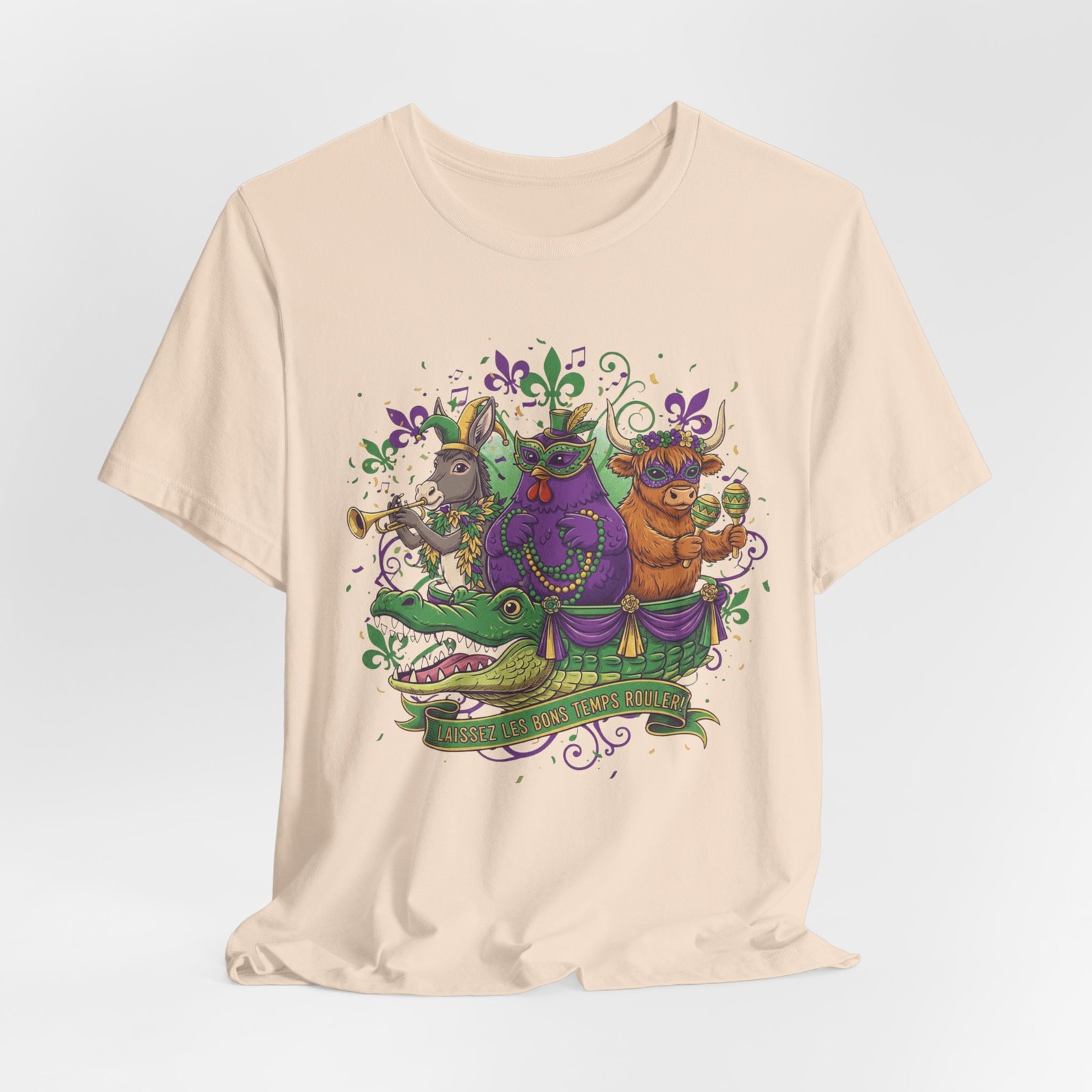 This lightweight crew tee channels the color and chaos of a French Quarter parade. Hand-illustrated characters—a maraca-shaking highland cow, a regal purple owl, a jaunty donkey, and a friendly alligator—feel like they’ve stepped right off Bourbon Street. Wear it on warm afternoons of wandering through brass bands and street performers, or fold it into casual evenings at a music-filled backyard barbecue. The soft Airlume cotton drapes easily, breathes during long parades, and layers under jackets for cooler nights. It fits like a lived-in favorite from the first wear and keeps its shape thanks to thoughtful tailoring details. For those who chase music, mischief, and memory-making, this tee brings a little New Orleans whimsy to everyday life.