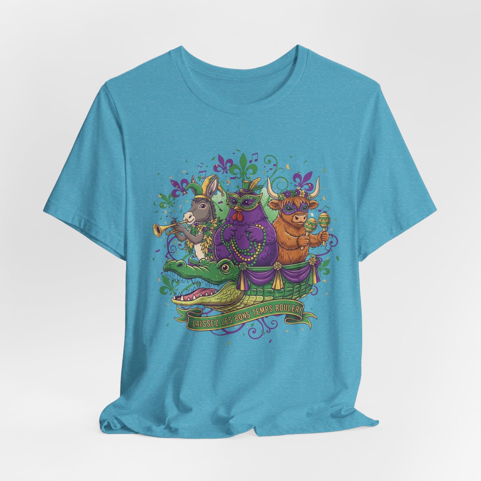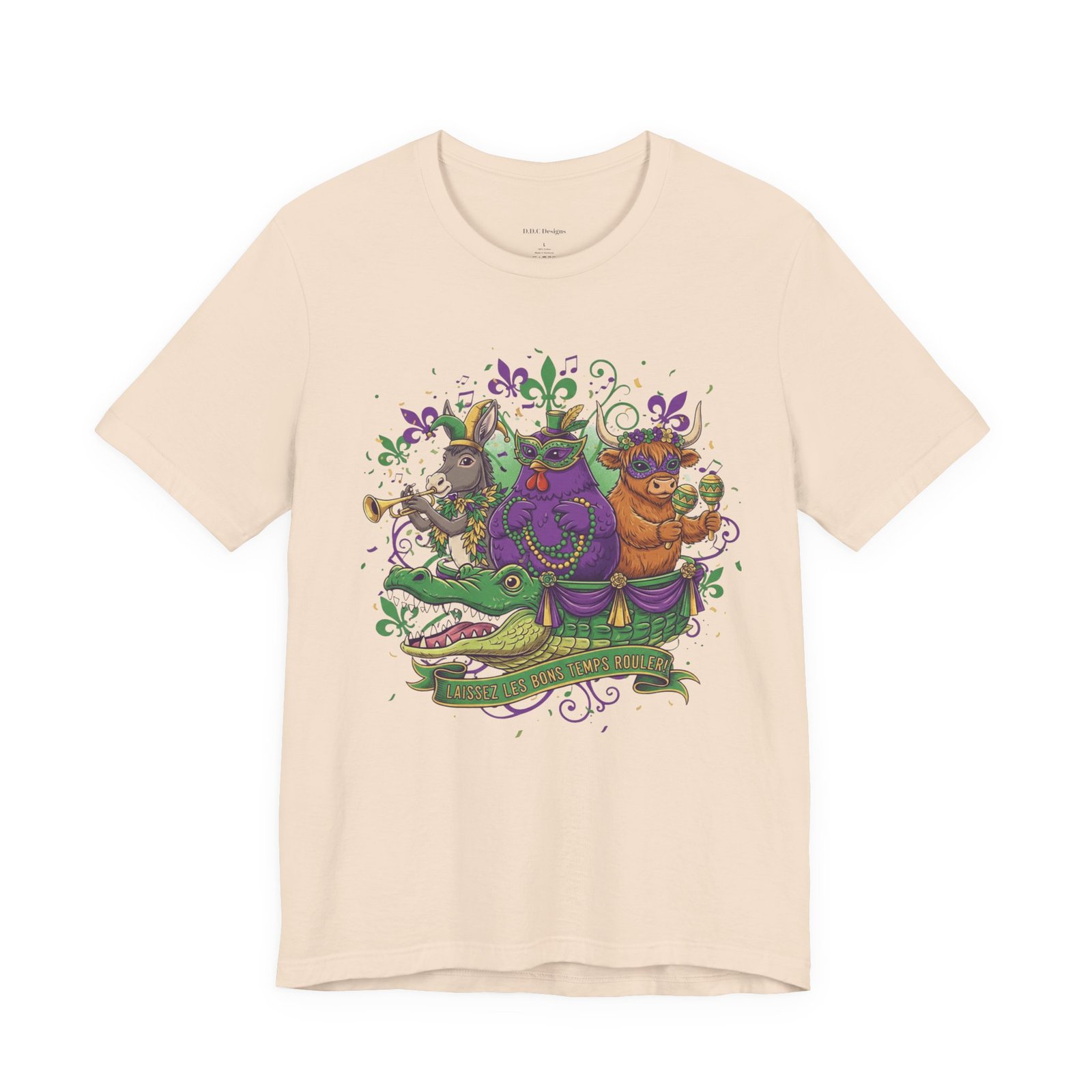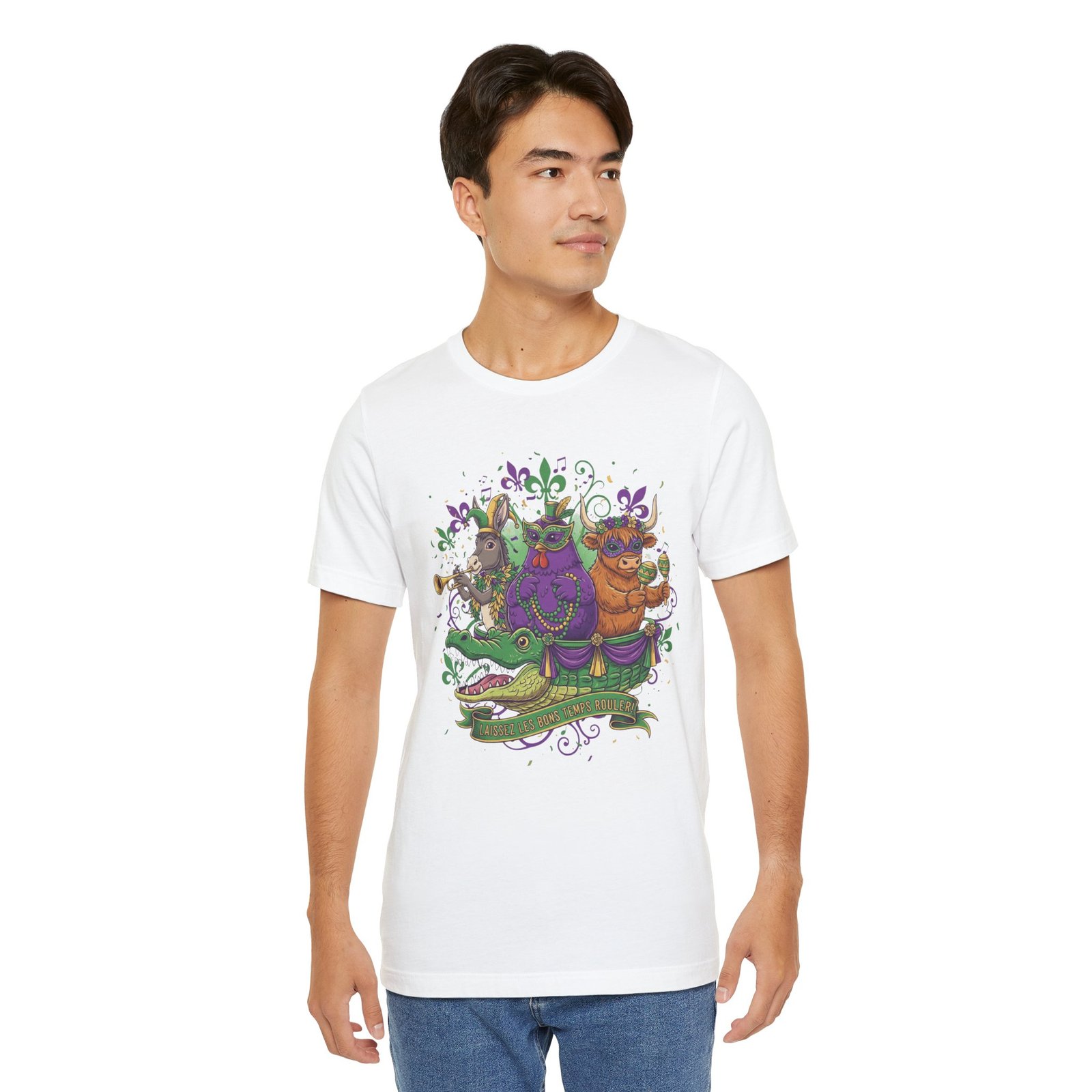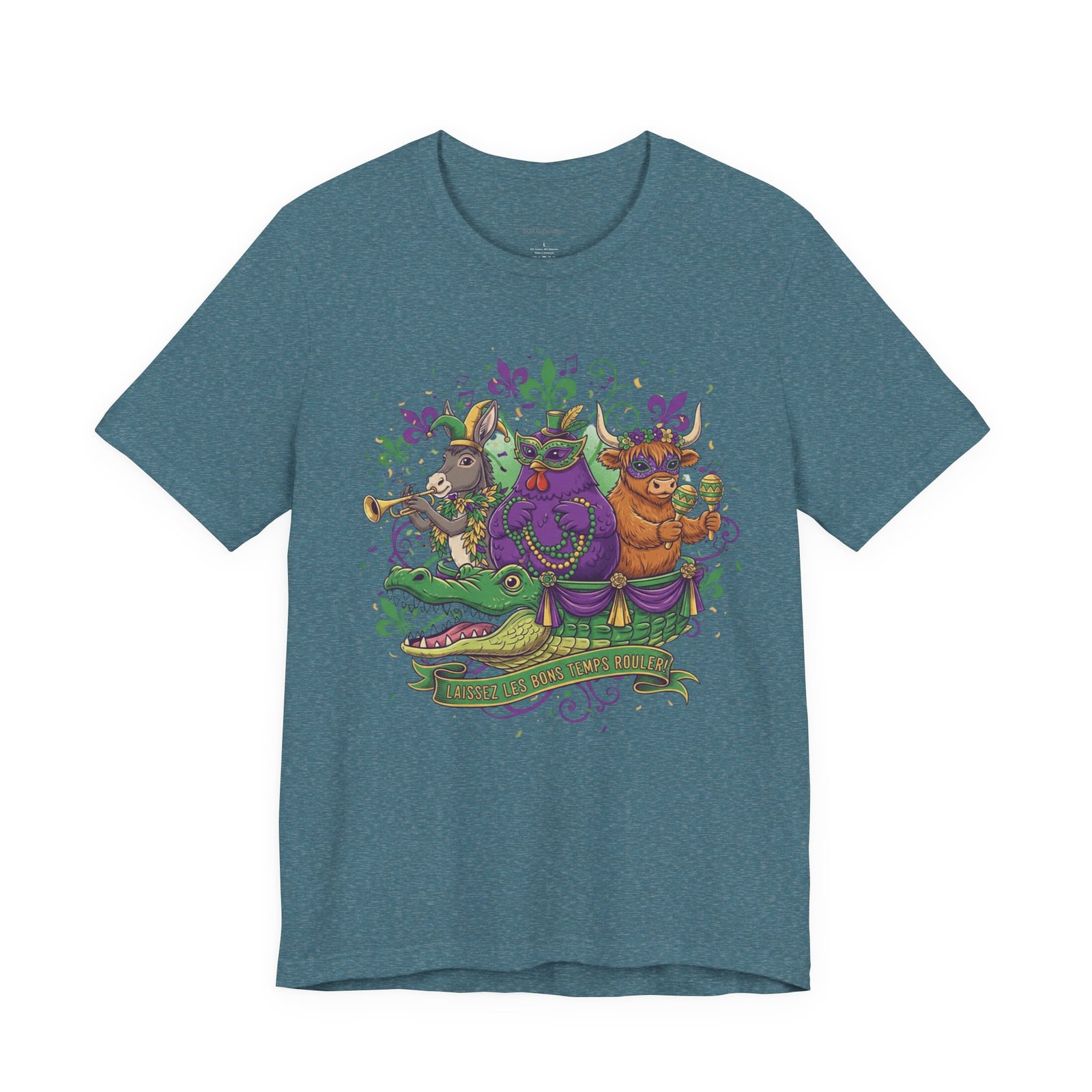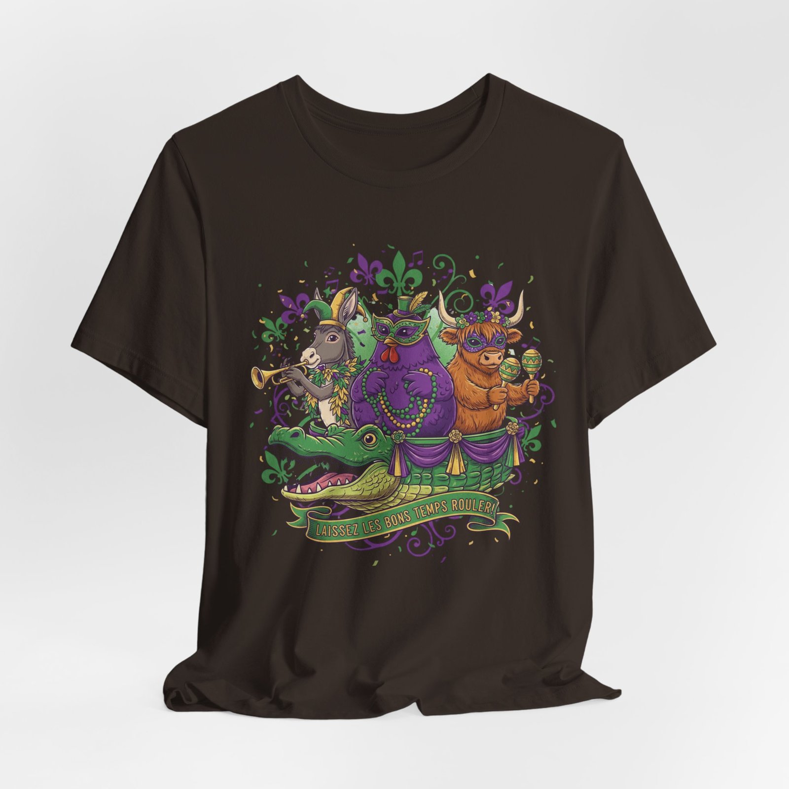This lightweight crew tee channels the color and chaos of a French Quarter parade. Hand-illustrated characters—a maraca-shaking highland cow, a regal purple owl, a jaunty donkey, and a friendly alligator—feel like they’ve stepped right off Bourbon Street. Wear it on warm afternoons of wandering through brass bands and street performers, or fold it into casual evenings at a music-filled backyard barbecue. The soft Airlume cotton drapes easily, breathes during long parades, and layers under jackets for cooler nights. It fits like a lived-in favorite from the first wear and keeps its shape thanks to thoughtful tailoring details. For those who chase music, mischief, and memory-making, this tee brings a little New Orleans whimsy to everyday life.