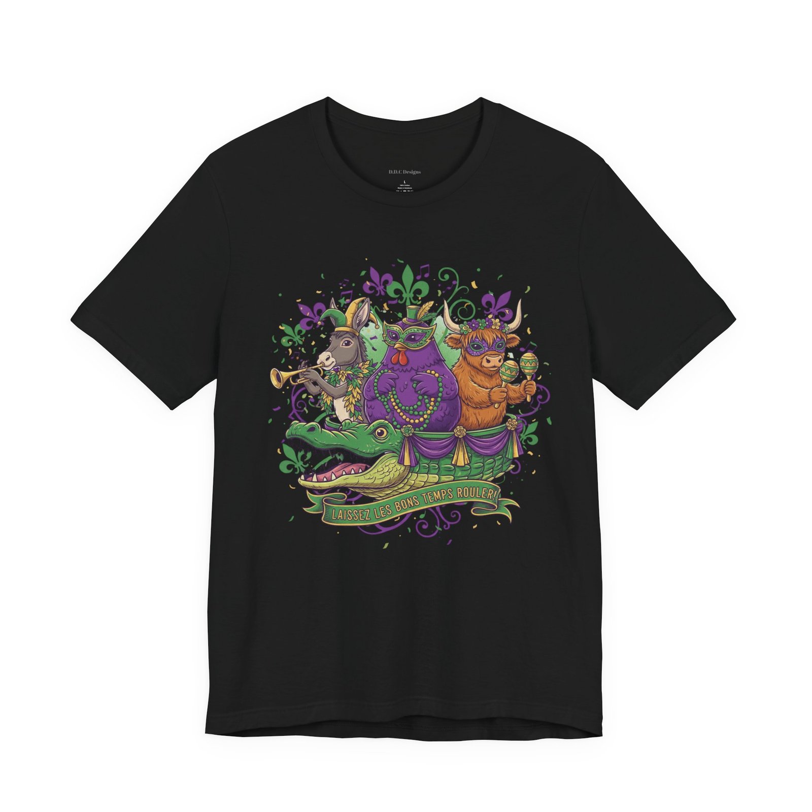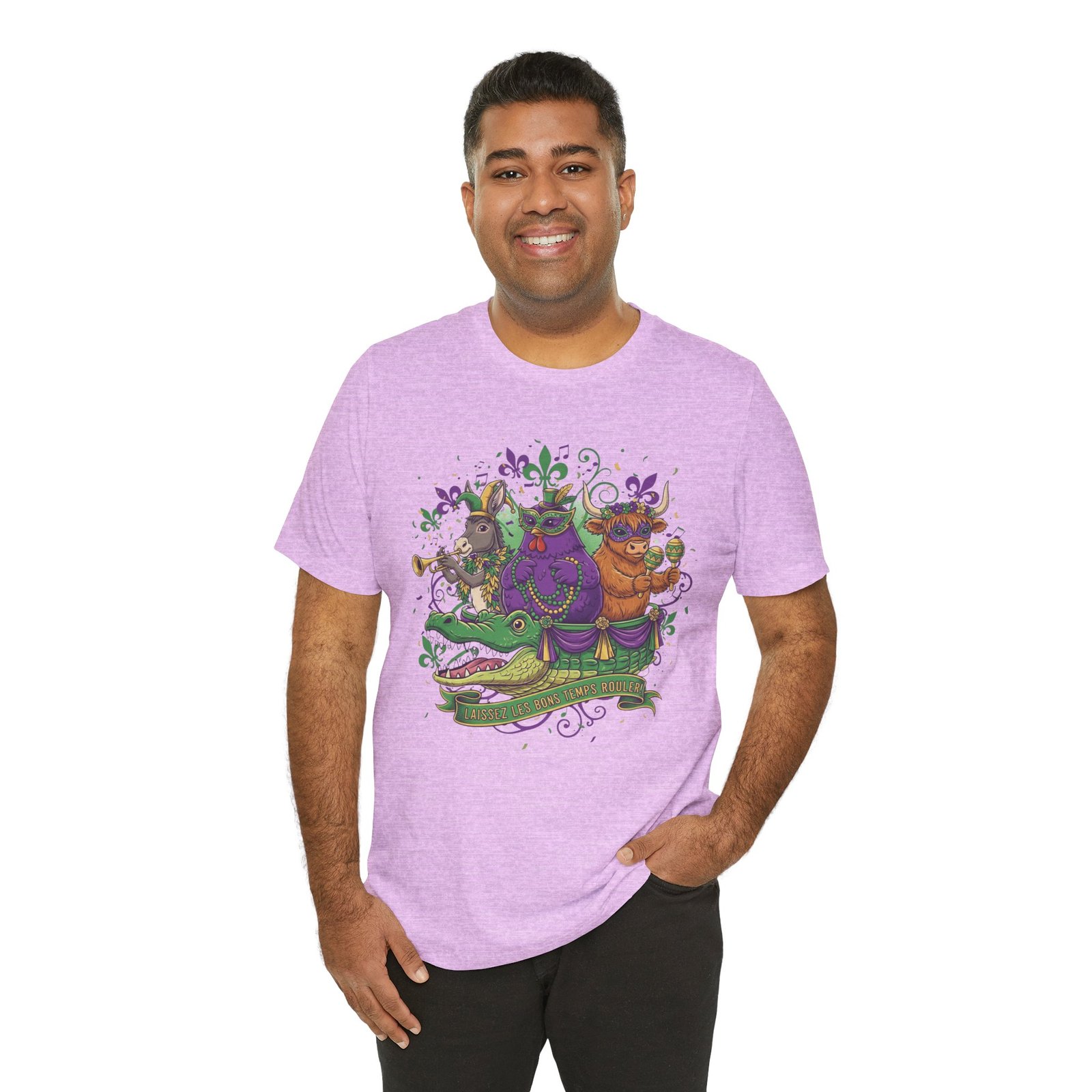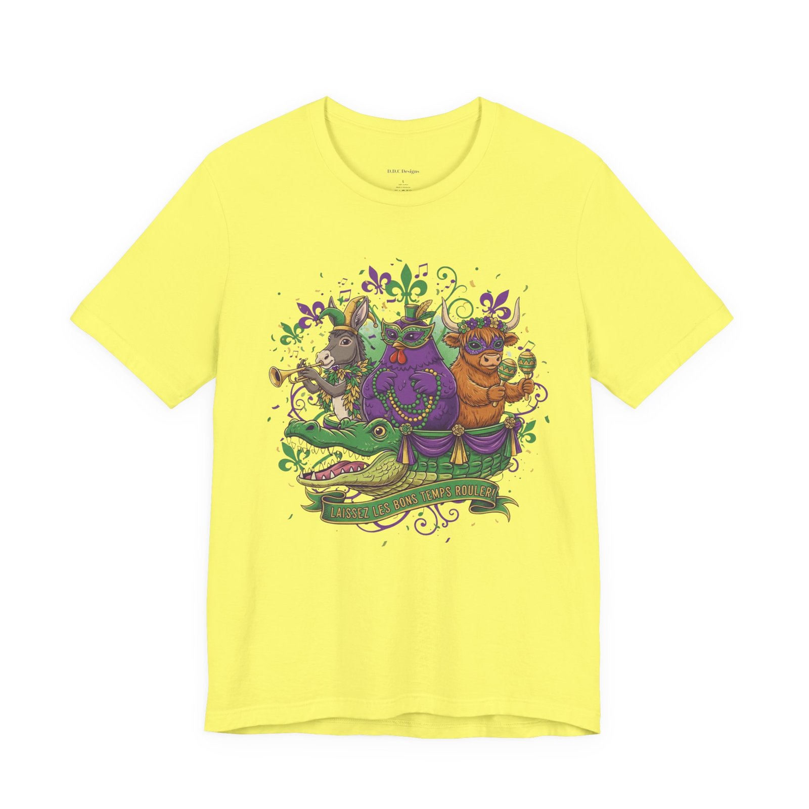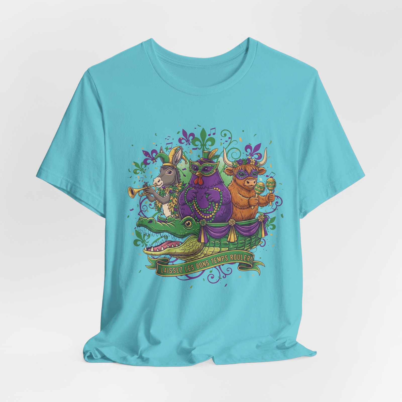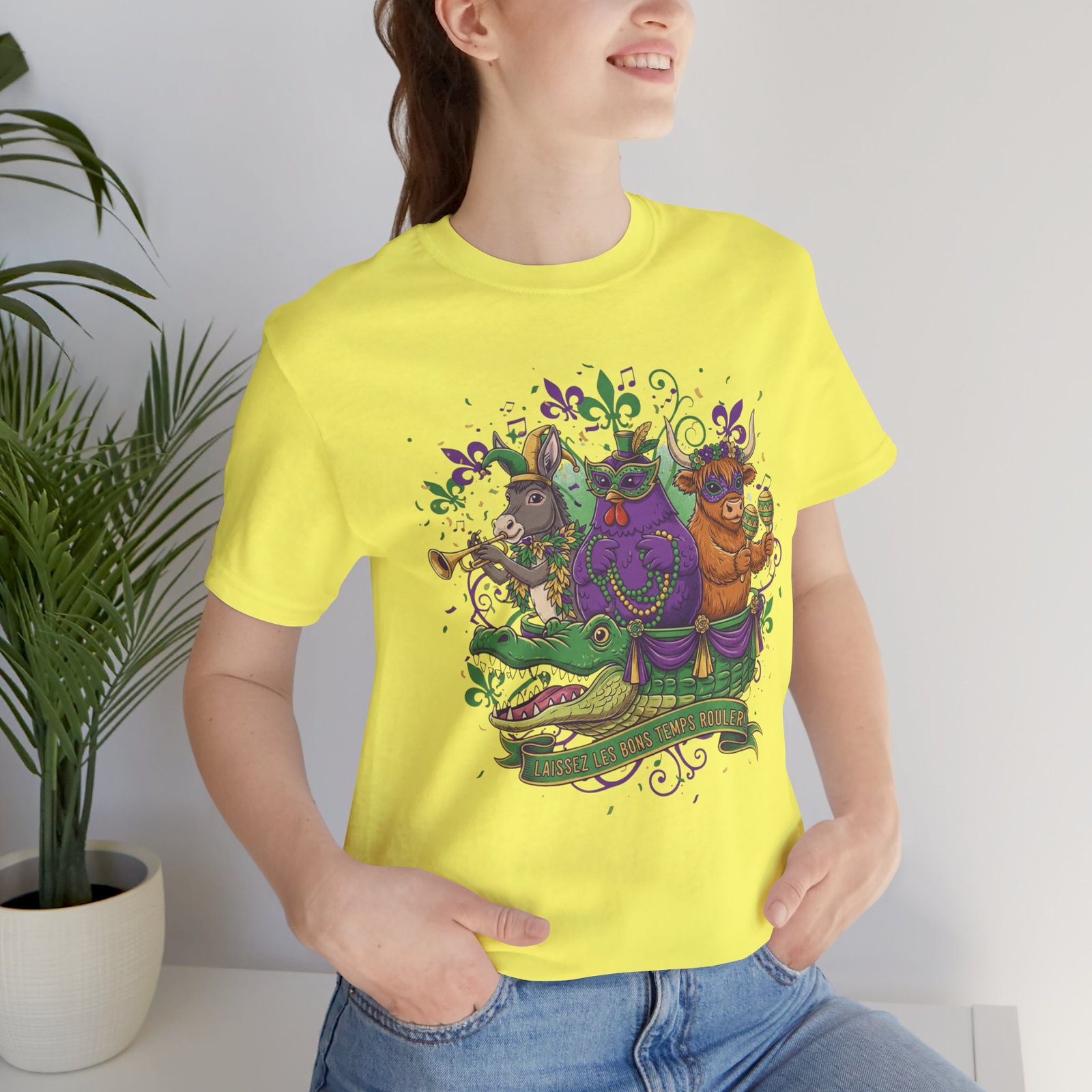 This lightweight crew tee channels the color and chaos of a French Quarter parade. Hand-illustrated characters—a maraca-shaking highland cow, a regal purple owl, a jaunty donkey, and a friendly alligator—feel like they’ve stepped right off Bourbon Street. Wear it on warm afternoons of wandering through brass bands and street performers, or fold it into casual evenings at a music-filled backyard barbecue. The soft Airlume cotton drapes easily, breathes during long parades, and layers under jackets for cooler nights. It fits like a lived-in favorite from the first wear and keeps its shape thanks to thoughtful tailoring details. For those who chase music, mischief, and memory-making, this tee brings a little New Orleans whimsy to everyday life.