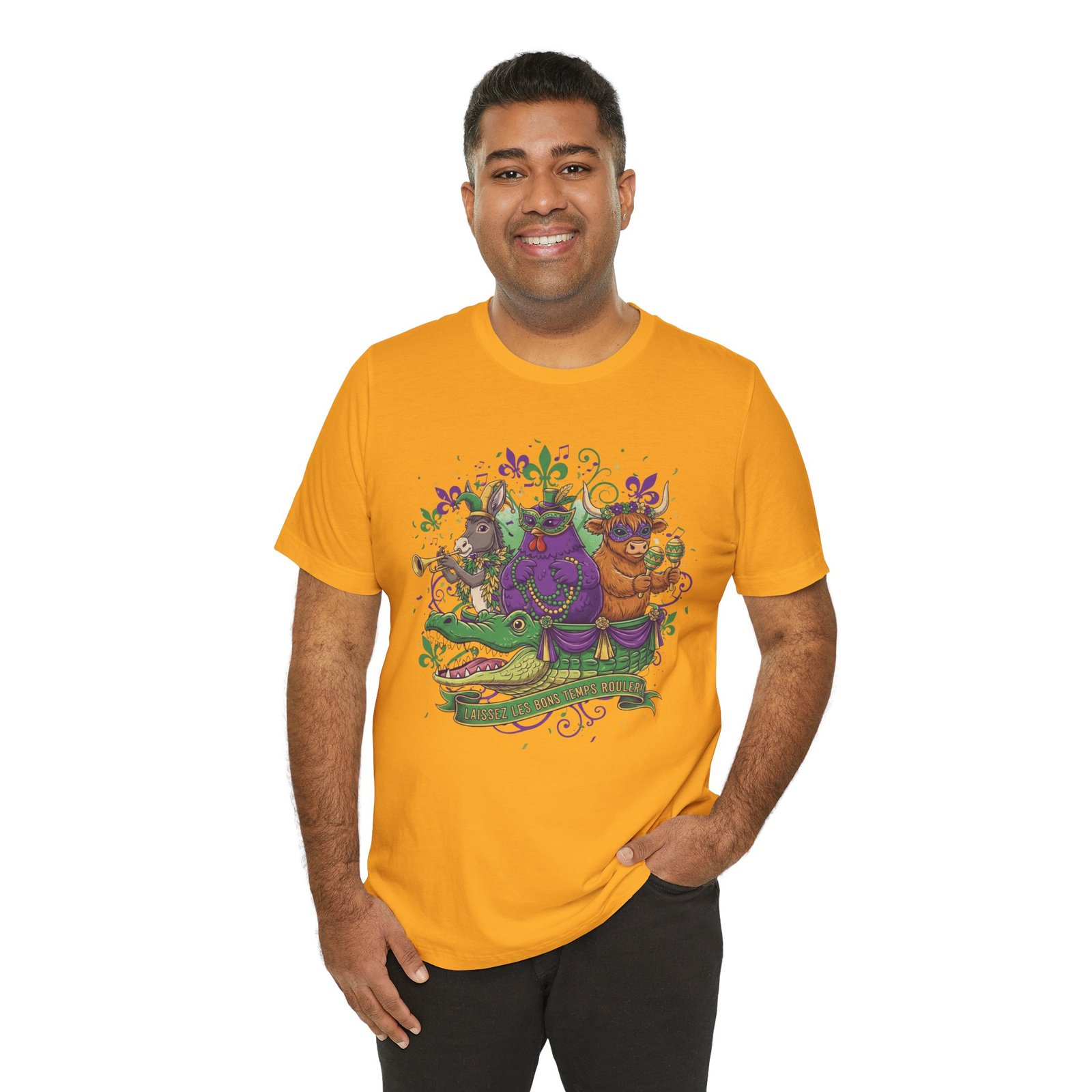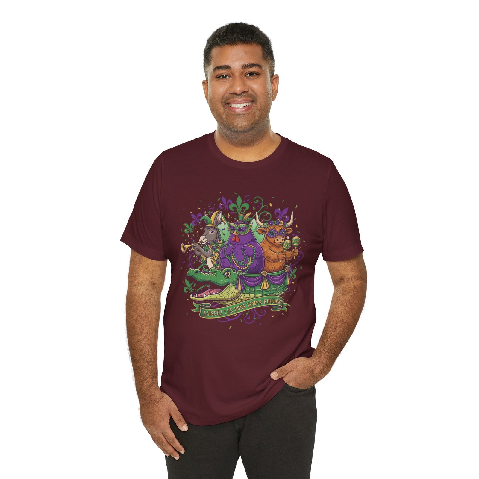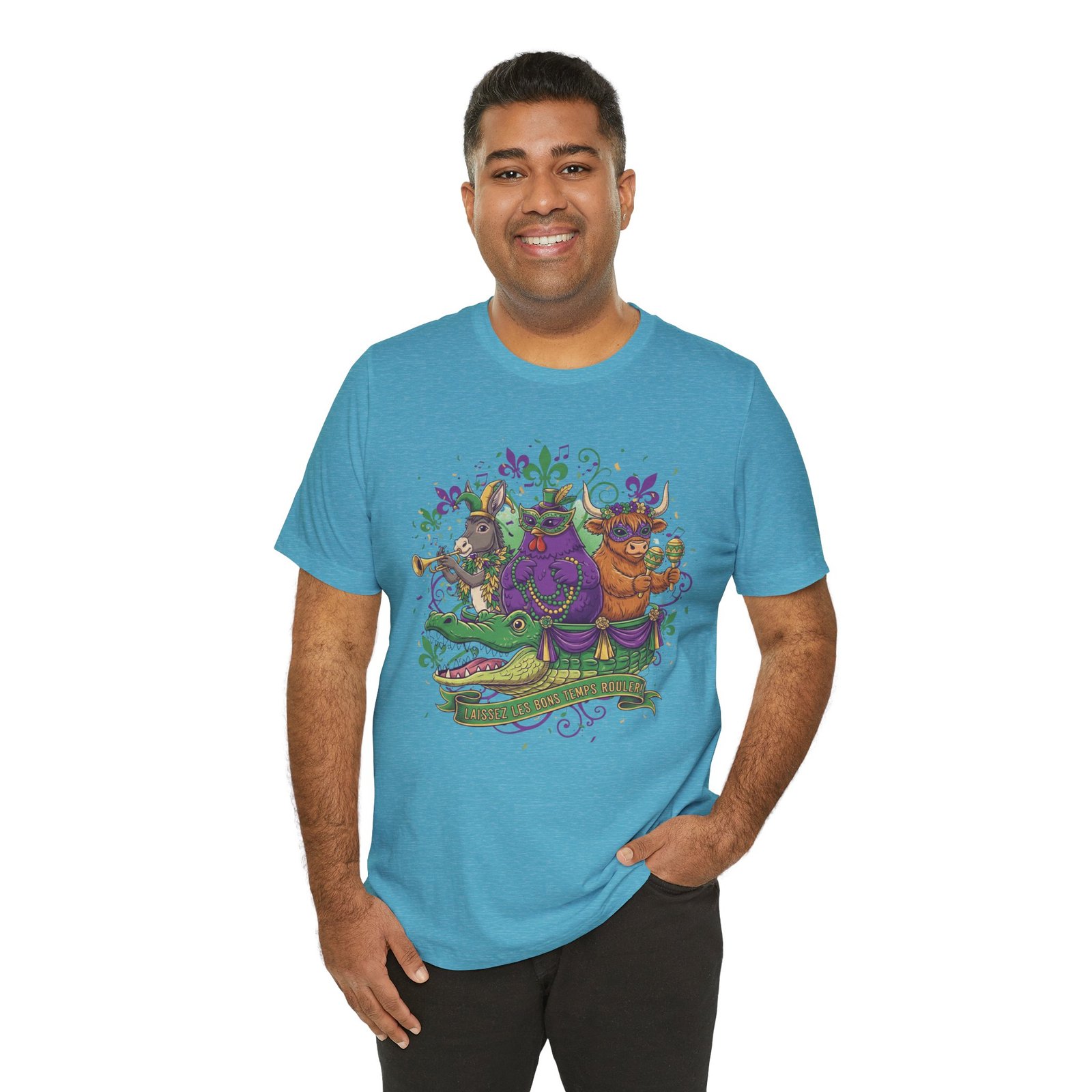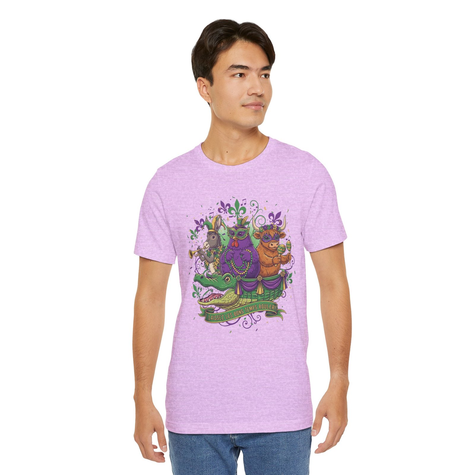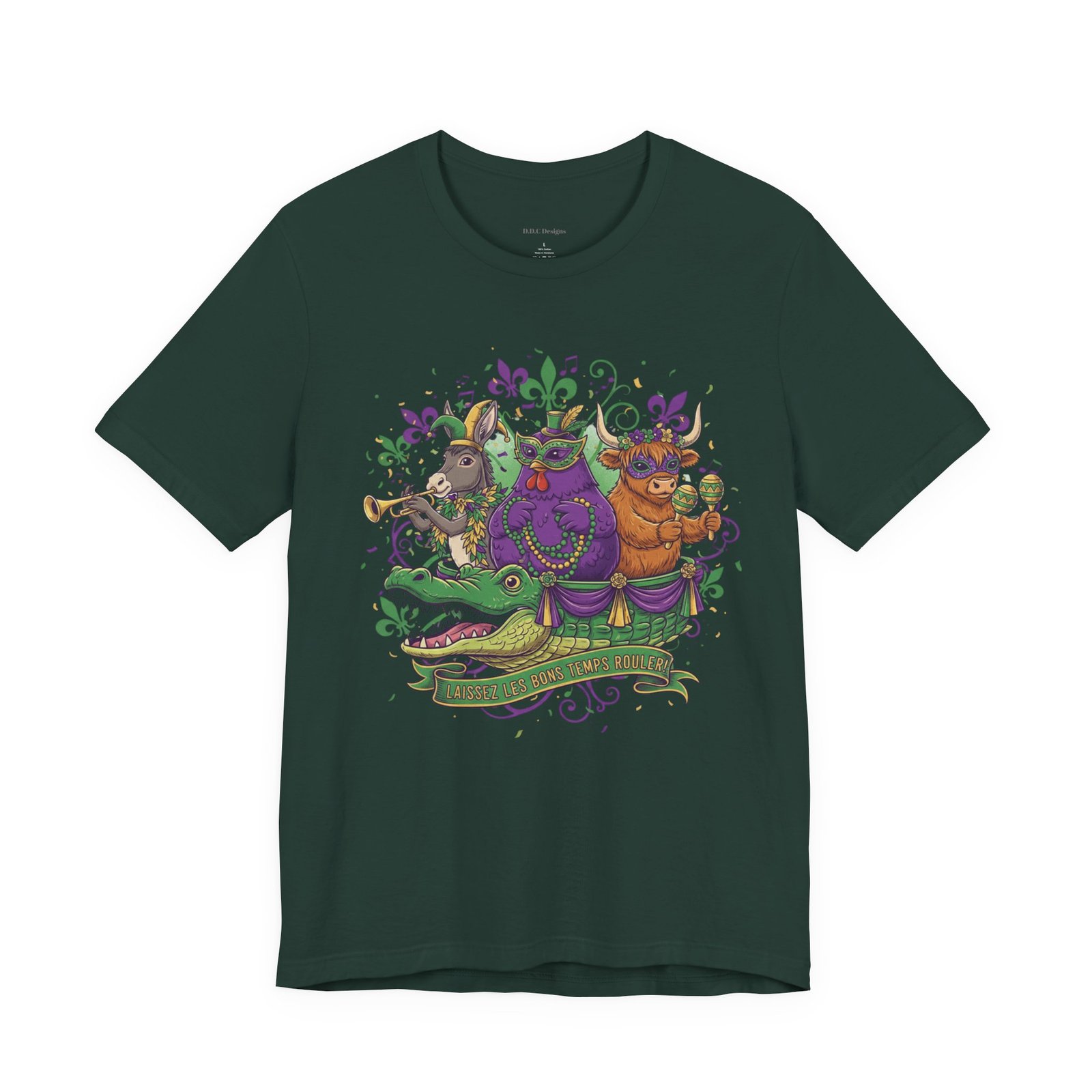 This lightweight crew tee channels the color and chaos of a French Quarter parade. Hand-illustrated characters—a maraca-shaking highland cow, a regal purple owl, a jaunty donkey, and a friendly alligator—feel like they’ve stepped right off Bourbon Street. Wear it on warm afternoons of wandering through brass bands and street performers, or fold it into casual evenings at a music-filled backyard barbecue. The soft Airlume cotton drapes easily, breathes during long parades, and layers under jackets for cooler nights. It fits like a lived-in favorite from the first wear and keeps its shape thanks to thoughtful tailoring details. For those who chase music, mischief, and memory-making, this tee brings a little New Orleans whimsy to everyday life.