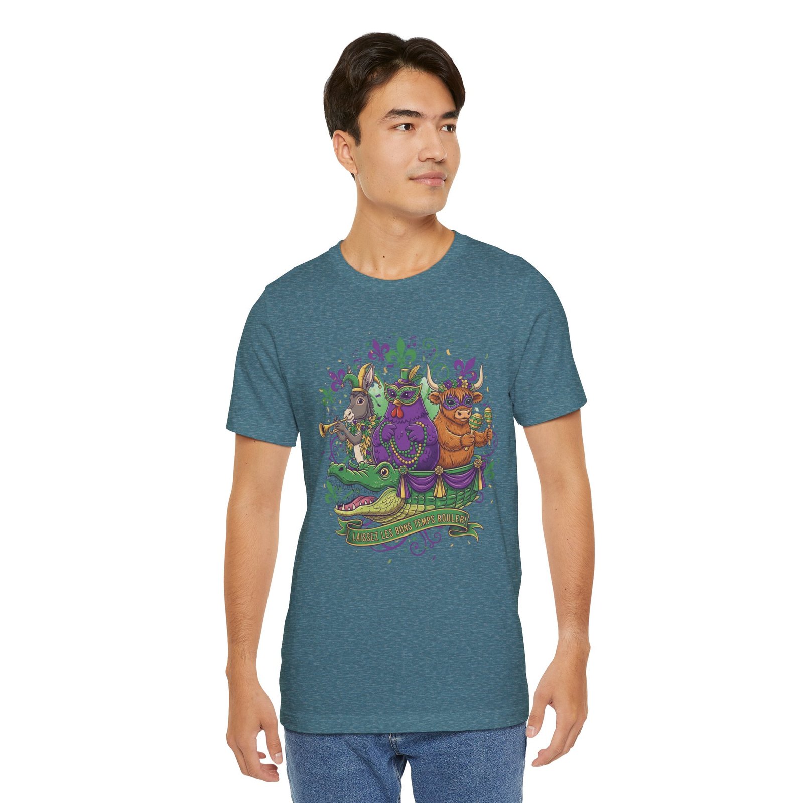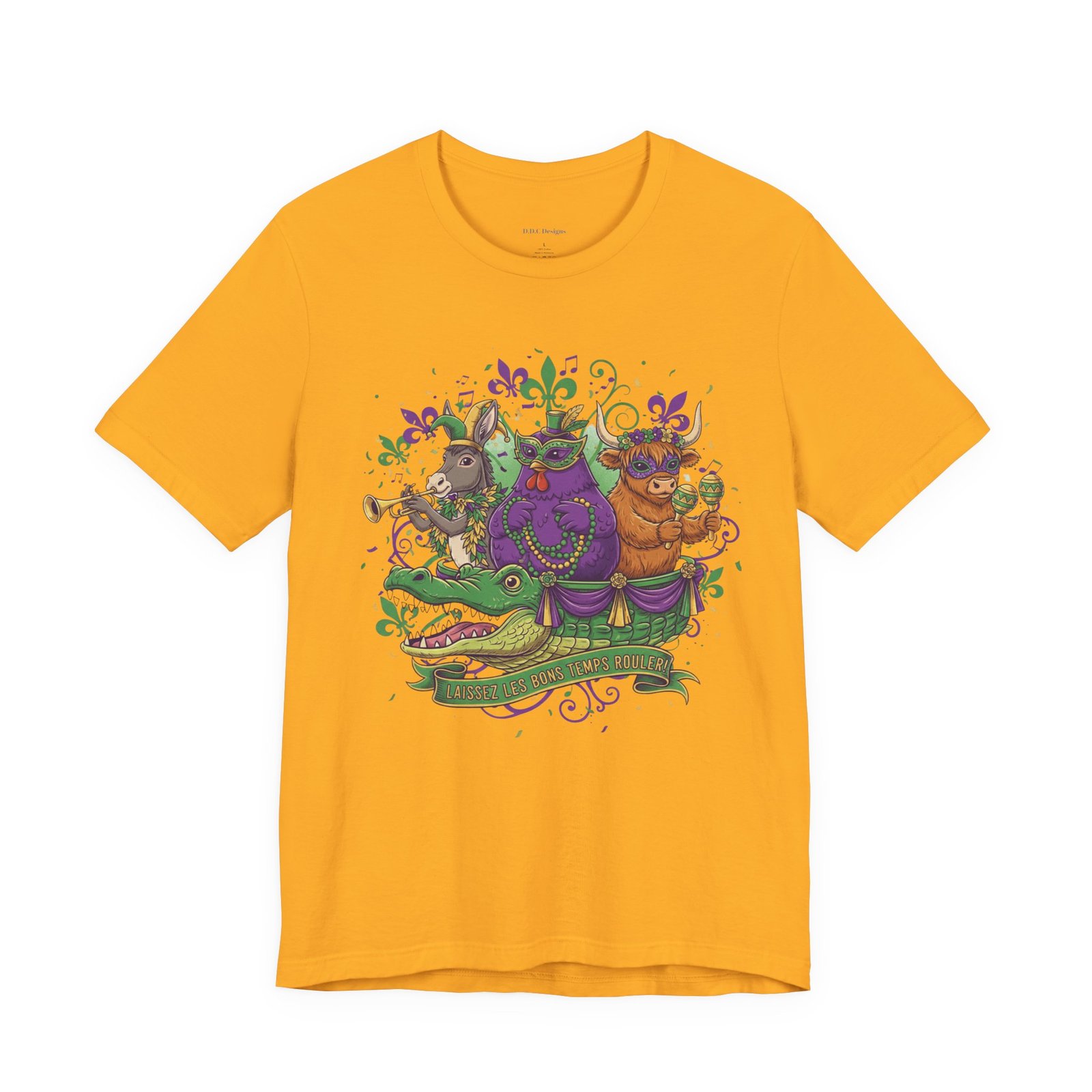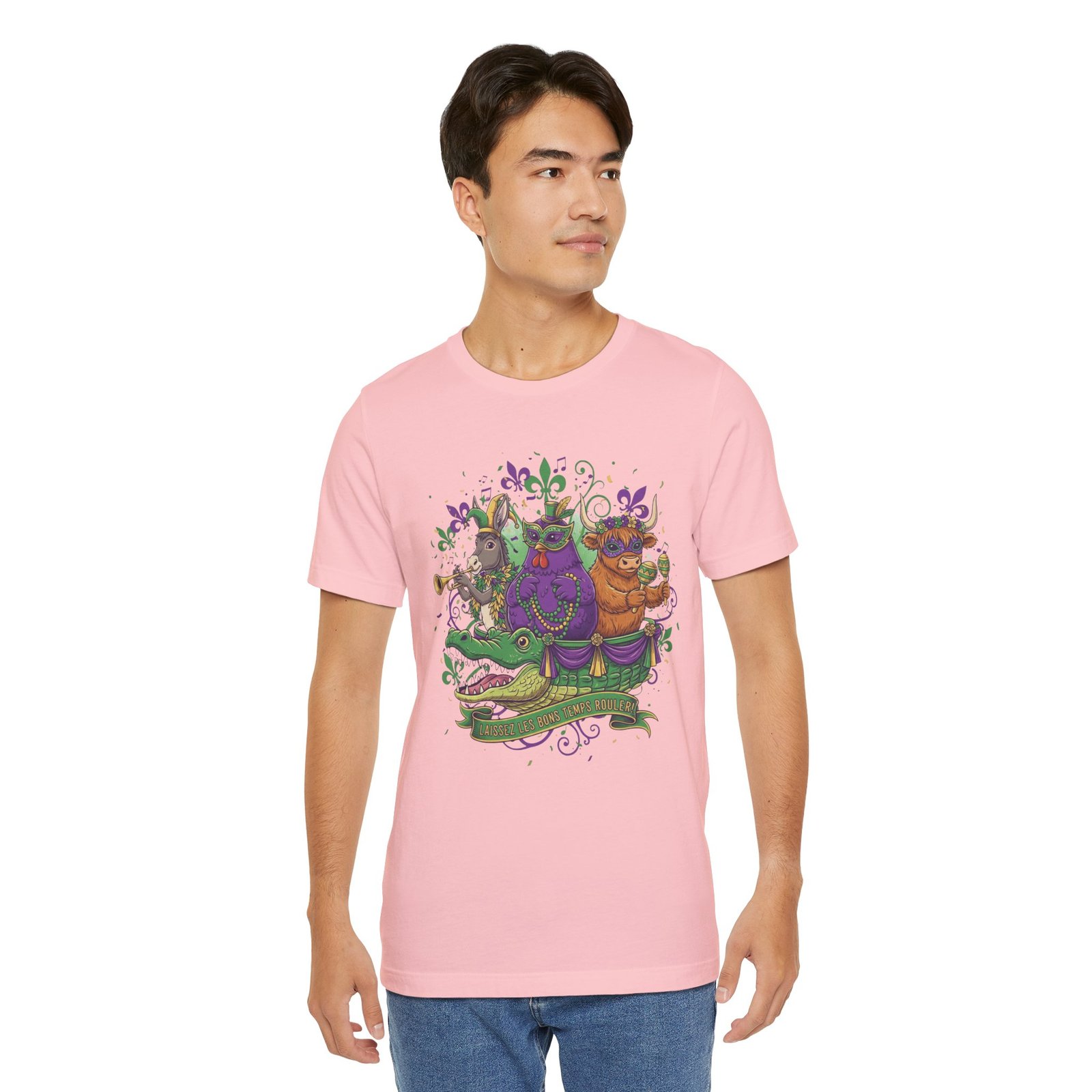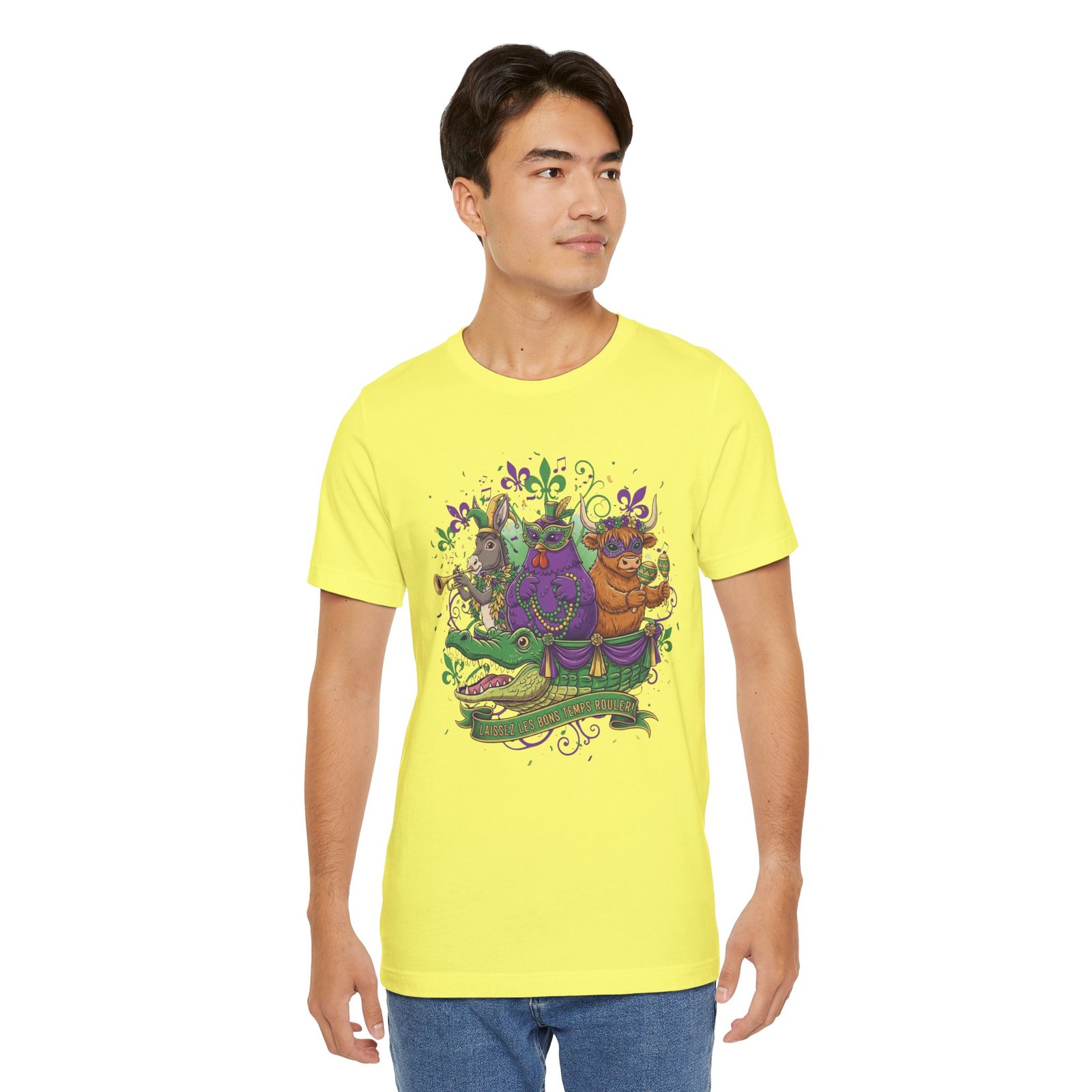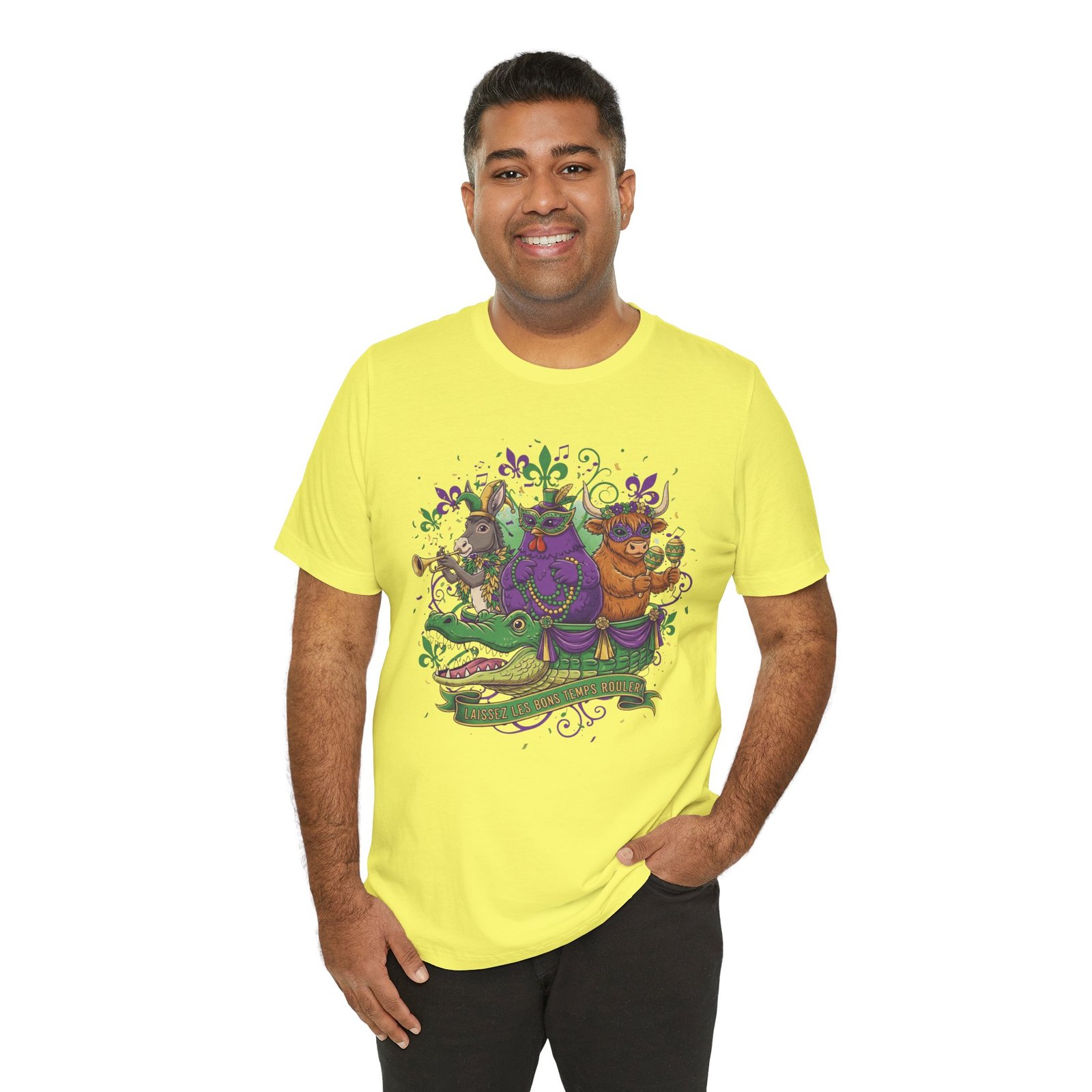 This lightweight crew tee channels the color and chaos of a French Quarter parade. Hand-illustrated characters—a maraca-shaking highland cow, a regal purple owl, a jaunty donkey, and a friendly alligator—feel like they’ve stepped right off Bourbon Street. Wear it on warm afternoons of wandering through brass bands and street performers, or fold it into casual evenings at a music-filled backyard barbecue. The soft Airlume cotton drapes easily, breathes during long parades, and layers under jackets for cooler nights. It fits like a lived-in favorite from the first wear and keeps its shape thanks to thoughtful tailoring details. For those who chase music, mischief, and memory-making, this tee brings a little New Orleans whimsy to everyday life.