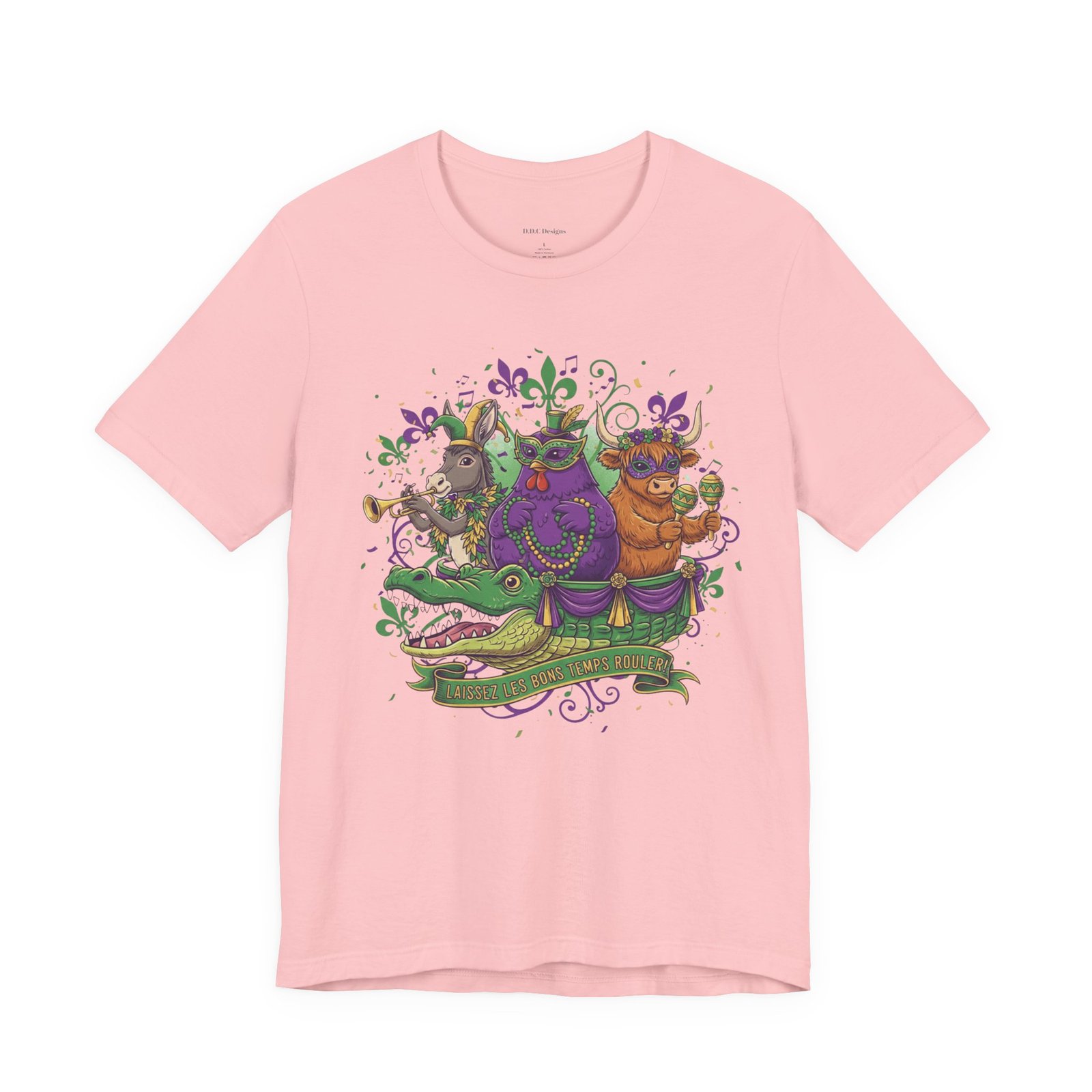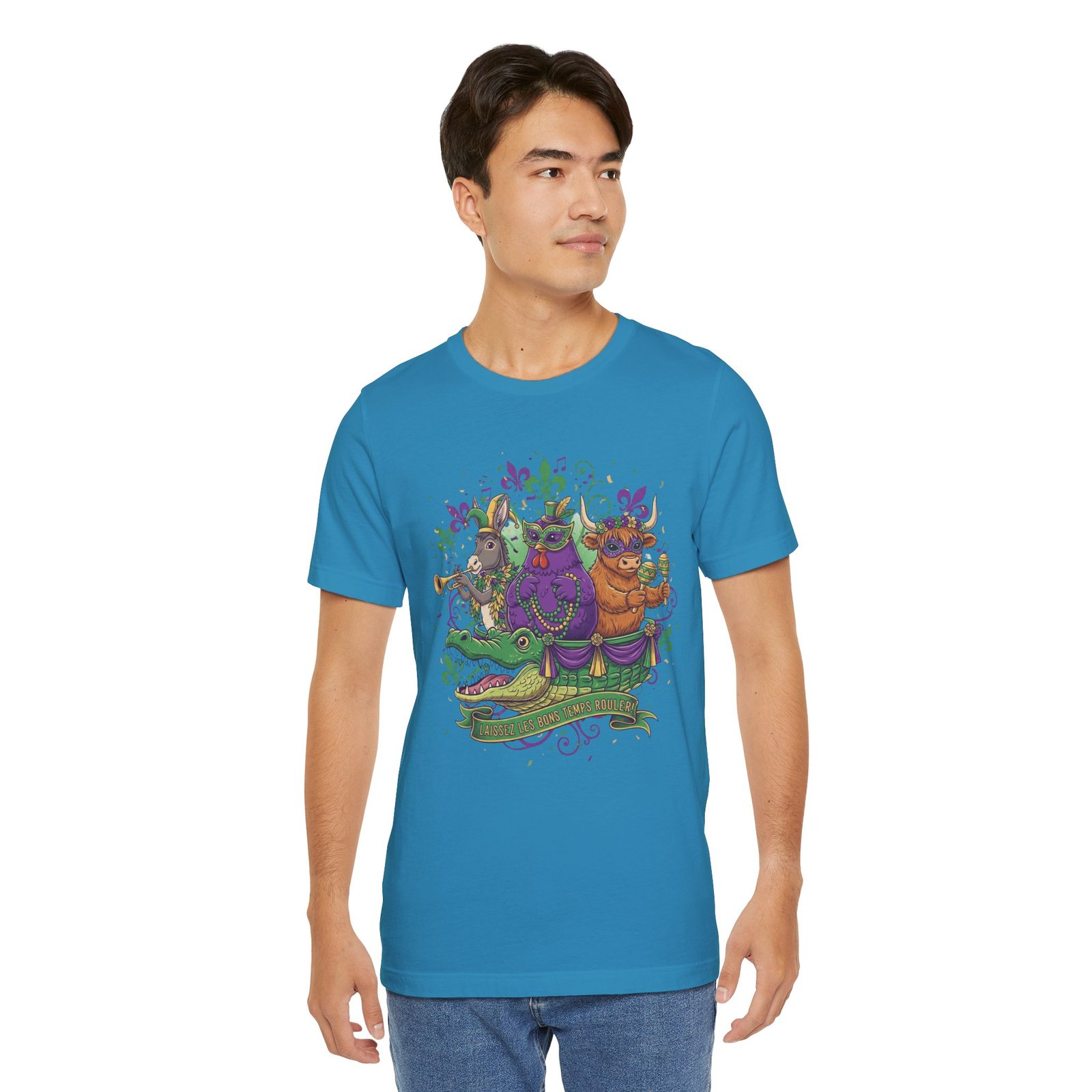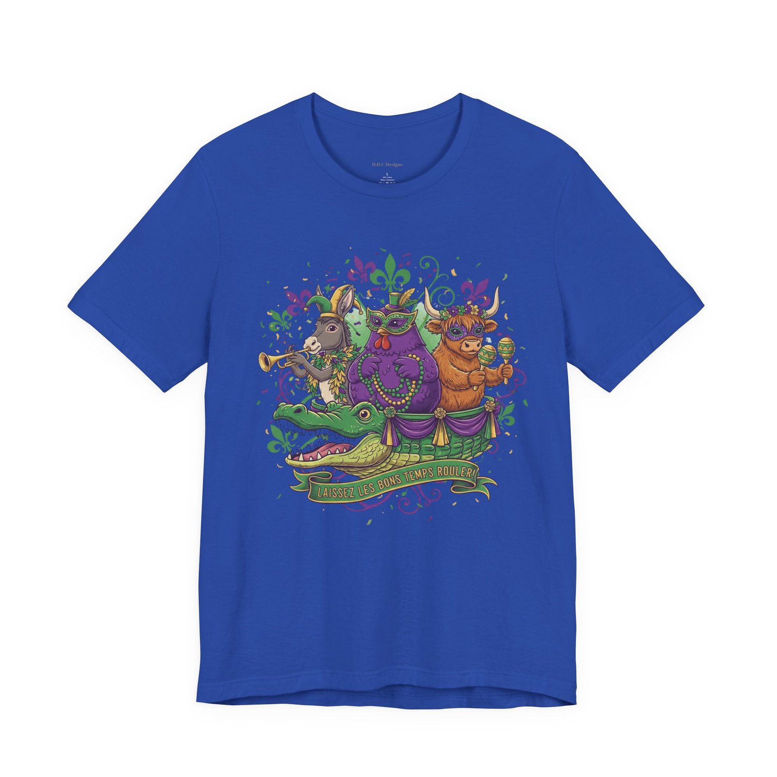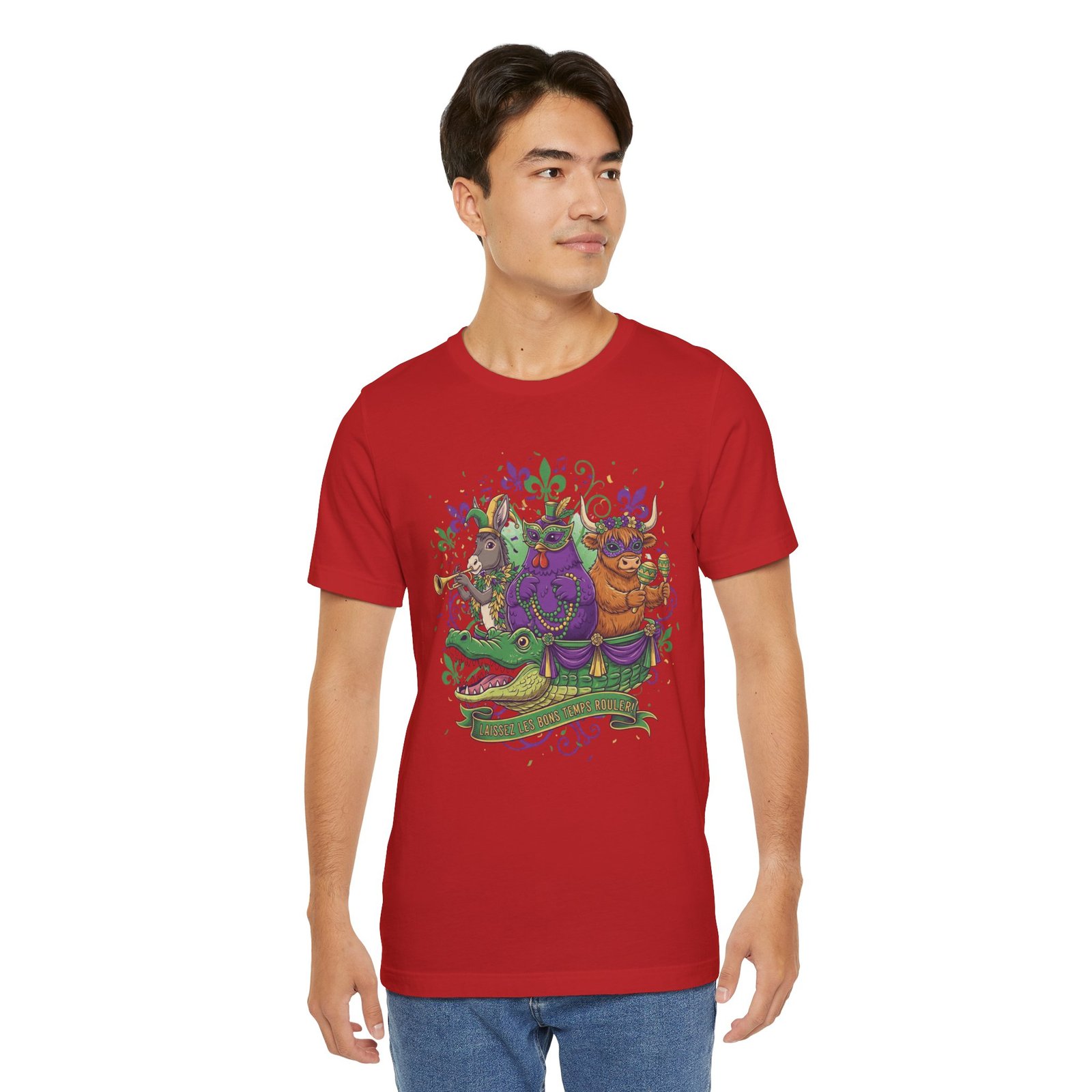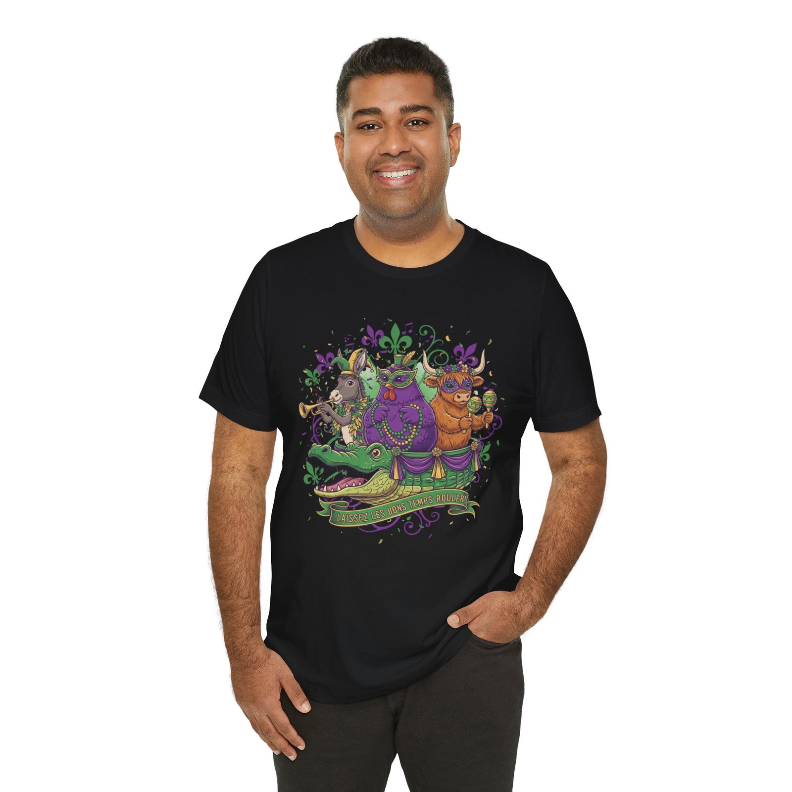 This lightweight crew tee channels the color and chaos of a French Quarter parade. Hand-illustrated characters—a maraca-shaking highland cow, a regal purple owl, a jaunty donkey, and a friendly alligator—feel like they’ve stepped right off Bourbon Street. Wear it on warm afternoons of wandering through brass bands and street performers, or fold it into casual evenings at a music-filled backyard barbecue. The soft Airlume cotton drapes easily, breathes during long parades, and layers under jackets for cooler nights. It fits like a lived-in favorite from the first wear and keeps its shape thanks to thoughtful tailoring details. For those who chase music, mischief, and memory-making, this tee brings a little New Orleans whimsy to everyday life.
