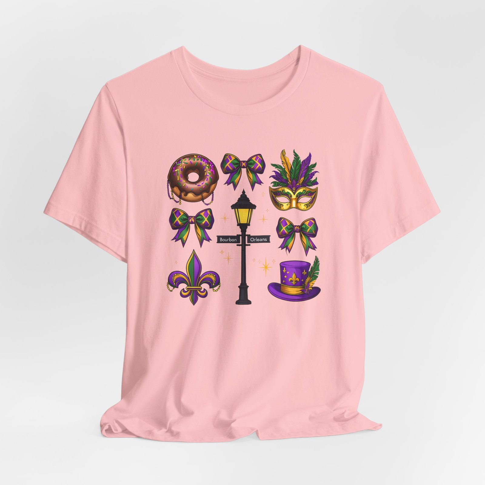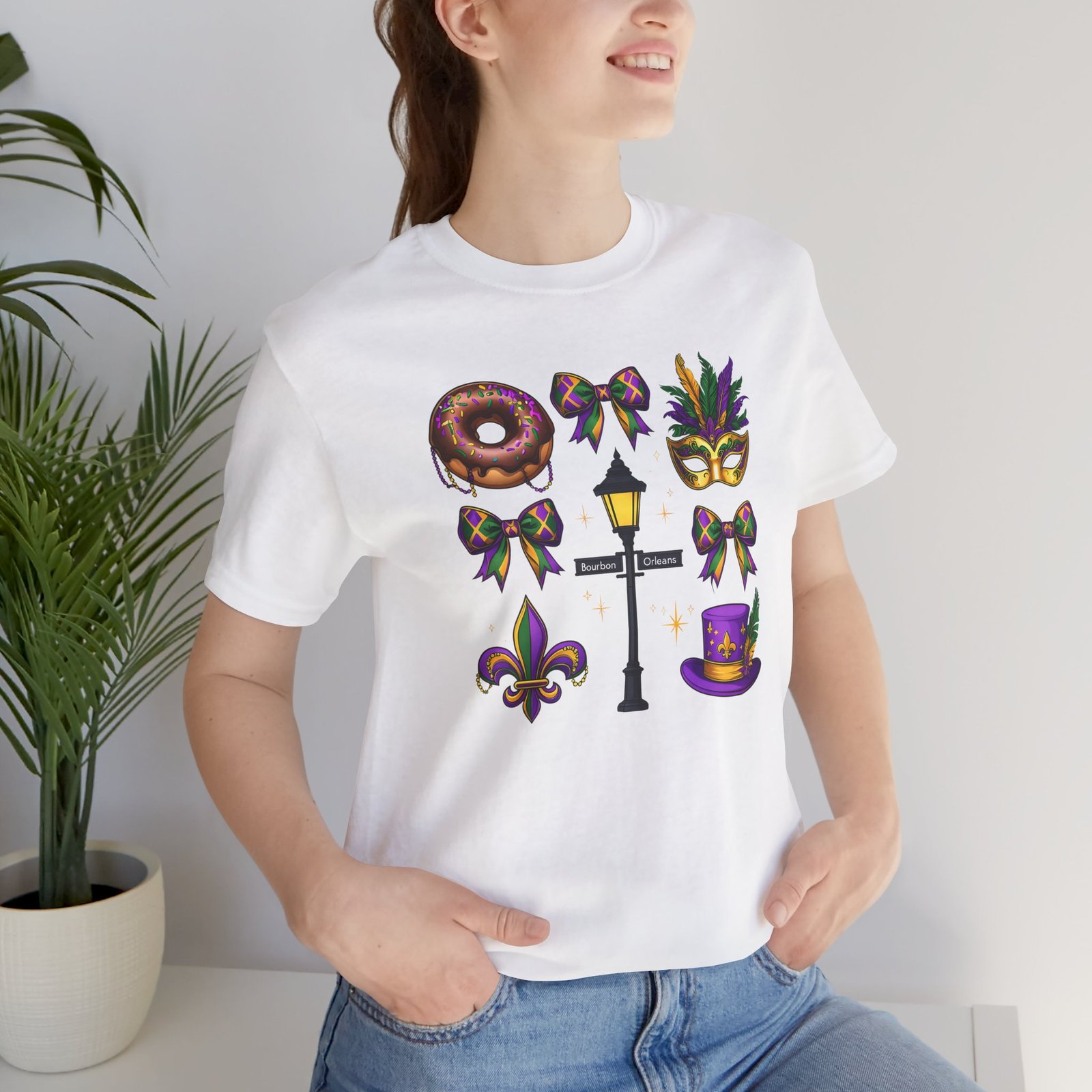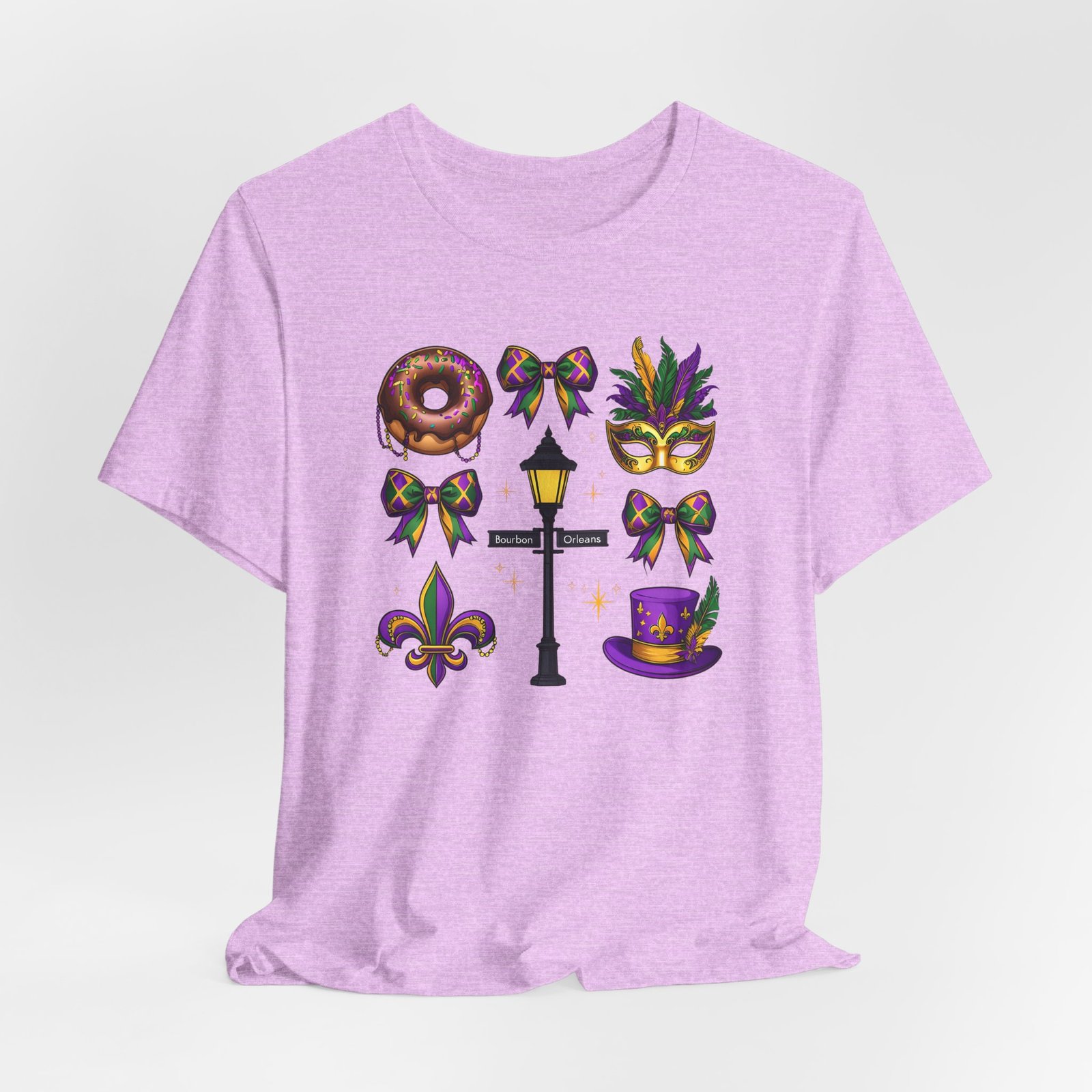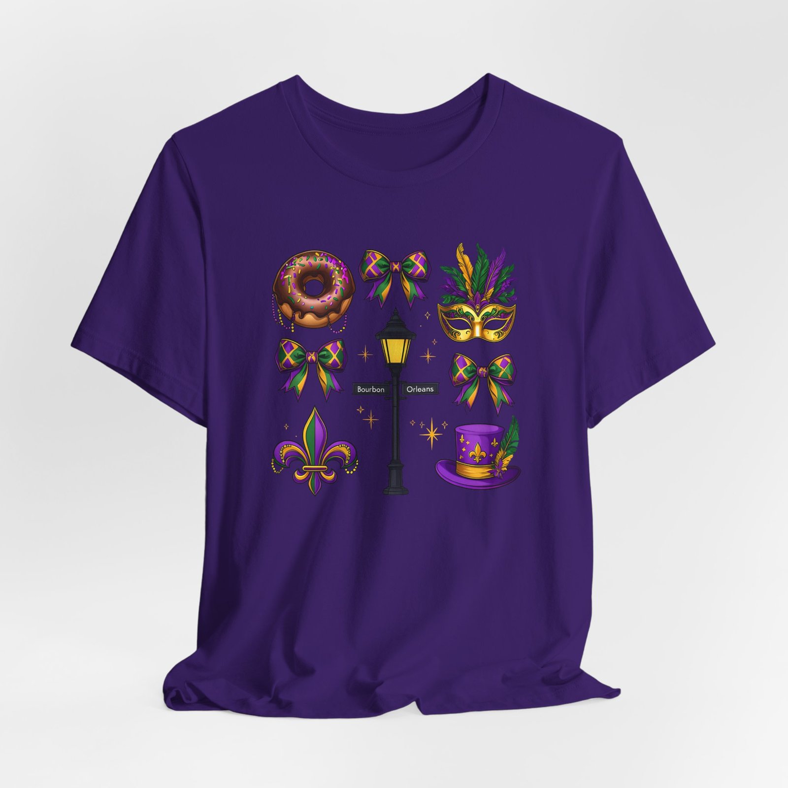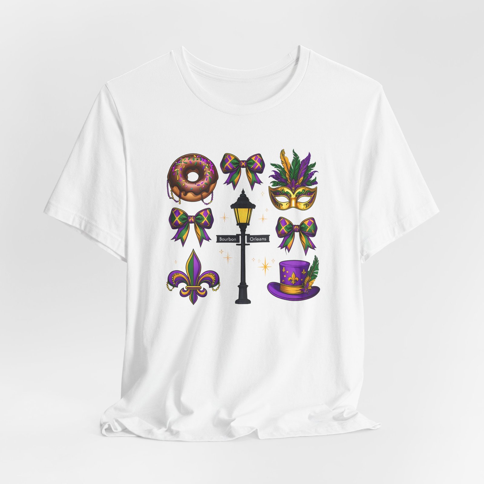Feel the thrum of Bourbon Street with this playful Mardi Gras tee. A curated grid of icons — a chocolate-frosted donut, a feathered top hat, a masquerade mask, a lamp post and fleur-de-lis — pops in purple, green and gold against crisp white. It’s lightweight and breathable, so you can move through parades, dance at King Cake parties, or wander the French Quarter without overheating. The classic crewneck and retail fit make it easy to style: knot the front, add sequins or flared leggings, and you’ve got a look that reads both casual and celebratory. Small details like ribbed collar, shoulder tape and side seams keep the shape, while soft Airlume combed cotton feels gentle on the skin. Wear it to relive a NOLA weekend or to bring Carnival energy to your next gathering. Product features – 100% Airlume combed & ring-spun cotton for a soft, breathable feel – Ribbed knit collar and shoulder tape for shape retention and durability – Side seams and retail fit for structure and a flattering silhouette – Vibrant, crisp prints via DTF/DTG on sleeves and neck label; tear-away label for comfort – REACH certified materials; responsibly manufactured with fair labor standards Care instructions – Machine wash: cold (max 30C or 90F) – Non-chlorine: bleach as needed – Tumble dry: low heat – Iron, steam or dry: medium heat – Do not dryclean