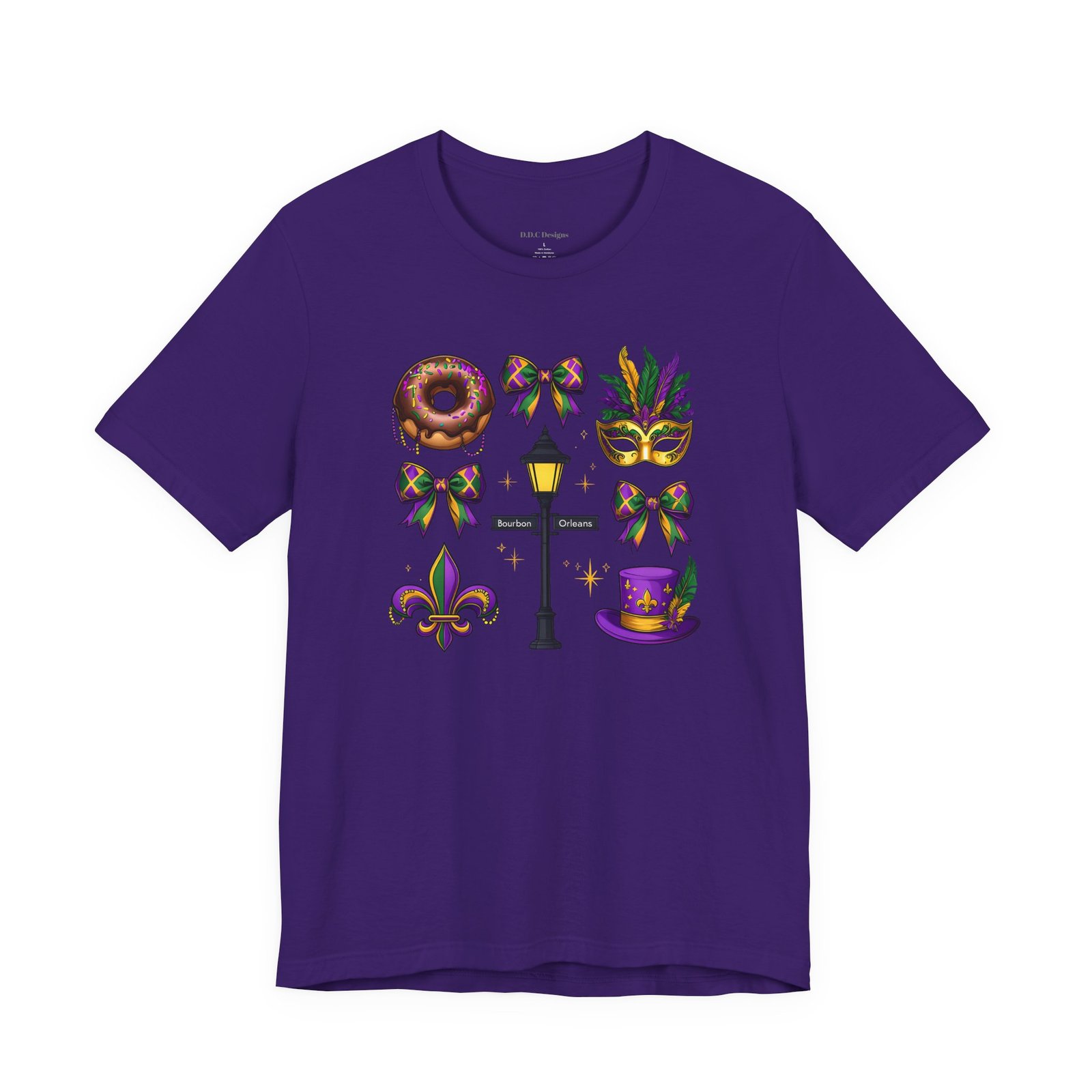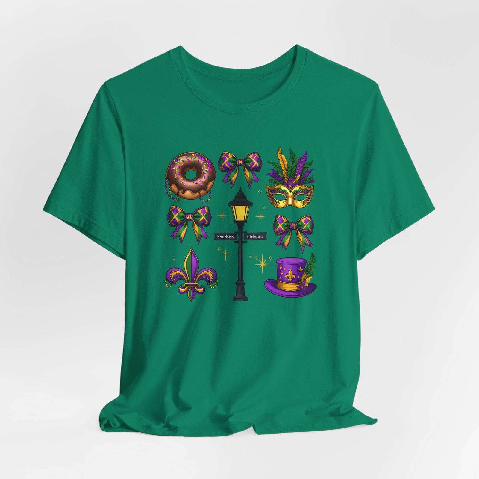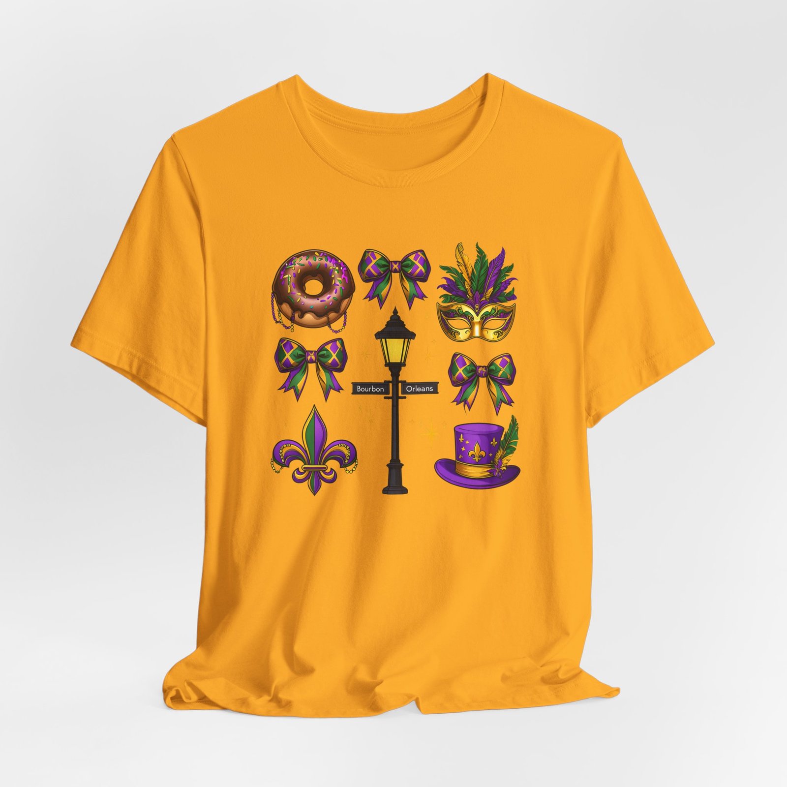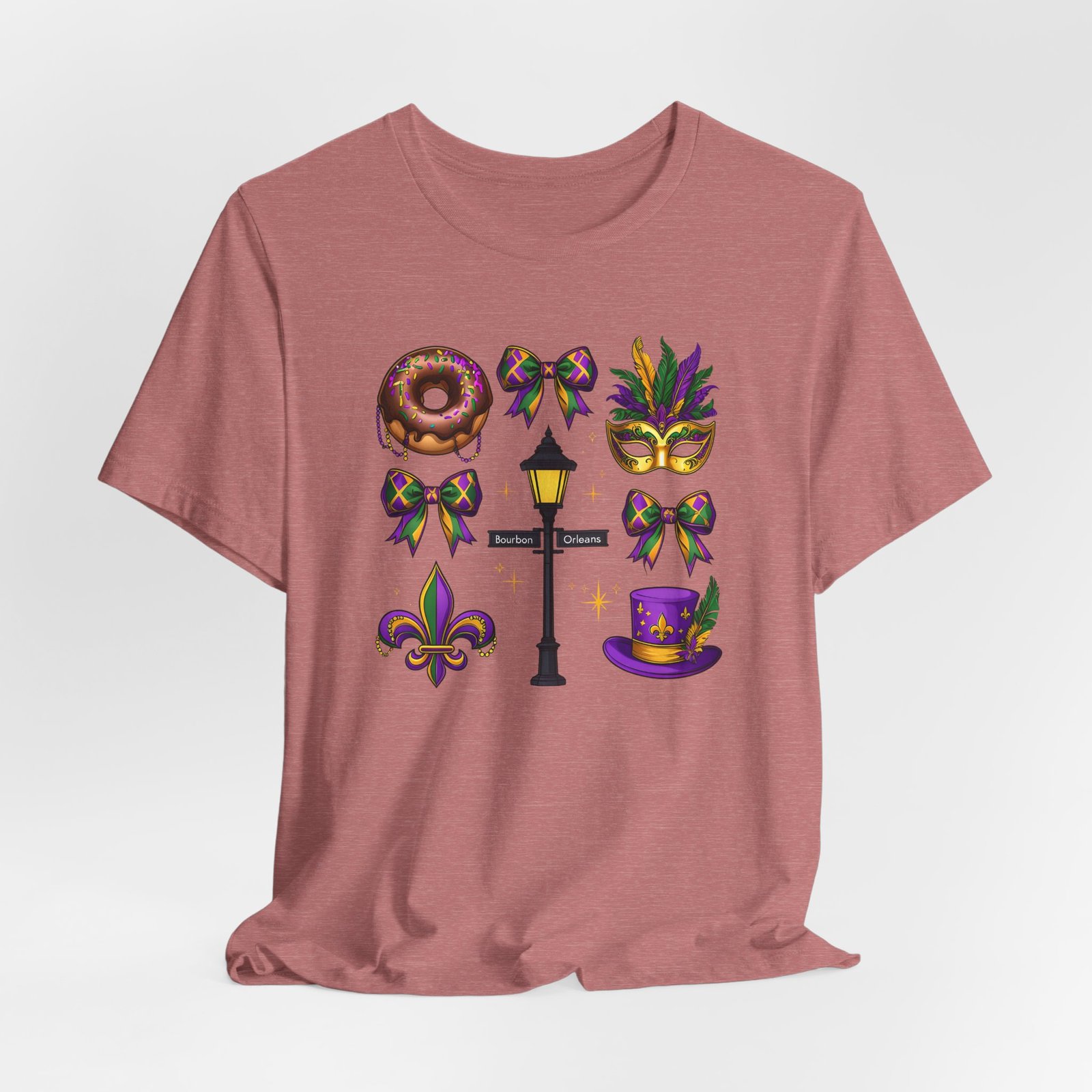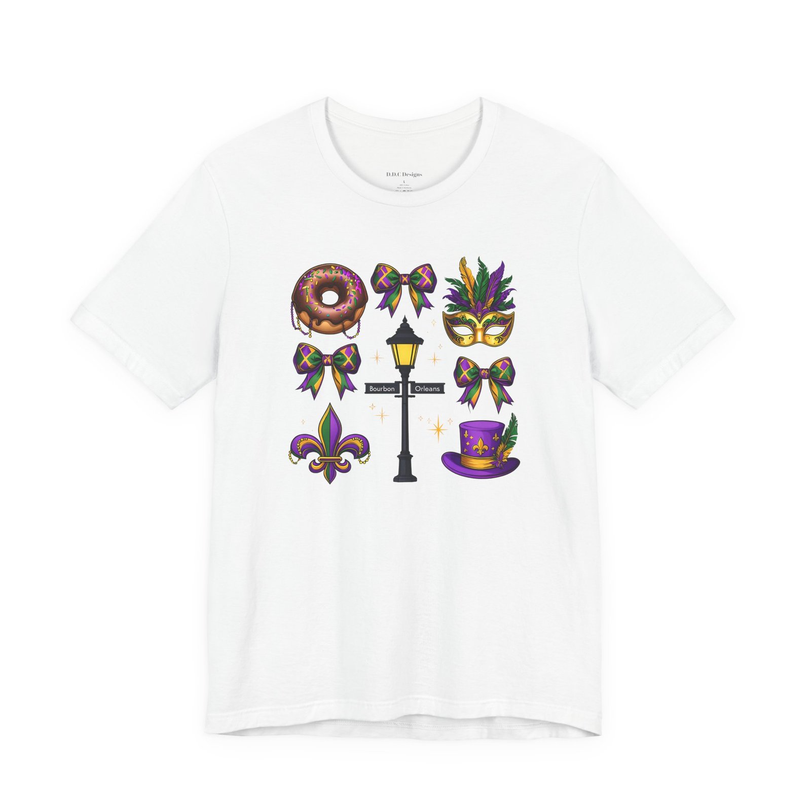 Feel the thrum of Bourbon Street with this playful Mardi Gras tee. A curated grid of icons — a chocolate-frosted donut, a feathered top hat, a masquerade mask, a lamp post and fleur-de-lis — pops in purple, green and gold against crisp white. It’s lightweight and breathable, so you can move through parades, dance at King Cake parties, or wander the French Quarter without overheating. The classic crewneck and retail fit make it easy to style: knot the front, add sequins or flared leggings, and you’ve got a look that reads both casual and celebratory. Small details like ribbed collar, shoulder tape and side seams keep the shape, while soft Airlume combed cotton feels gentle on the skin. Wear it to relive a NOLA weekend or to bring Carnival energy to your next gathering. Product features – 100% Airlume combed & ring-spun cotton for a soft, breathable feel – Ribbed knit collar and shoulder tape for shape retention and durability – Side seams and retail fit for structure and a flattering silhouette – Vibrant, crisp prints via DTF/DTG on sleeves and neck label; tear-away label for comfort – REACH certified materials; responsibly manufactured with fair labor standards Care instructions – Machine wash: cold (max 30C or 90F) – Non-chlorine: bleach as needed – Tumble dry: low heat – Iron, steam or dry: medium heat – Do not dryclean